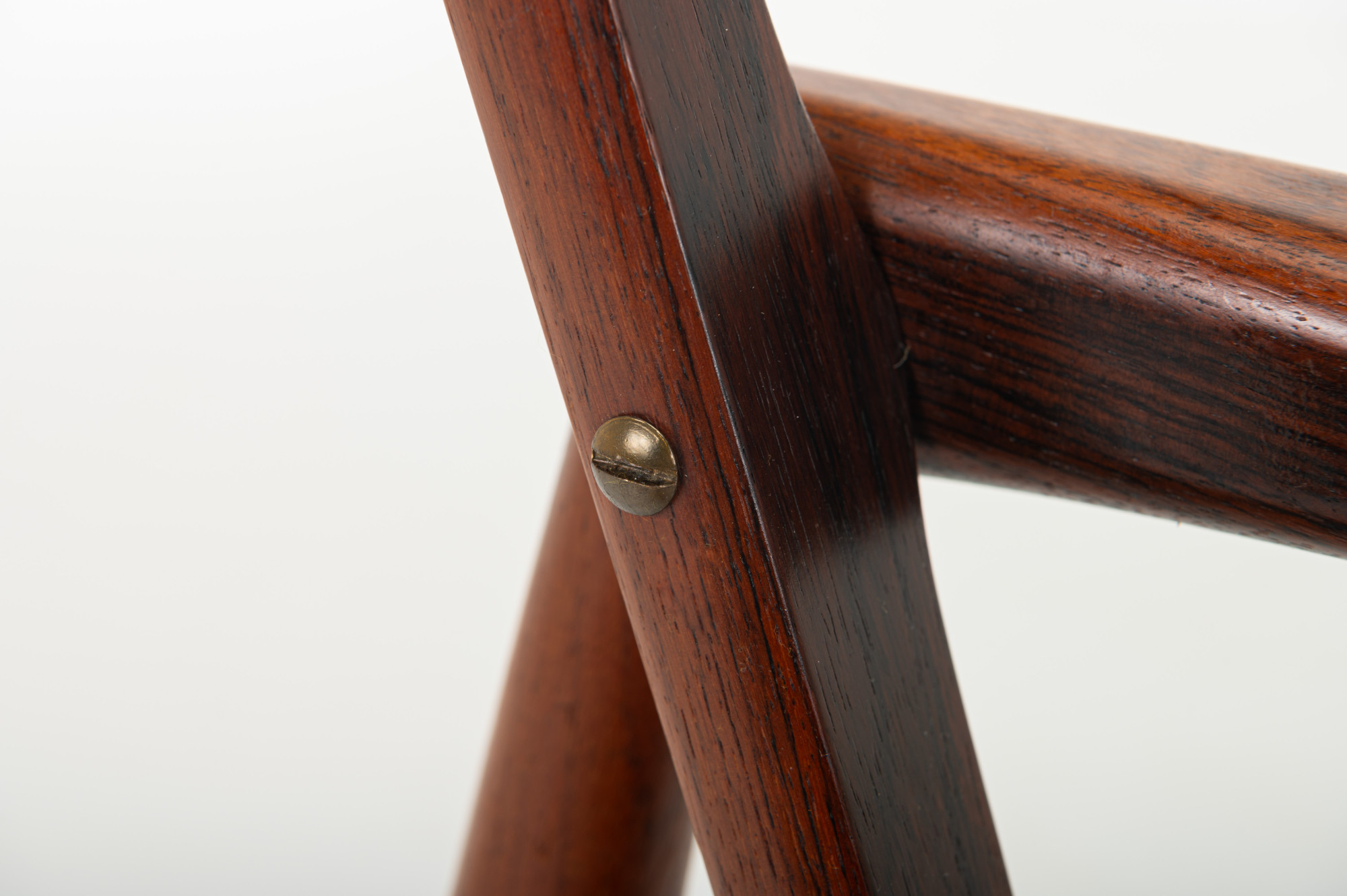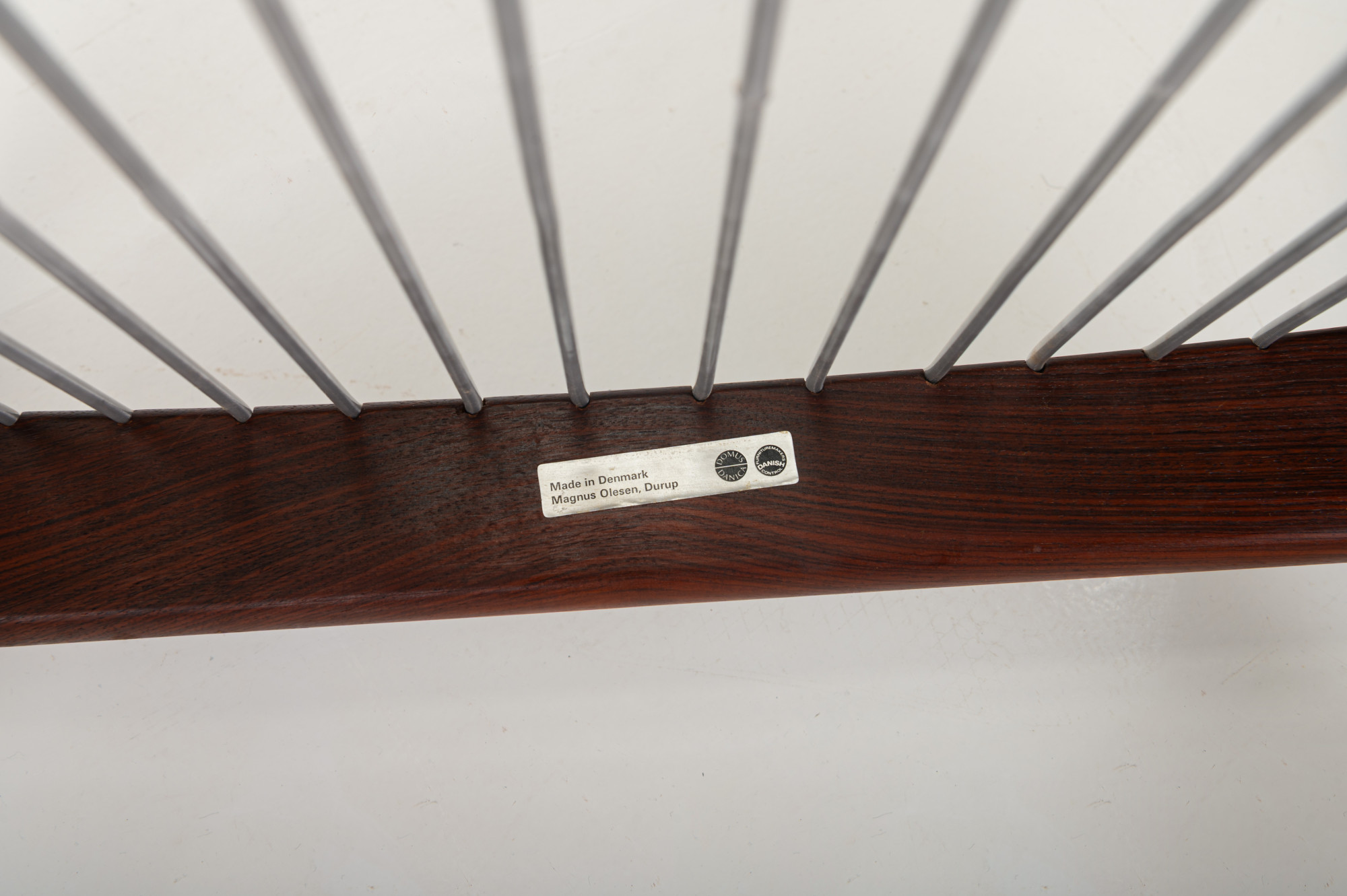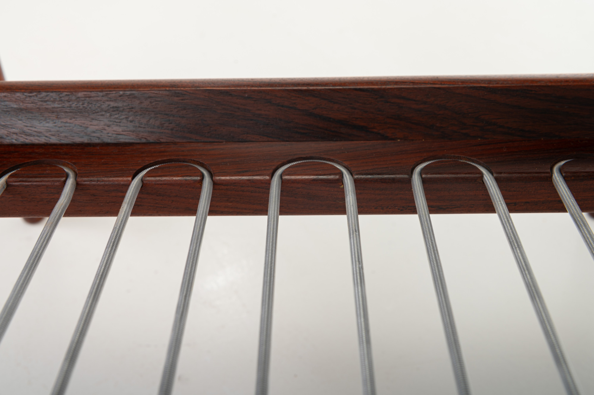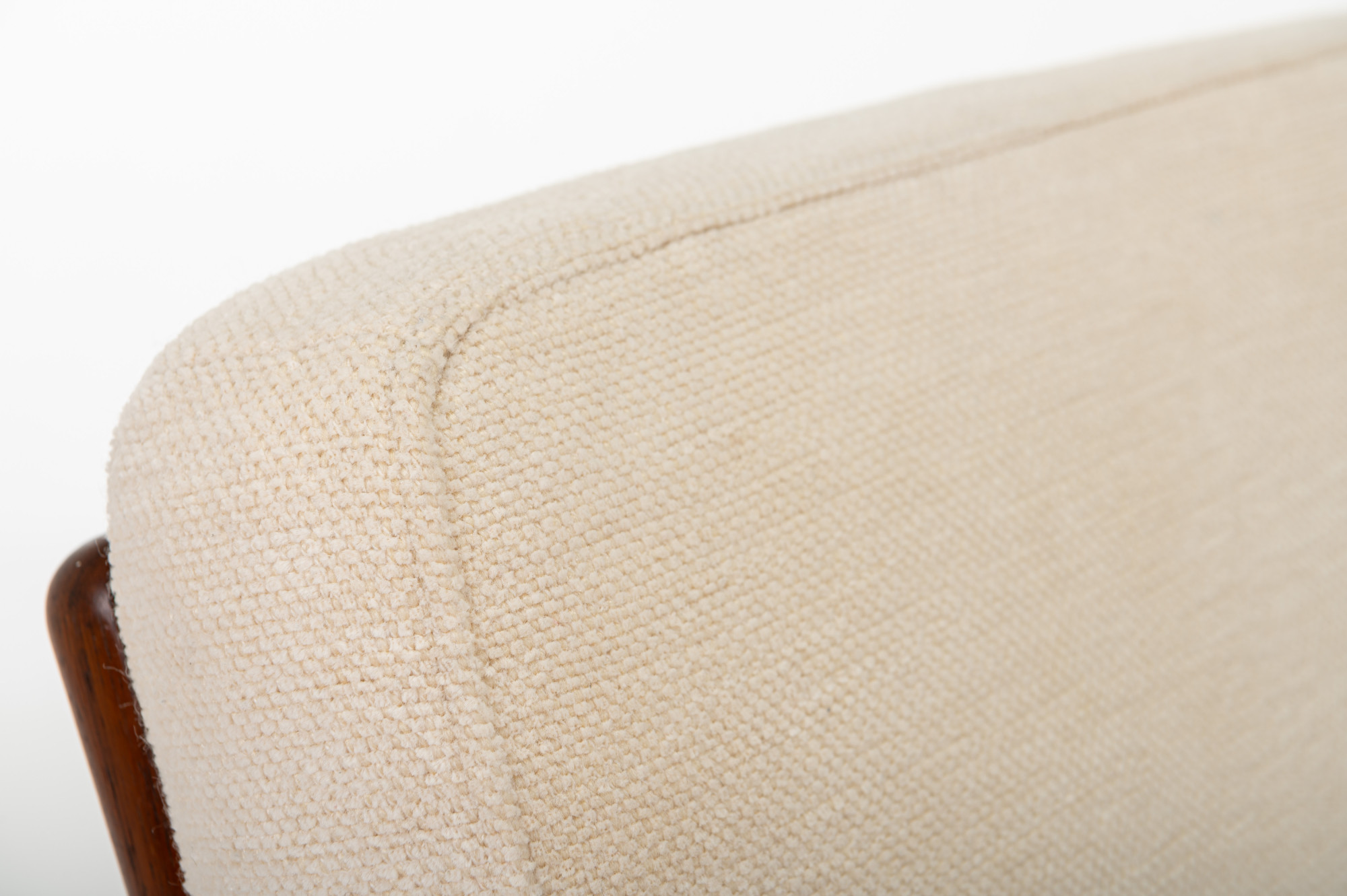 A ‘Model 121’ easy chair, designed by Kai Kristiansen in 1963 and made by Magnus Olesen in Denmark. Known as the ‘Paper Knife’ chair for its sharp-edged armrests. This easy chair is designed in 1955. It has a rosewood frame and a cream white fabric. We have a matching sofa available.