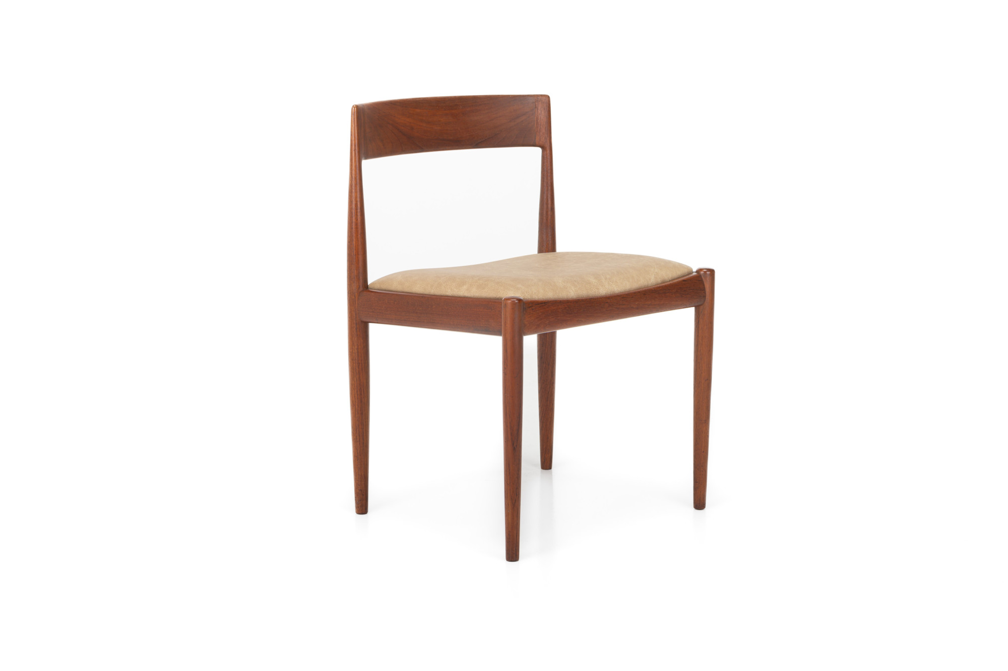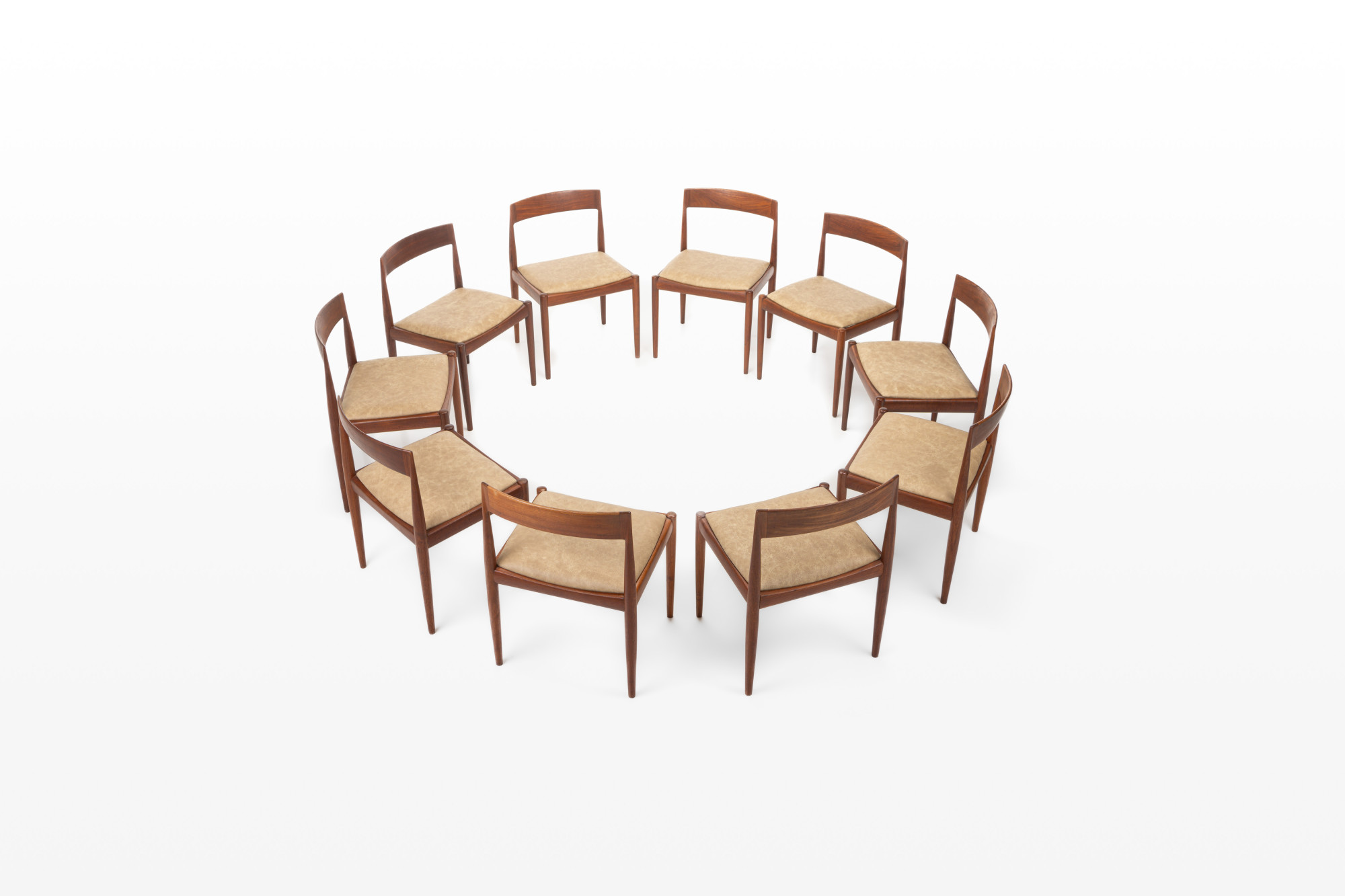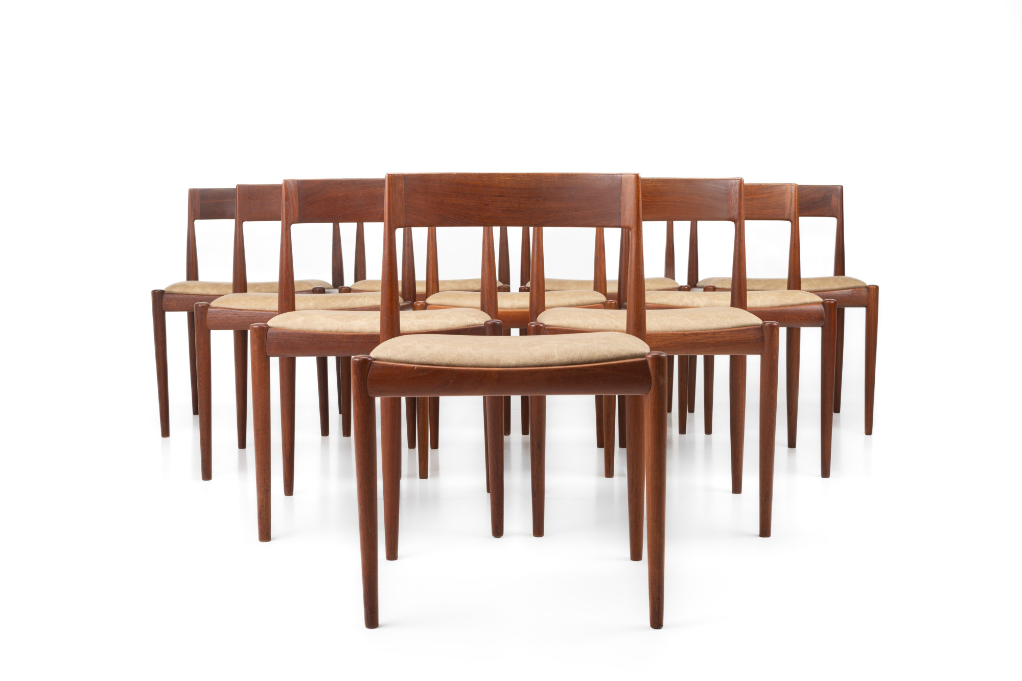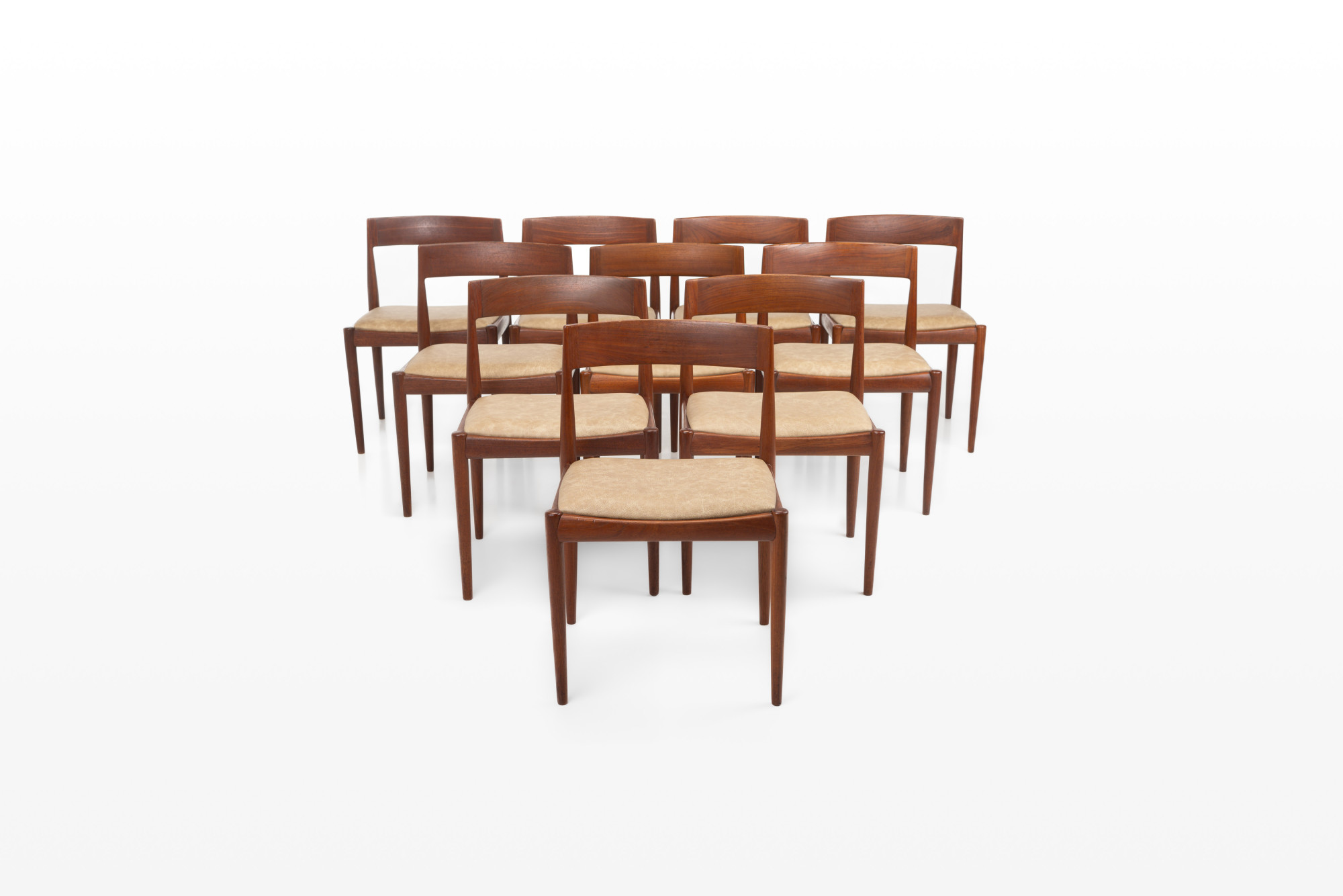 Set of 10 vintage '4110' dining room chairs by Kai Kristiansen for Fritz Hansen, Denmark 1960s. They have a teak frame, reupholstered with a cream beige leather and are in very good condition. Marked by the manufacturer.