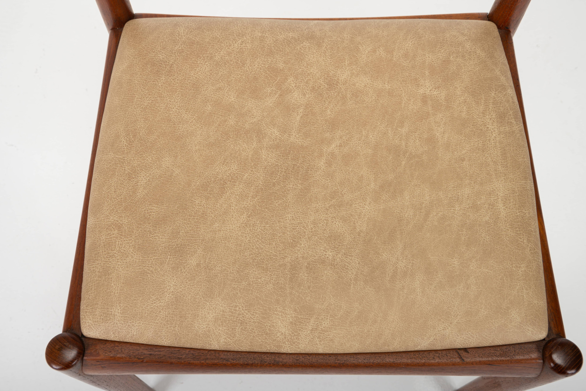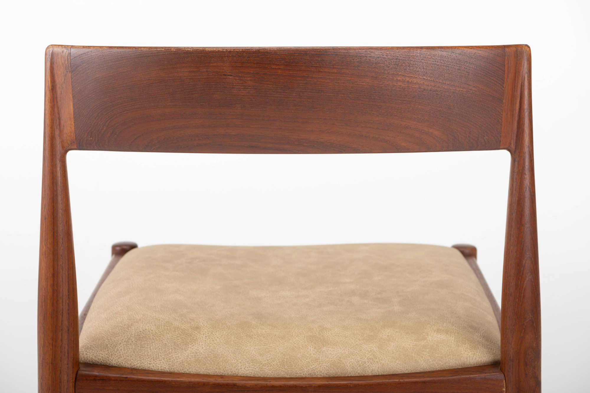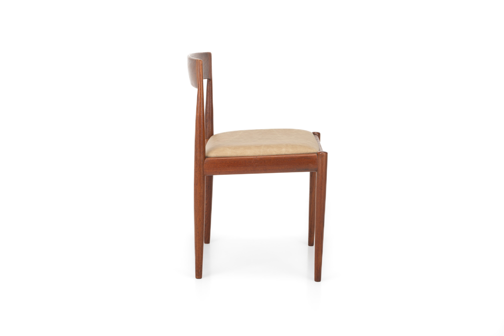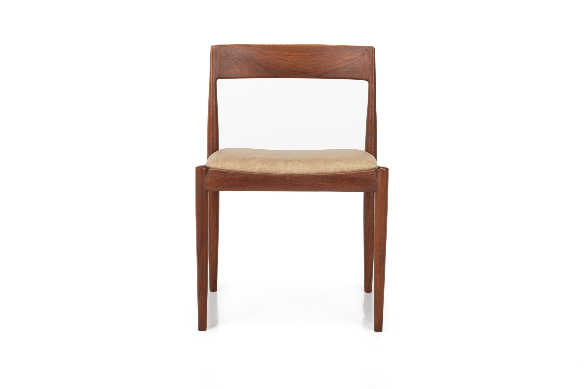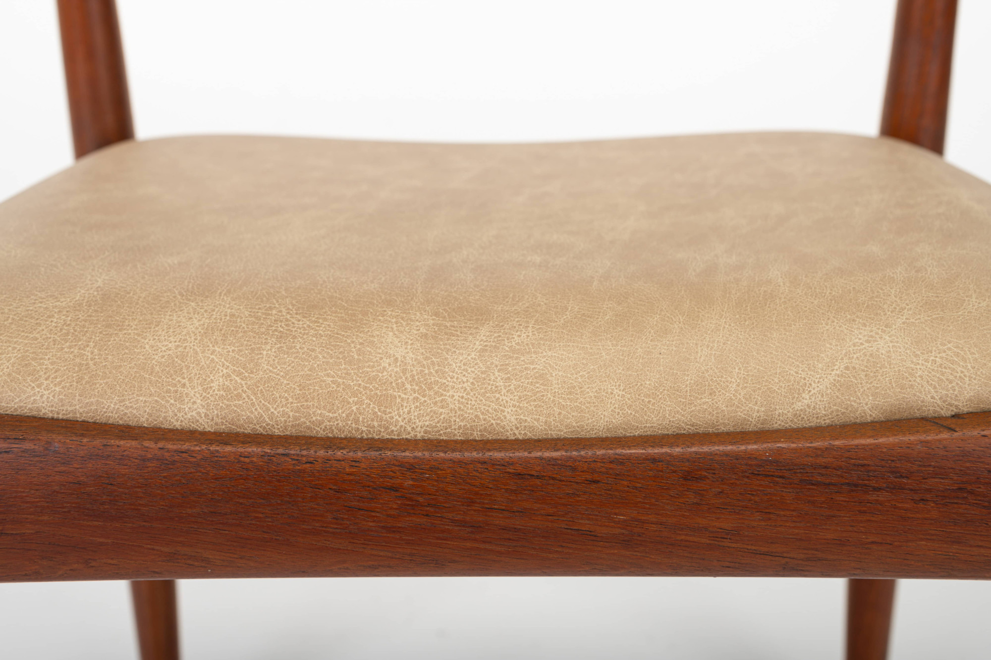 Set of 10 vintage '4110' dining room chairs by Kai Kristiansen for Fritz Hansen, Denmark 1960s. They have a teak frame, reupholstered with a cream beige leather and are in very good condition. Marked by the manufacturer.