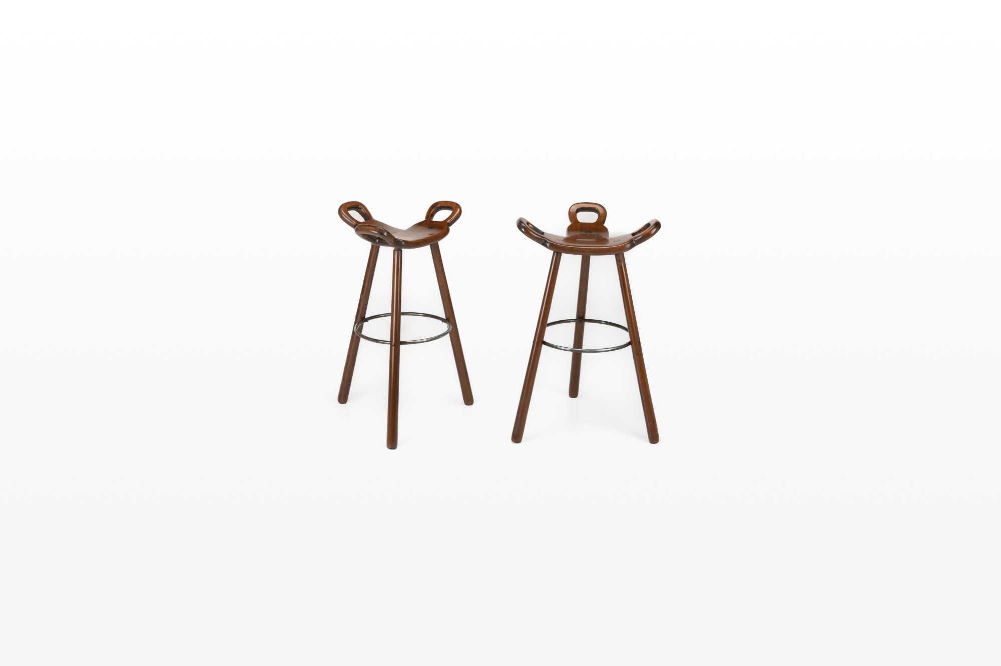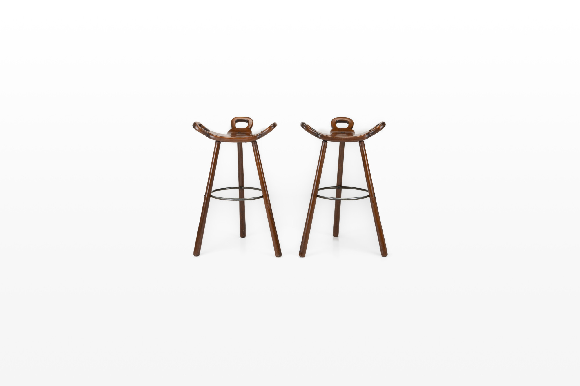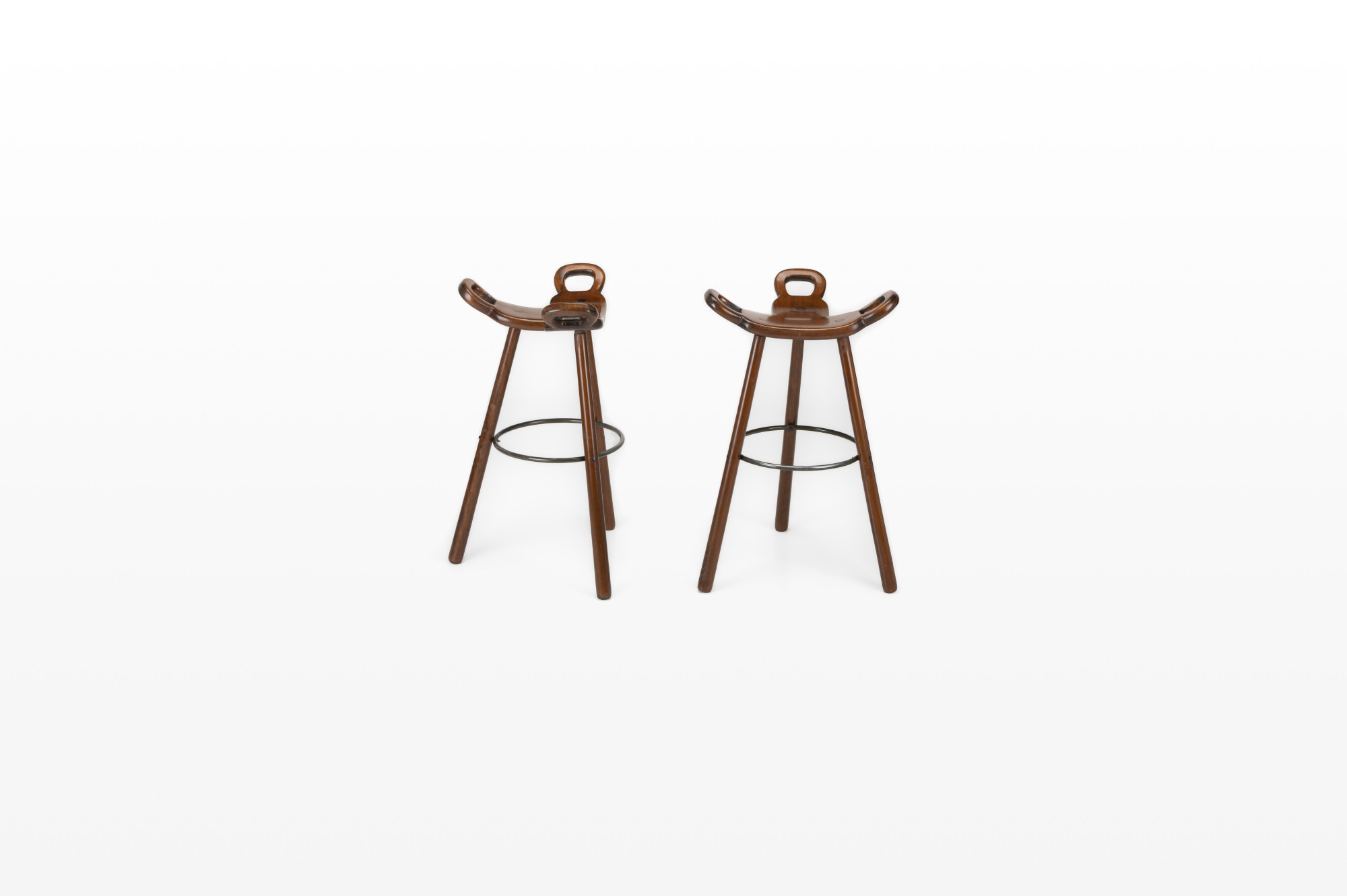 Set of two Spanish vintage bar stools. These 'Marbella' bar stools were produced by Confonorm in Spain in the 1960s. The bar stools are made of wood and have an iron ring to rest your feet on. This set is still in very good vintage condition.