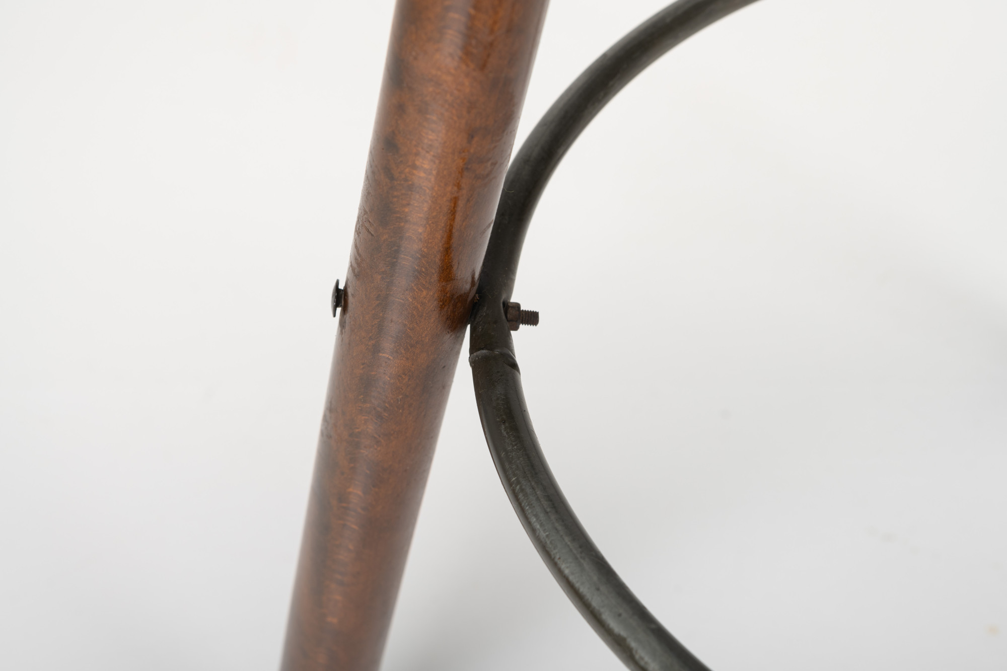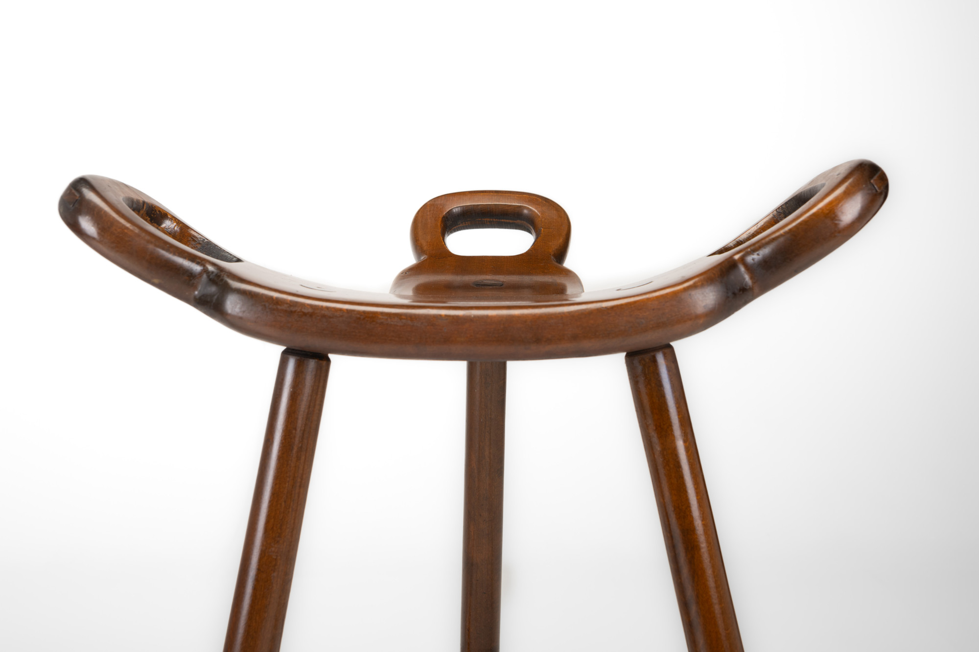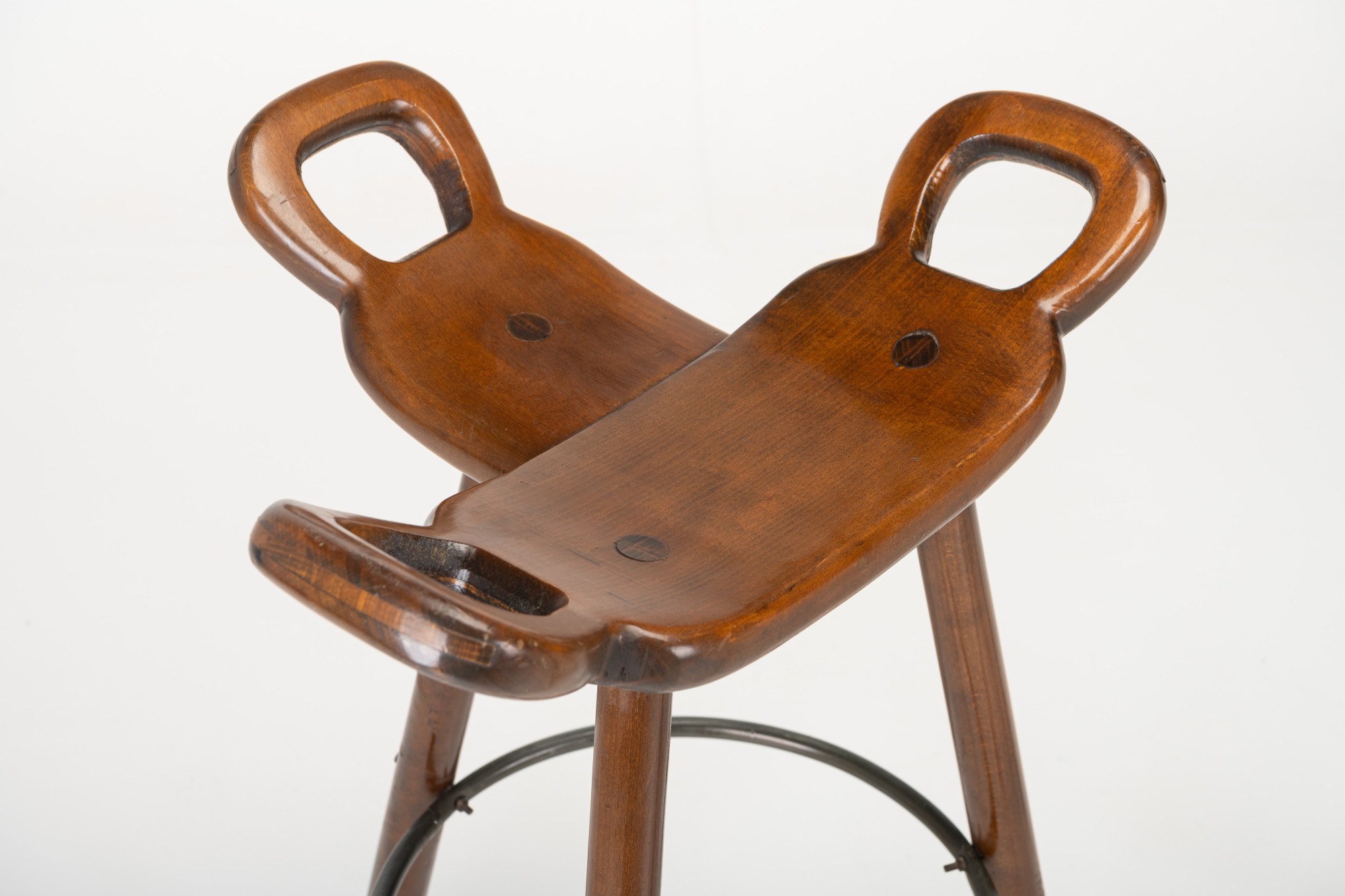 Set of two Spanish vintage bar stools. These 'Marbella' bar stools were produced by Confonorm in Spain in the 1960s. The bar stools are made of wood and have an iron ring to rest your feet on. This set is still in very good vintage condition.