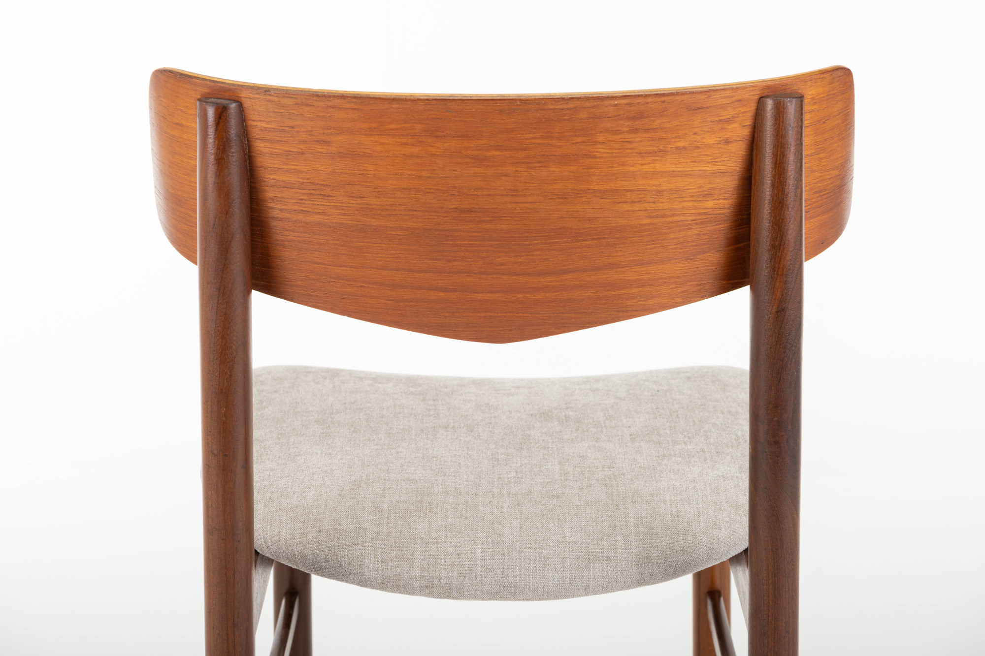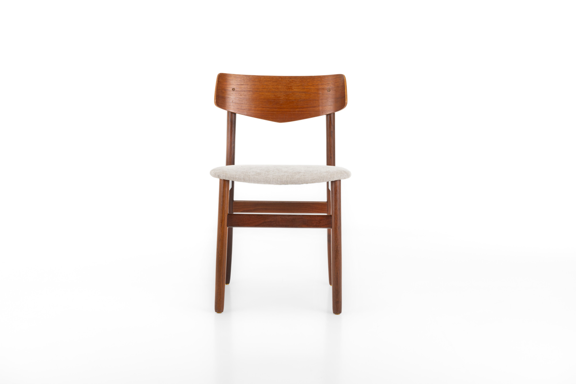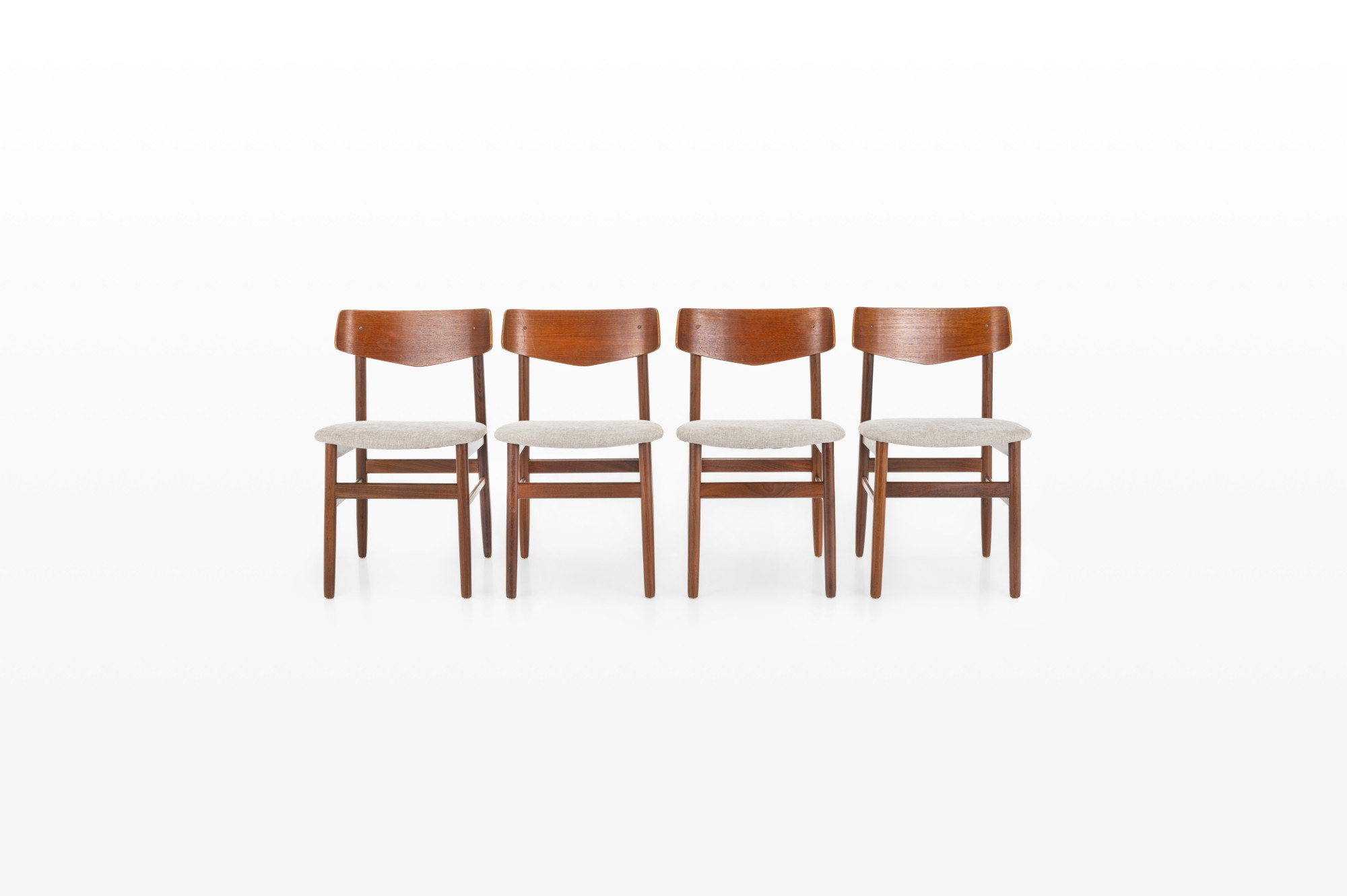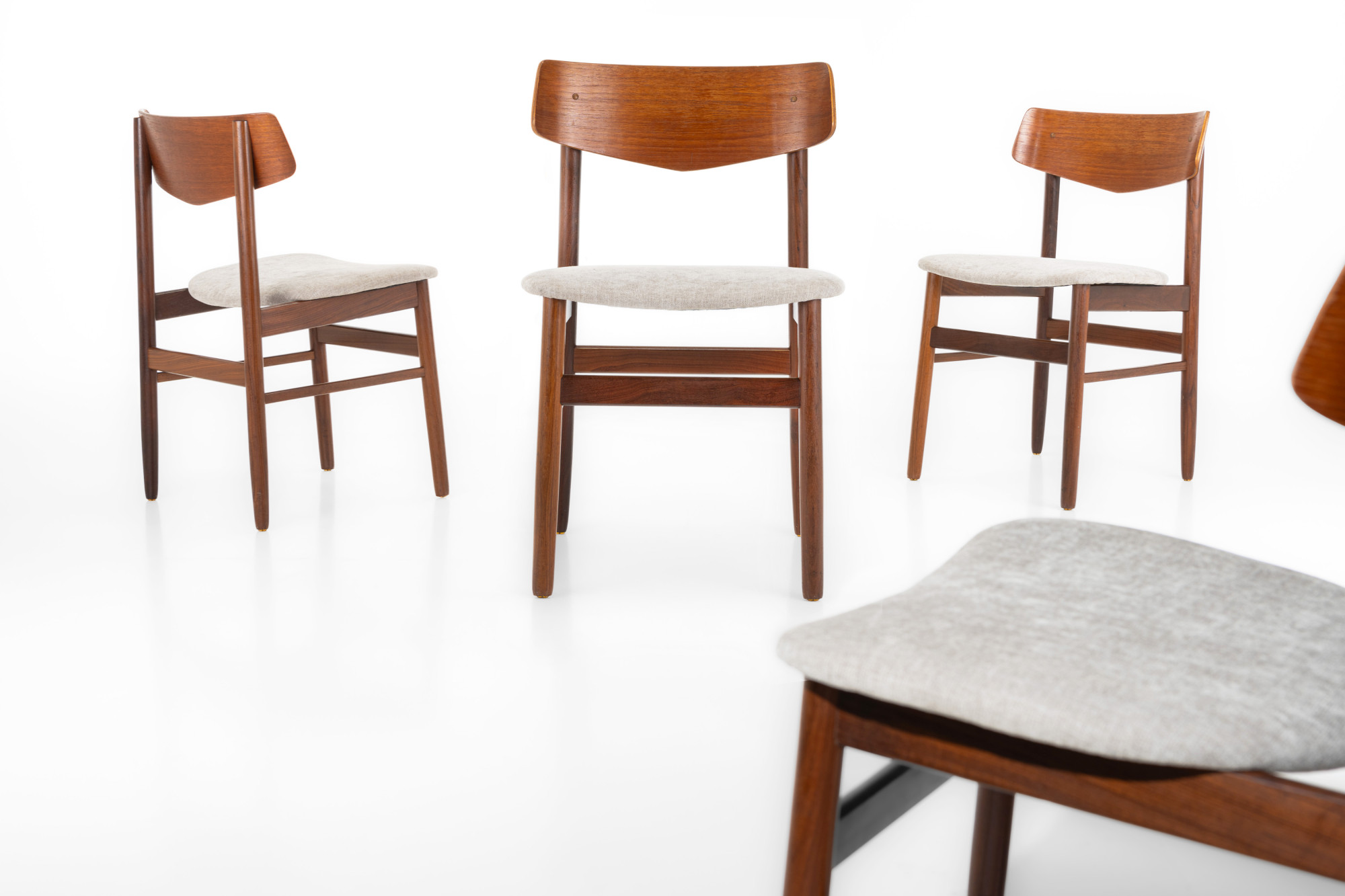 Danish vintage dining chairs in teak, set of 4. Produced in Denmark in the 1960s. The chairs have a teak frame and are reupholstered with a grey colored fabric.