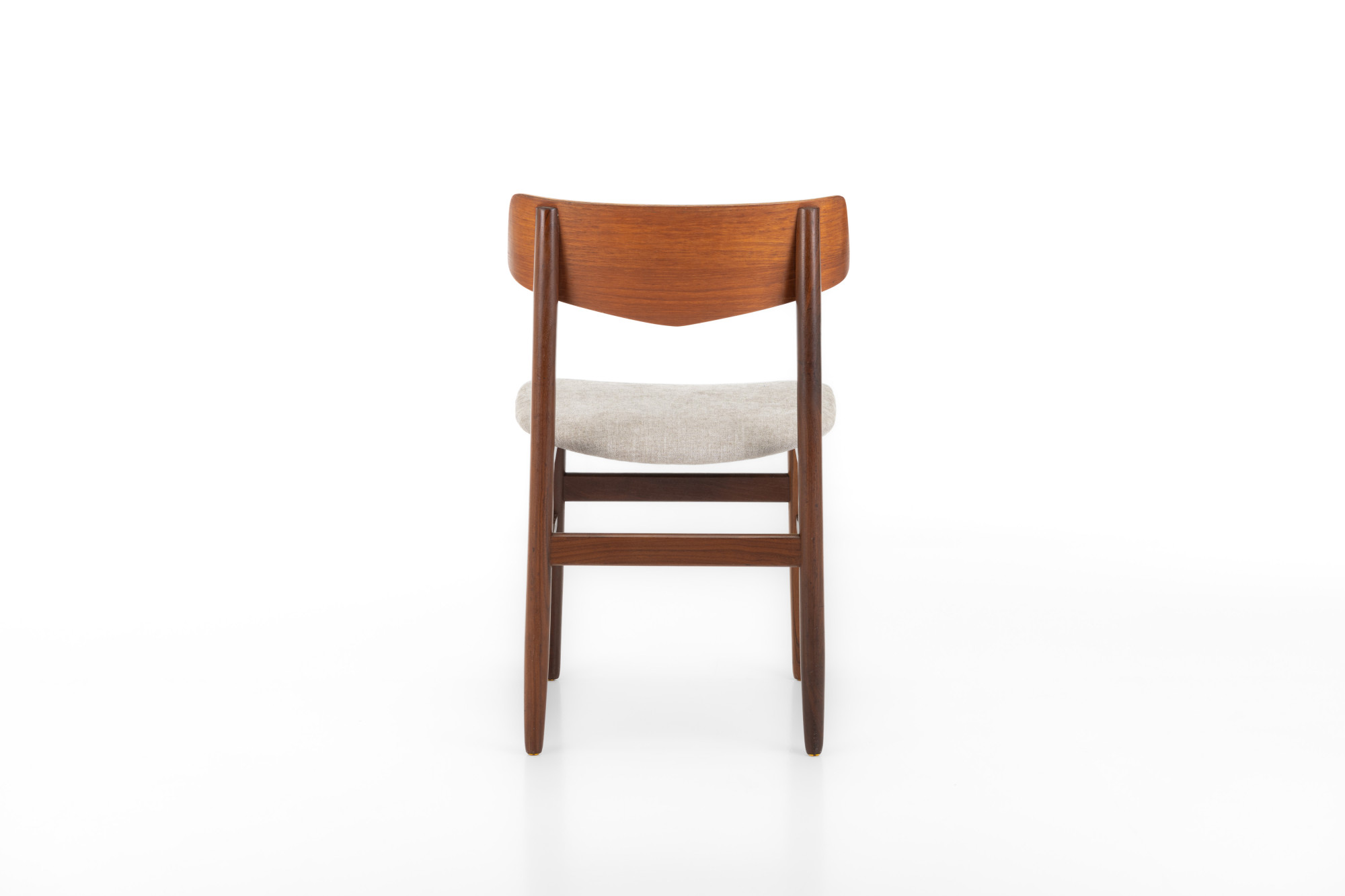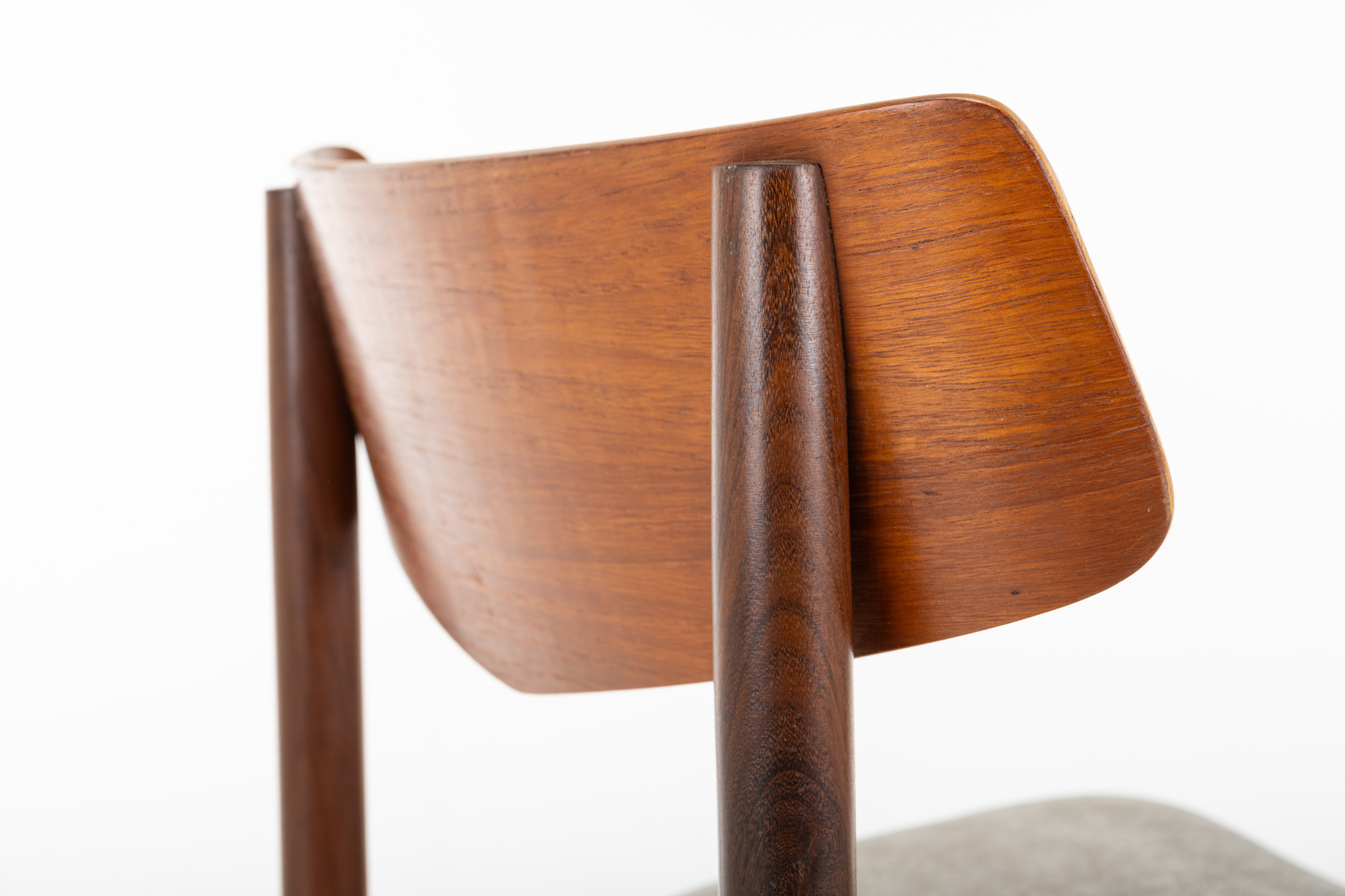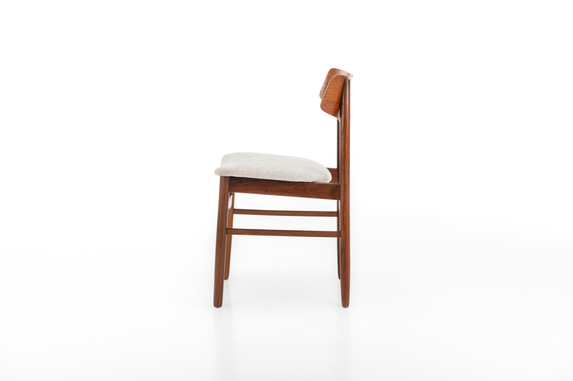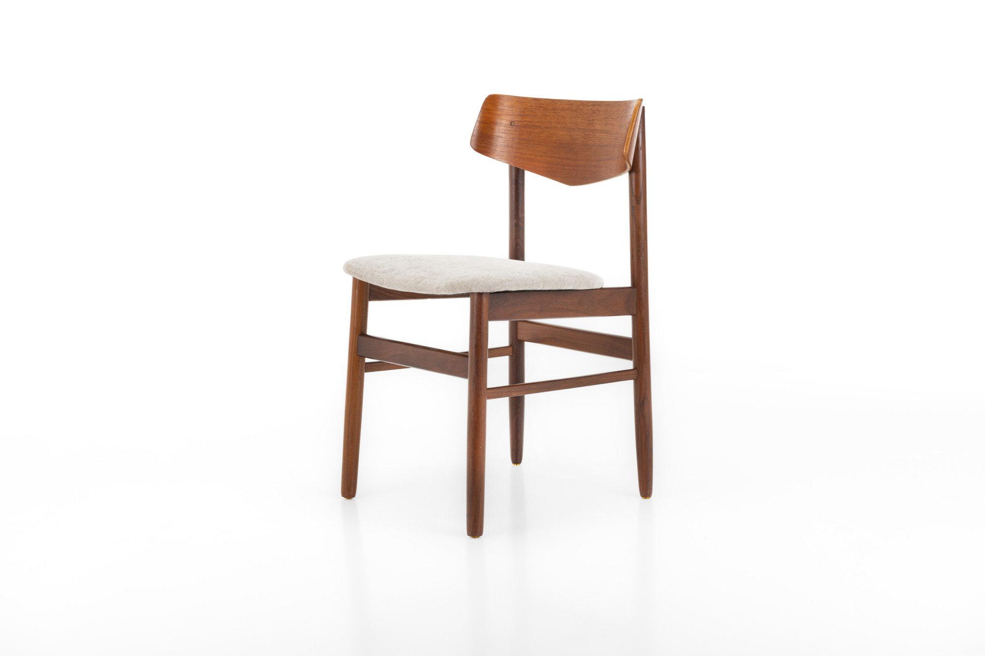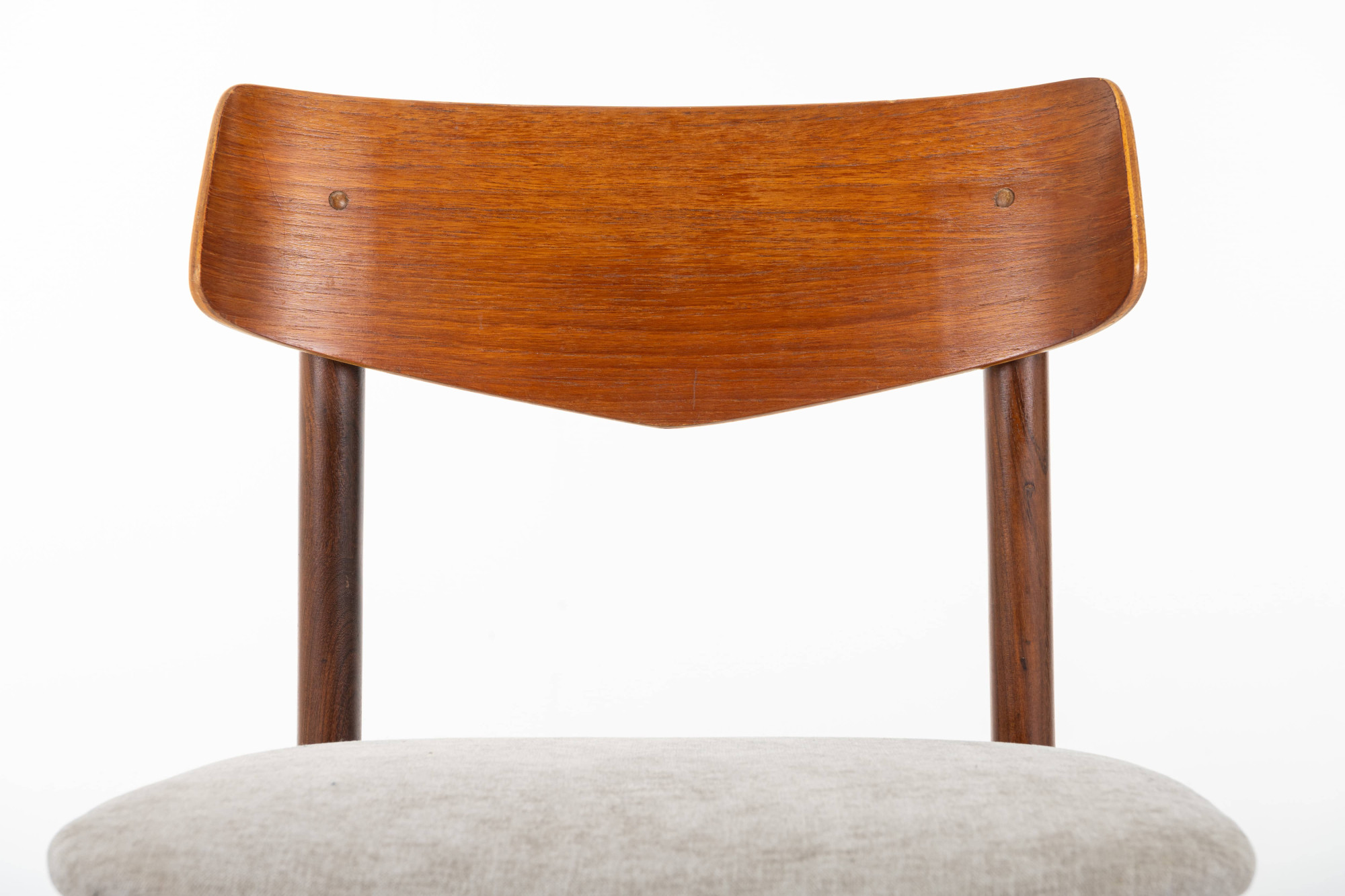 Danish vintage dining chairs in teak, set of 4. Produced in Denmark in the 1960s. The chairs have a teak frame and are reupholstered with a grey colored fabric.