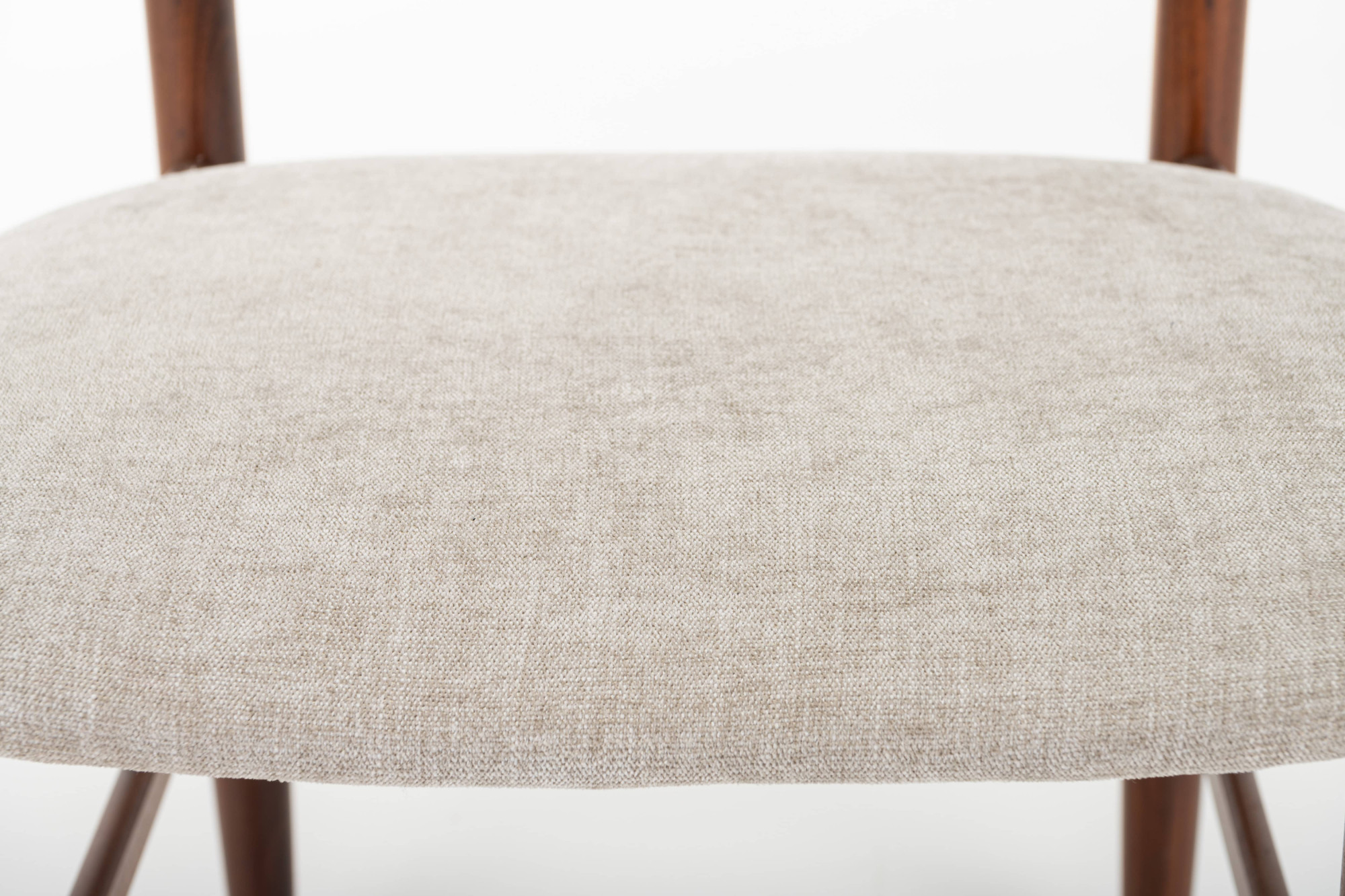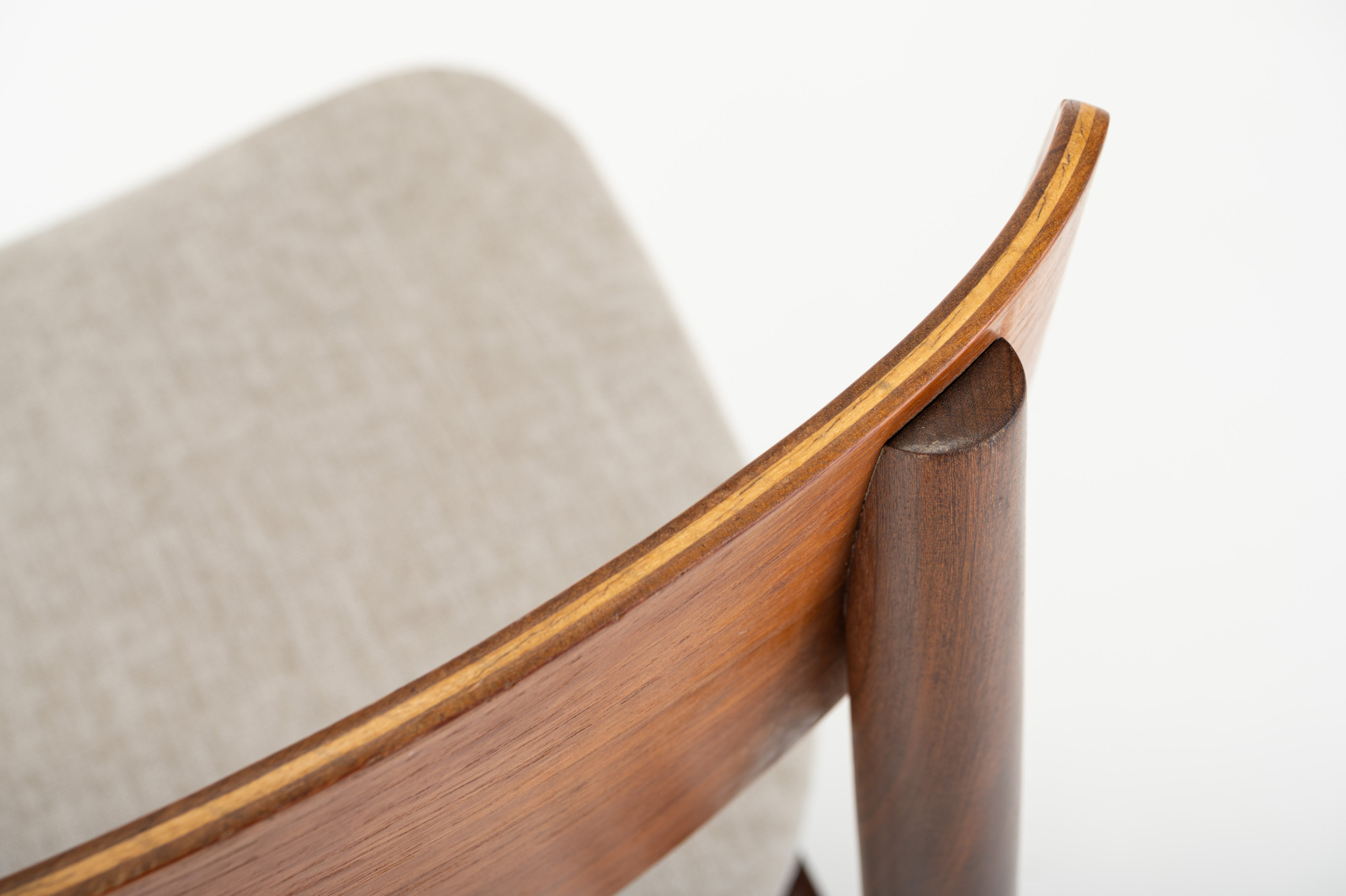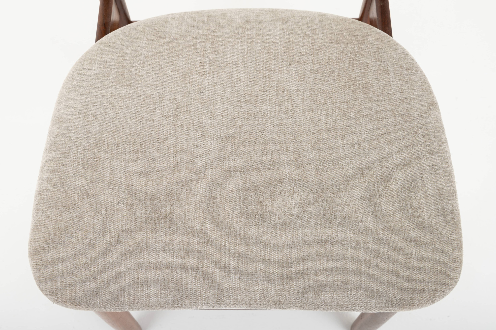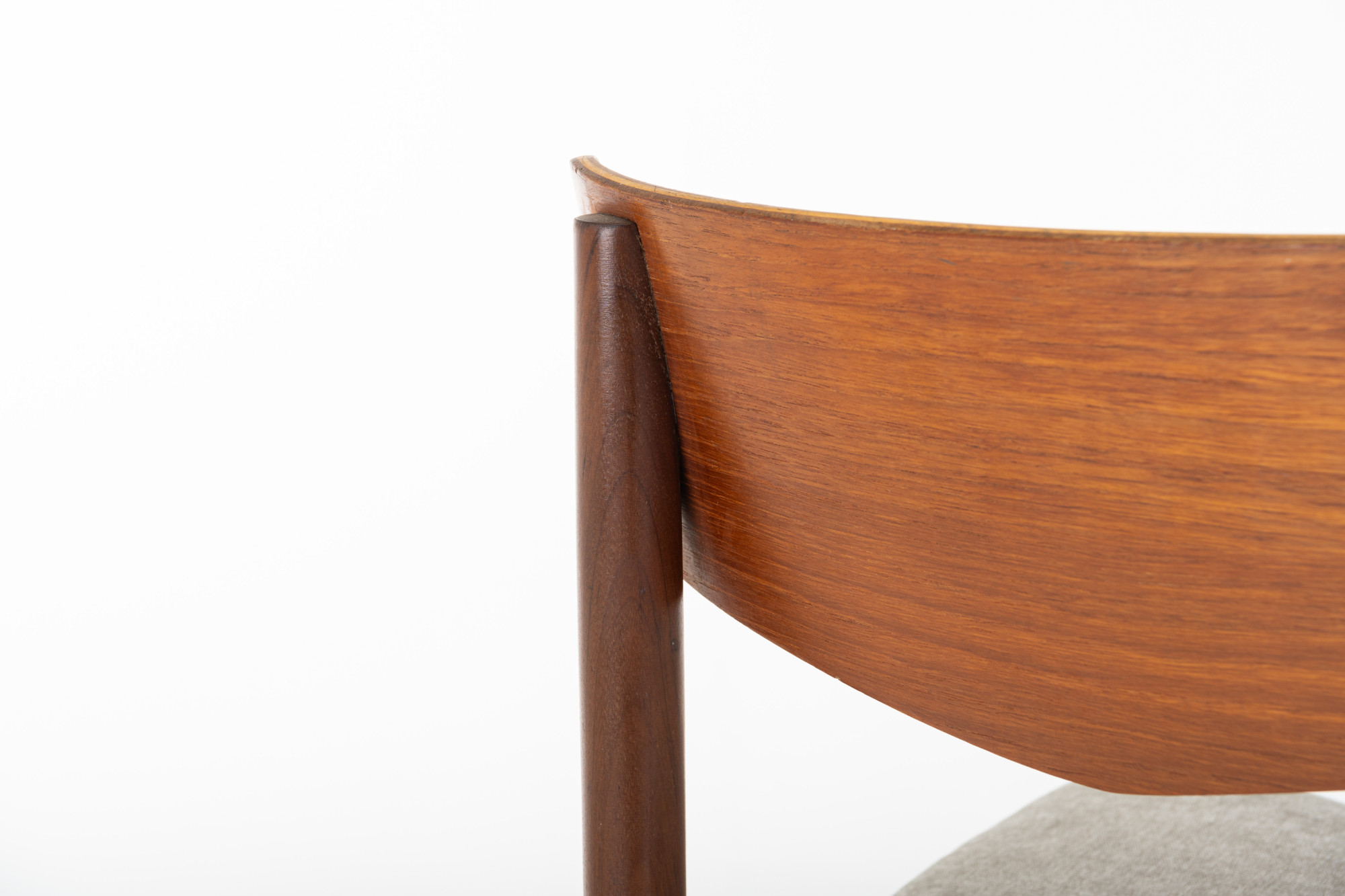 Danish vintage dining chairs in teak, set of 4. Produced in Denmark in the 1960s. The chairs have a teak frame and are reupholstered with a grey colored fabric.