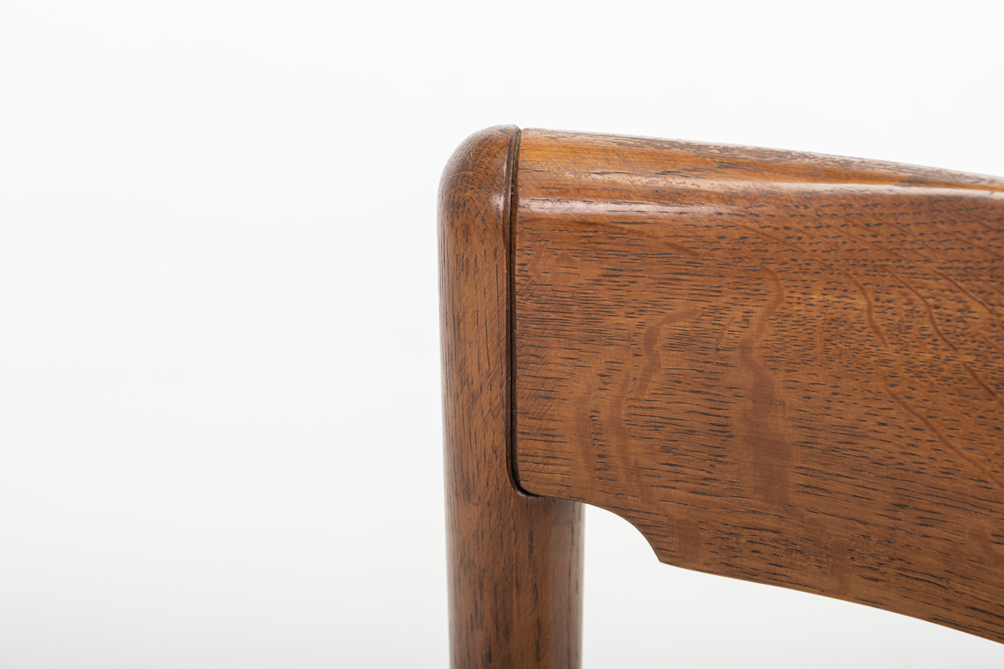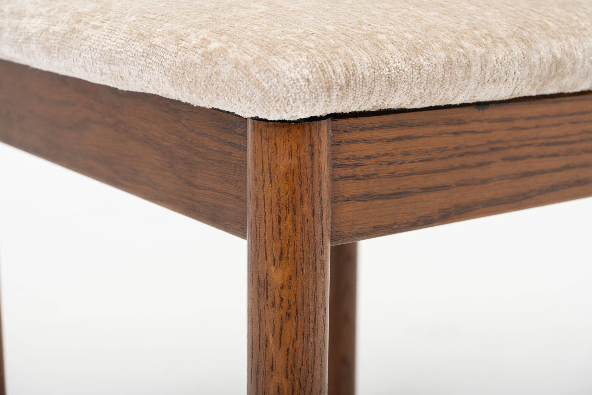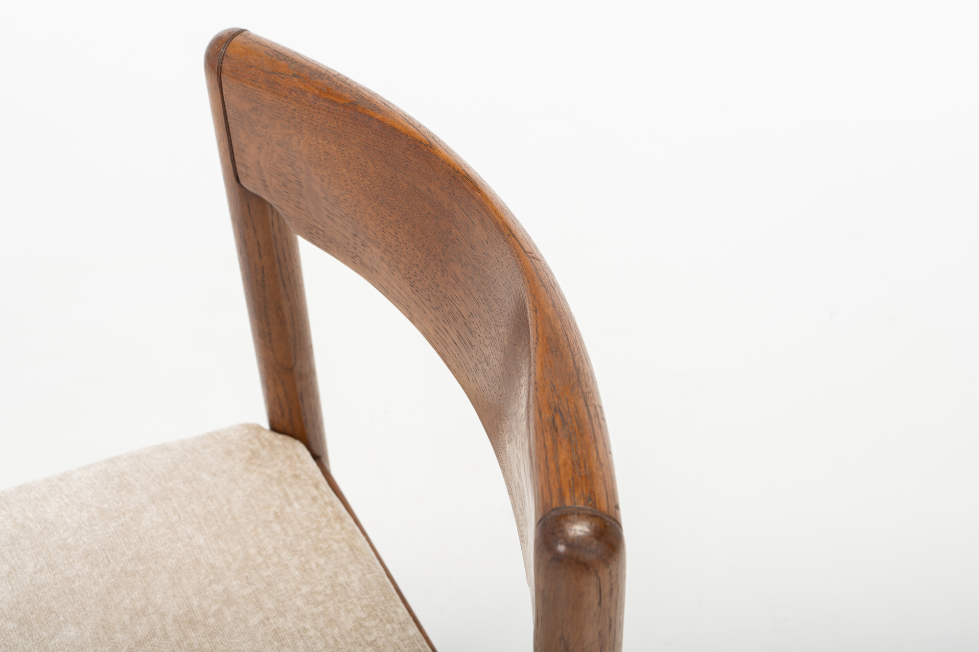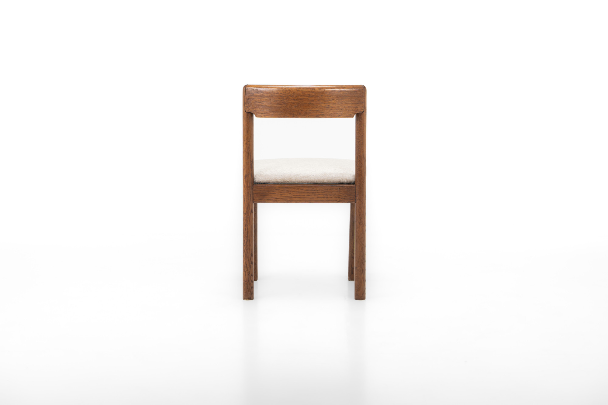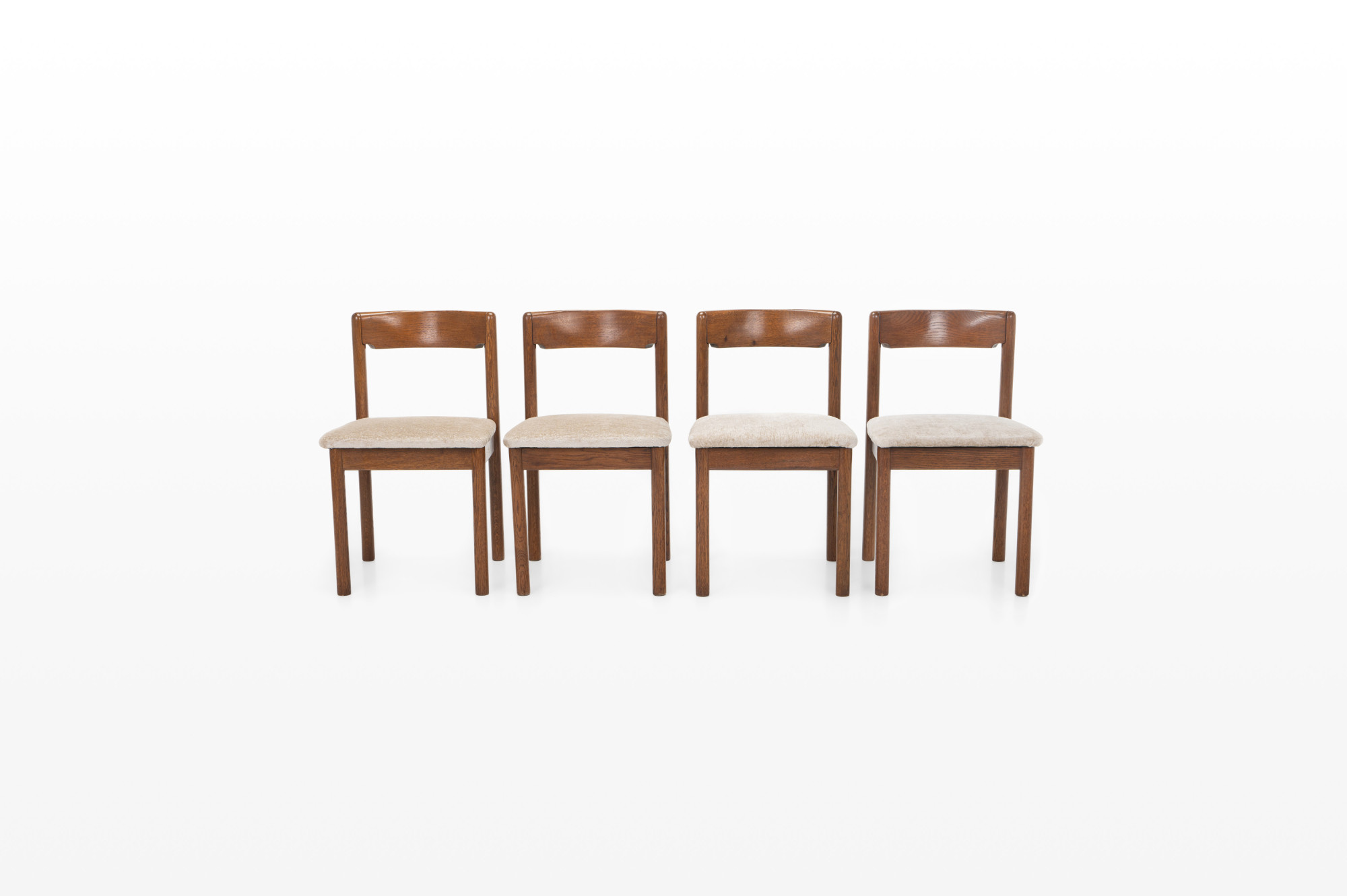 Set of four vintage dining chairs manufactured in Denmark in the 1960s. The chairs have a dark oak frame and are reupholstered with a light cream beige fabric.
