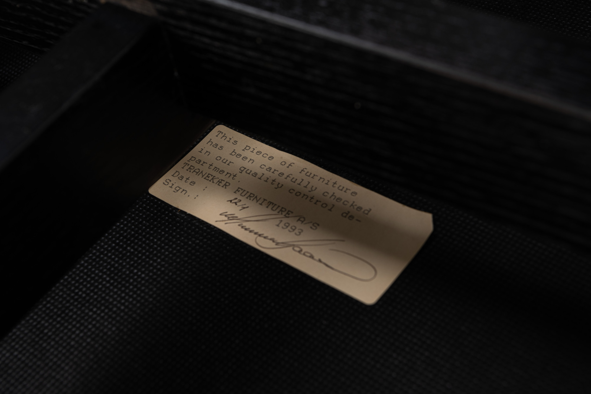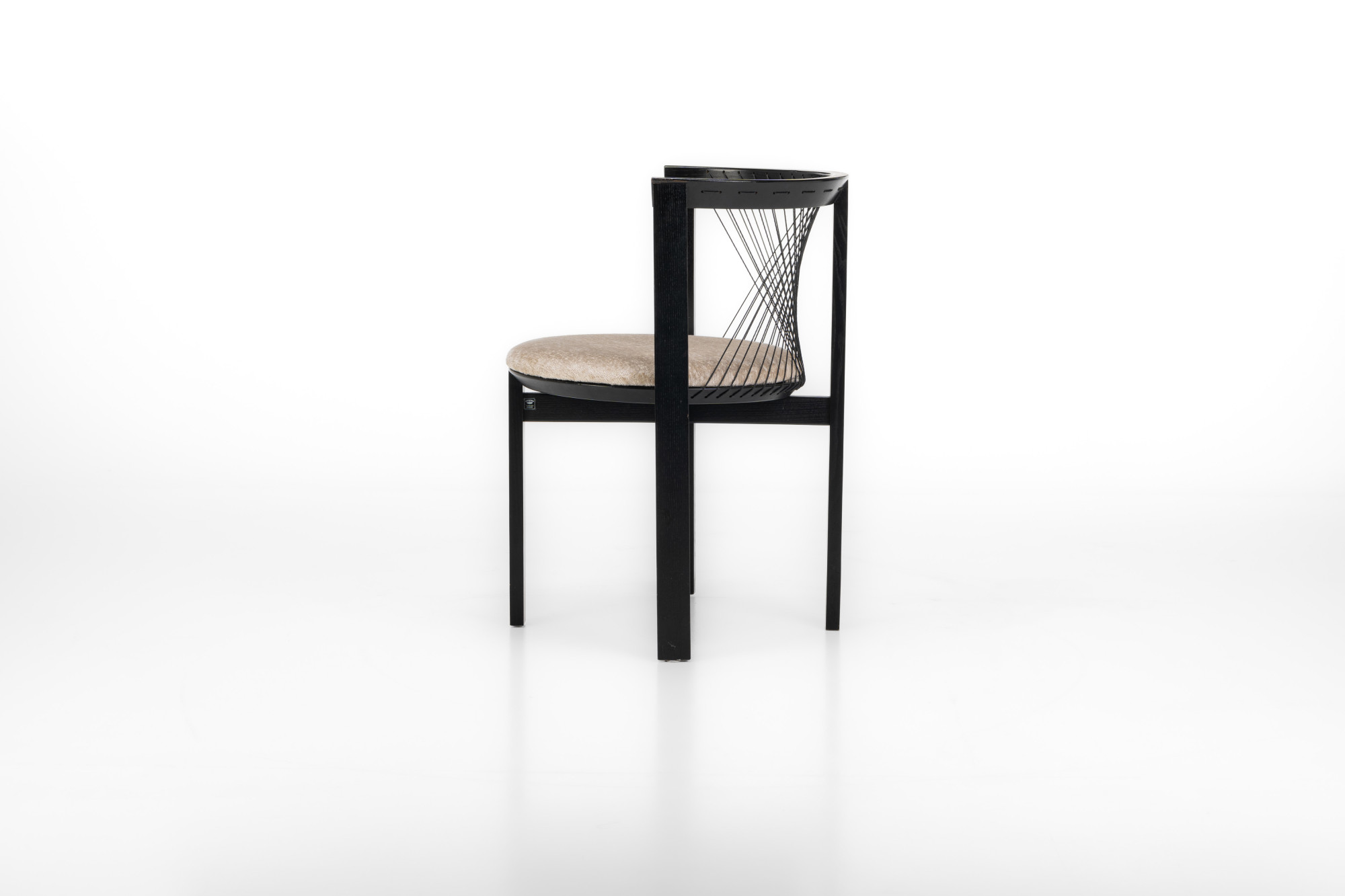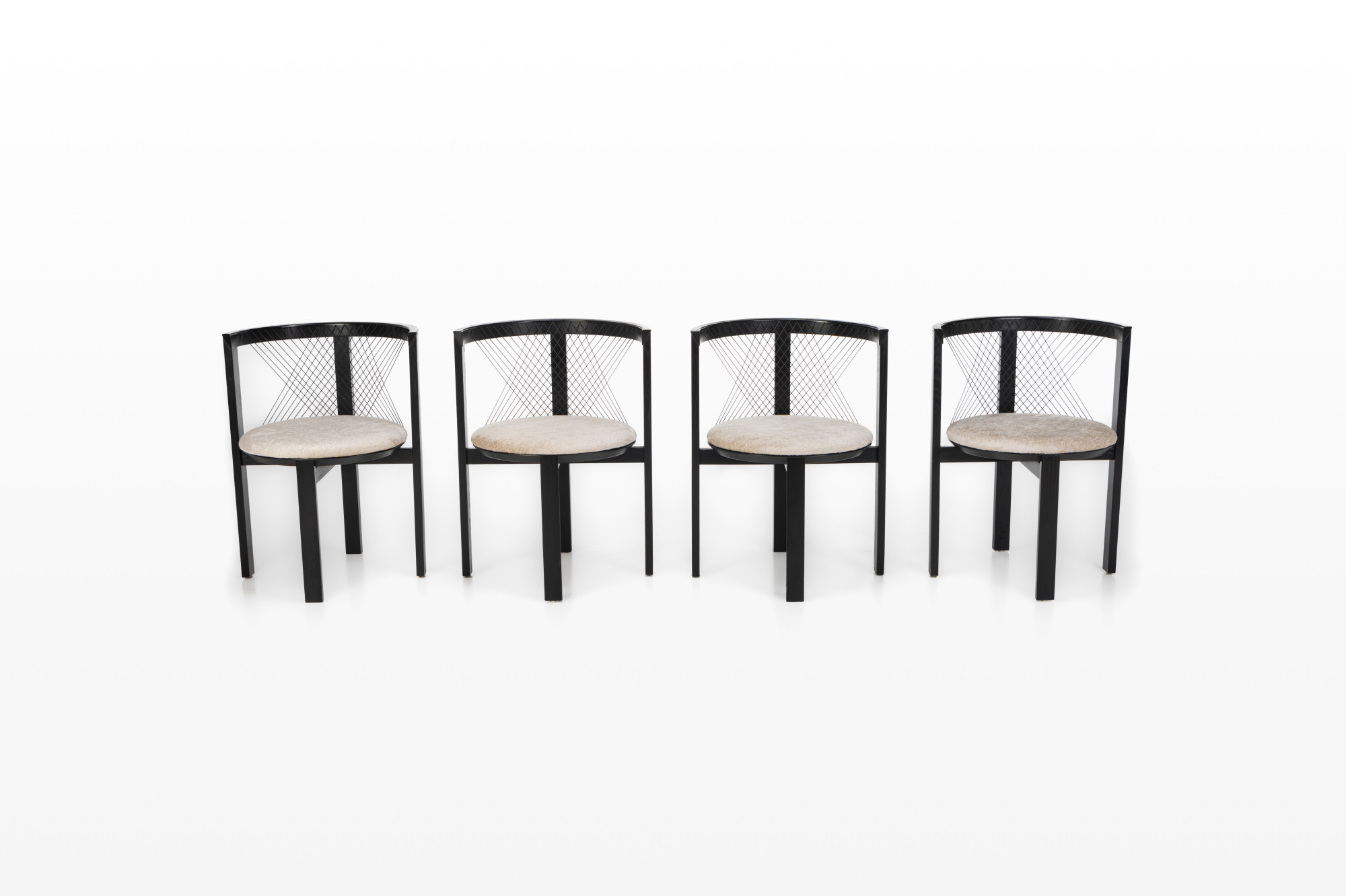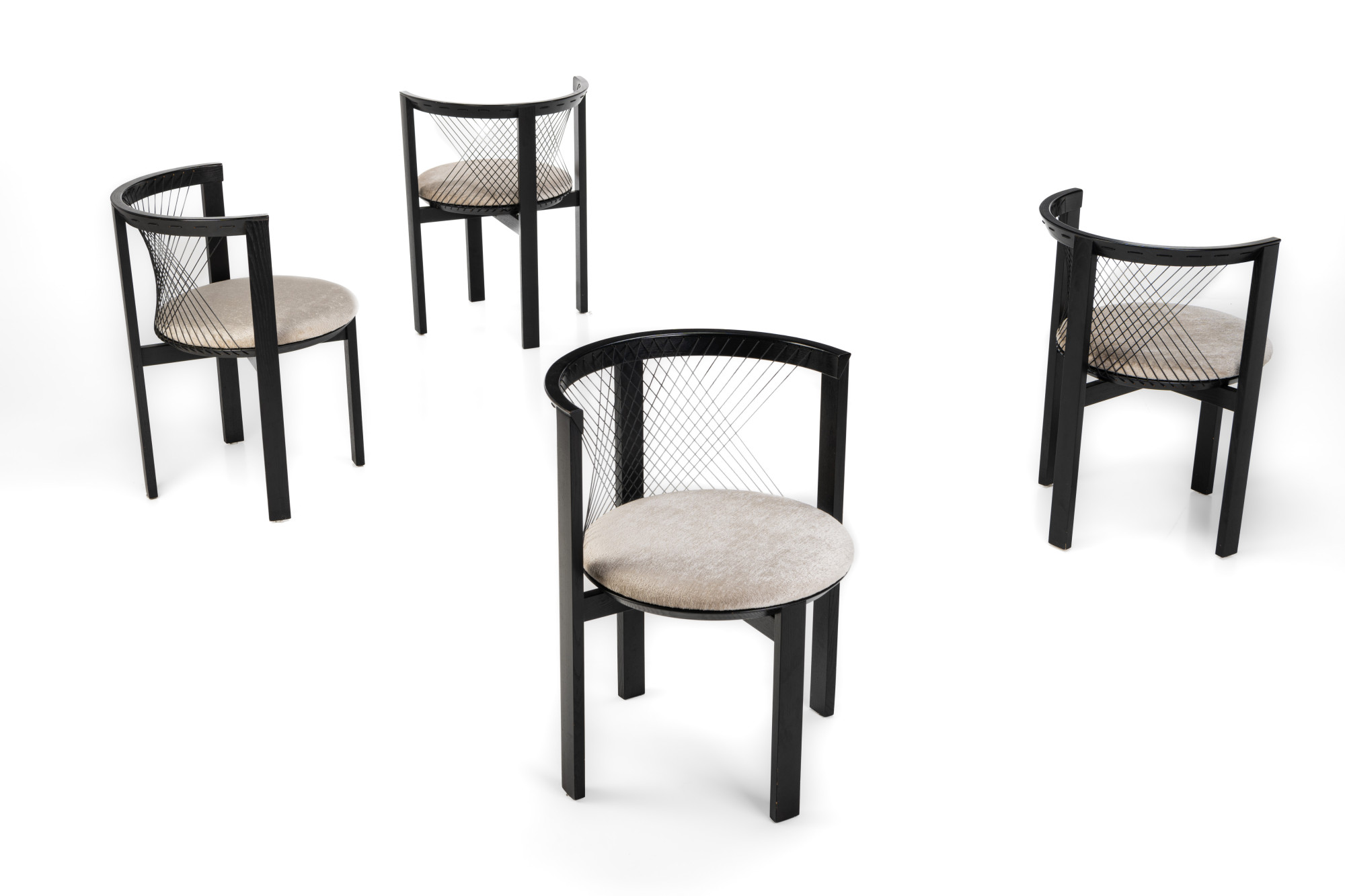 Set of four 'String' dining chairs designed by Niels Jørgen Haugesen for Tranekaer Furniture, Denmark 1990s. The chairs have a wooden frame and are reupholstered with a cream beige fabric. Marked by the producer.