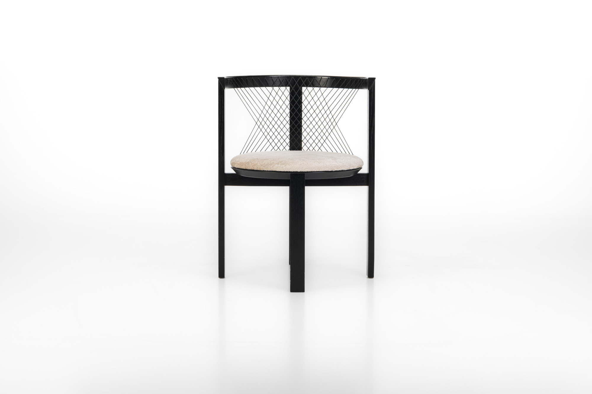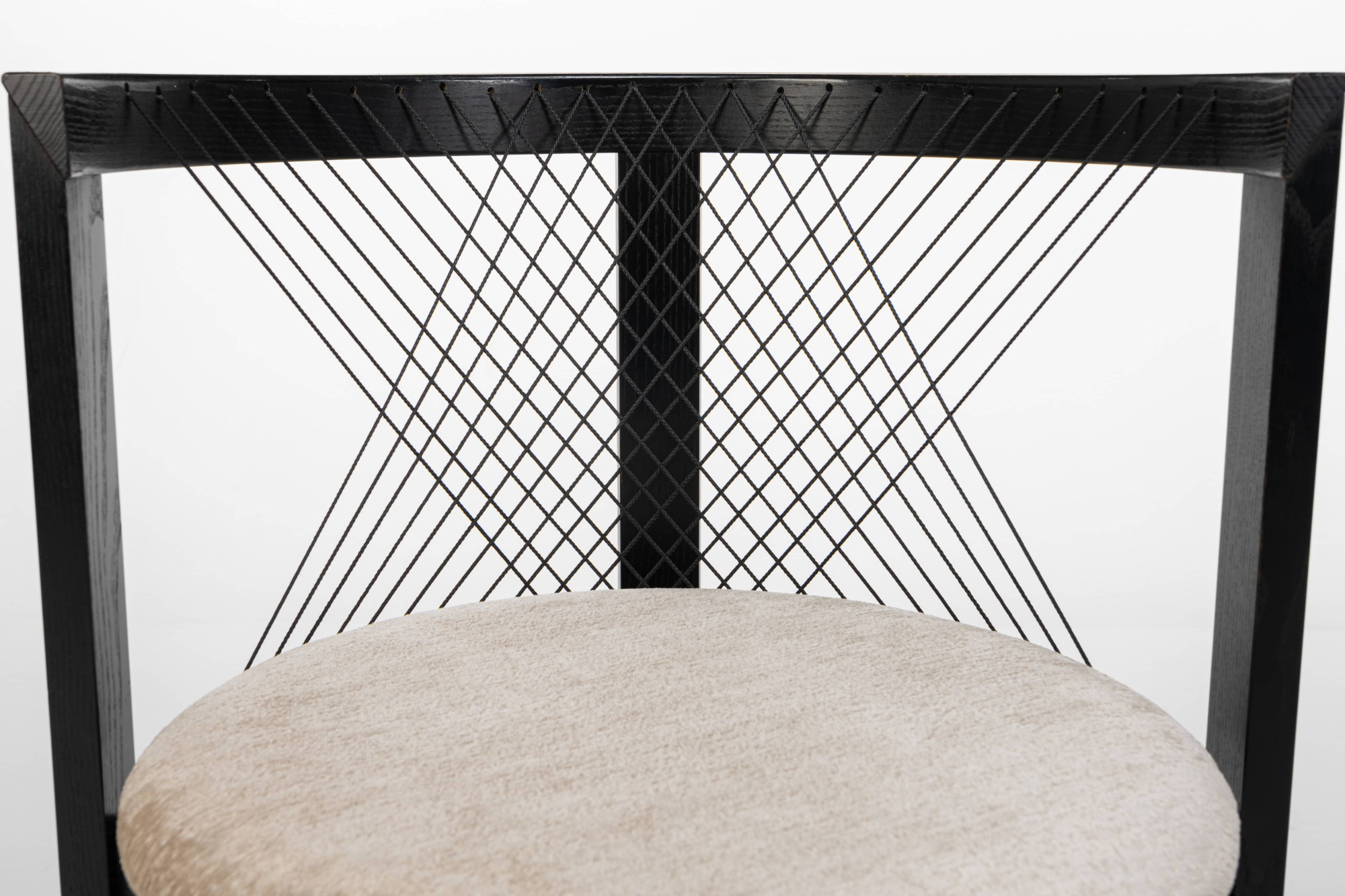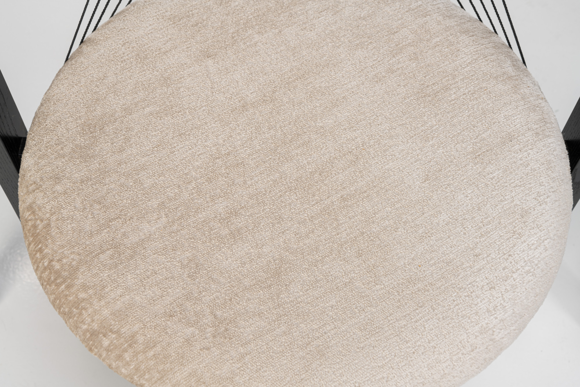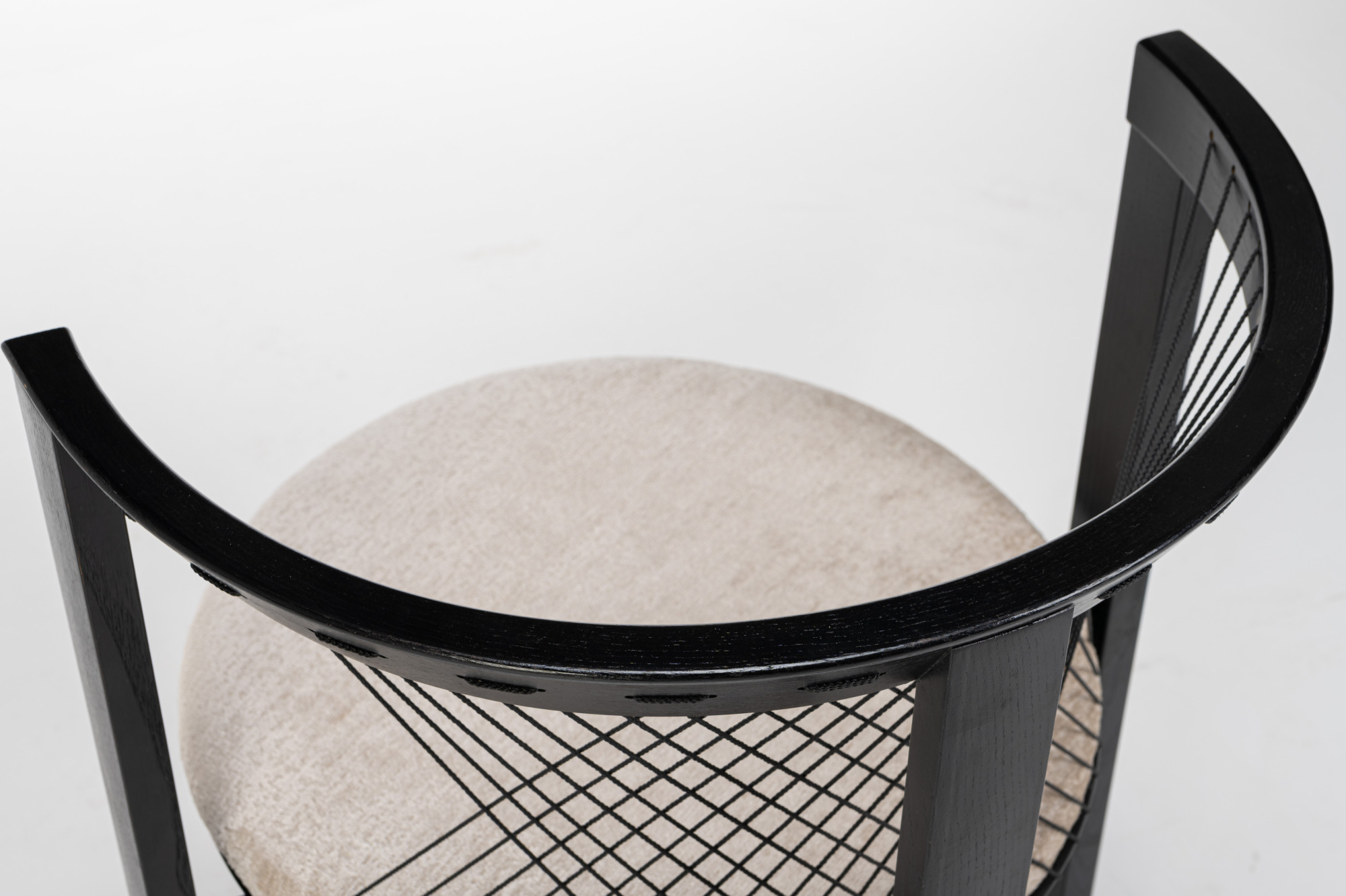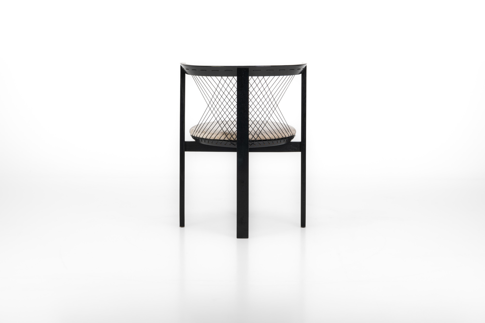 Set of four 'String' dining chairs designed by Niels Jørgen Haugesen for Tranekaer Furniture, Denmark 1990s. The chairs have a wooden frame and are reupholstered with a cream beige fabric. Marked by the producer.