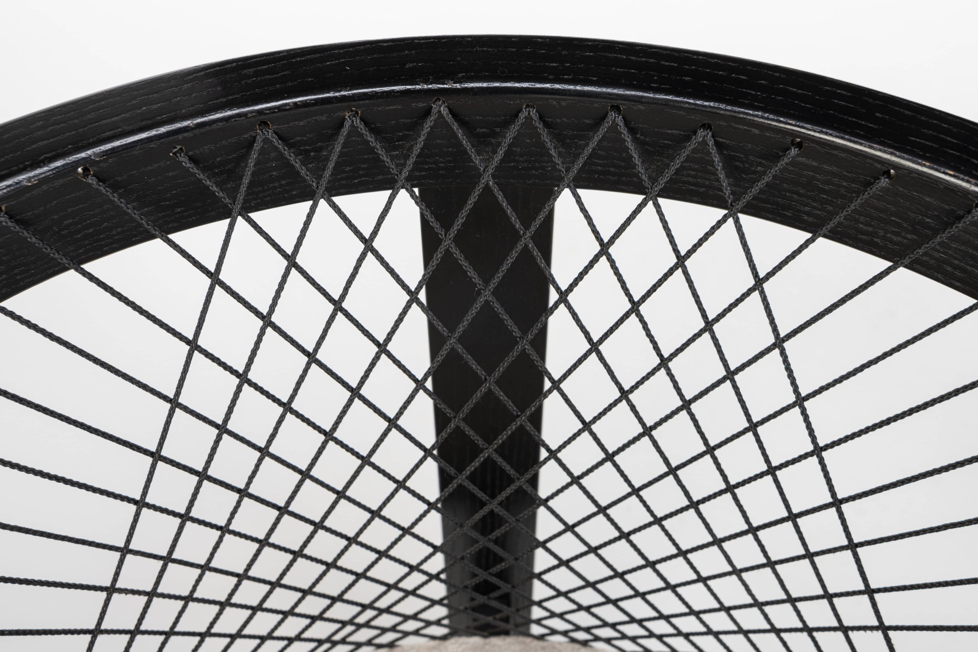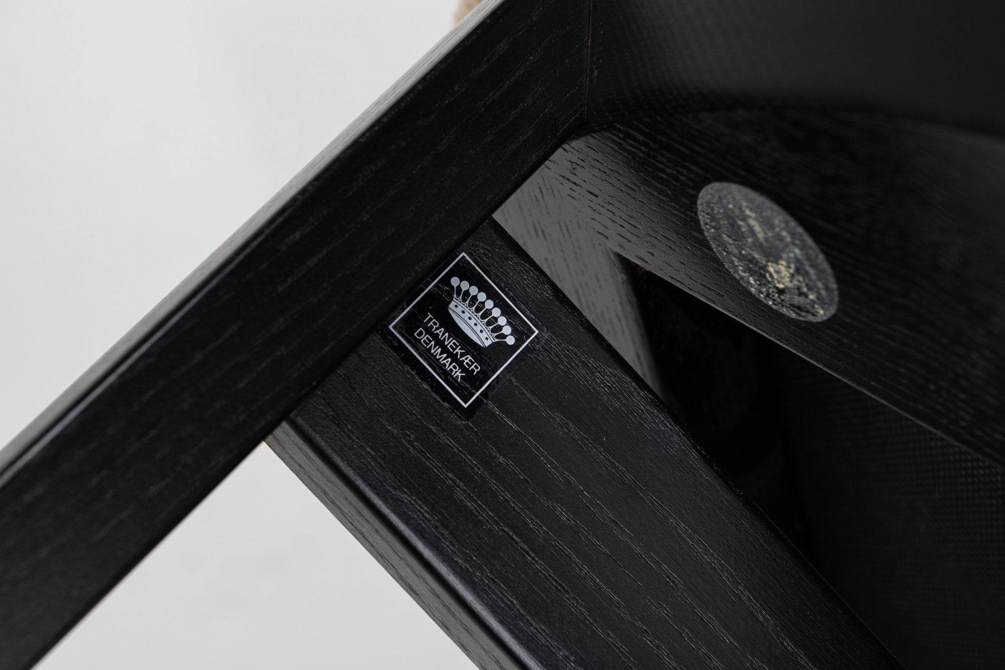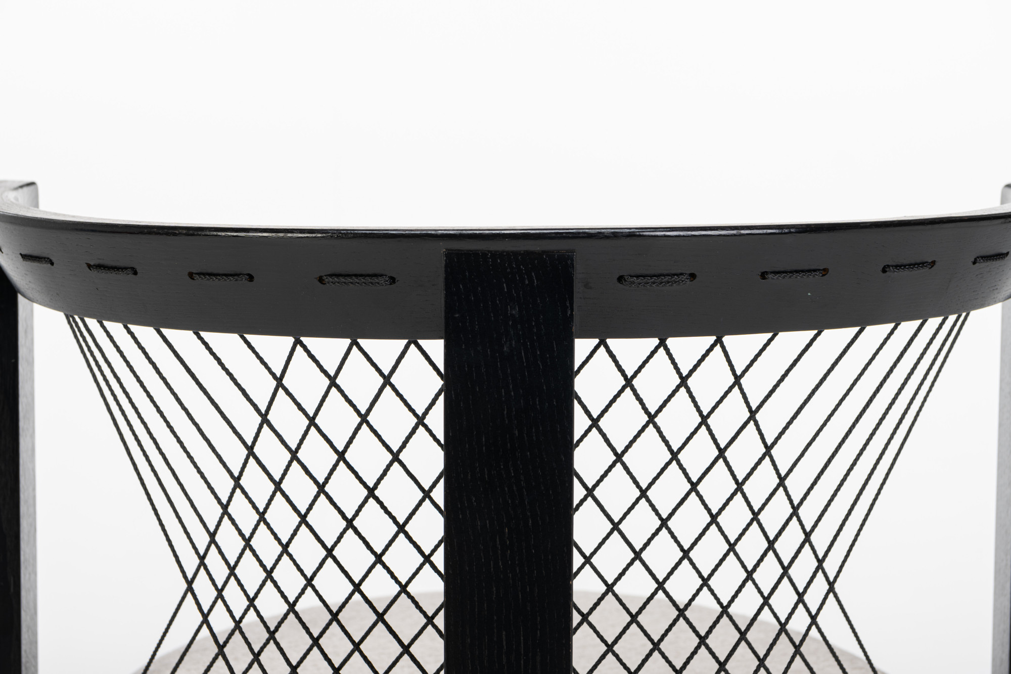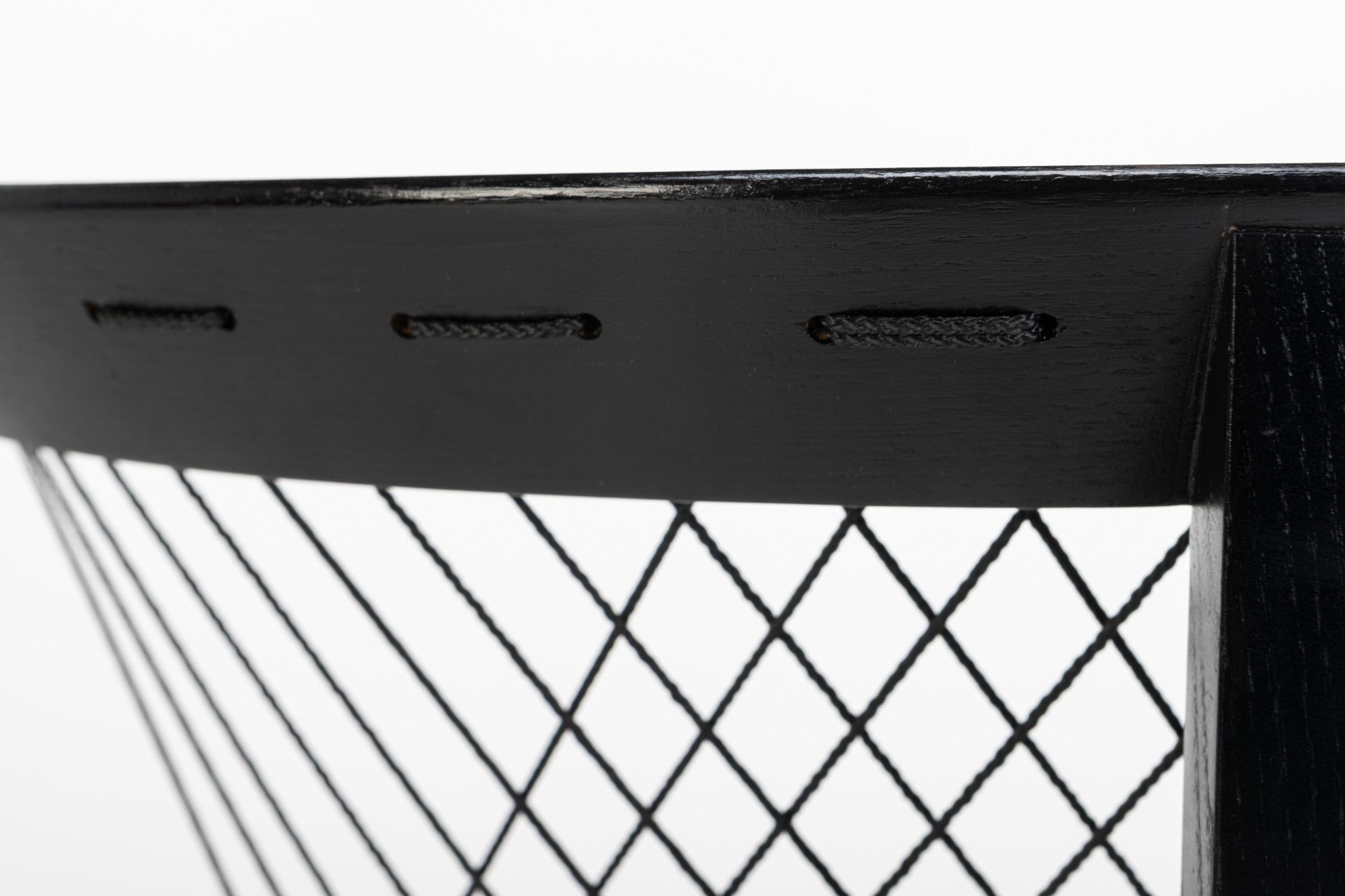 Set of four 'String' dining chairs designed by Niels Jørgen Haugesen for Tranekaer Furniture, Denmark 1990s. The chairs have a wooden frame and are reupholstered with a cream beige fabric. Marked by the producer.