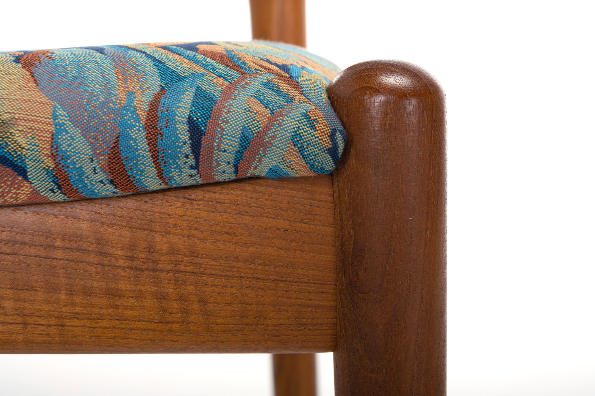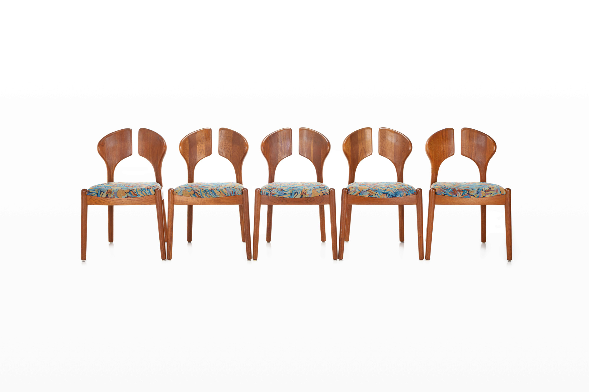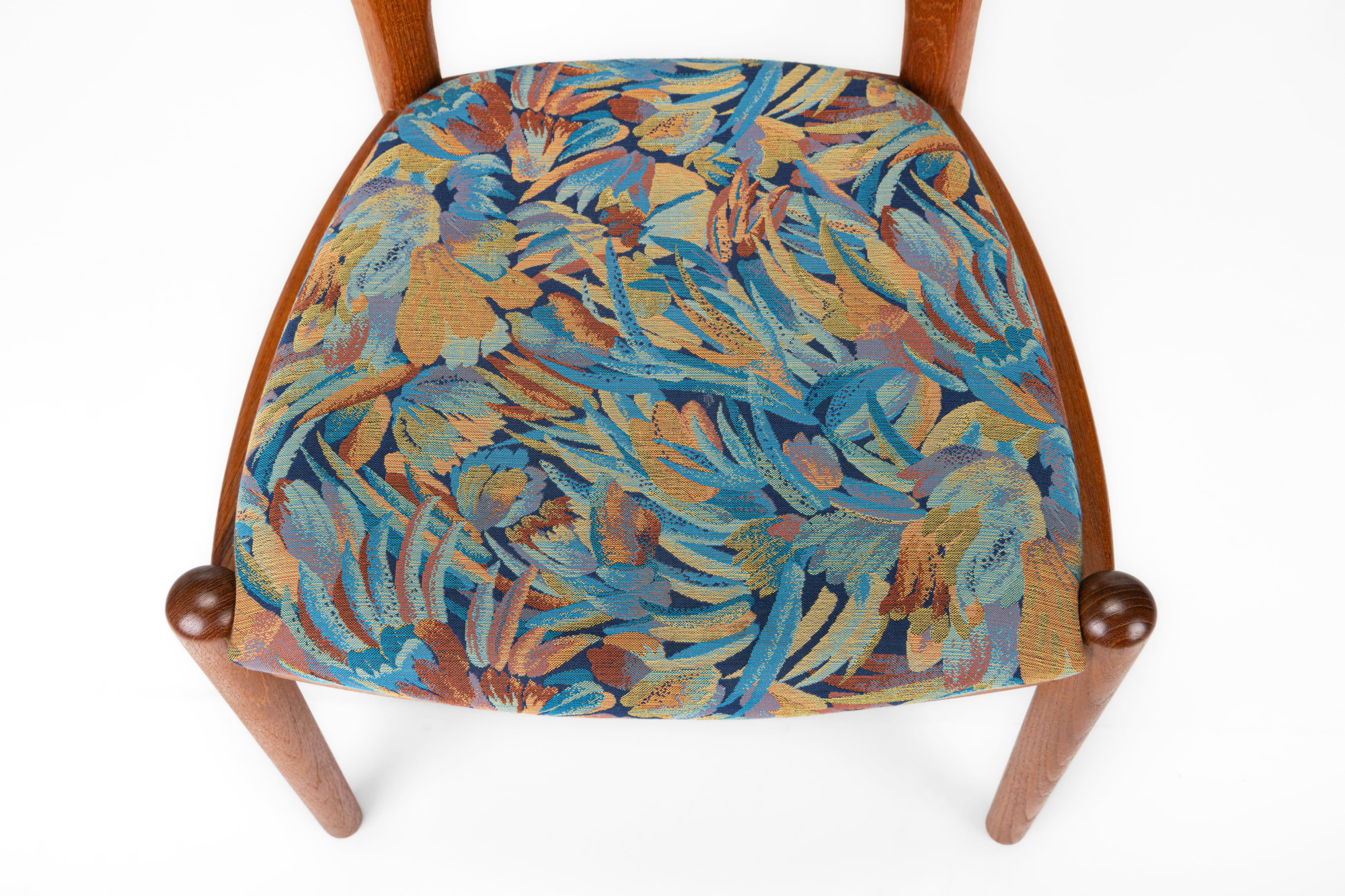 Set of 5 Danish vintage dining chairs. The chairs are made of solid teak wood, have a floral fabric and are in very good condition.
