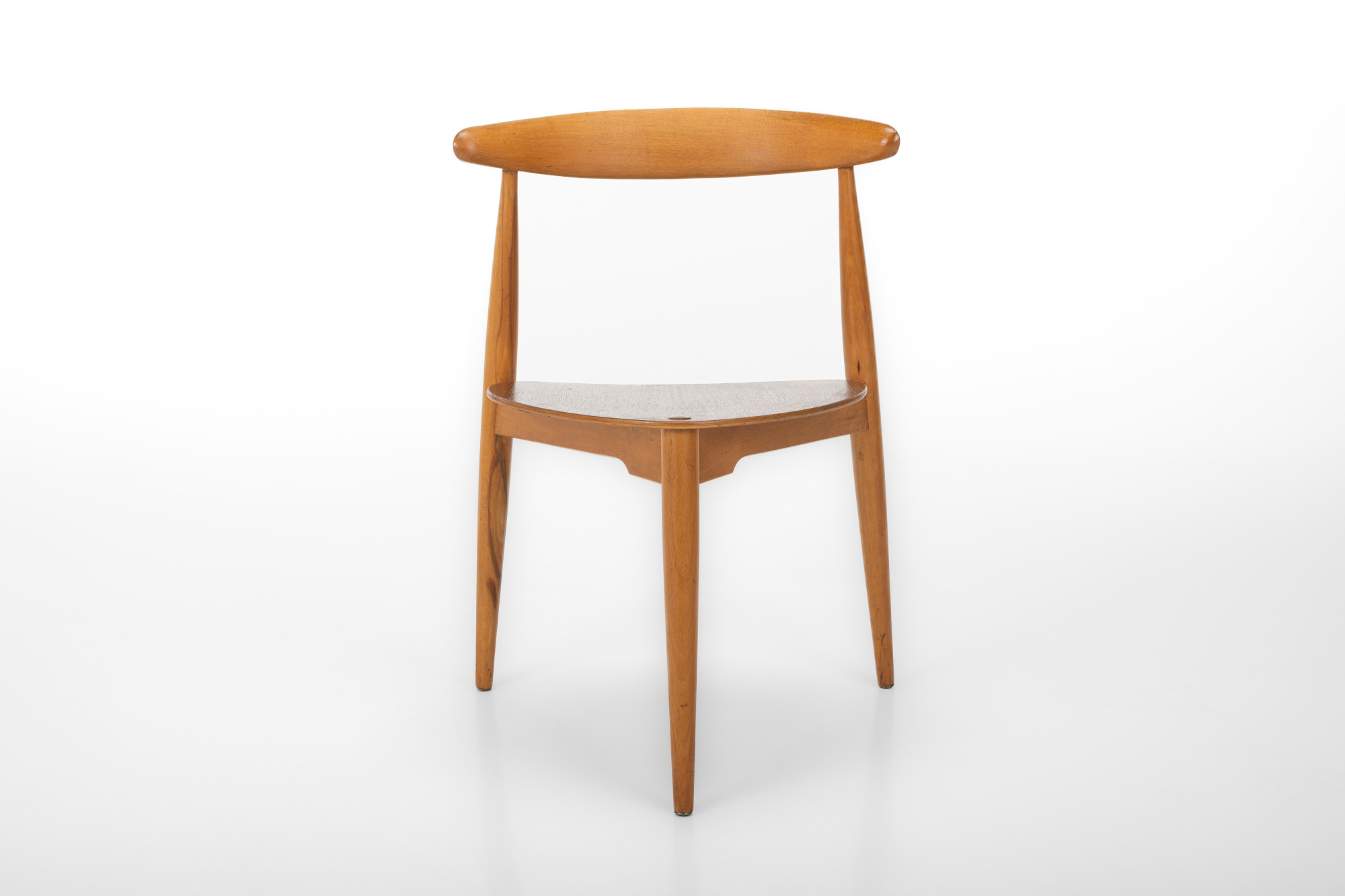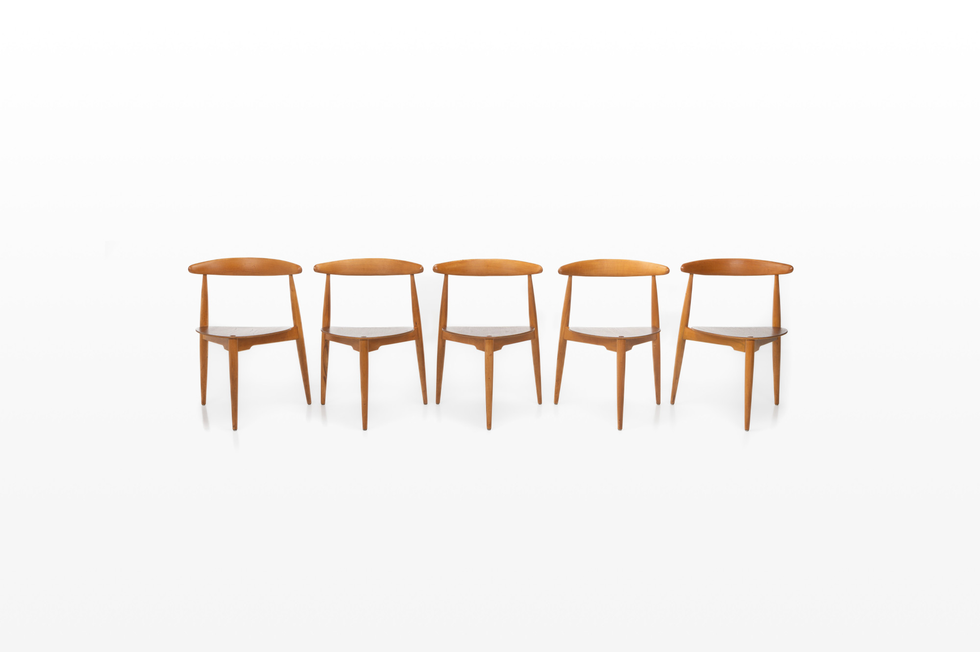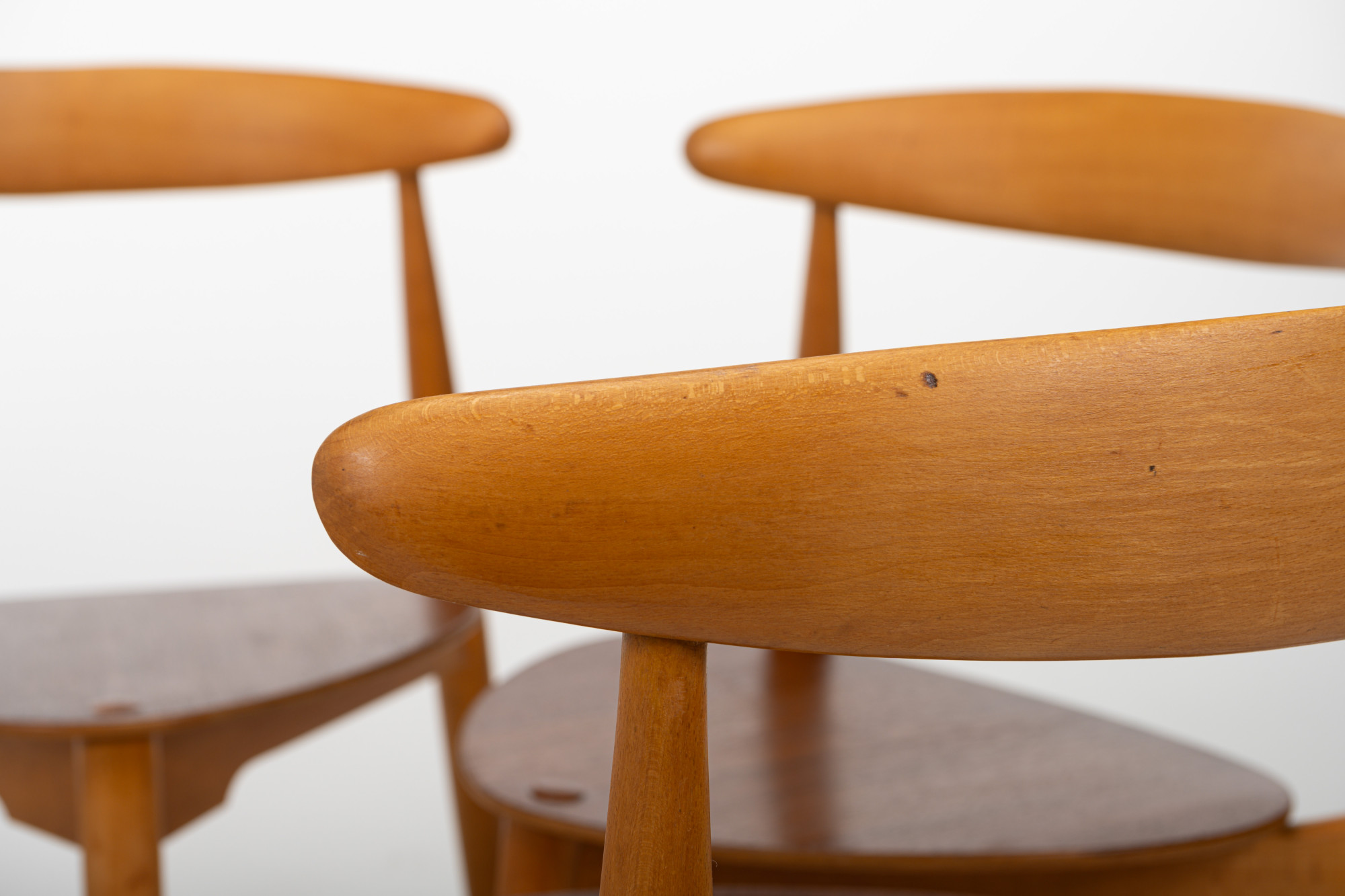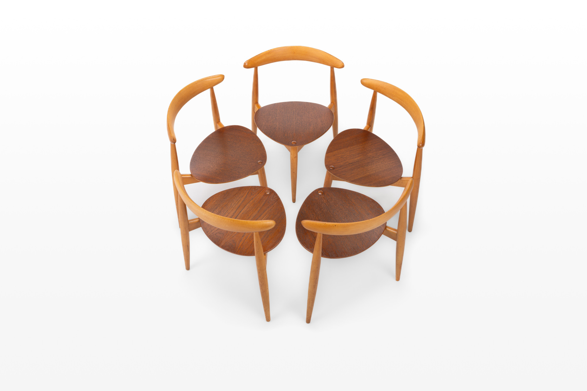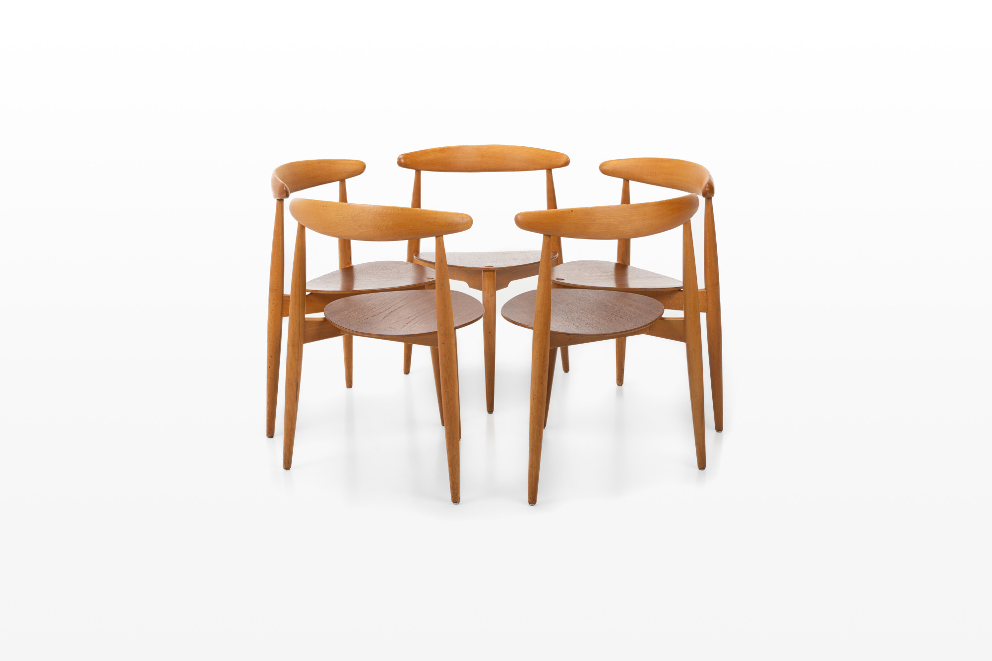 Set of five vintage 'heart' dining chairs designed by Hans J. Wegner for Fritz Hansen, Denmark 1950s. Designed as model 'FH4103'. The chairs have a beech frame and a teak seating. These three-legged chairs are stackable and are in great condtion.