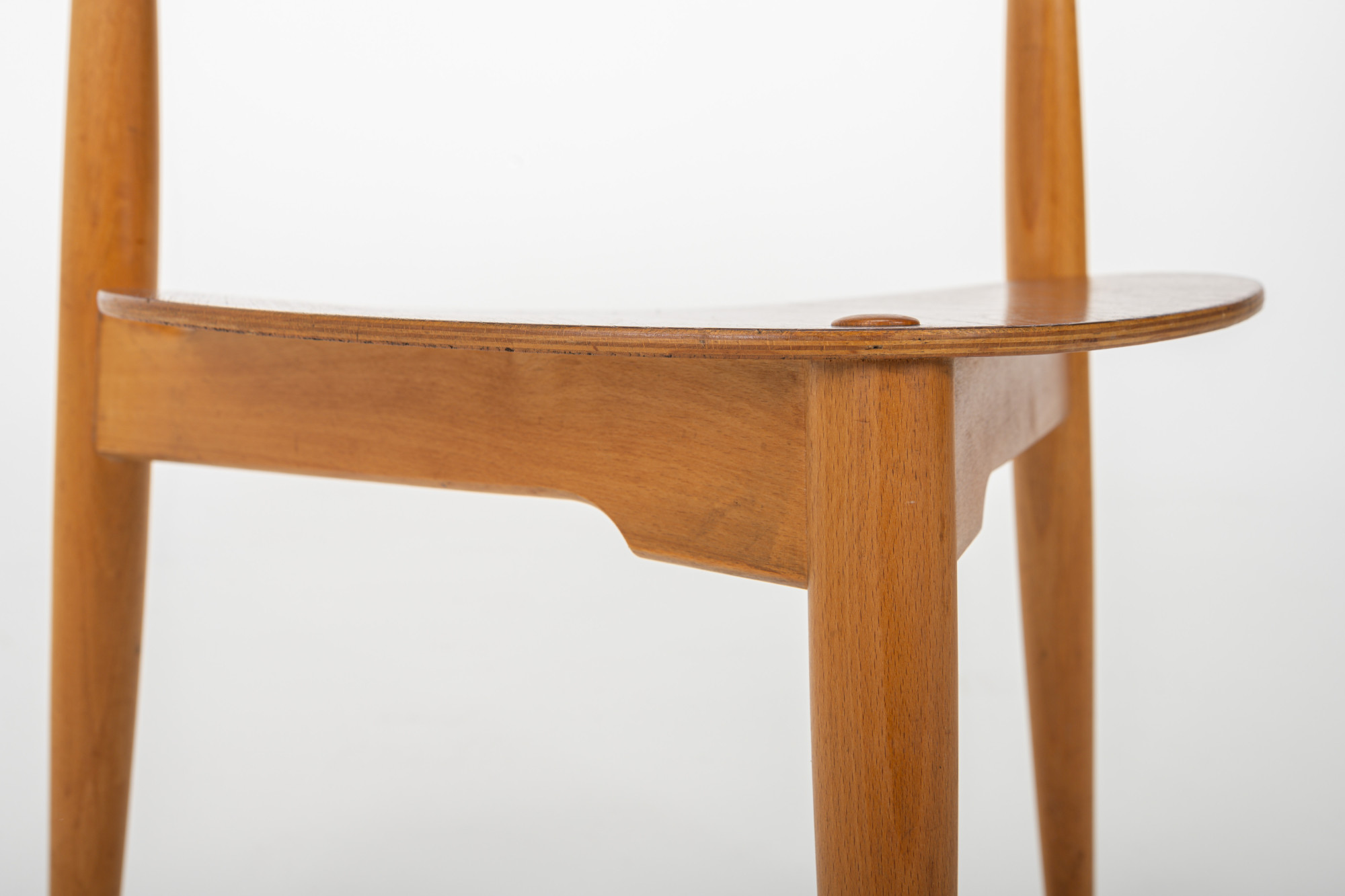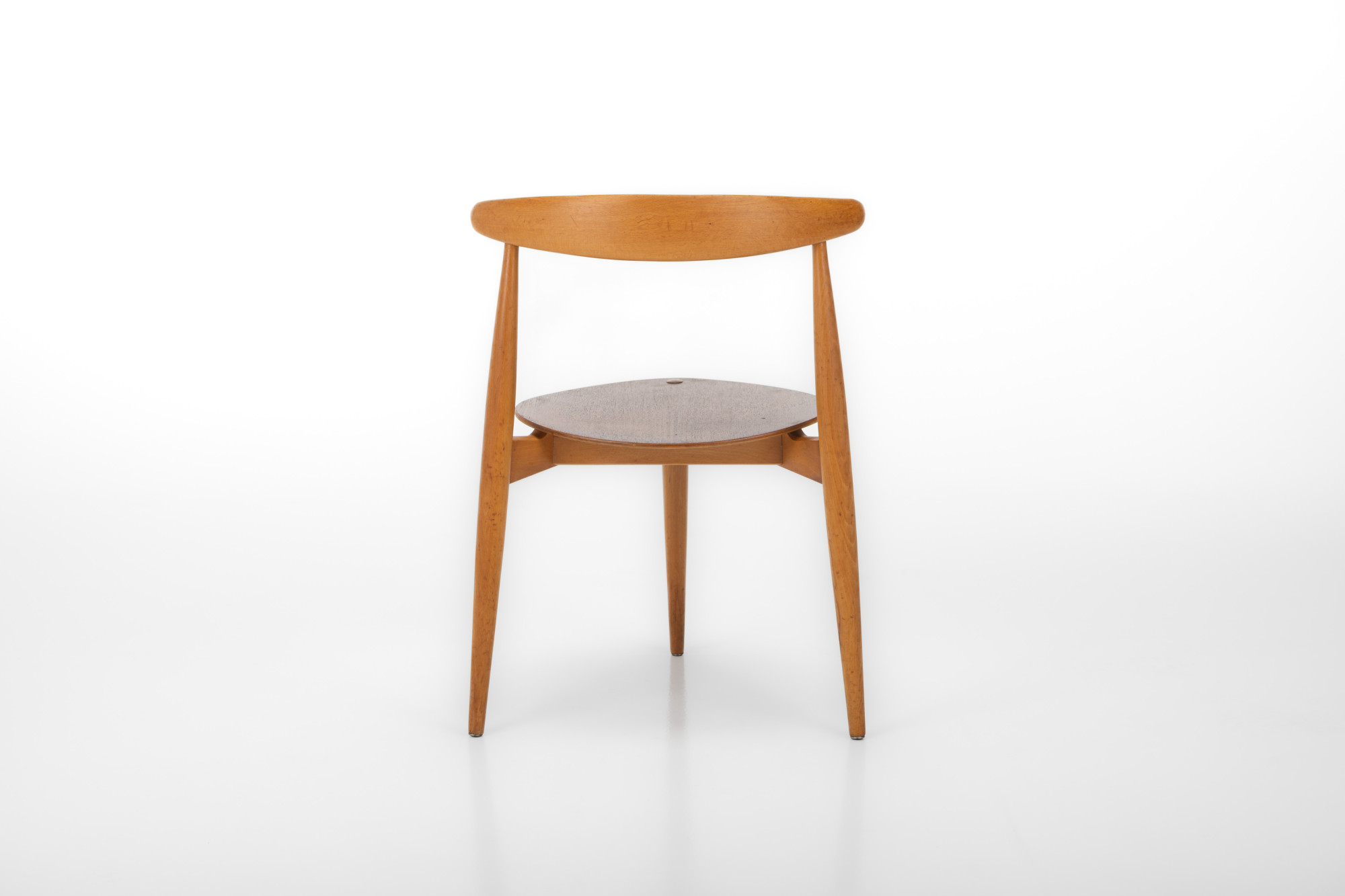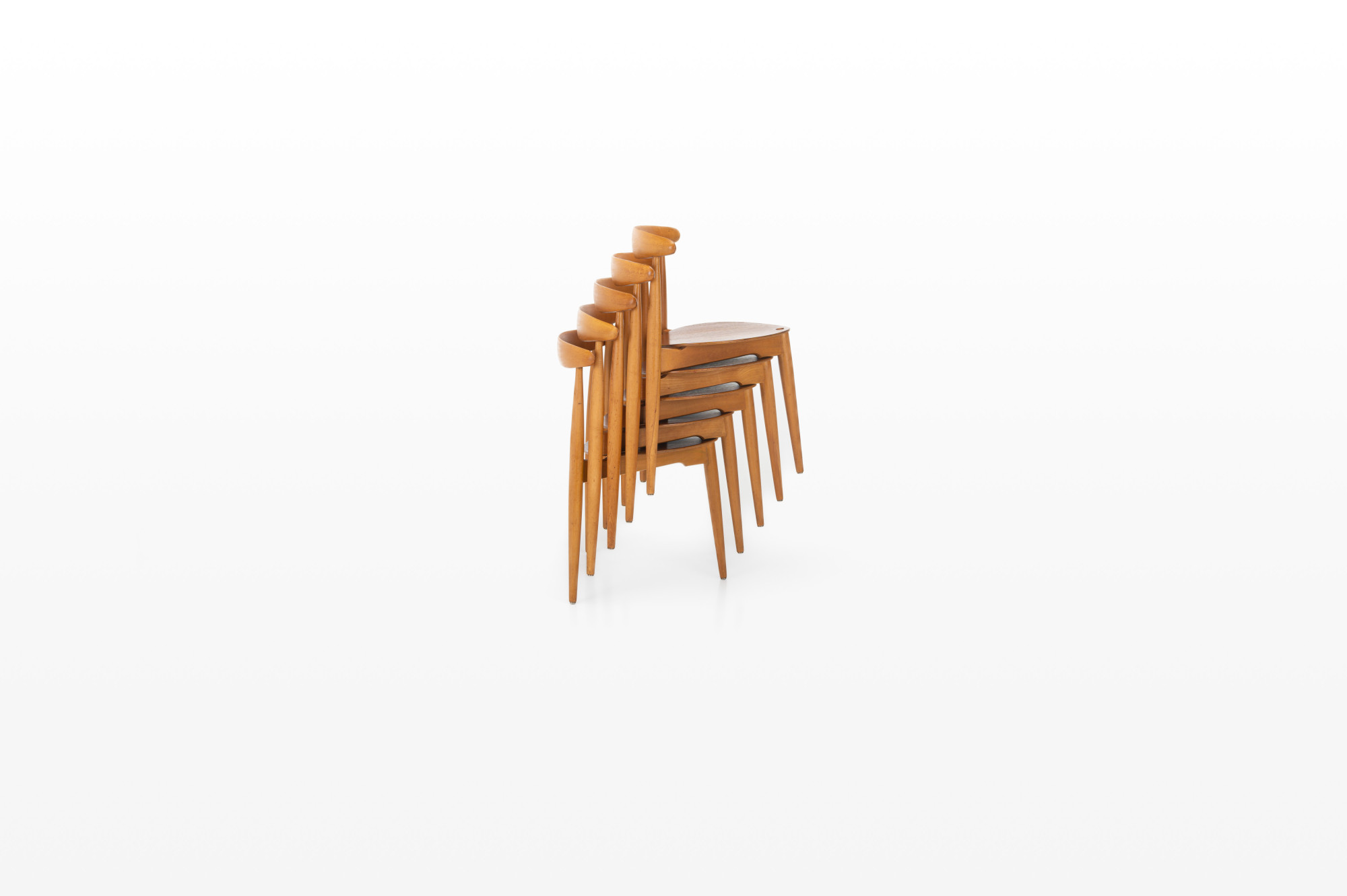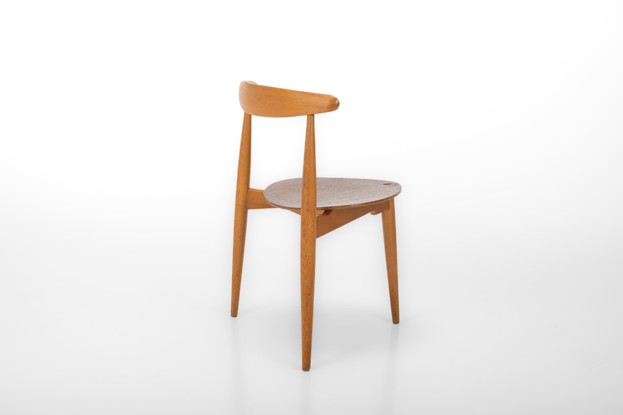 Set of five vintage 'heart' dining chairs designed by Hans J. Wegner for Fritz Hansen, Denmark 1950s. Designed as model 'FH4103'. The chairs have a beech frame and a teak seating. These three-legged chairs are stackable and are in great condtion.