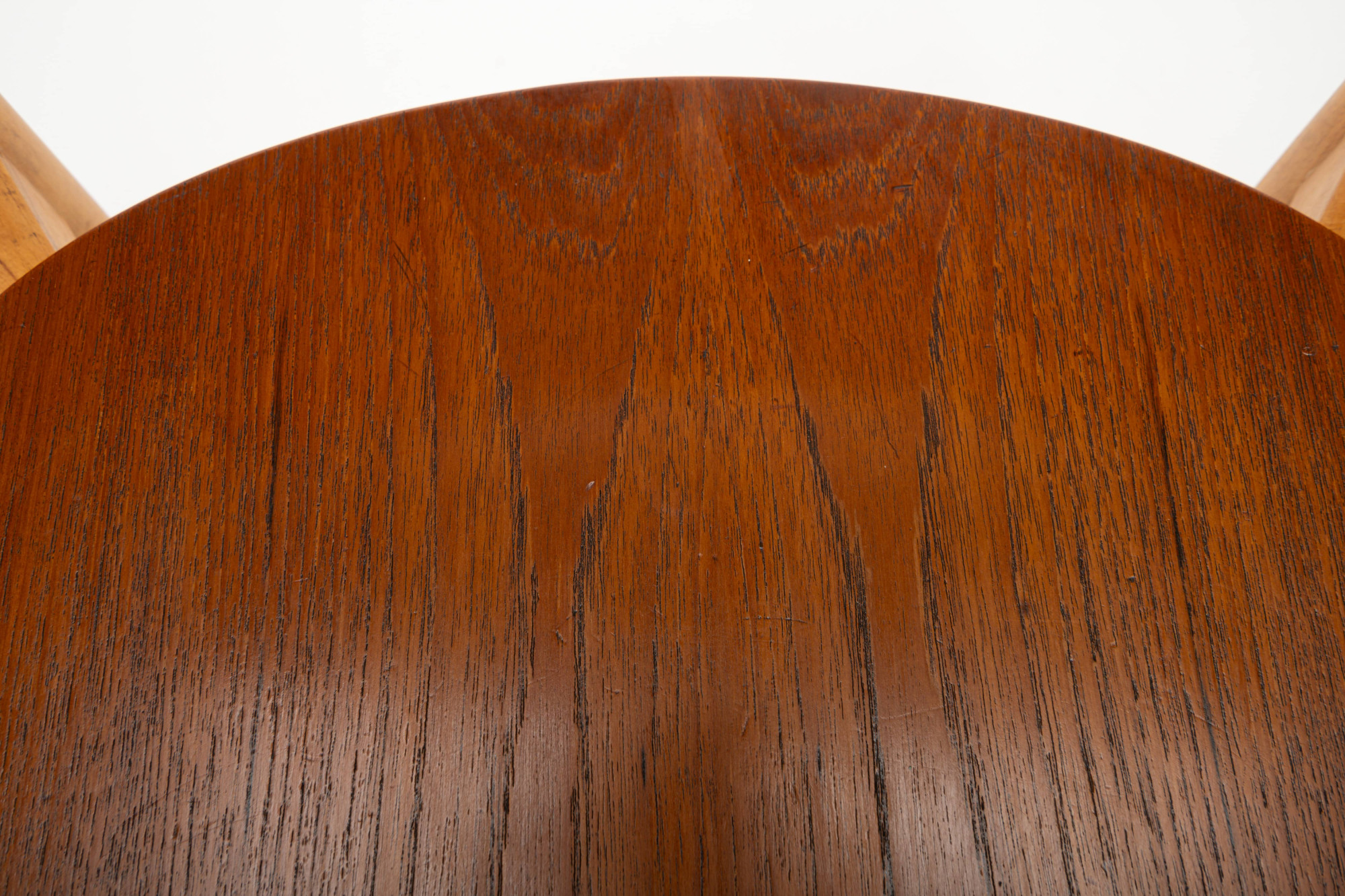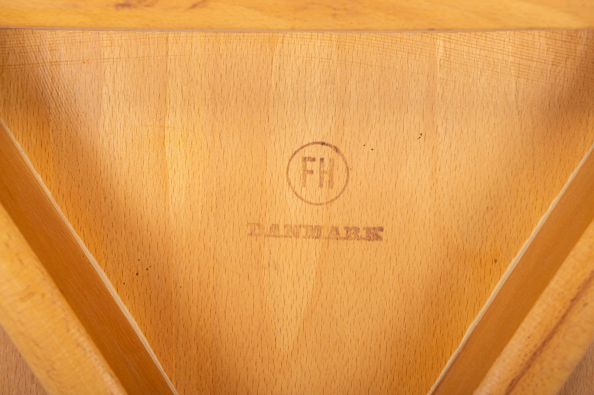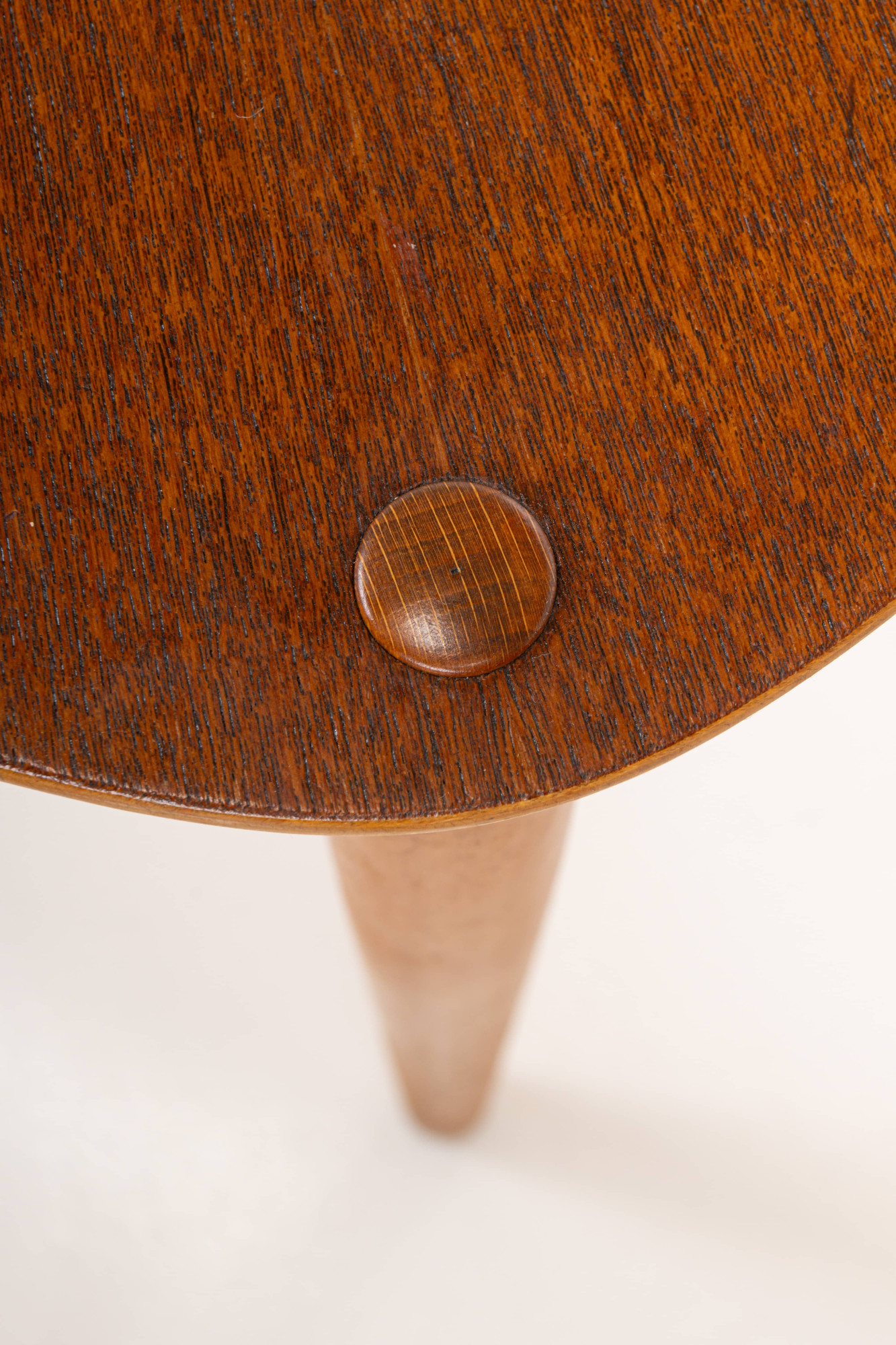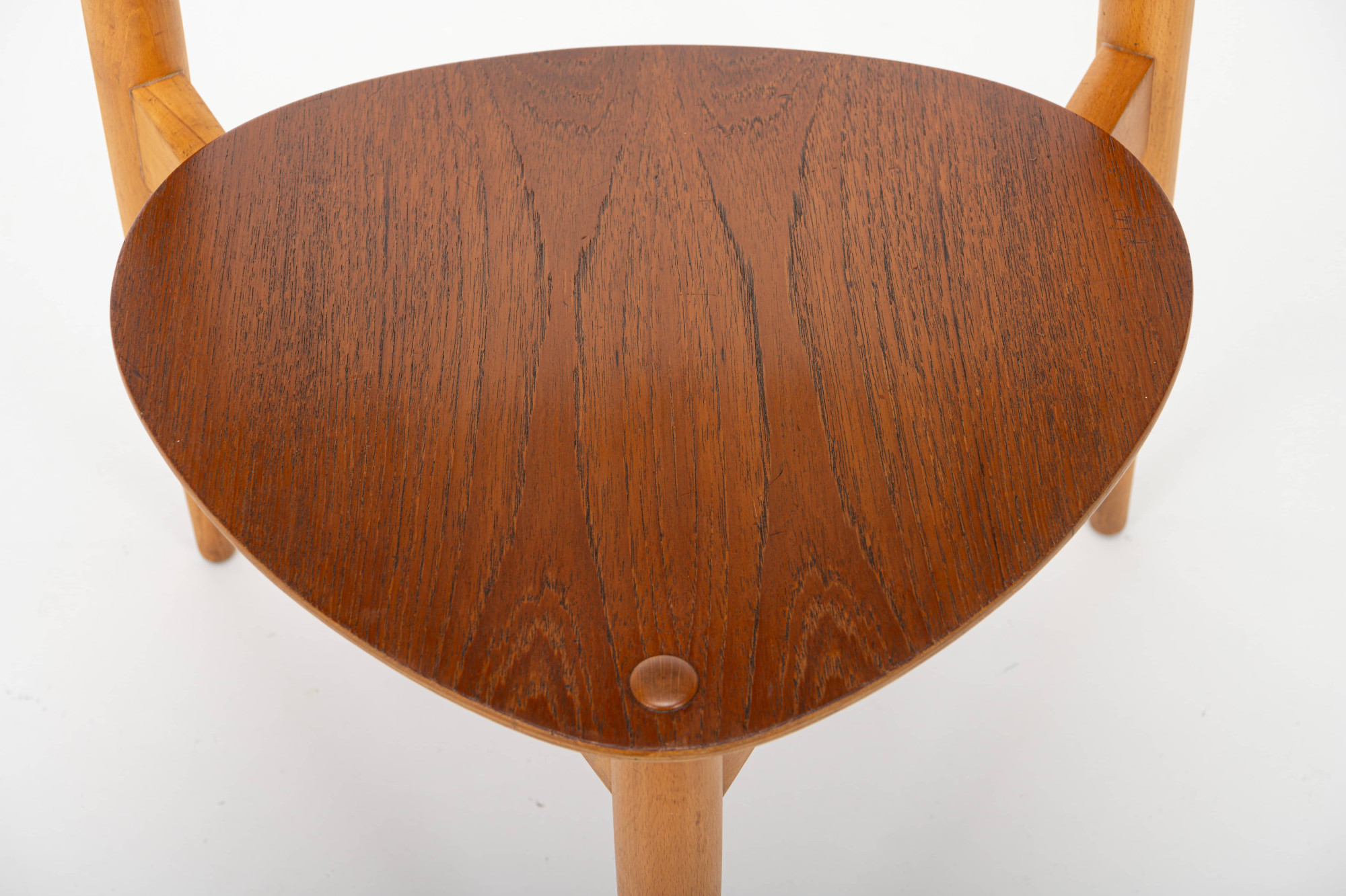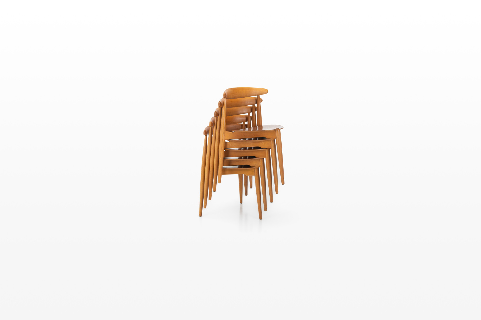 Set of five vintage 'heart' dining chairs designed by Hans J. Wegner for Fritz Hansen, Denmark 1950s. Designed as model 'FH4103'. The chairs have a beech frame and a teak seating. These three-legged chairs are stackable and are in great condtion.