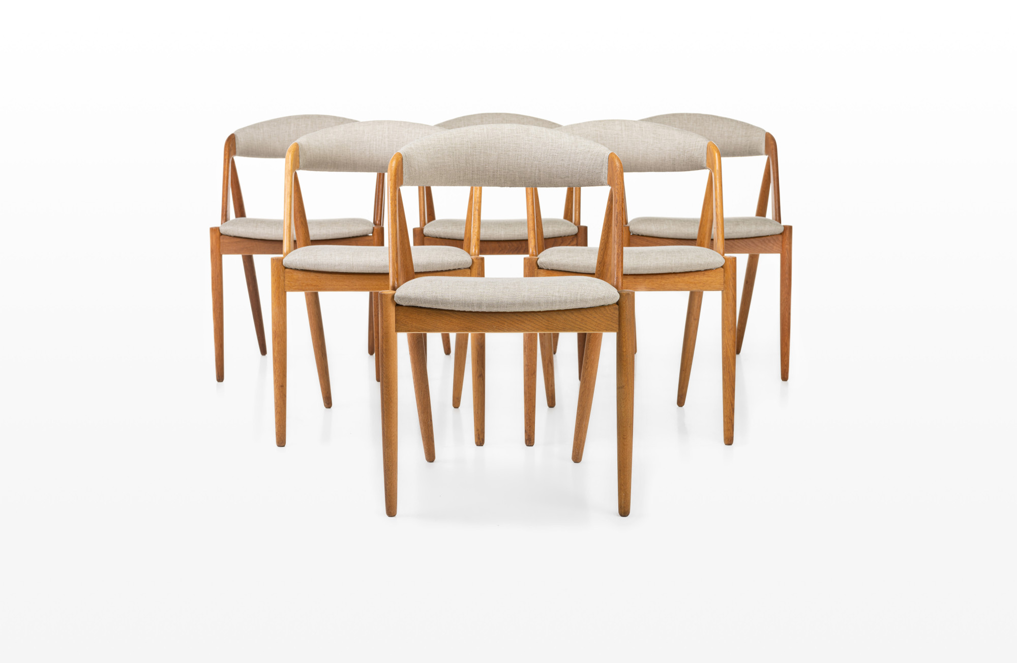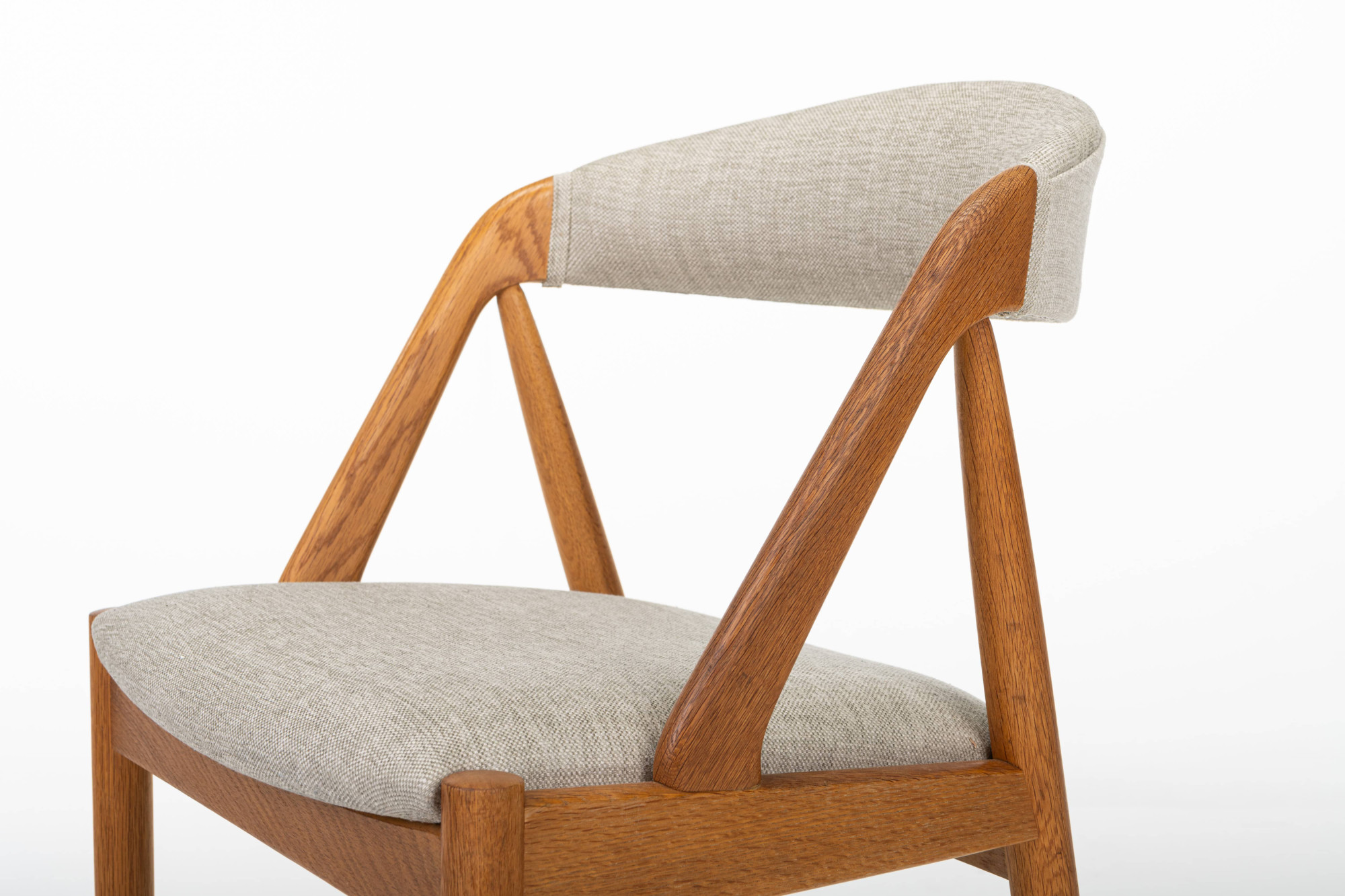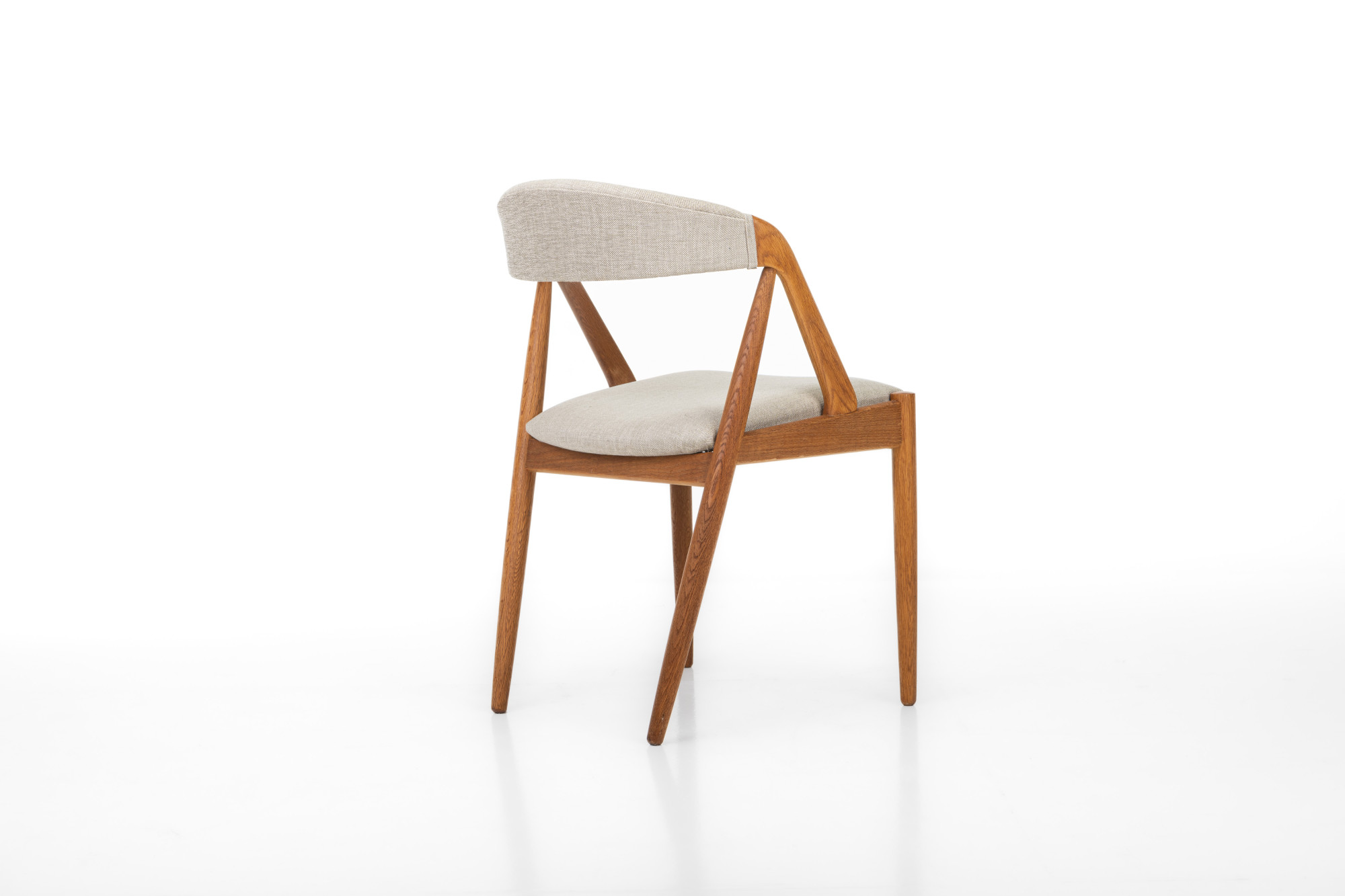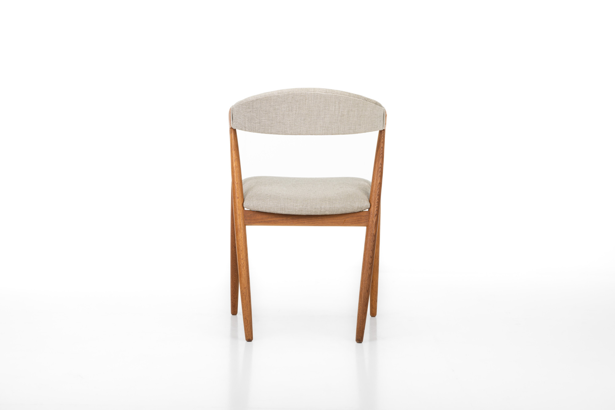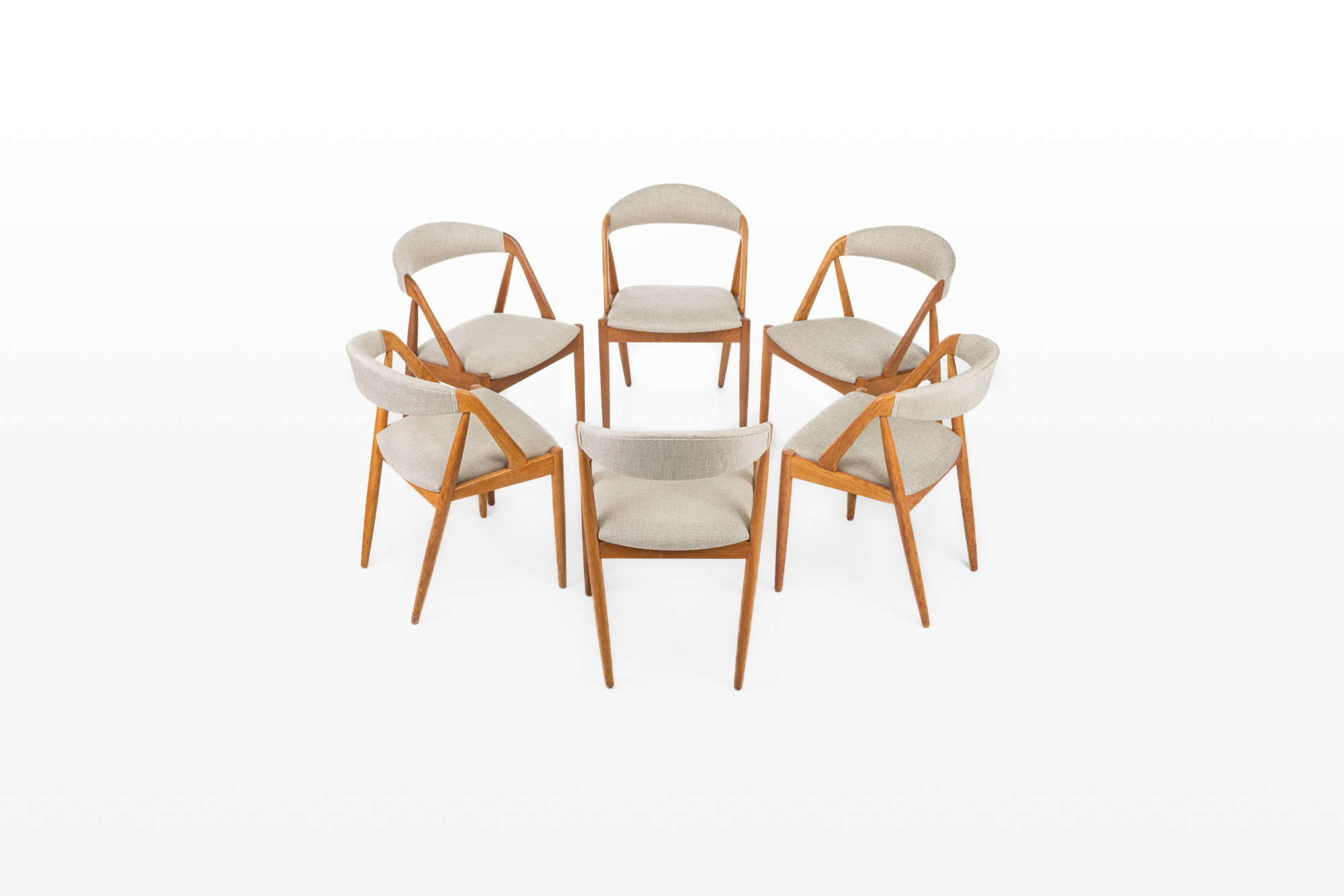 Very nice set of six 'Model 31' chairs designed by Kai Kristiansen for Schou Andersen Møbelfabrik, Denmark. This set has an oak fram and has been reupholstered with a beige grey fabric.