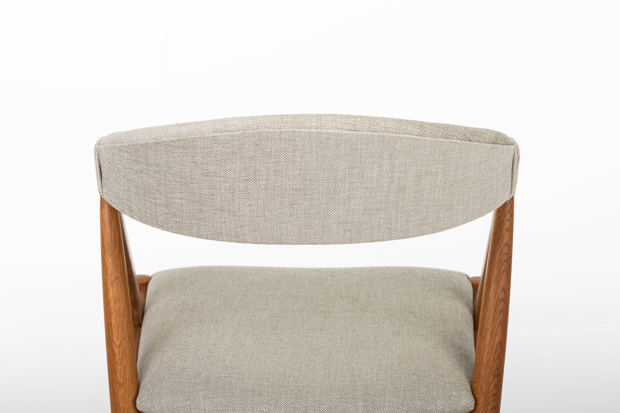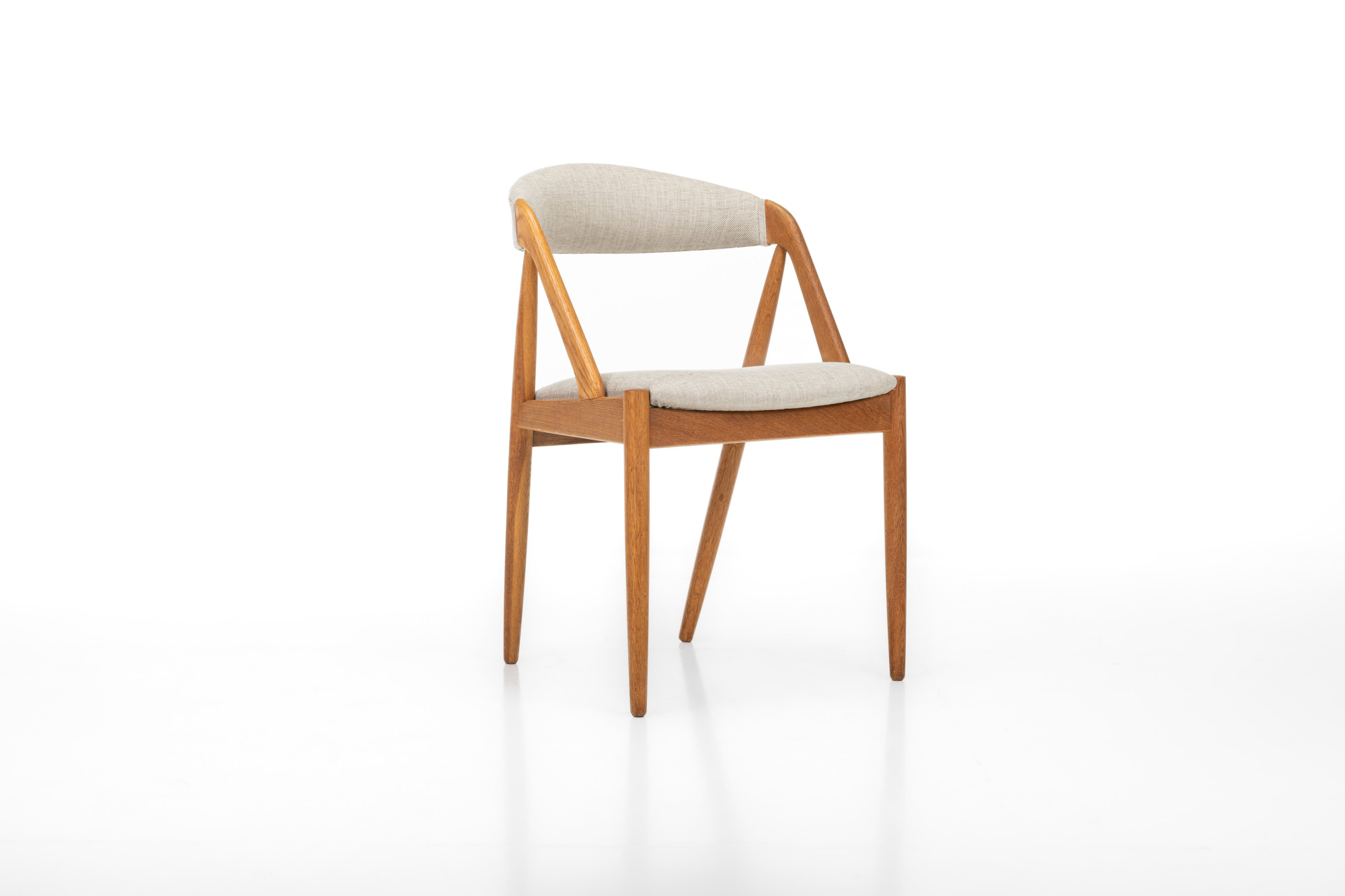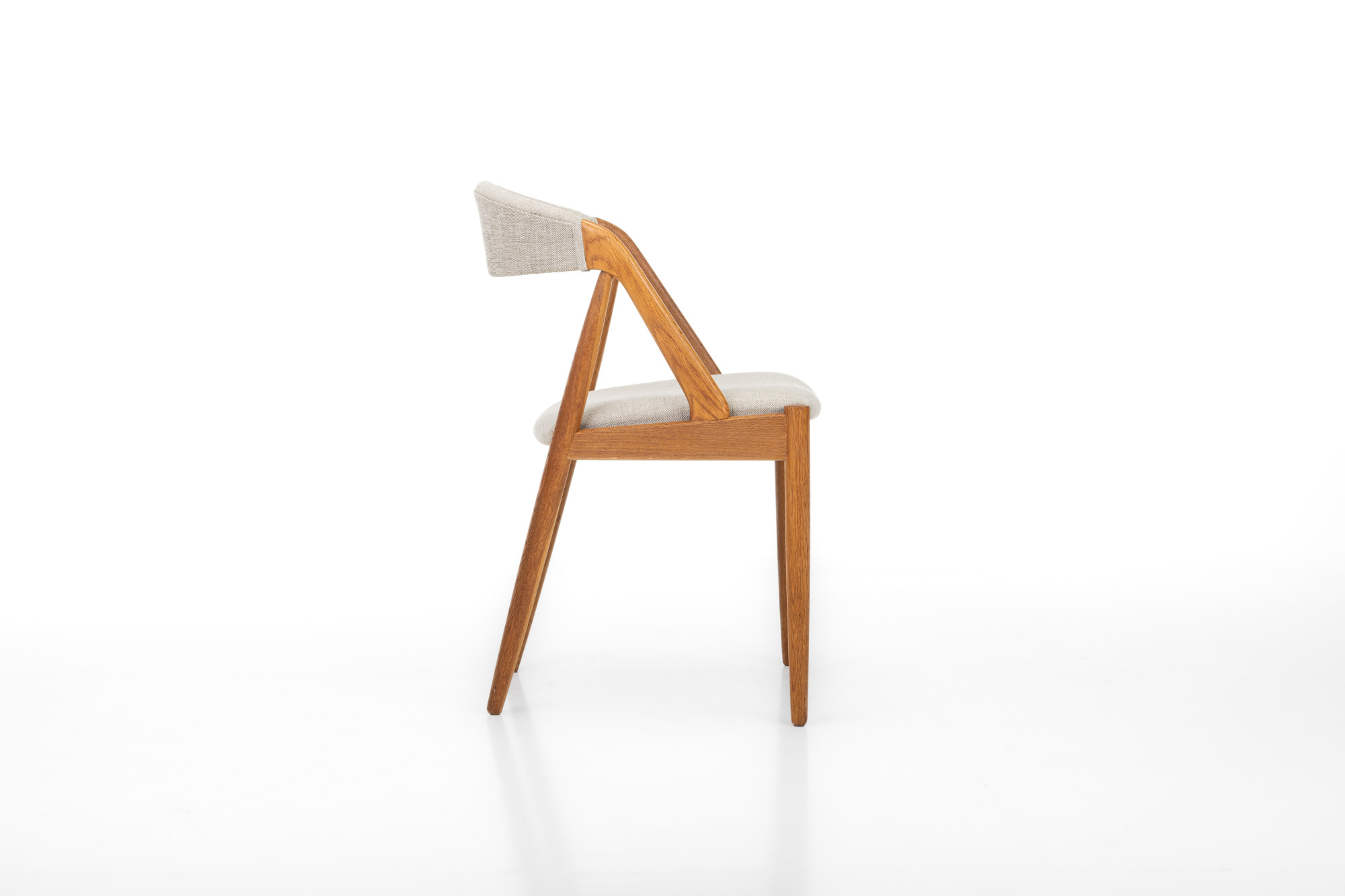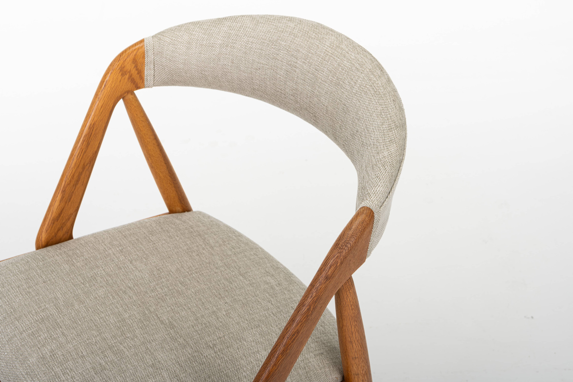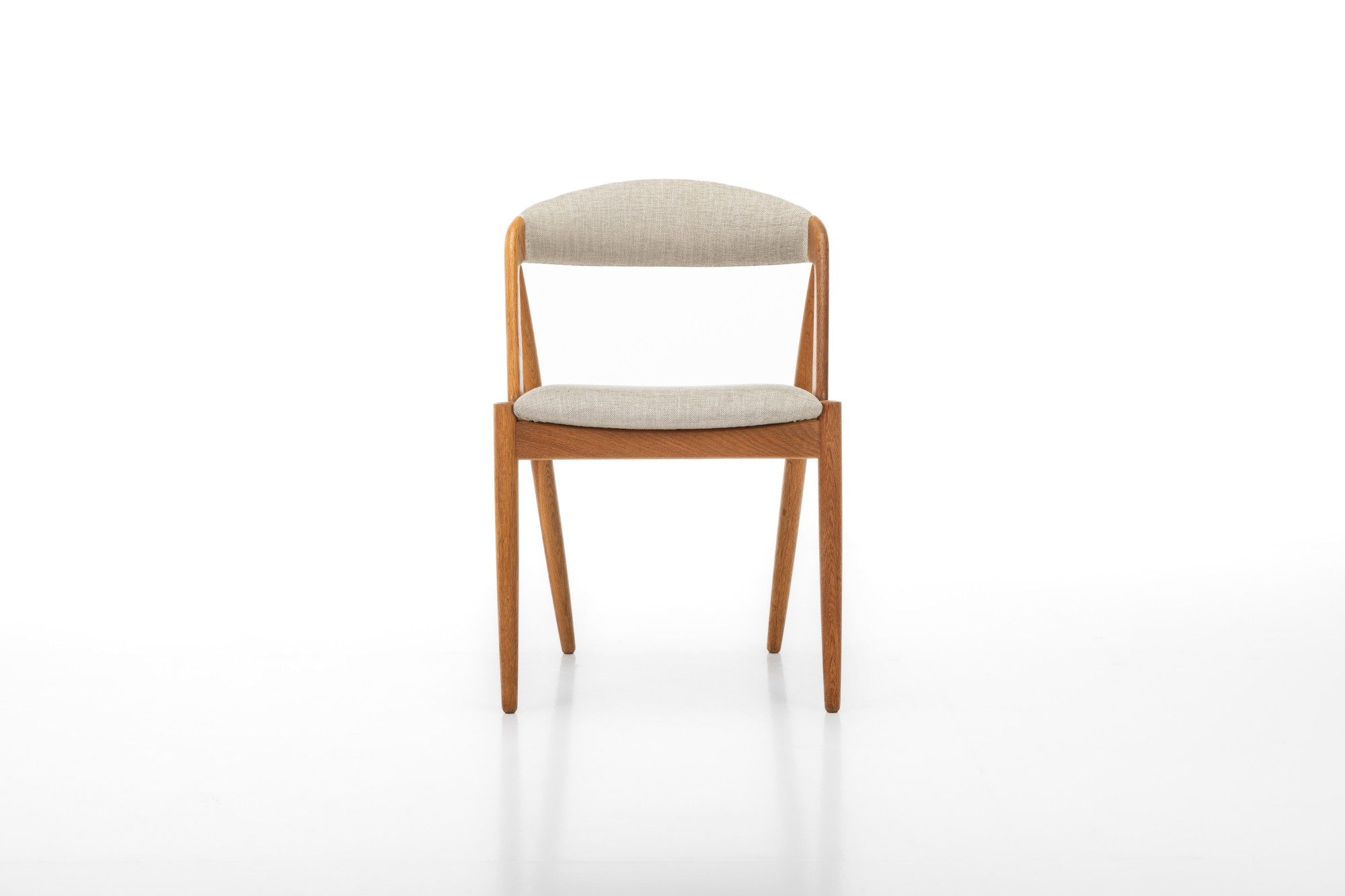 Very nice set of six 'Model 31' chairs designed by Kai Kristiansen for Schou Andersen Møbelfabrik, Denmark. This set has an oak fram and has been reupholstered with a beige grey fabric.