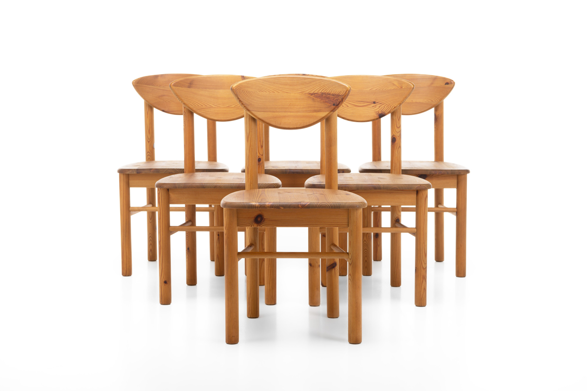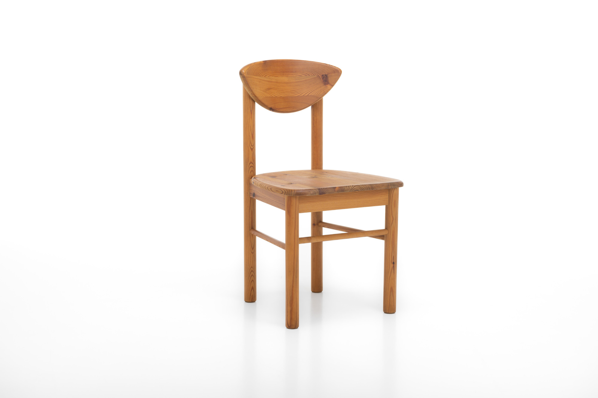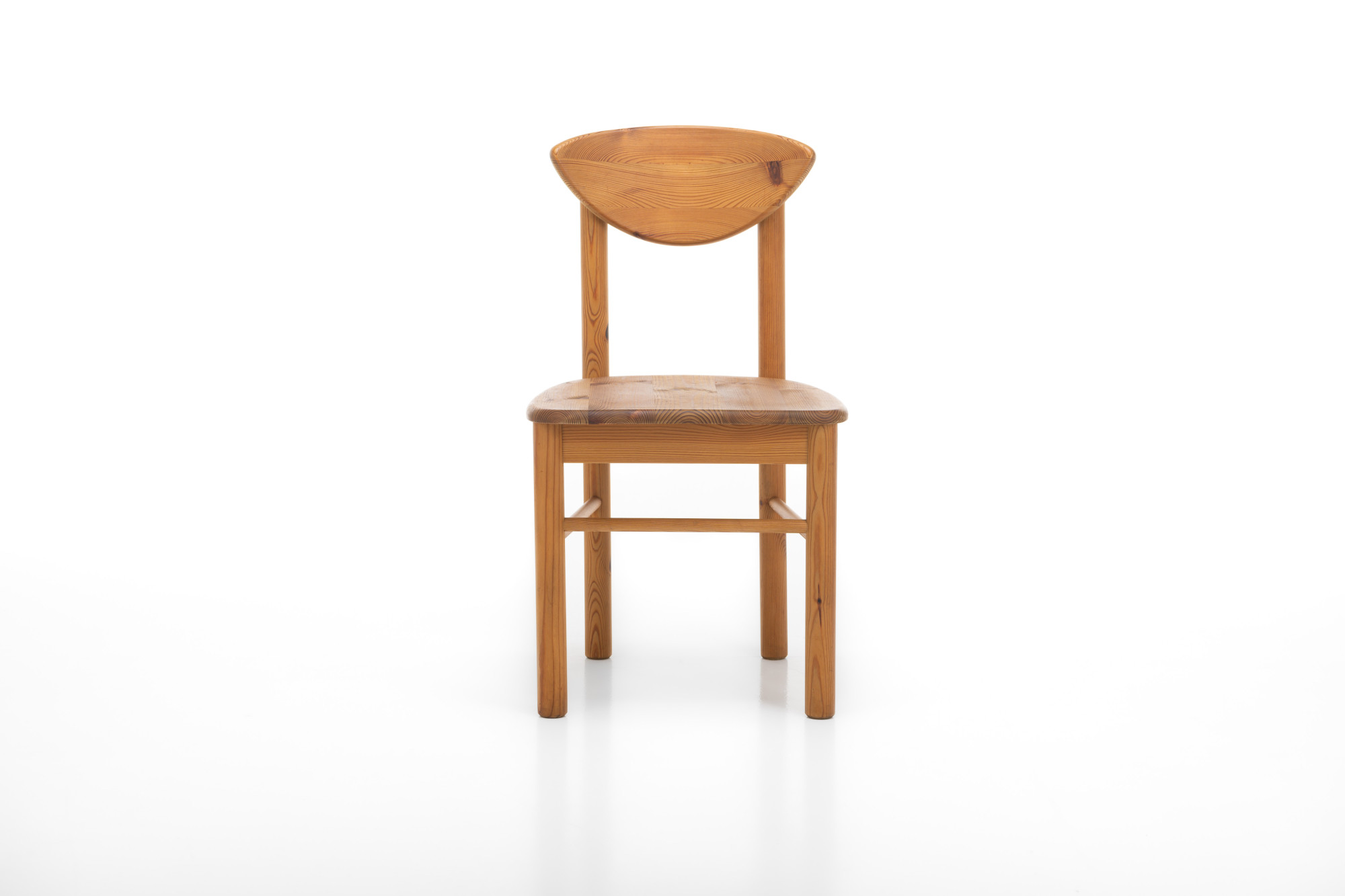 Charming set of comfy dining chairs made from solid pine. The natural design highlights the wood's grain and are very sturdy. These dining chairs are produced in Denmark in the 1970s.