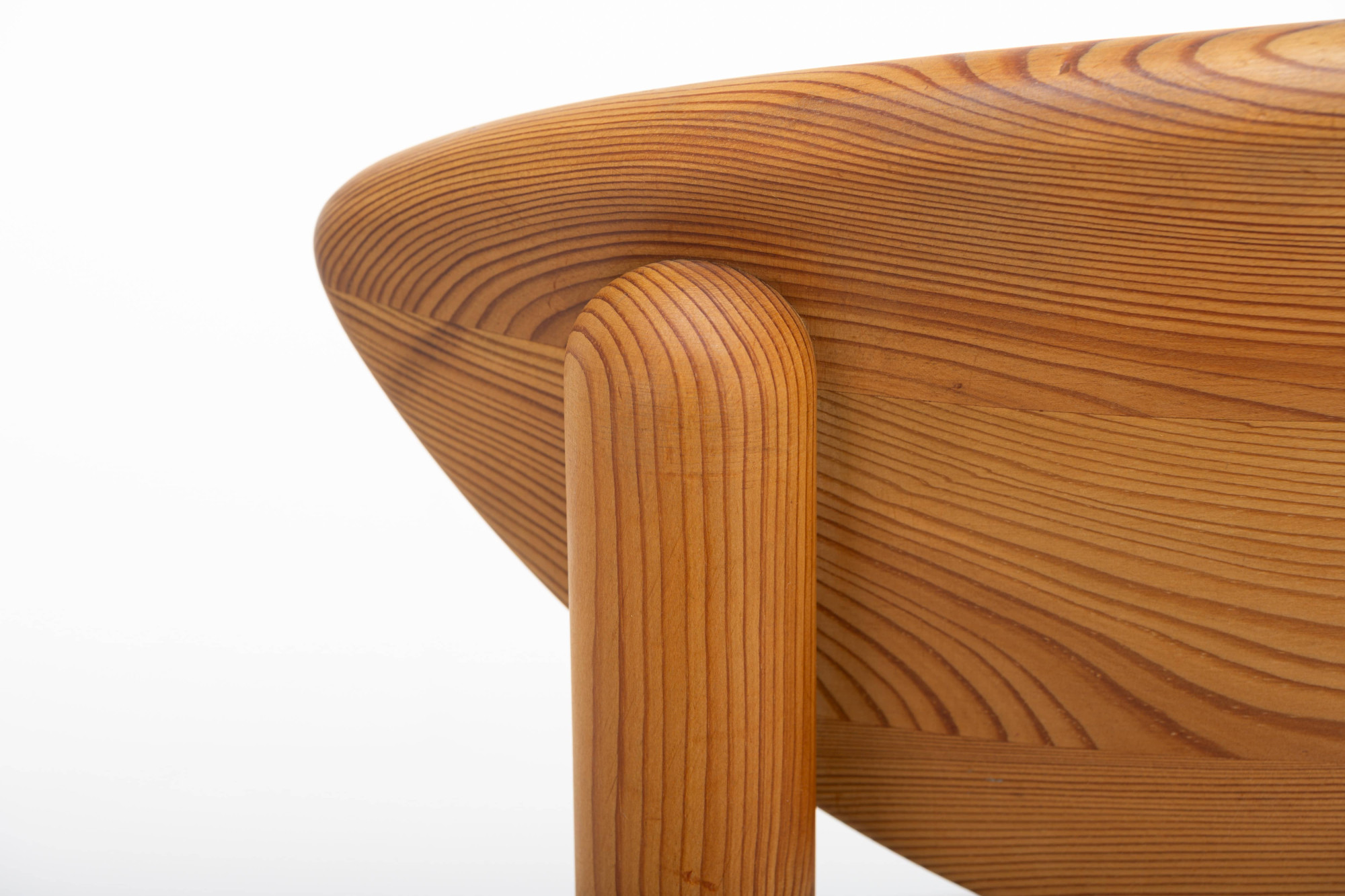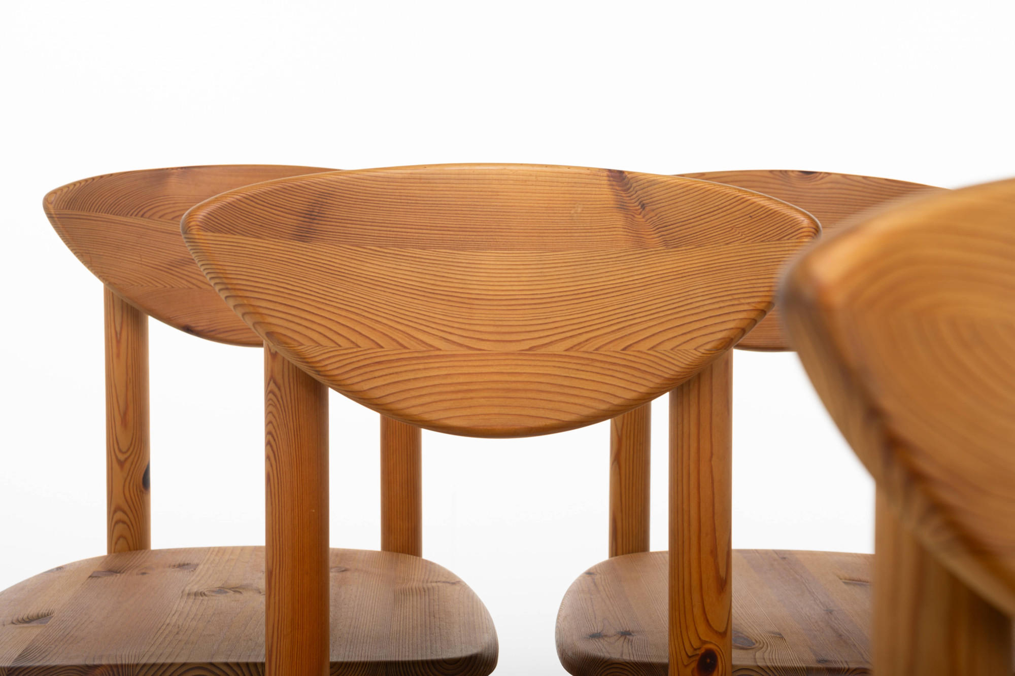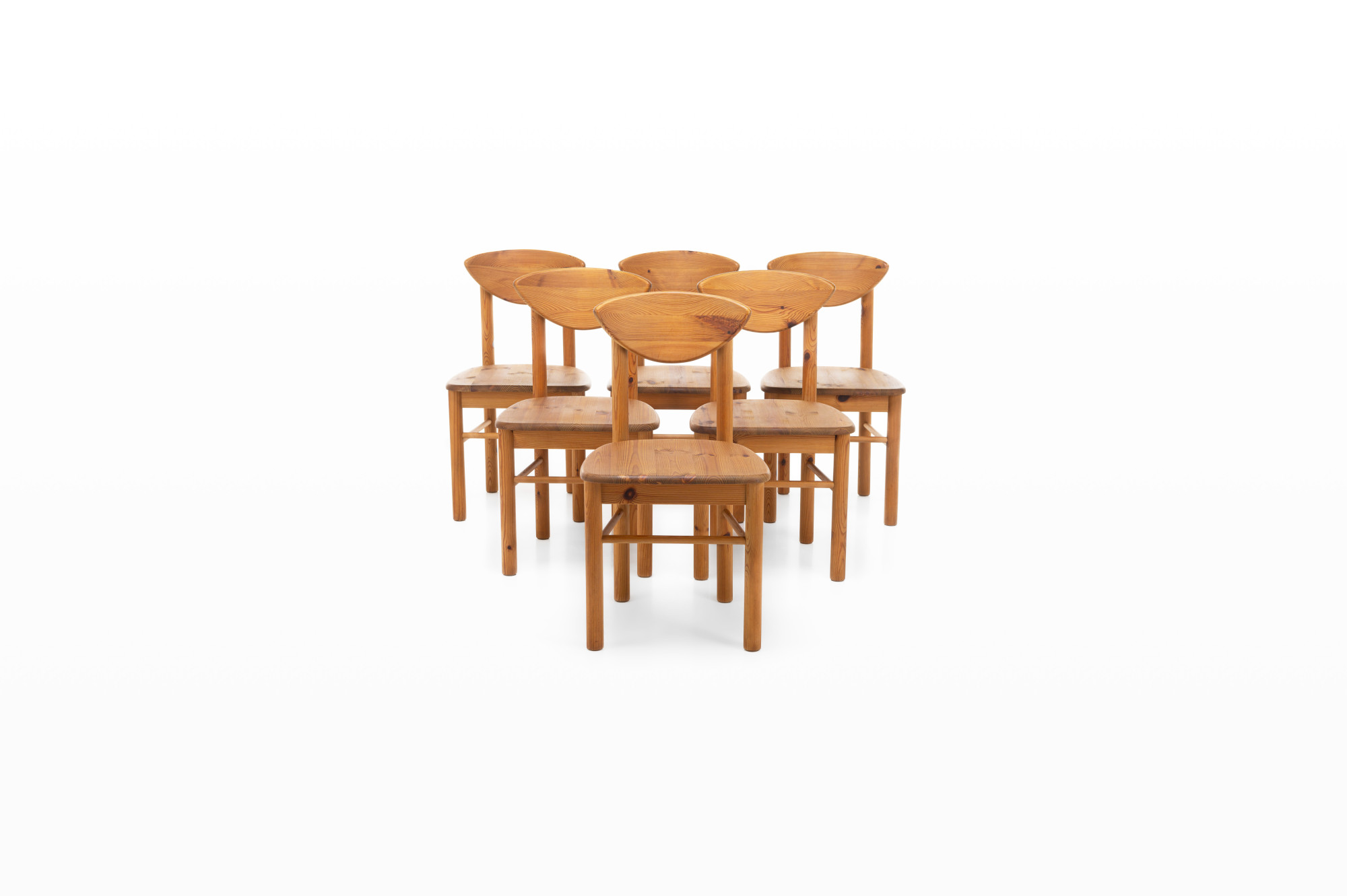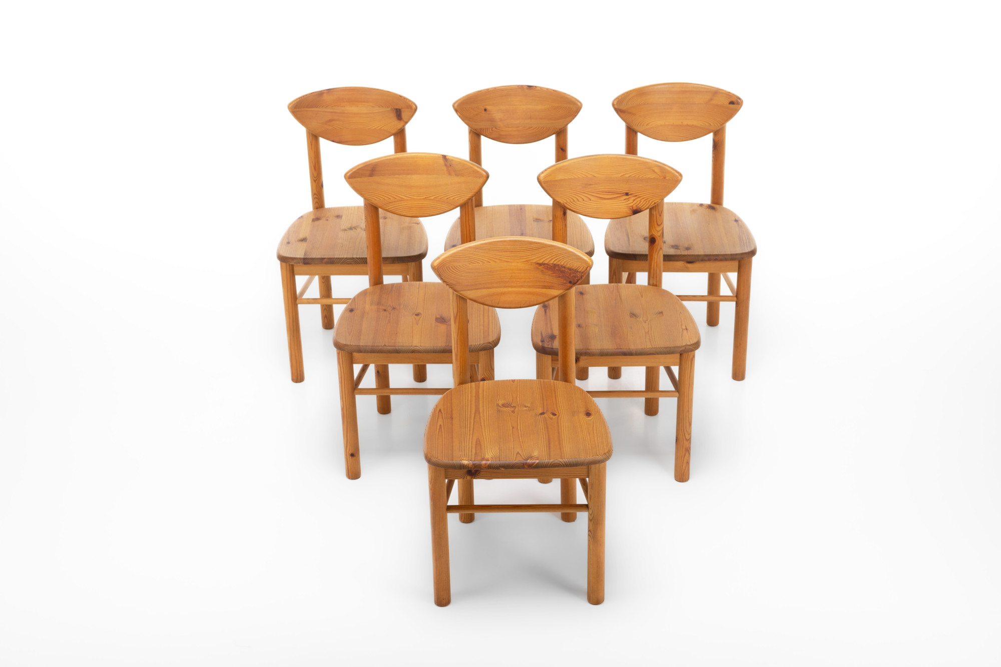 Charming set of comfy dining chairs made from solid pine. The natural design highlights the wood's grain and are very sturdy. These dining chairs are produced in Denmark in the 1970s.