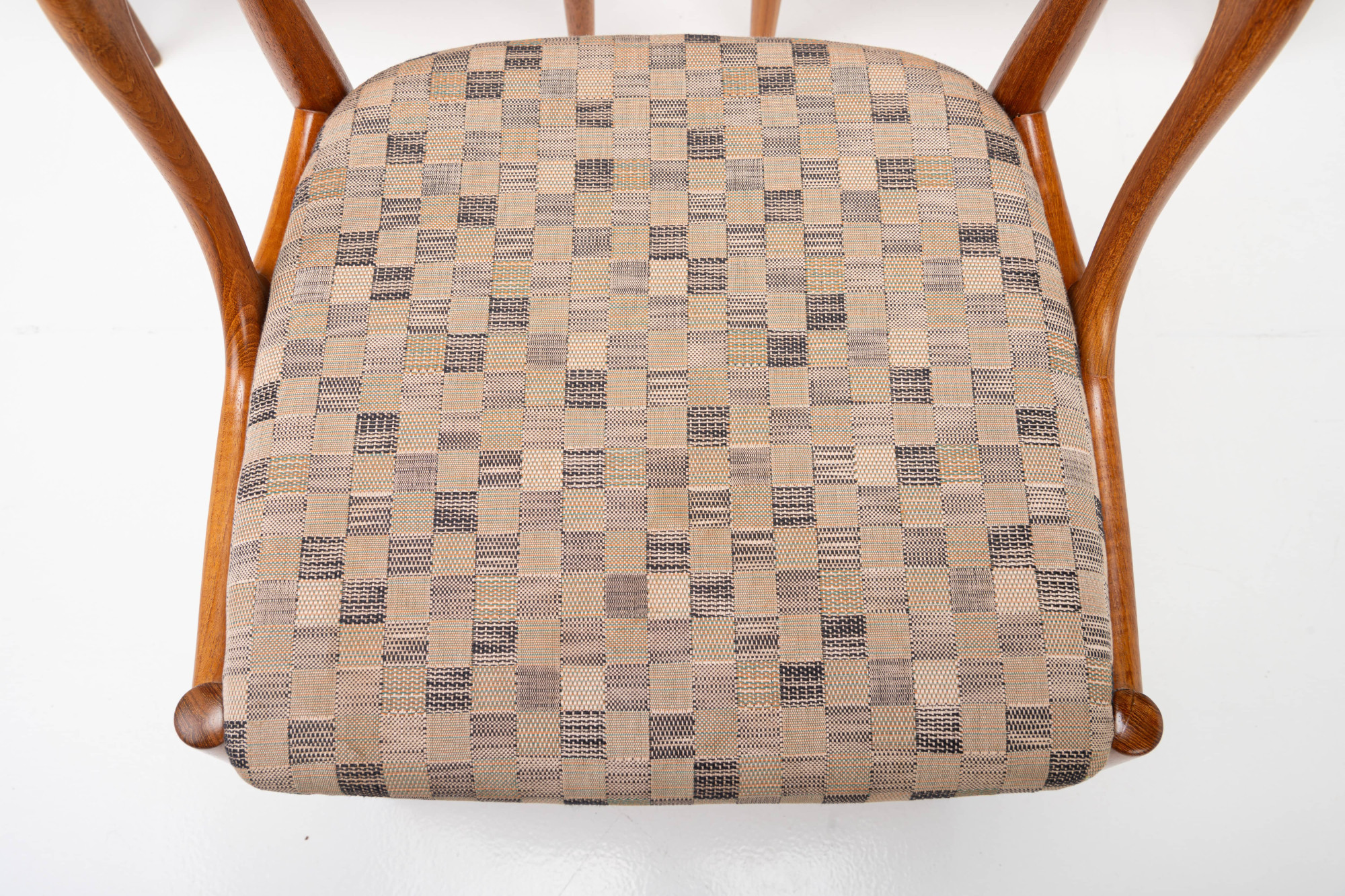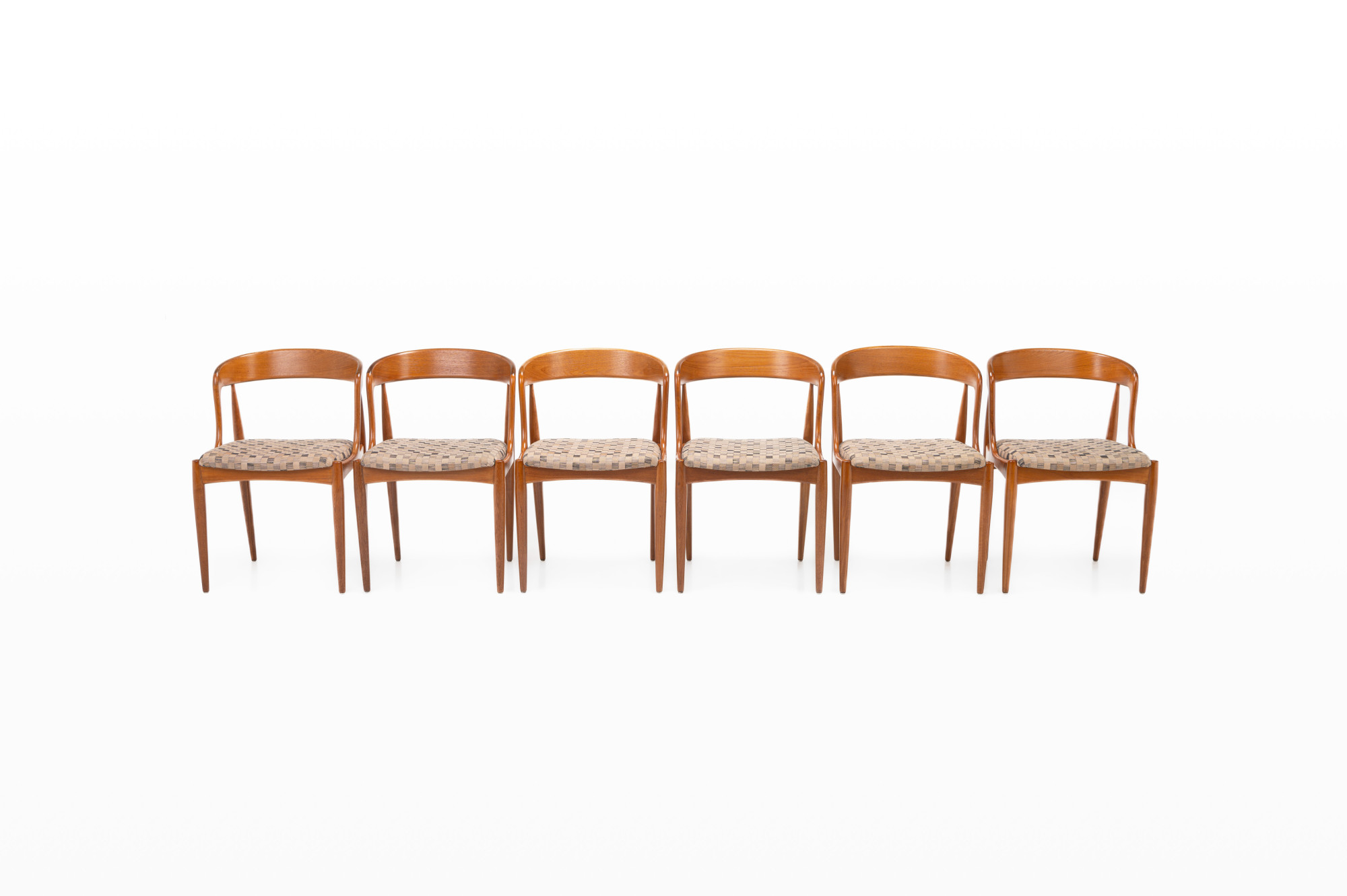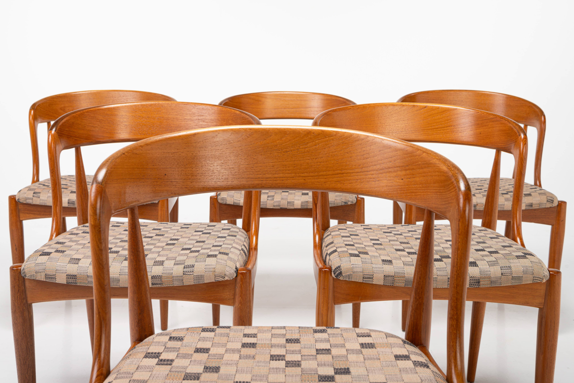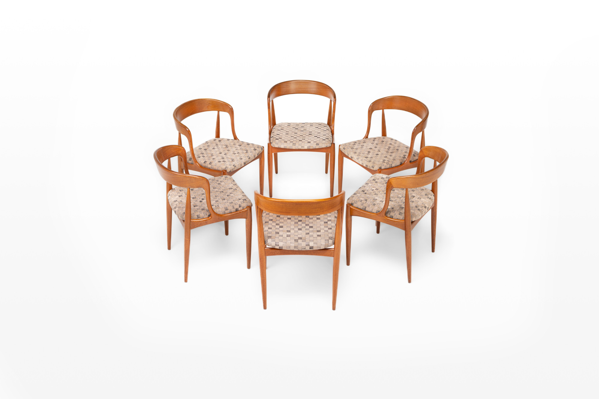 Set of six vintage 'Model 16' dining room chairs. These chairs are designed by Johannes Andersen for Uldum Møbelfabrik in Denmark. They have a light teak frame and a checked fabric in beige and brown tones.. The chairs are in very good condition.