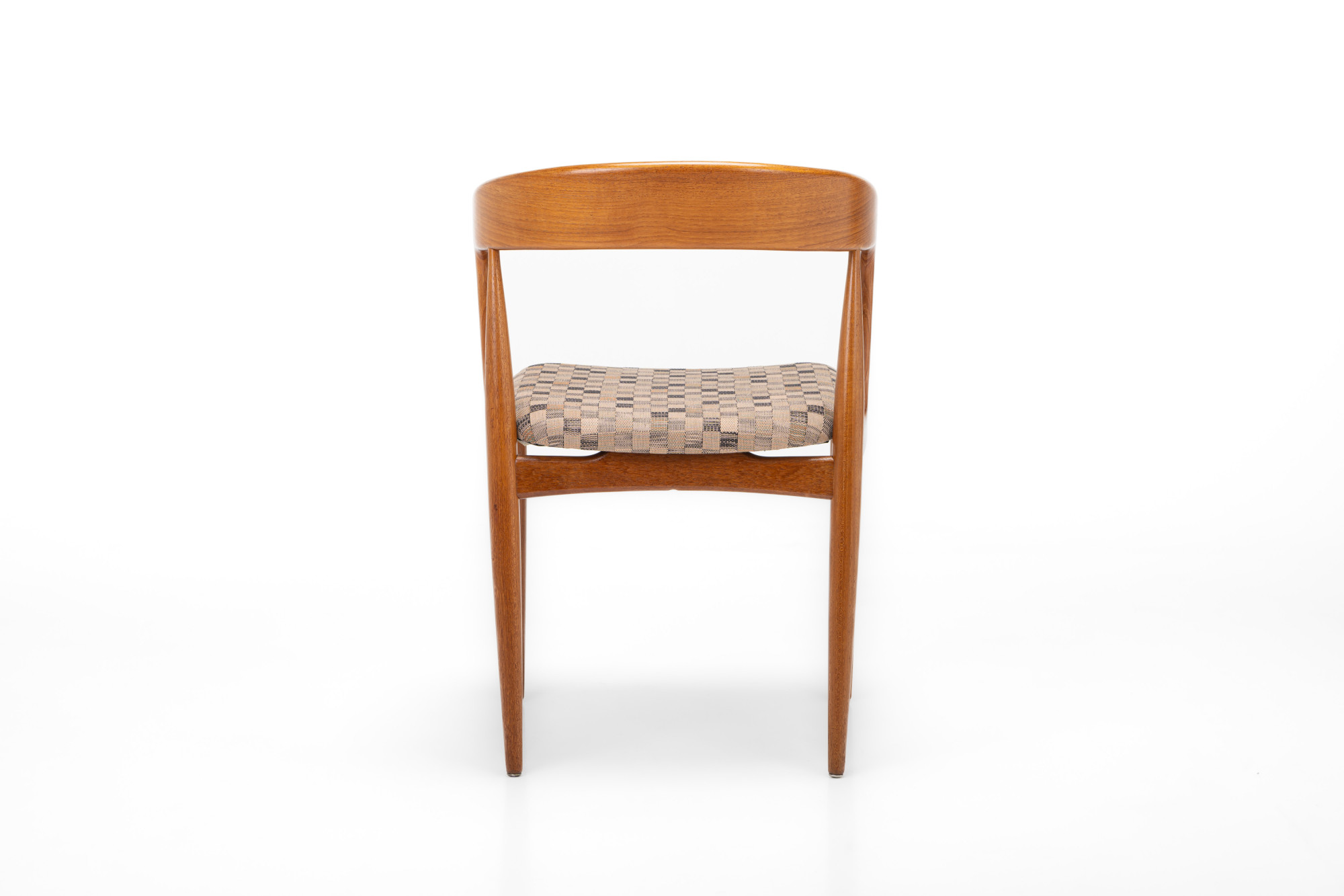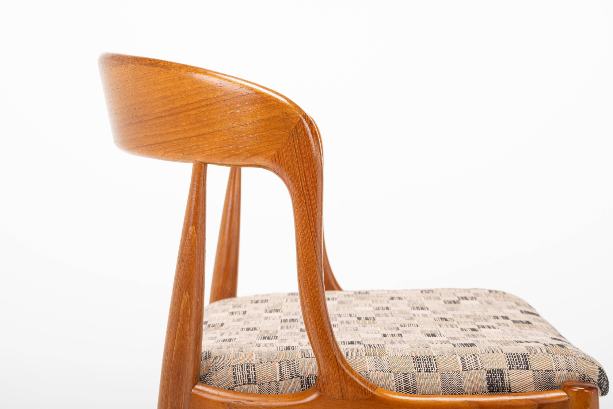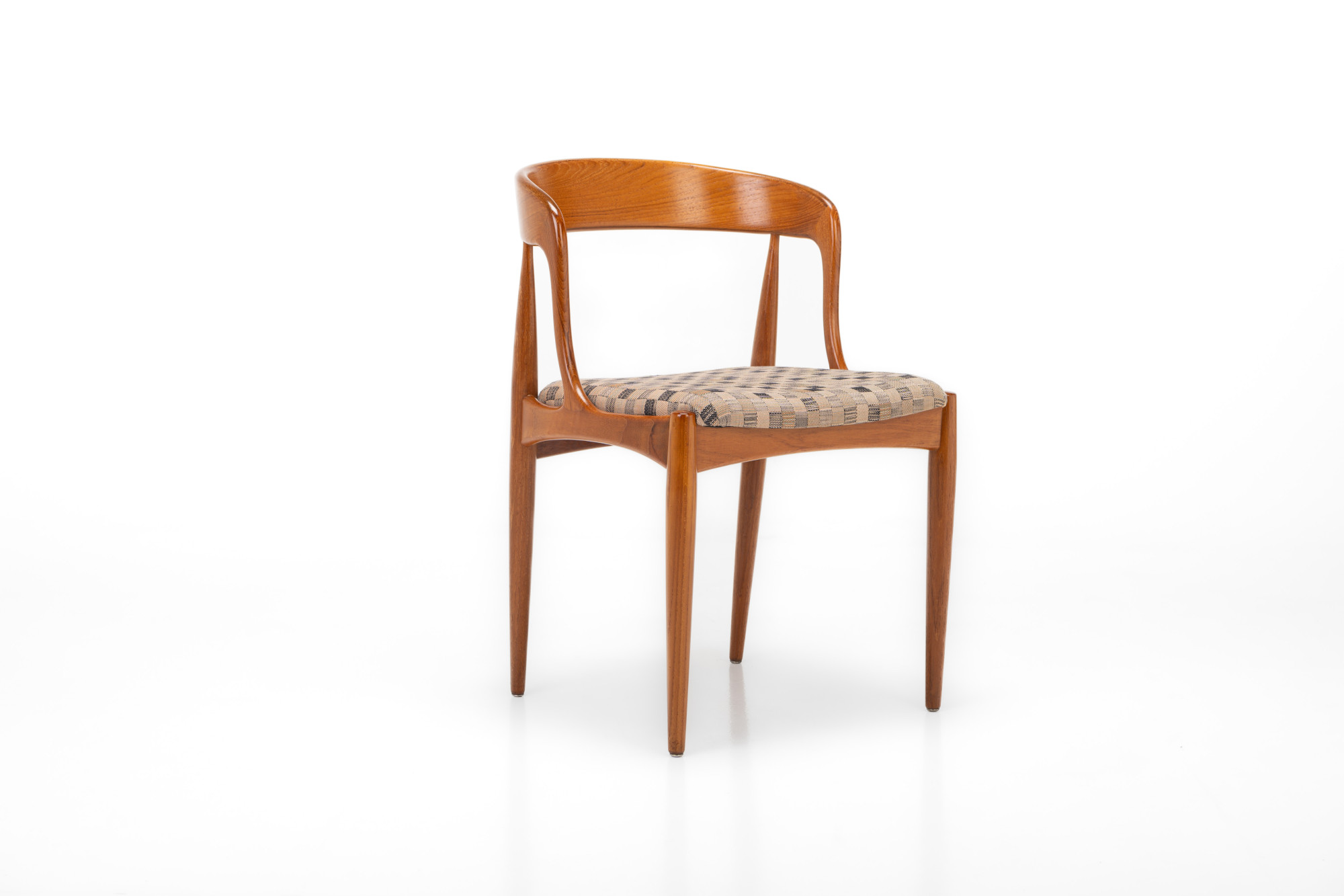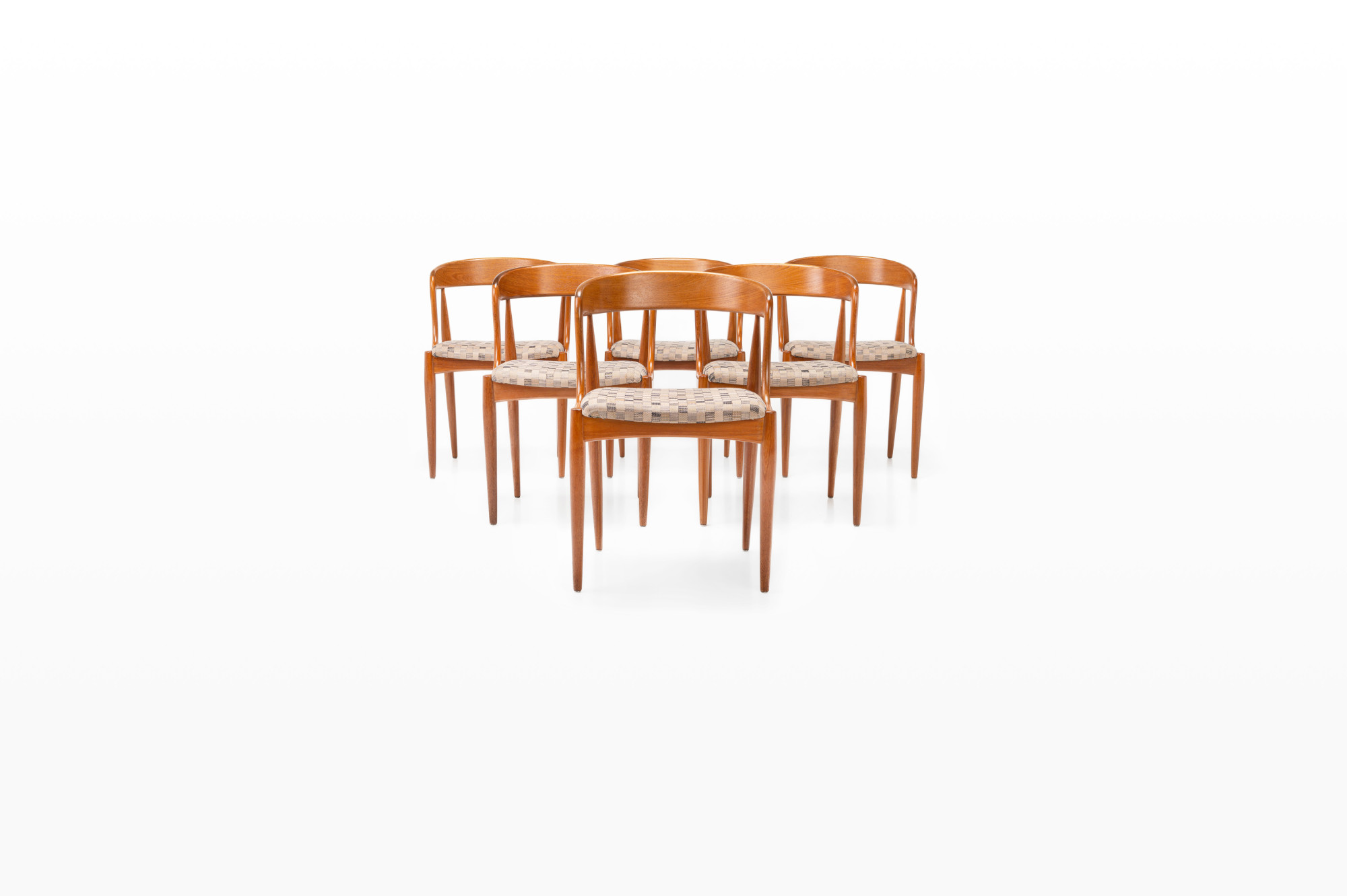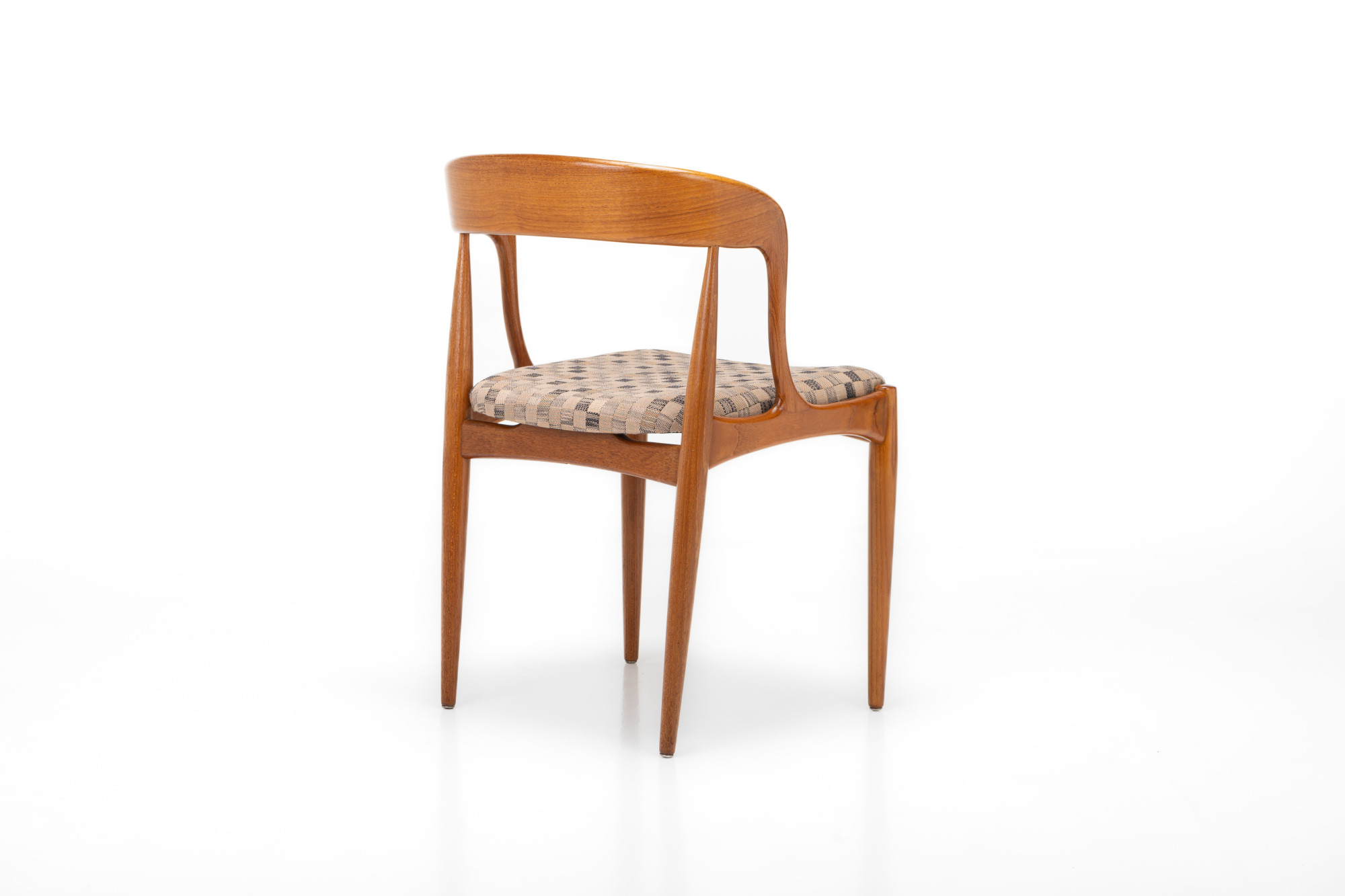 Set of six vintage 'Model 16' dining room chairs. These chairs are designed by Johannes Andersen for Uldum Møbelfabrik in Denmark. They have a light teak frame and a checked fabric in beige and brown tones.. The chairs are in very good condition.