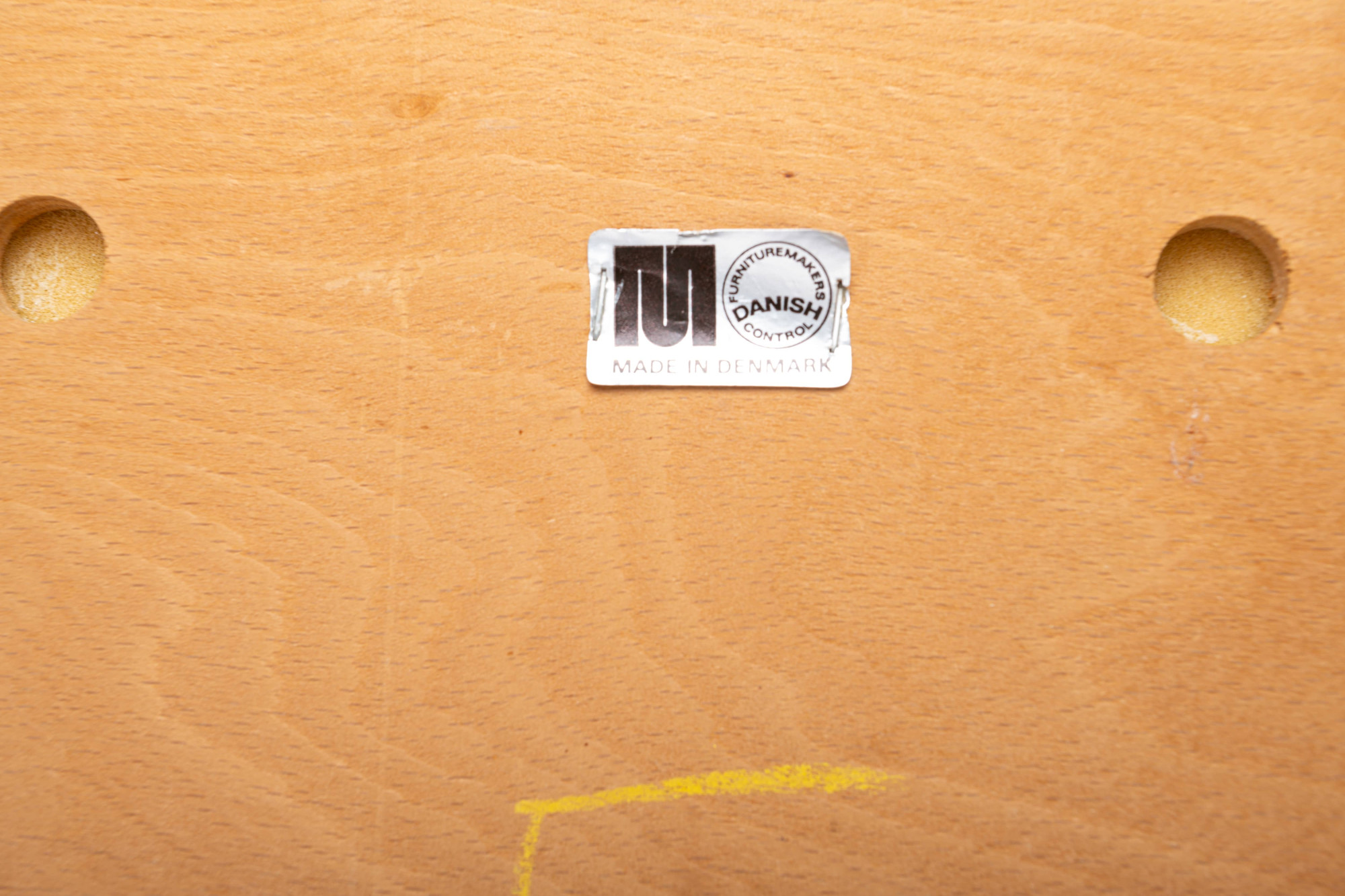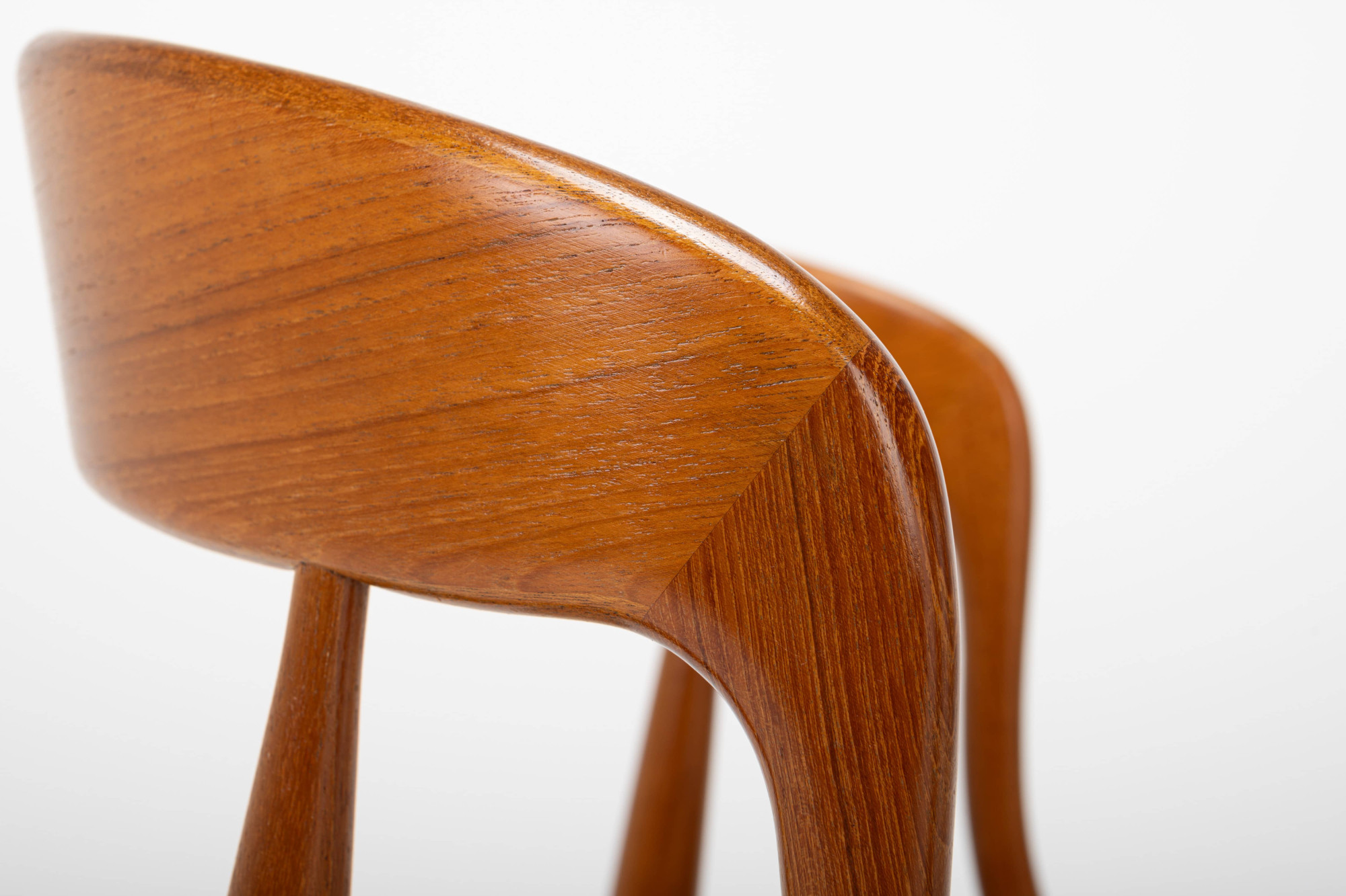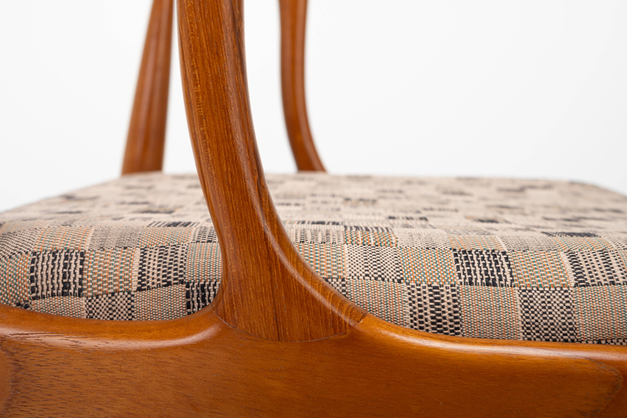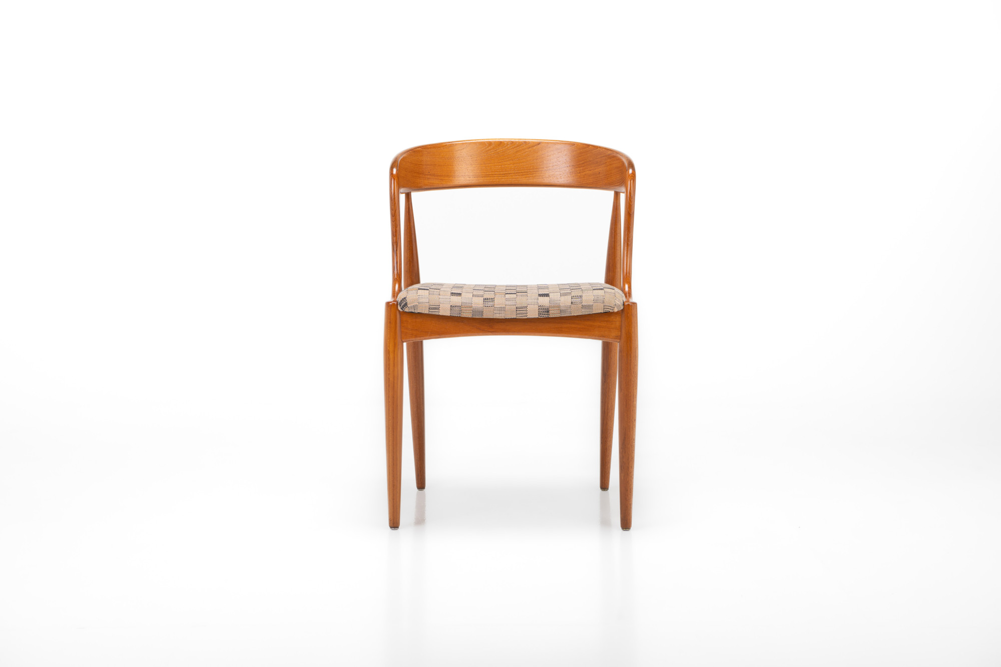 Set of six vintage 'Model 16' dining room chairs. These chairs are designed by Johannes Andersen for Uldum Møbelfabrik in Denmark. They have a light teak frame and a checked fabric in beige and brown tones.. The chairs are in very good condition.