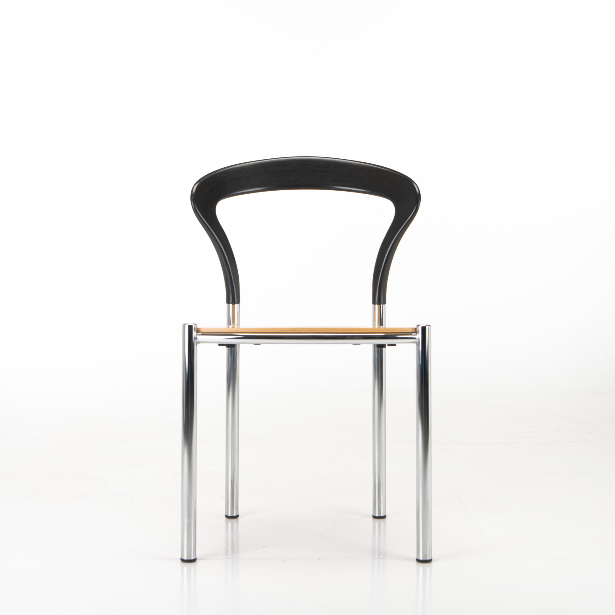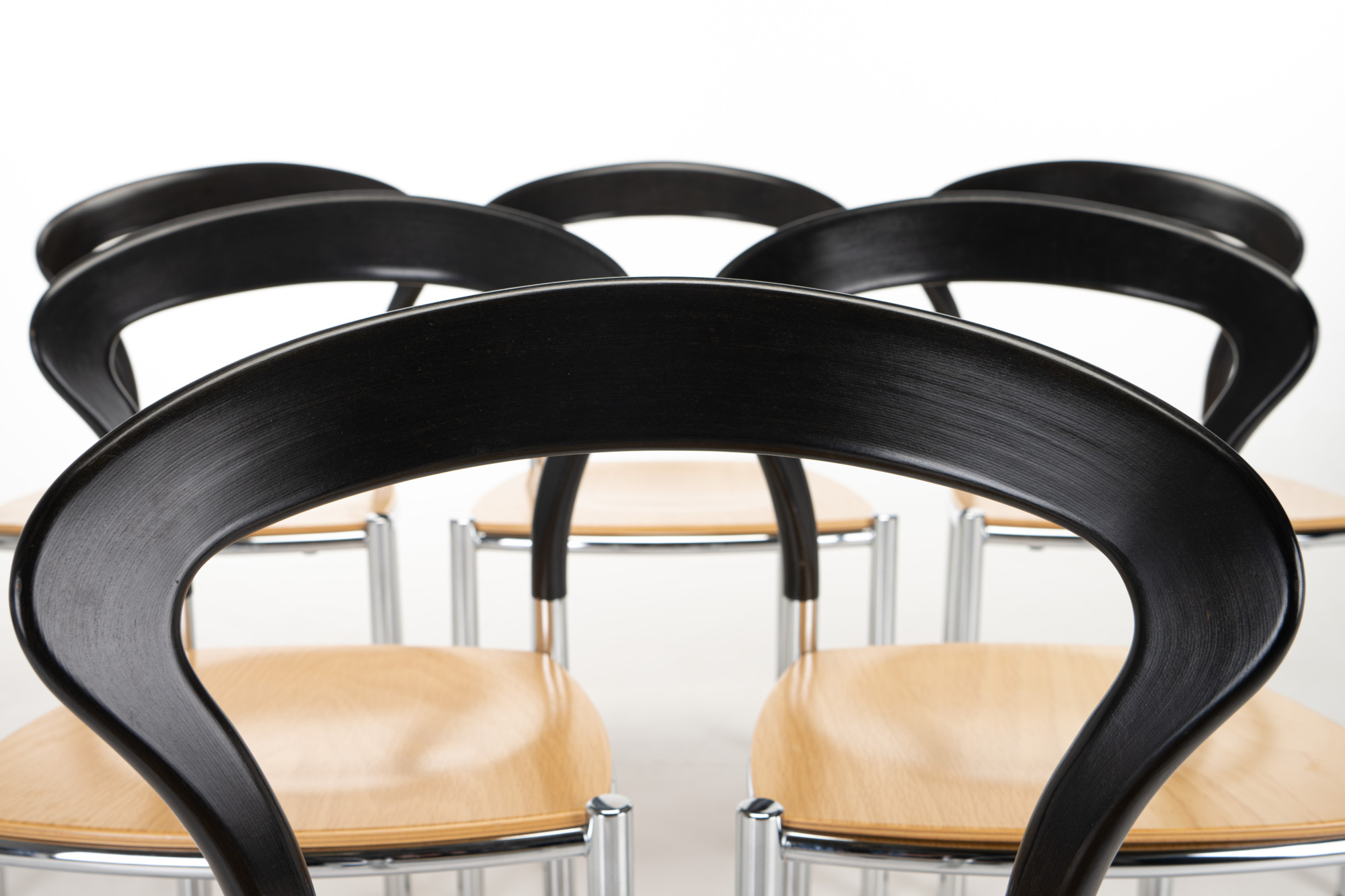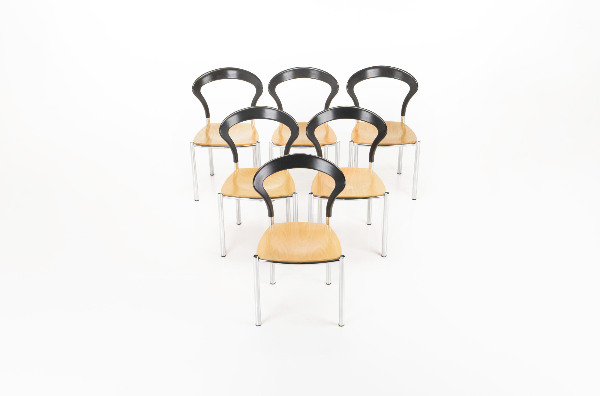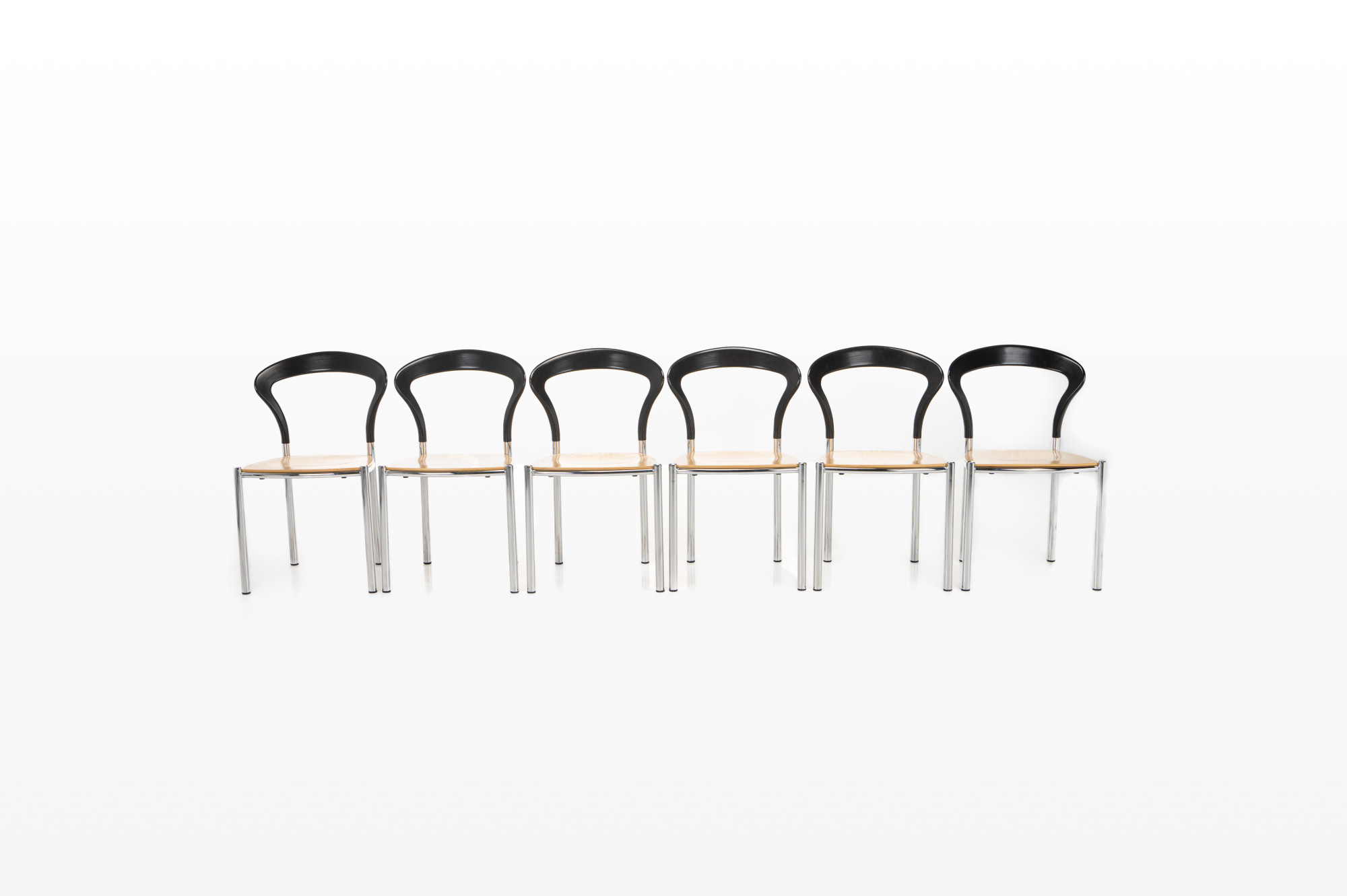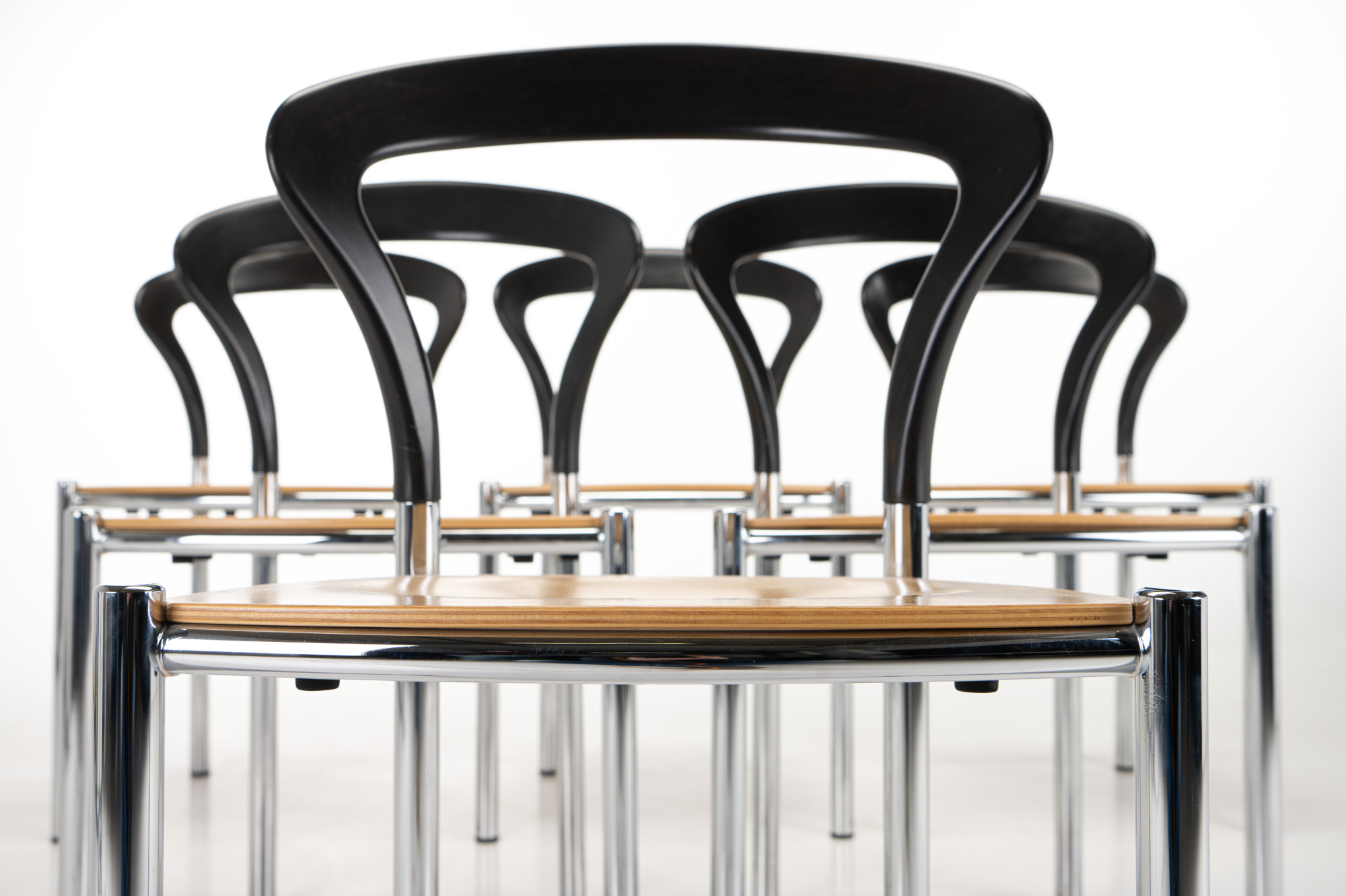Set of six 'Lotus' dining chairs by Harmut Lohmeyer for Kusch & Co, Germany. The charis are chairs have a chrome base , are stackable and have a wooden seating.