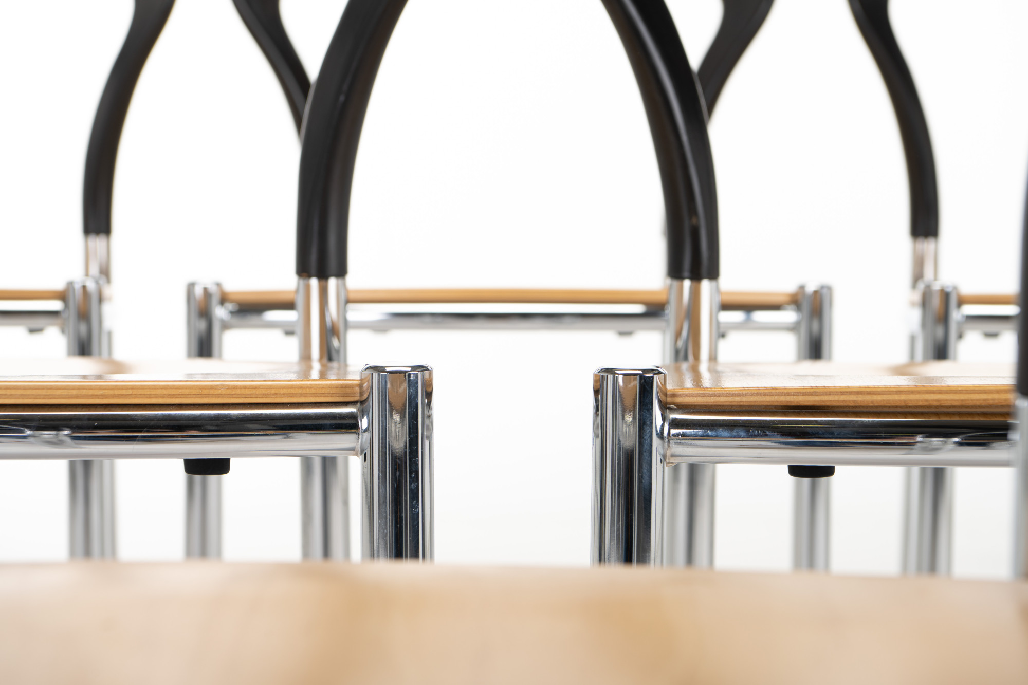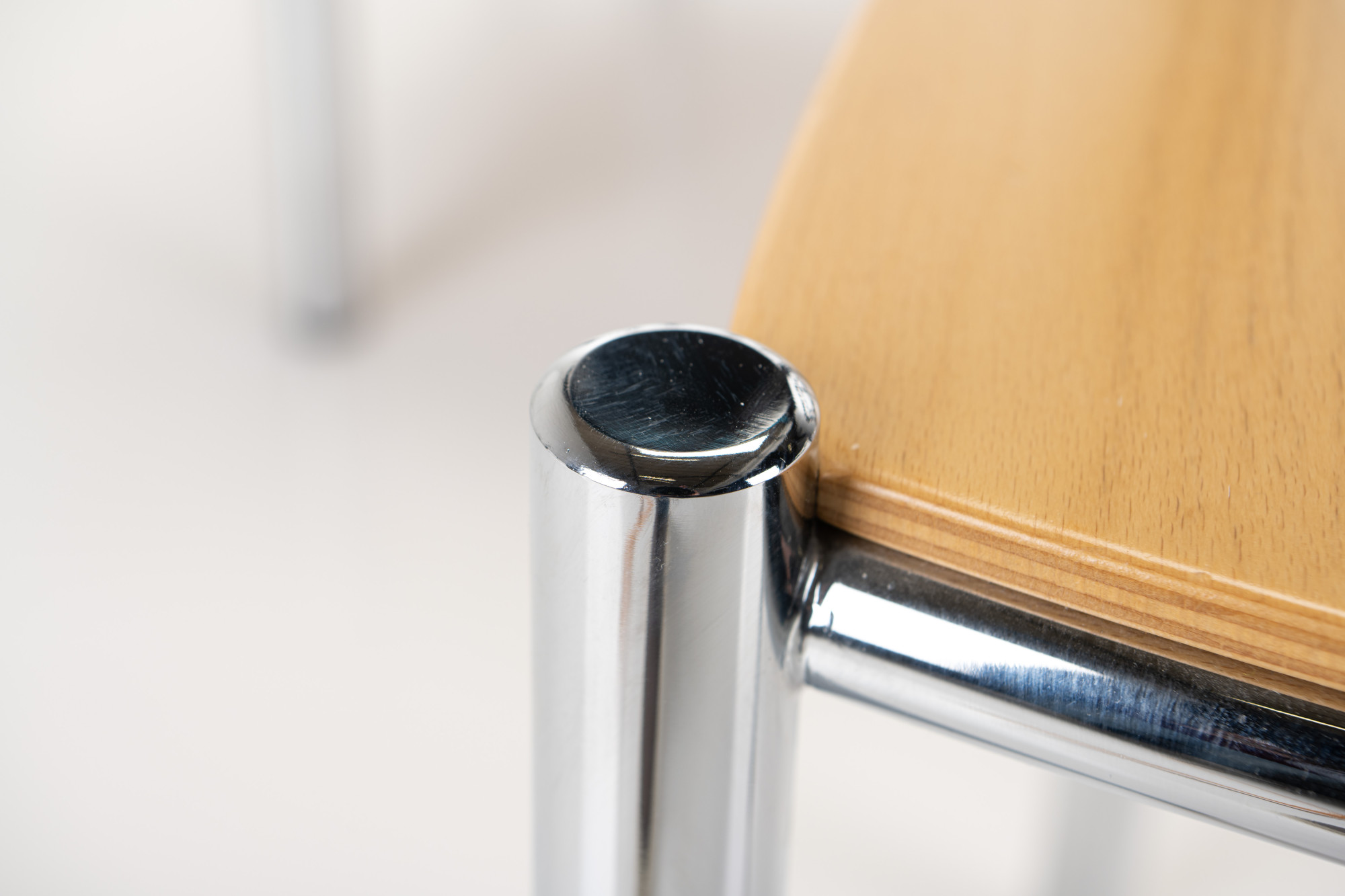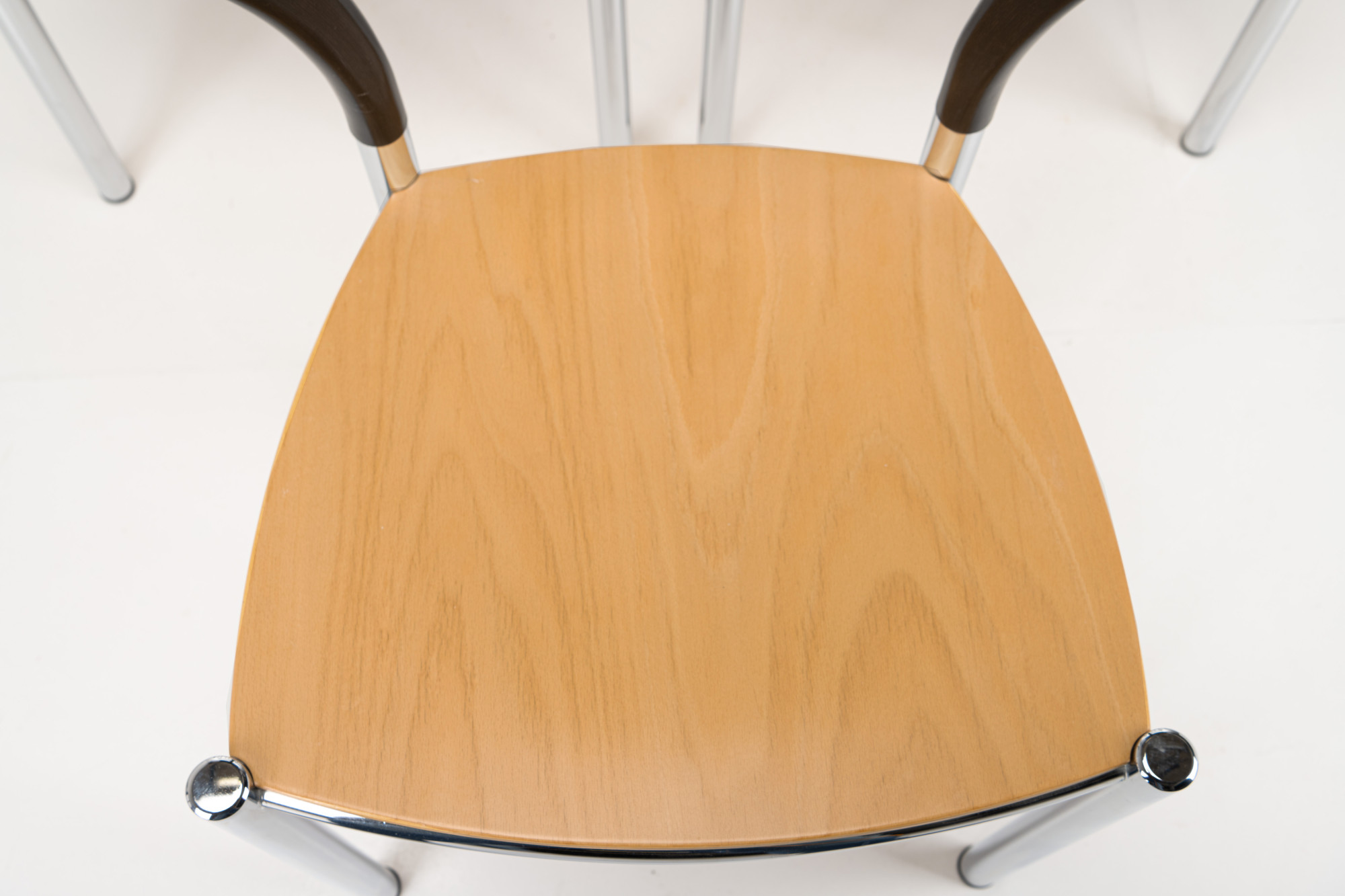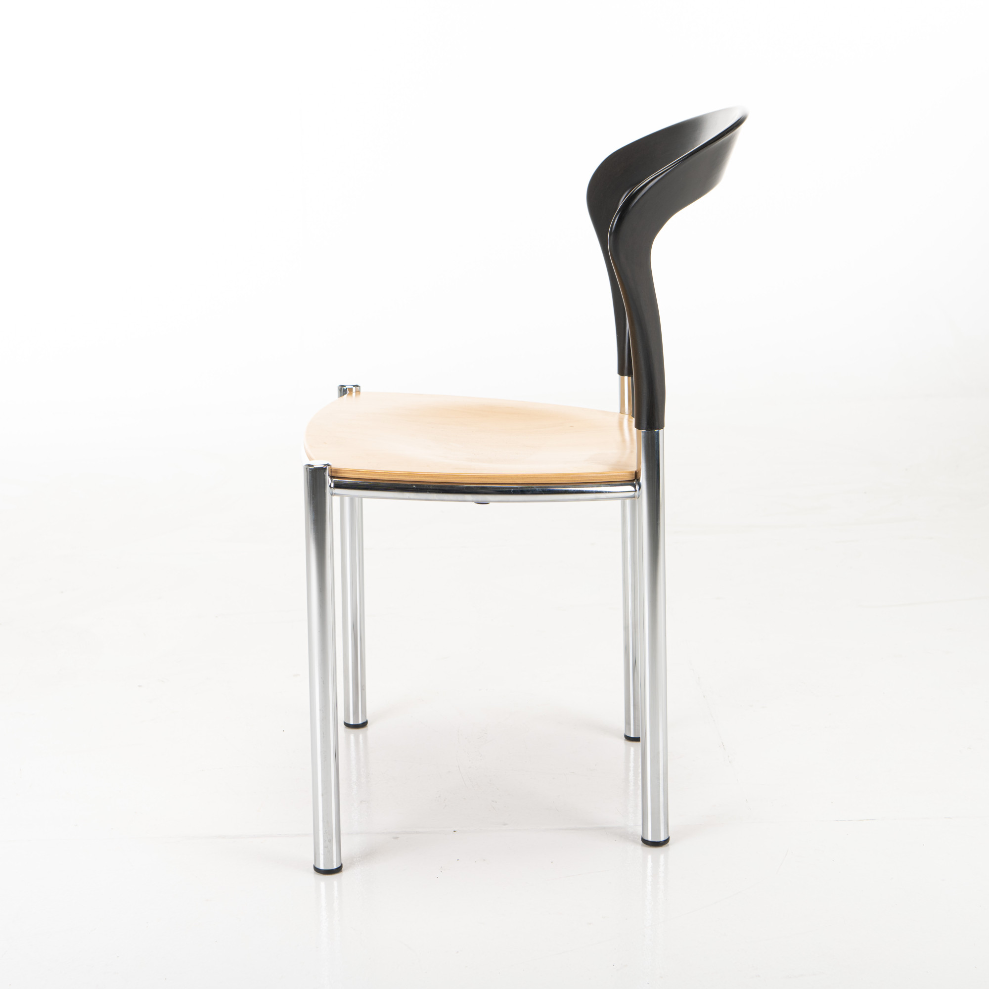 Set of six 'Lotus' dining chairs by Harmut Lohmeyer for Kusch & Co, Germany. The charis are chairs have a chrome base , are stackable and have a wooden seating.