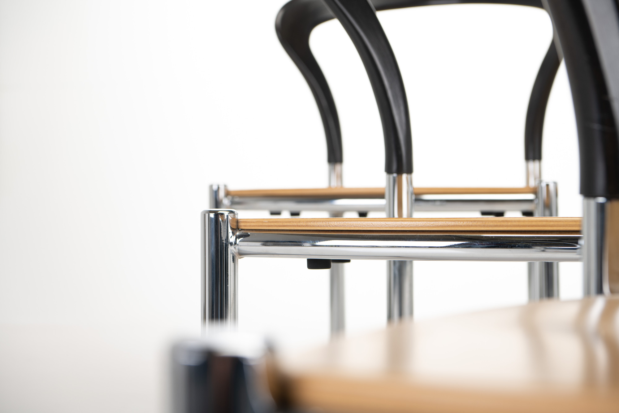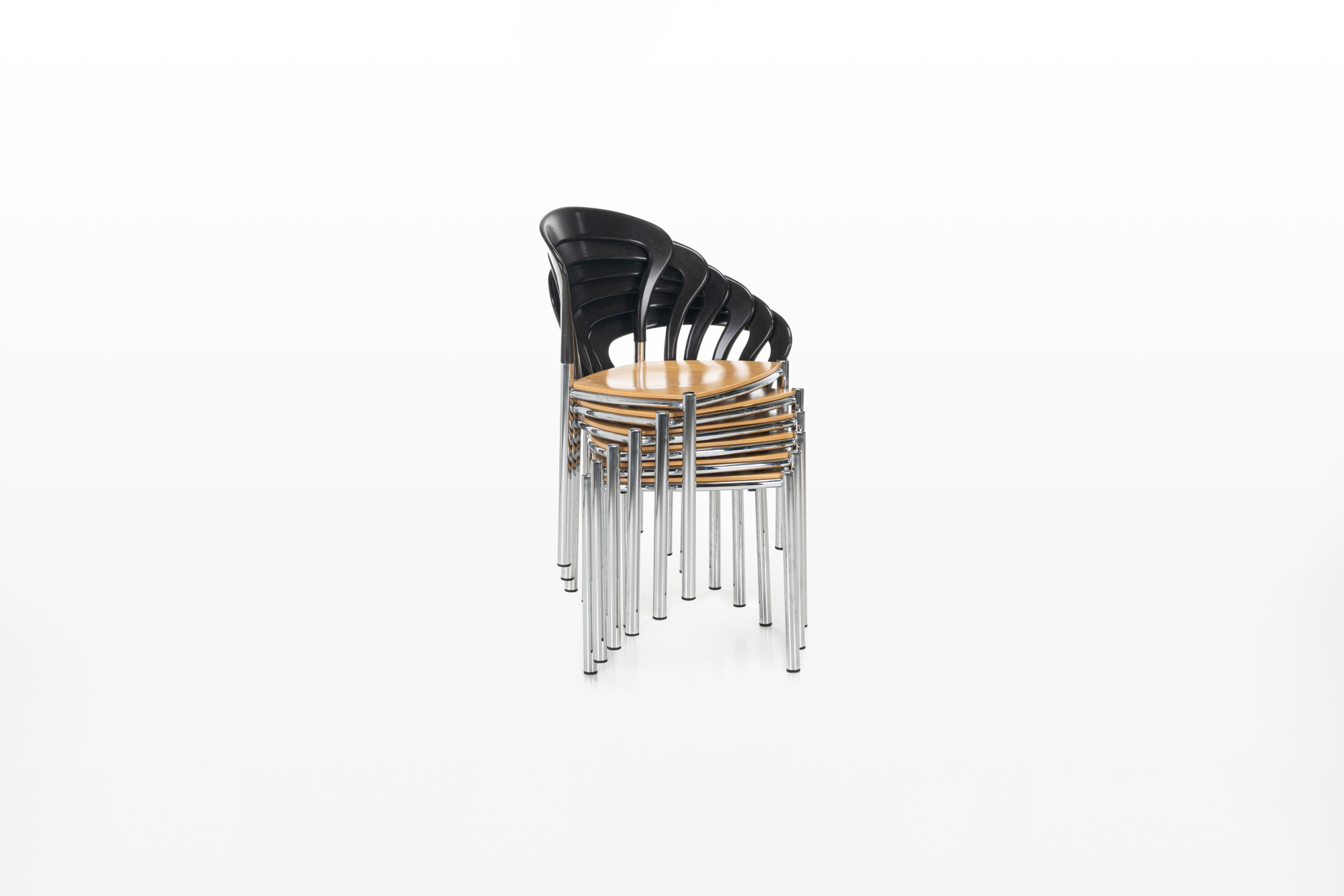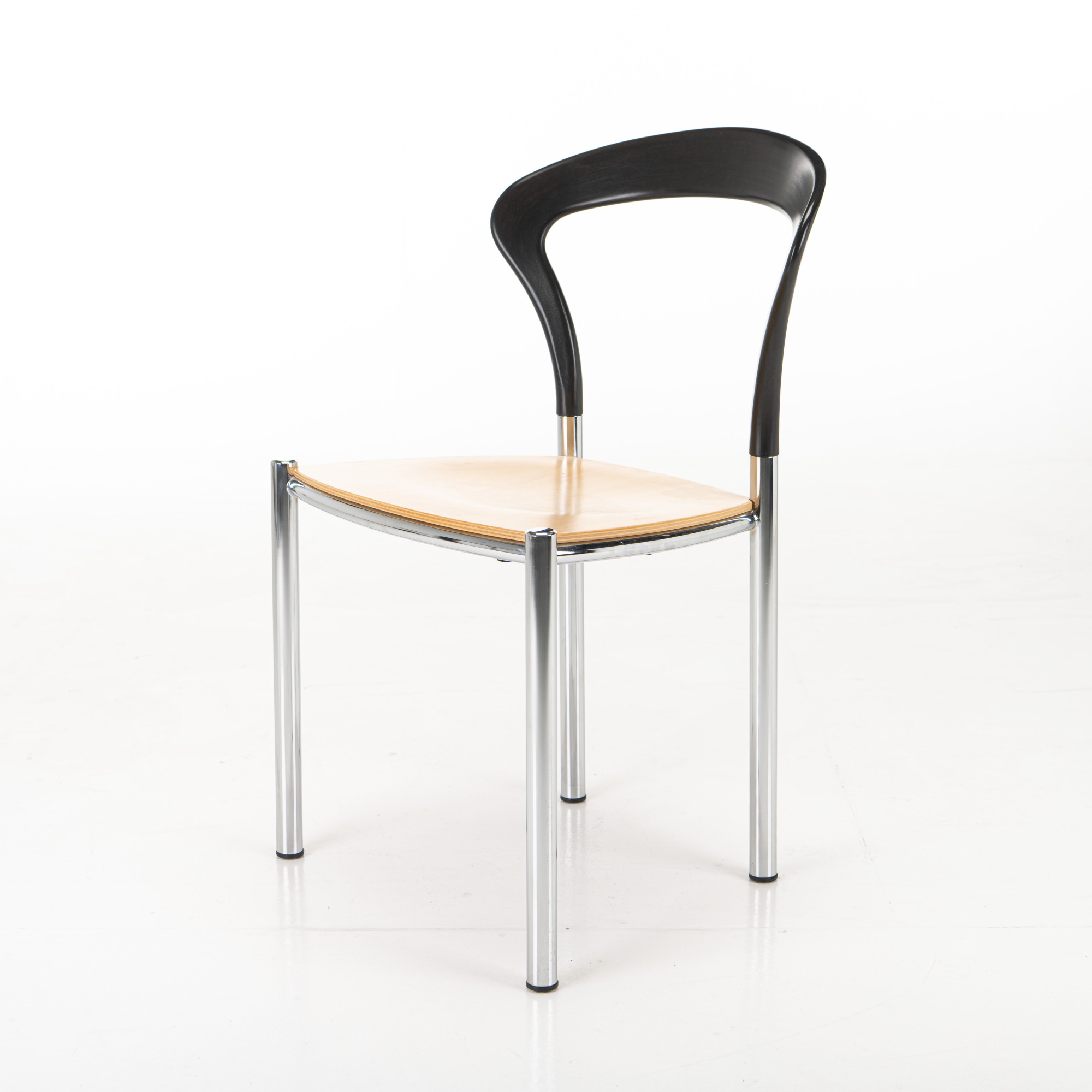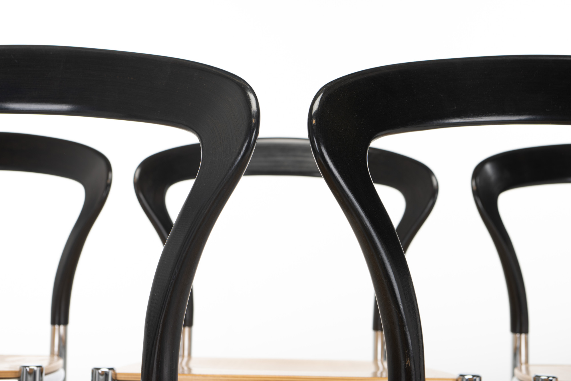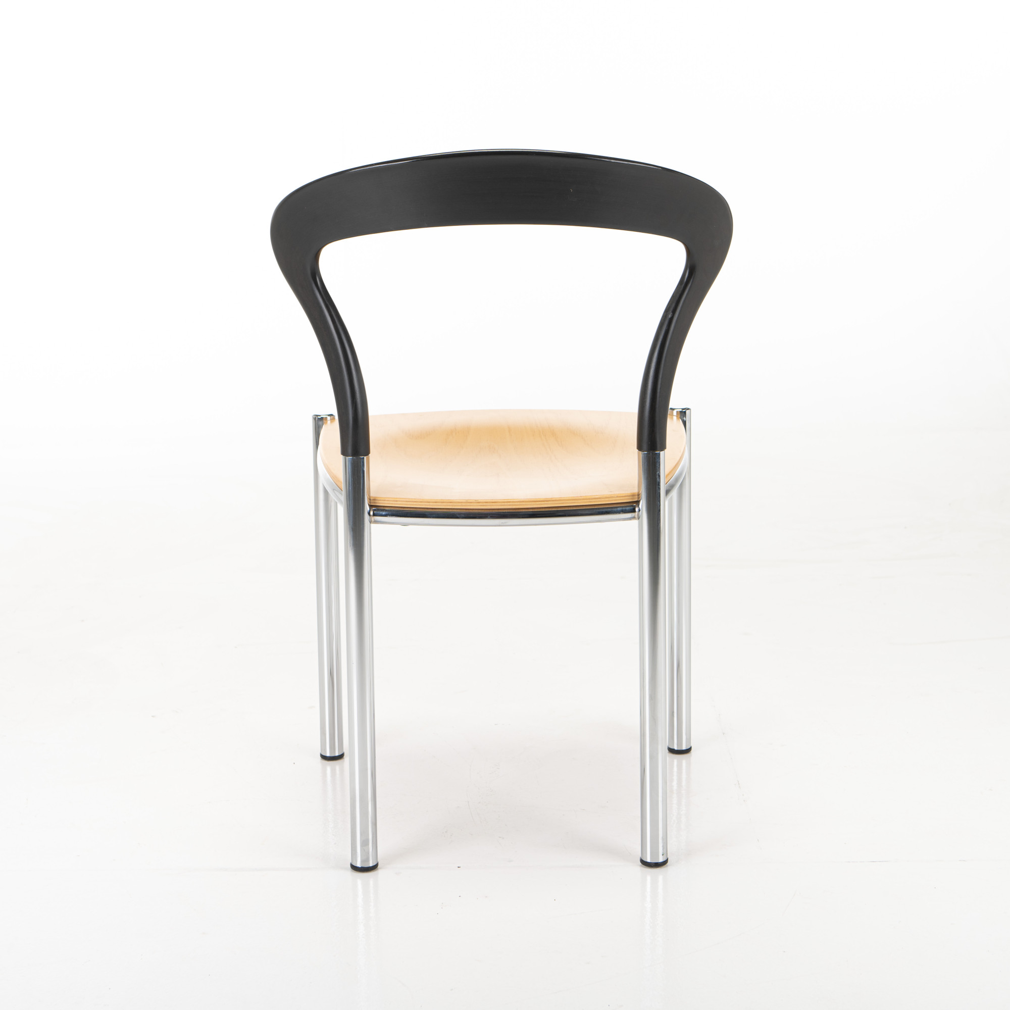 Set of six 'Lotus' dining chairs by Harmut Lohmeyer for Kusch & Co, Germany. The charis are chairs have a chrome base , are stackable and have a wooden seating.