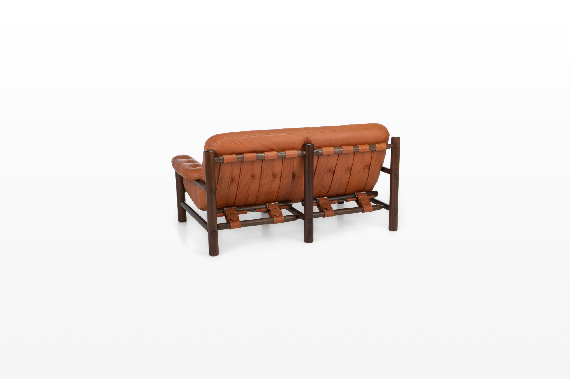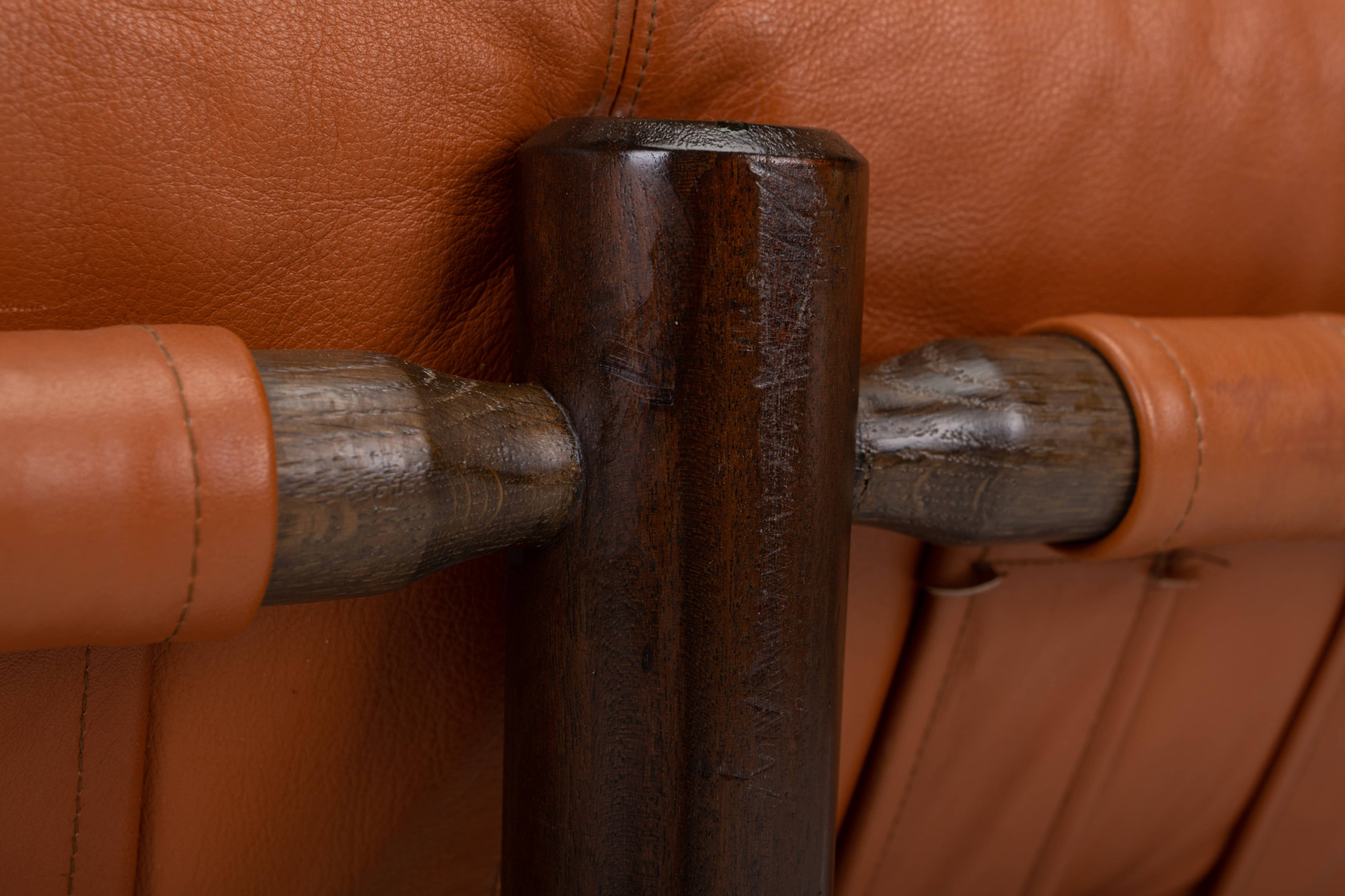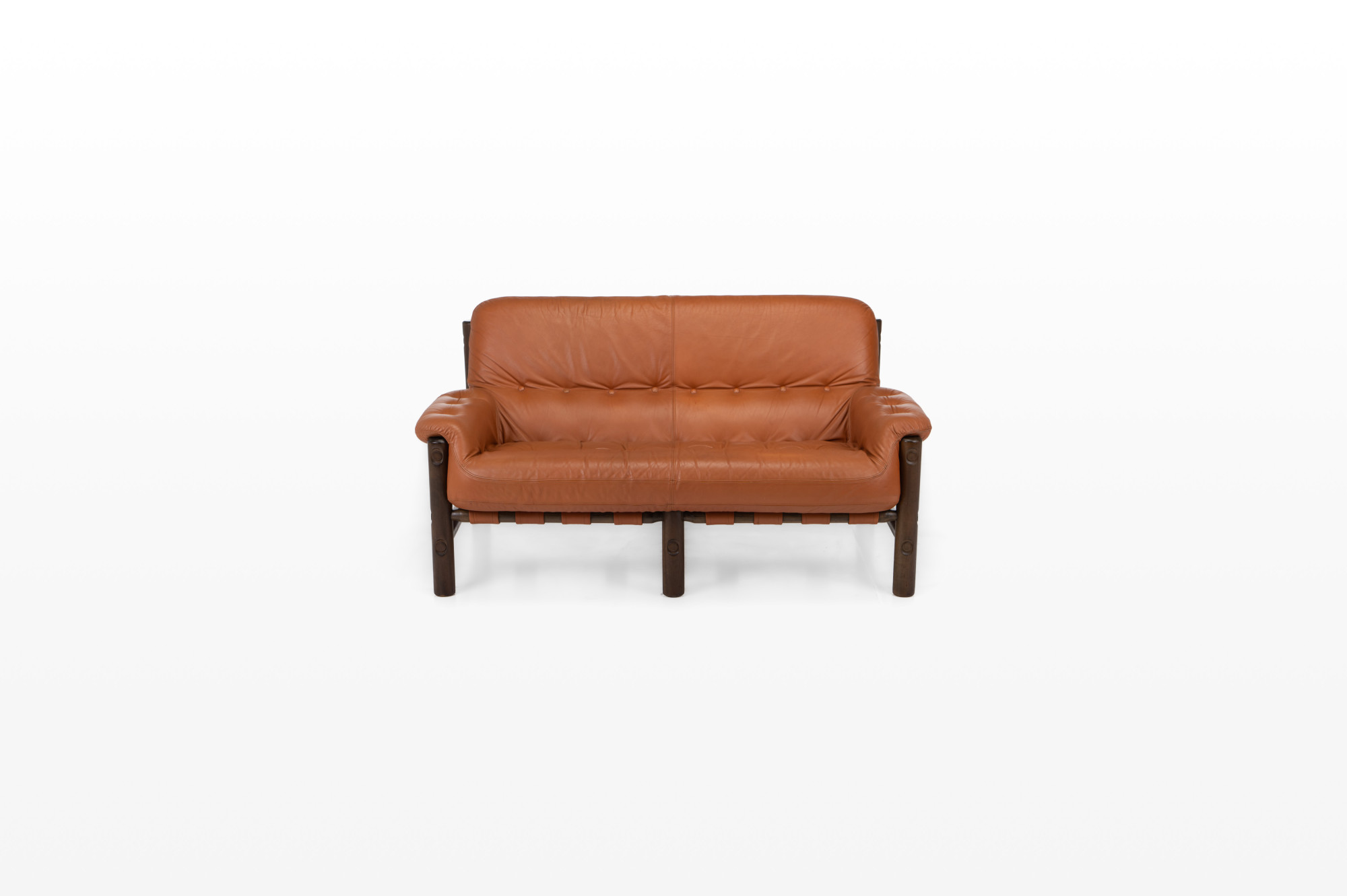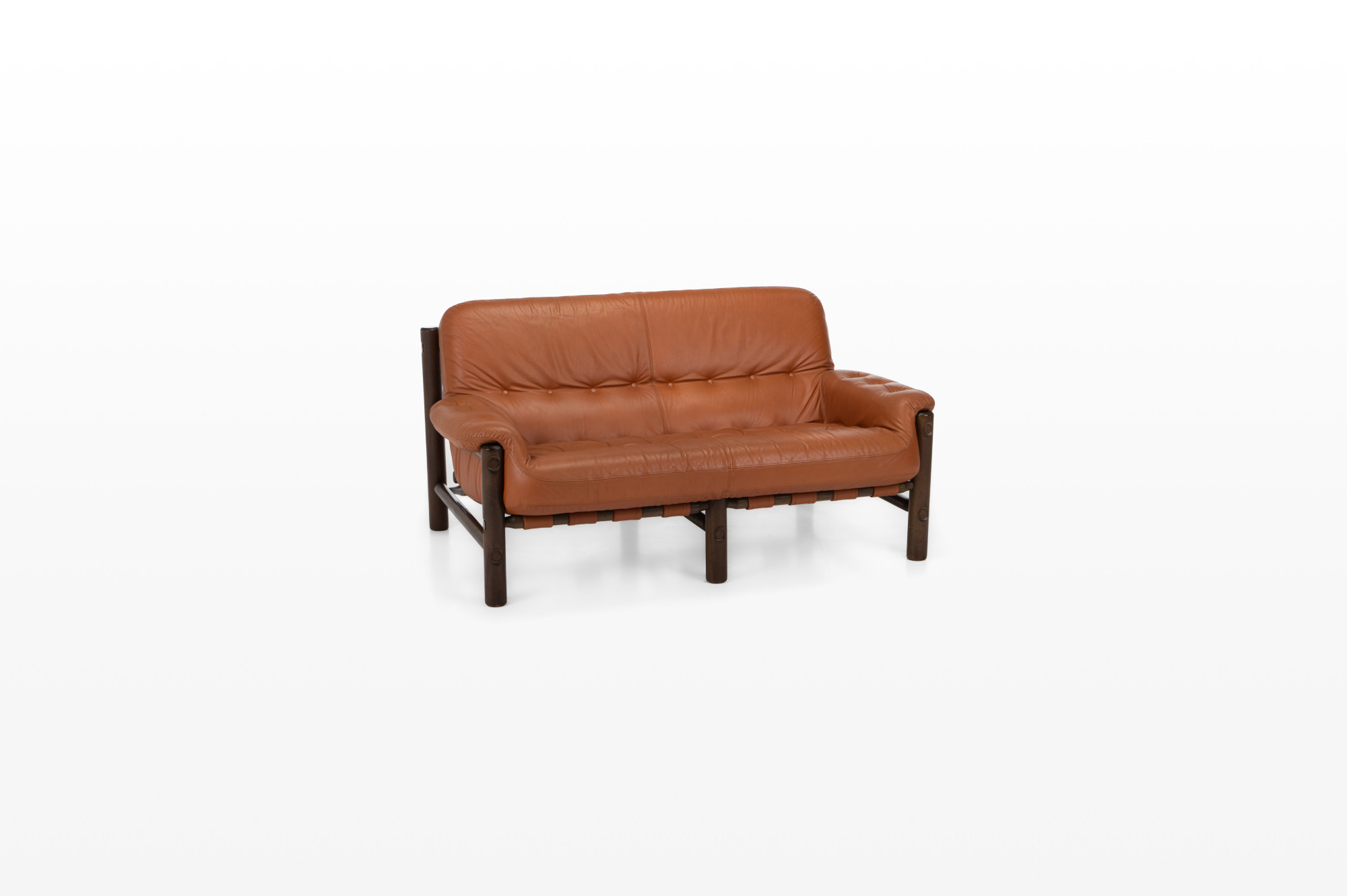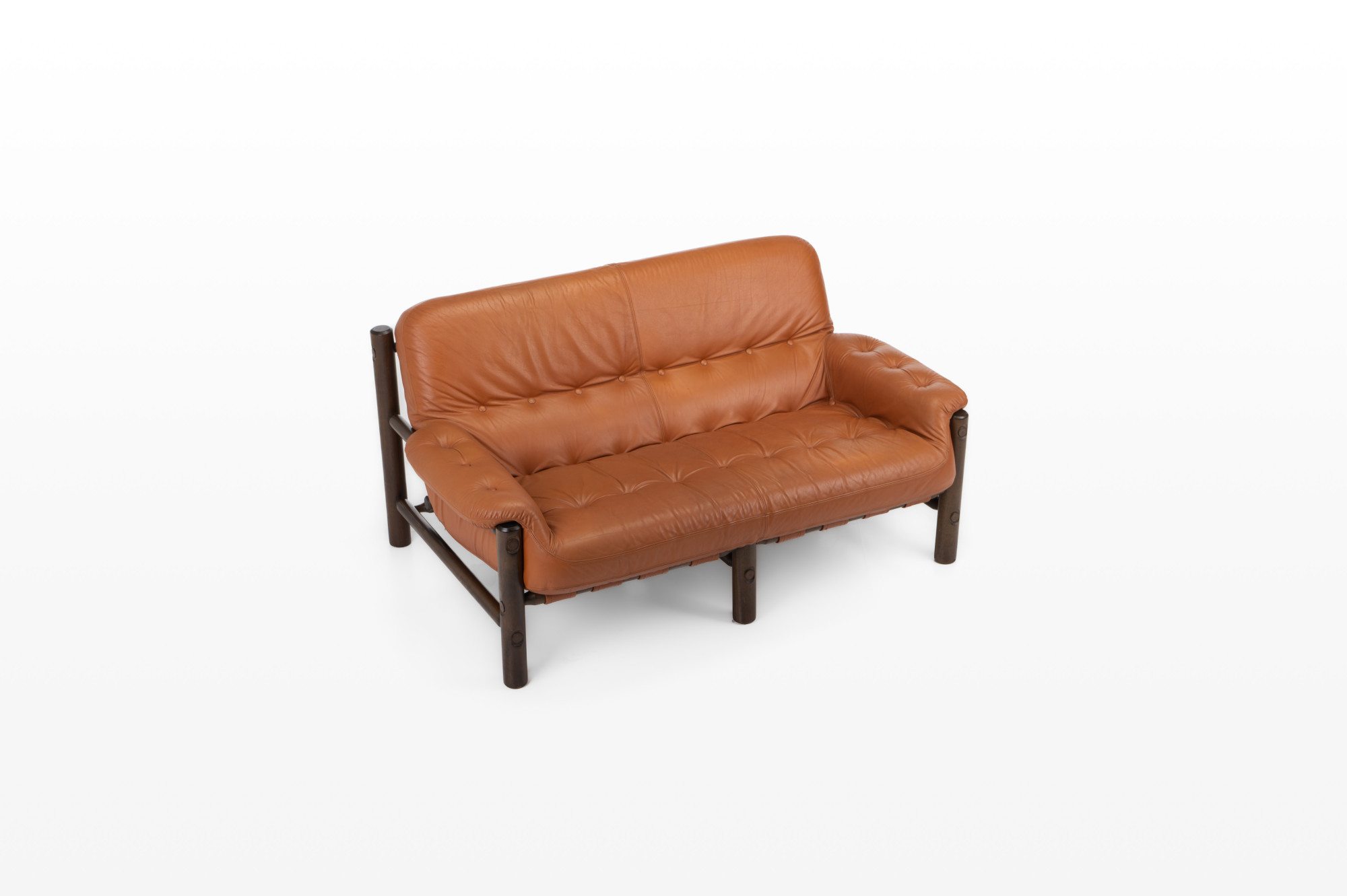 Brazilian vintage two-seater sofa with the original cognac leather upholstery. The sofa is in very good condition. There is also a matching three-seater and lounge chair available.
