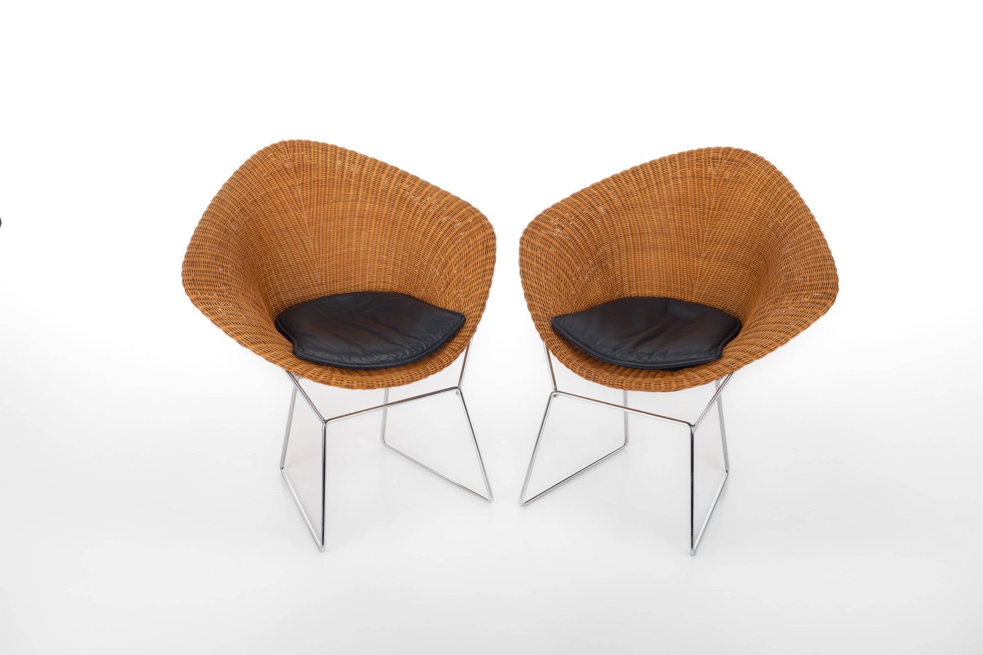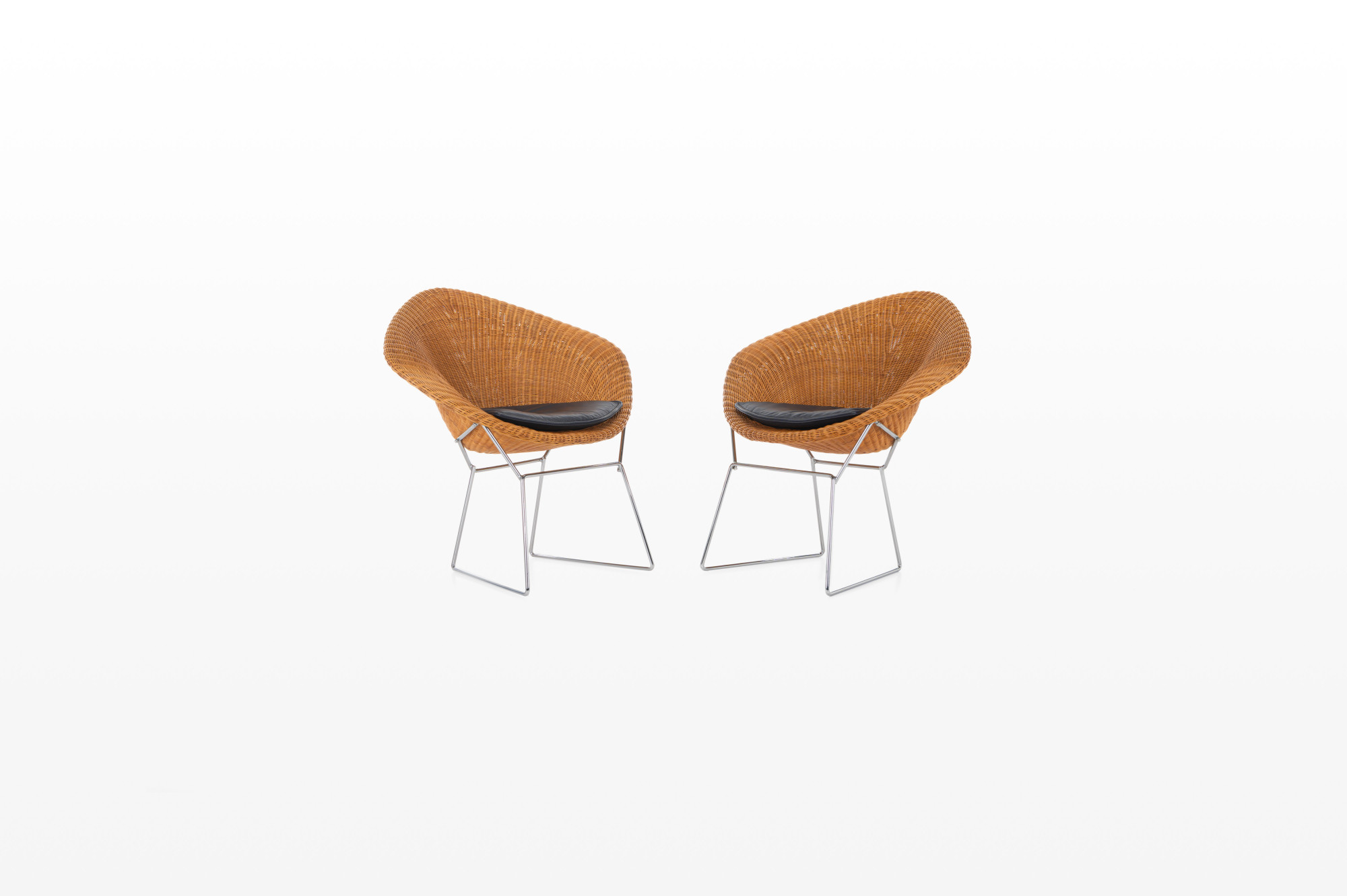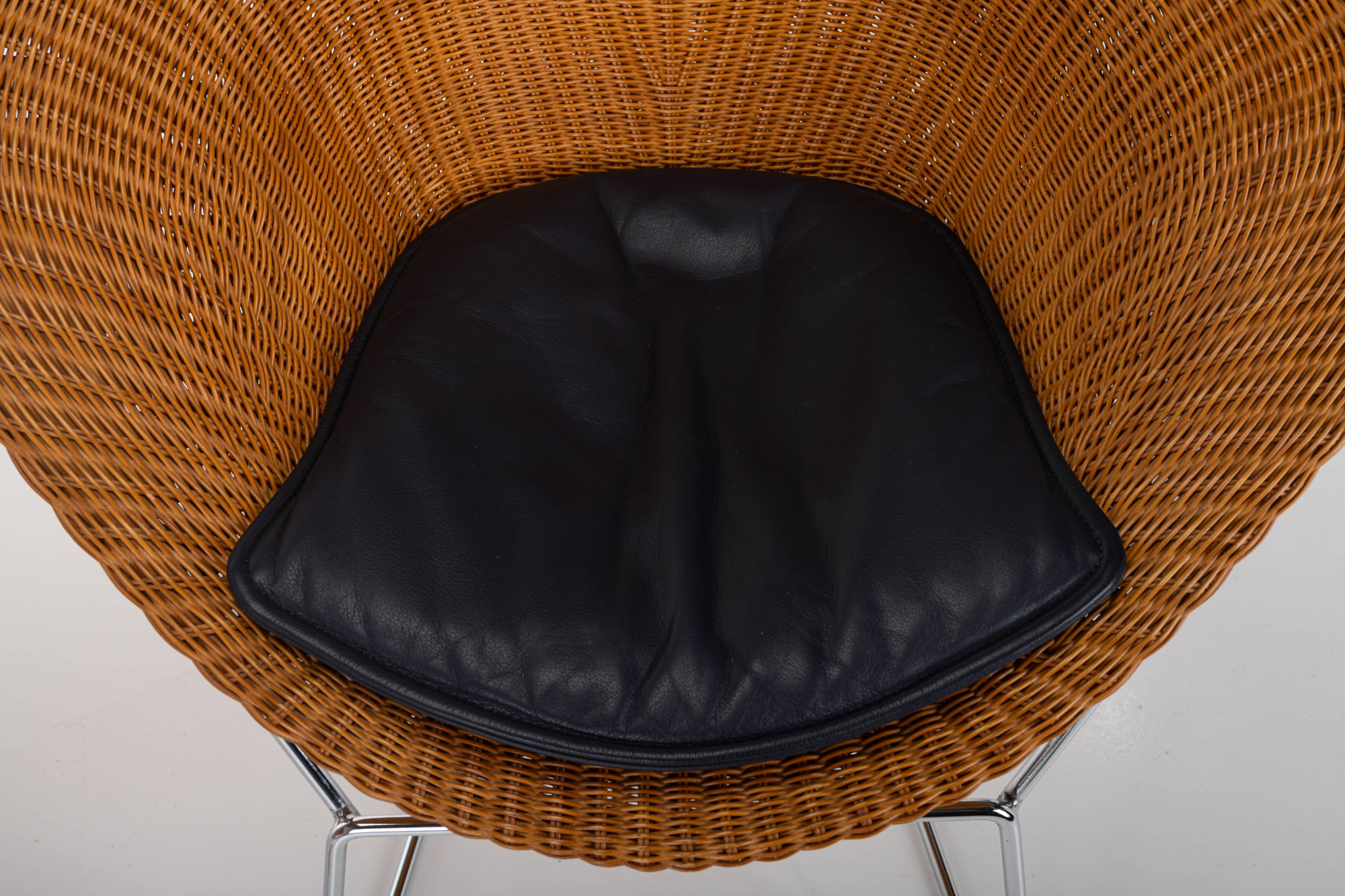 Set of two lounge chairs in wicker and chrome. The set is still in very good condition and comes with a dark blue leather cushion.