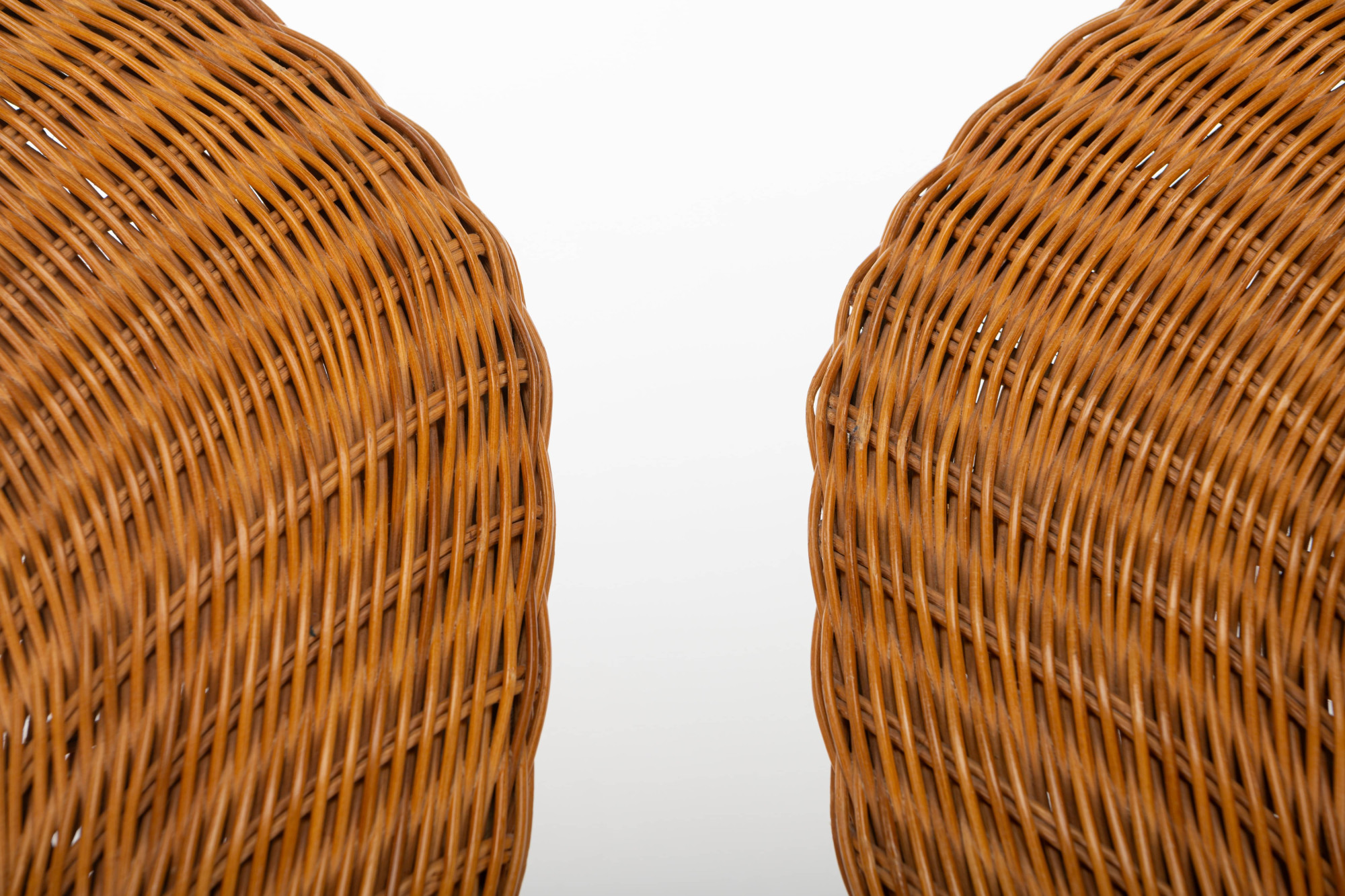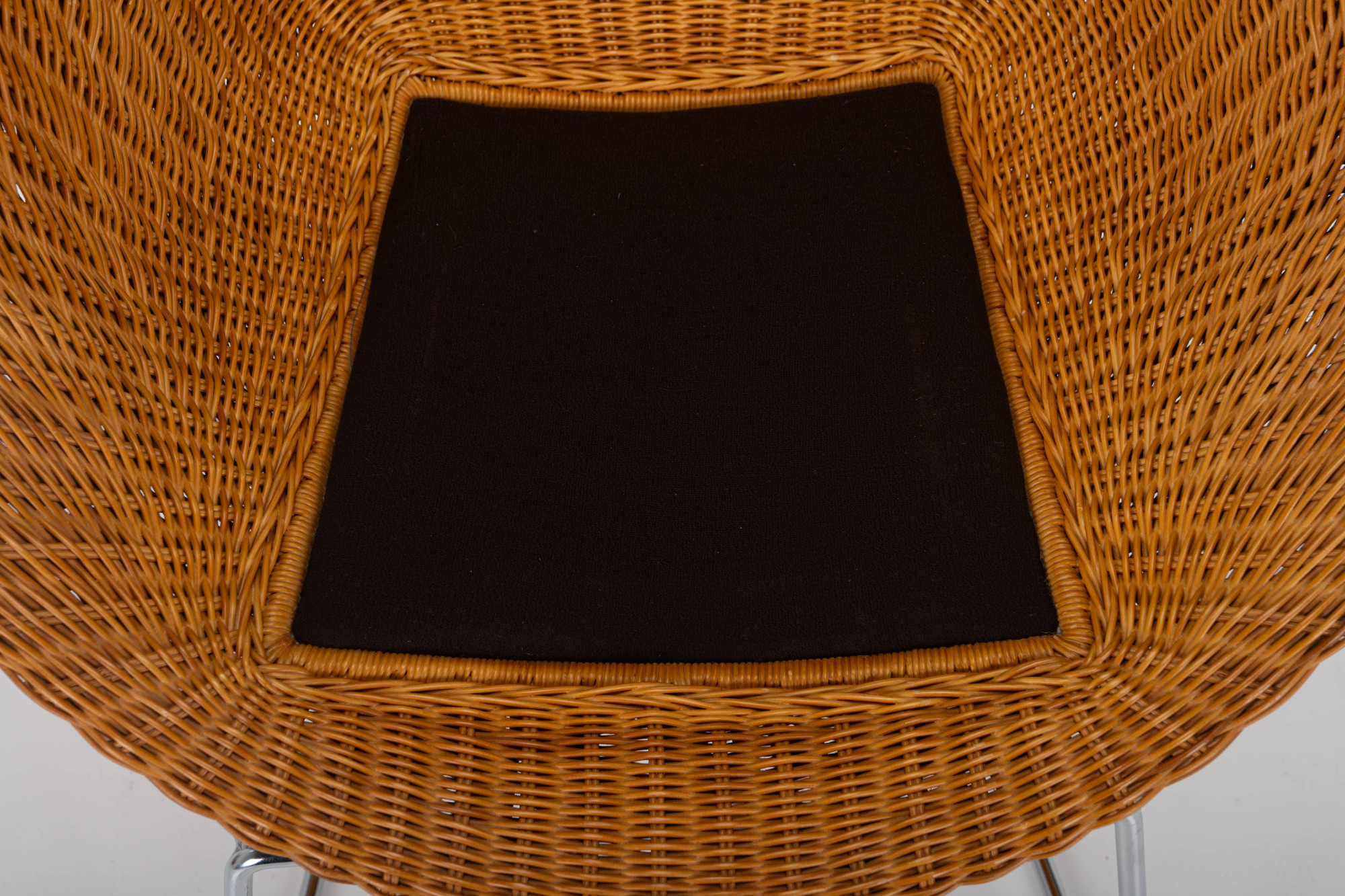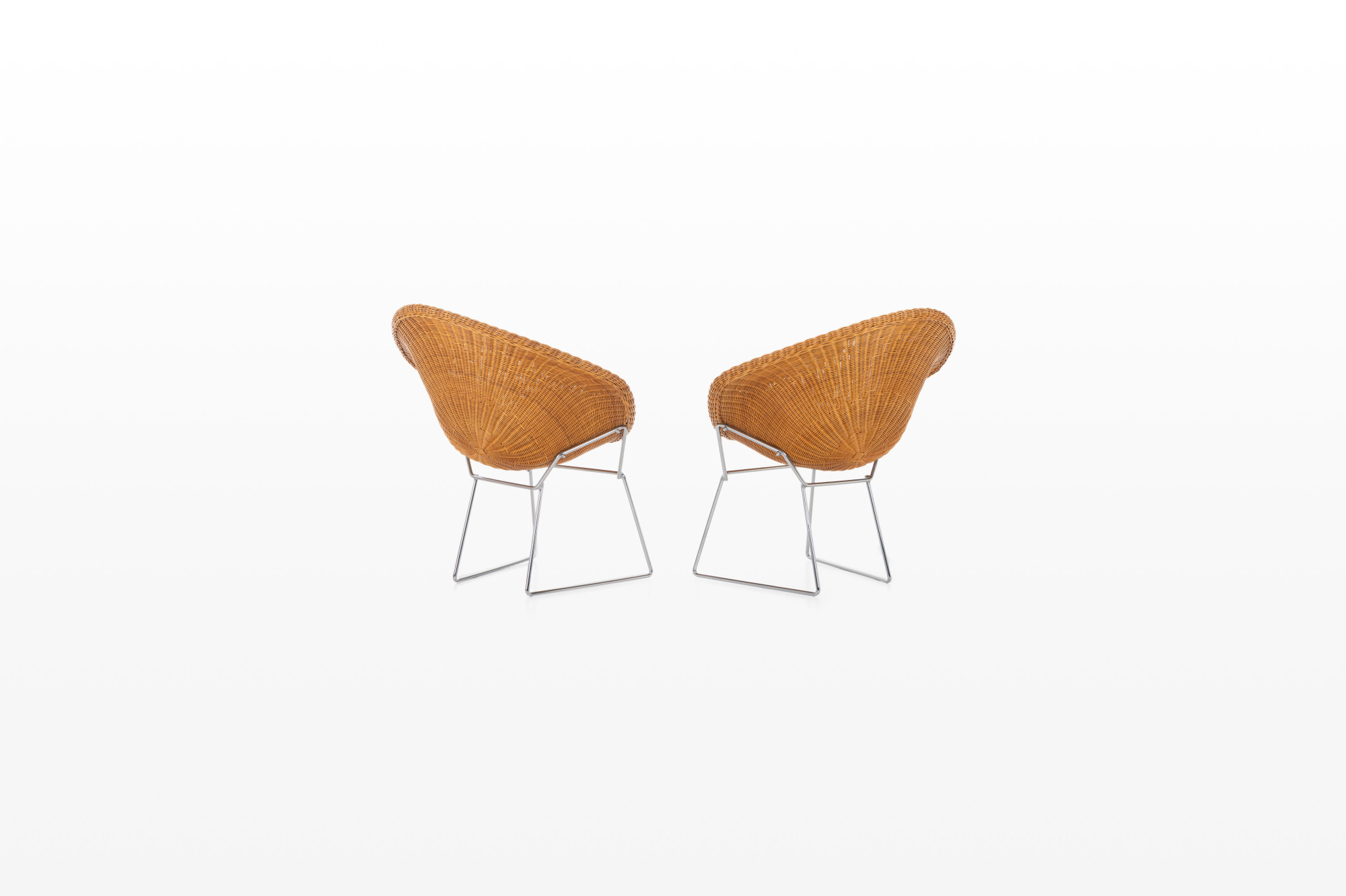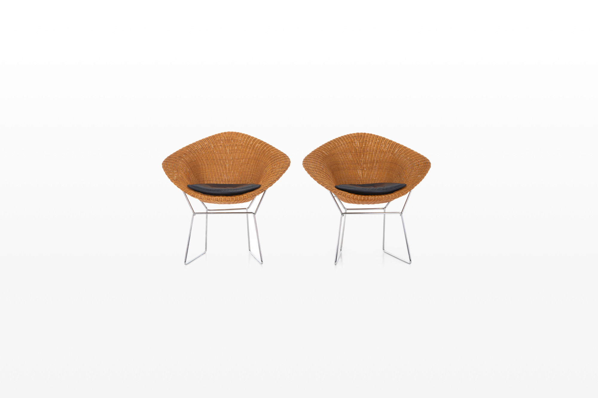Set of two lounge chairs in wicker and chrome. The set is still in very good condition and comes with a dark blue leather cushion.