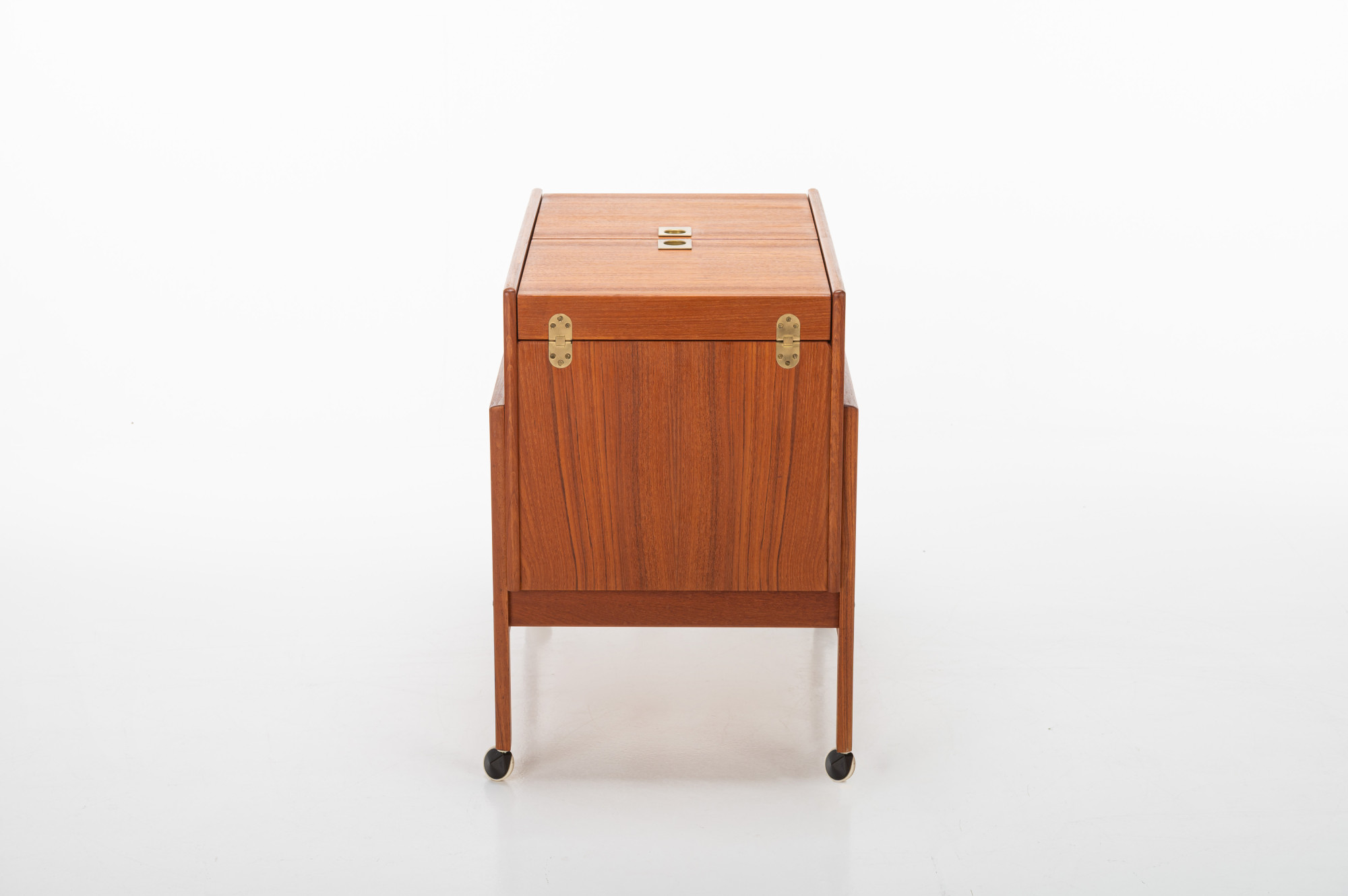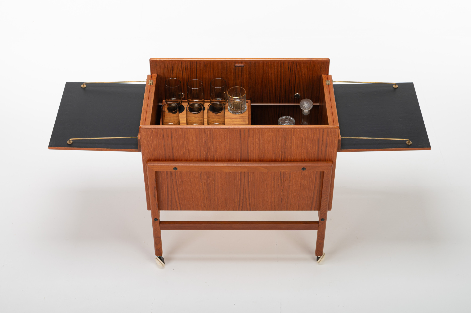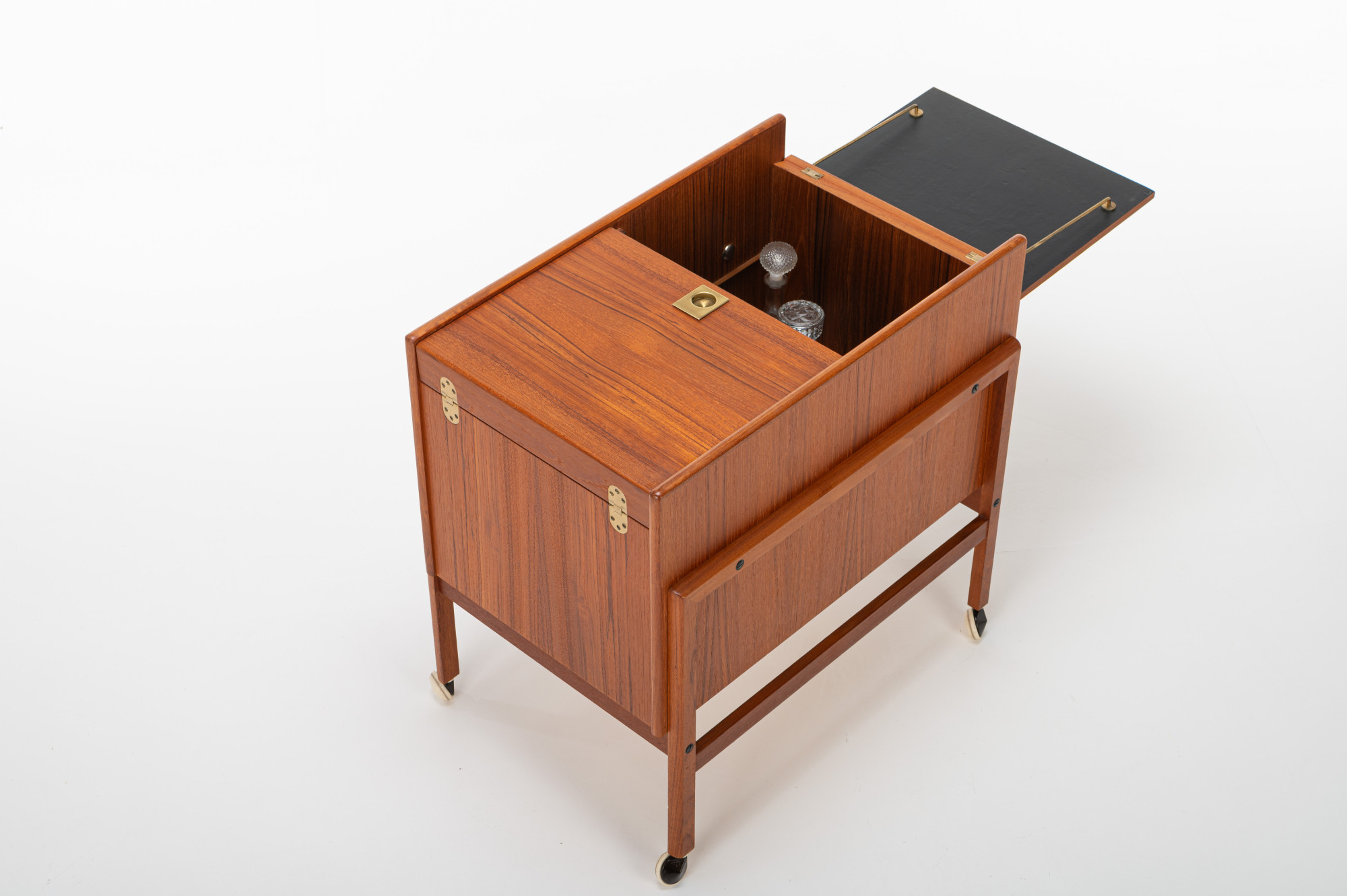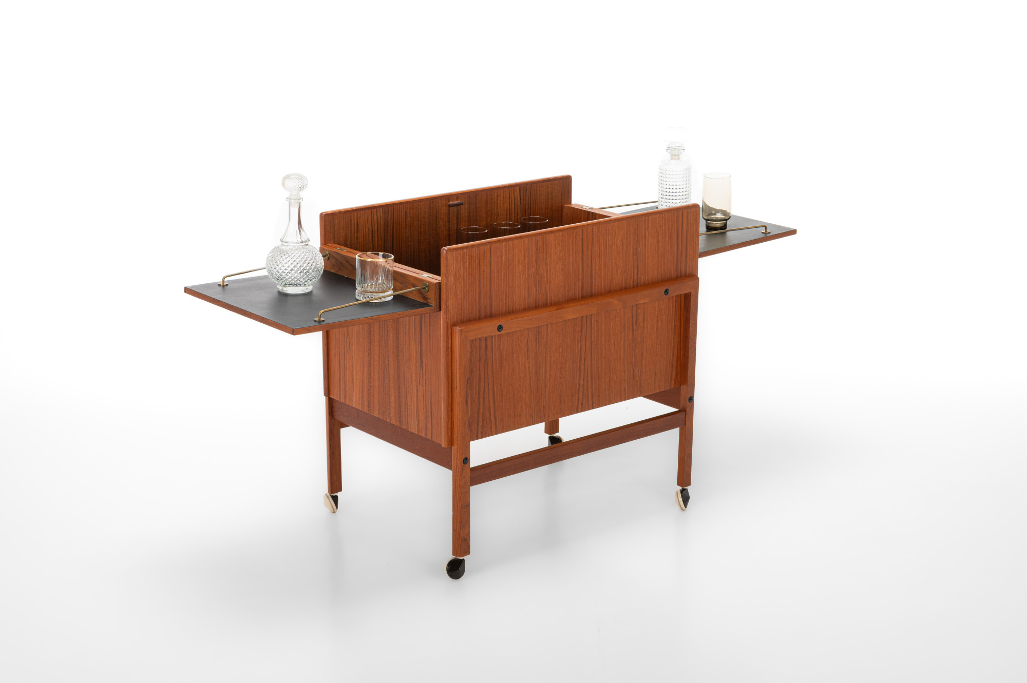 This vintage Danish barcart trolley, designed by Andreas Hansen for Arrebø Mobler, is a classic piece of mid-century design. It featureas place for a lot of glasses and bottles. Perfect for you cocktail evening. This piece is made of teak wood and brass handles.