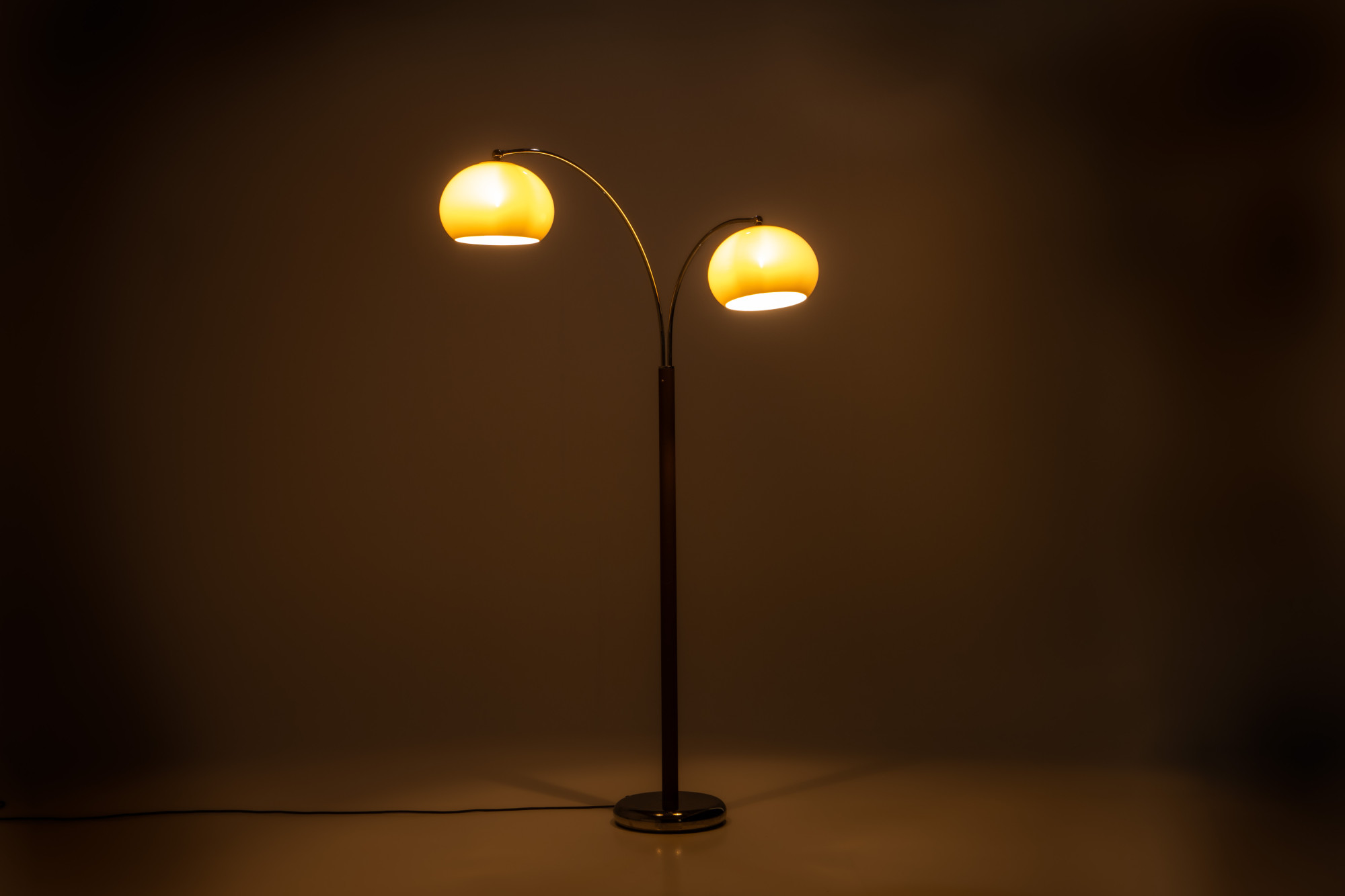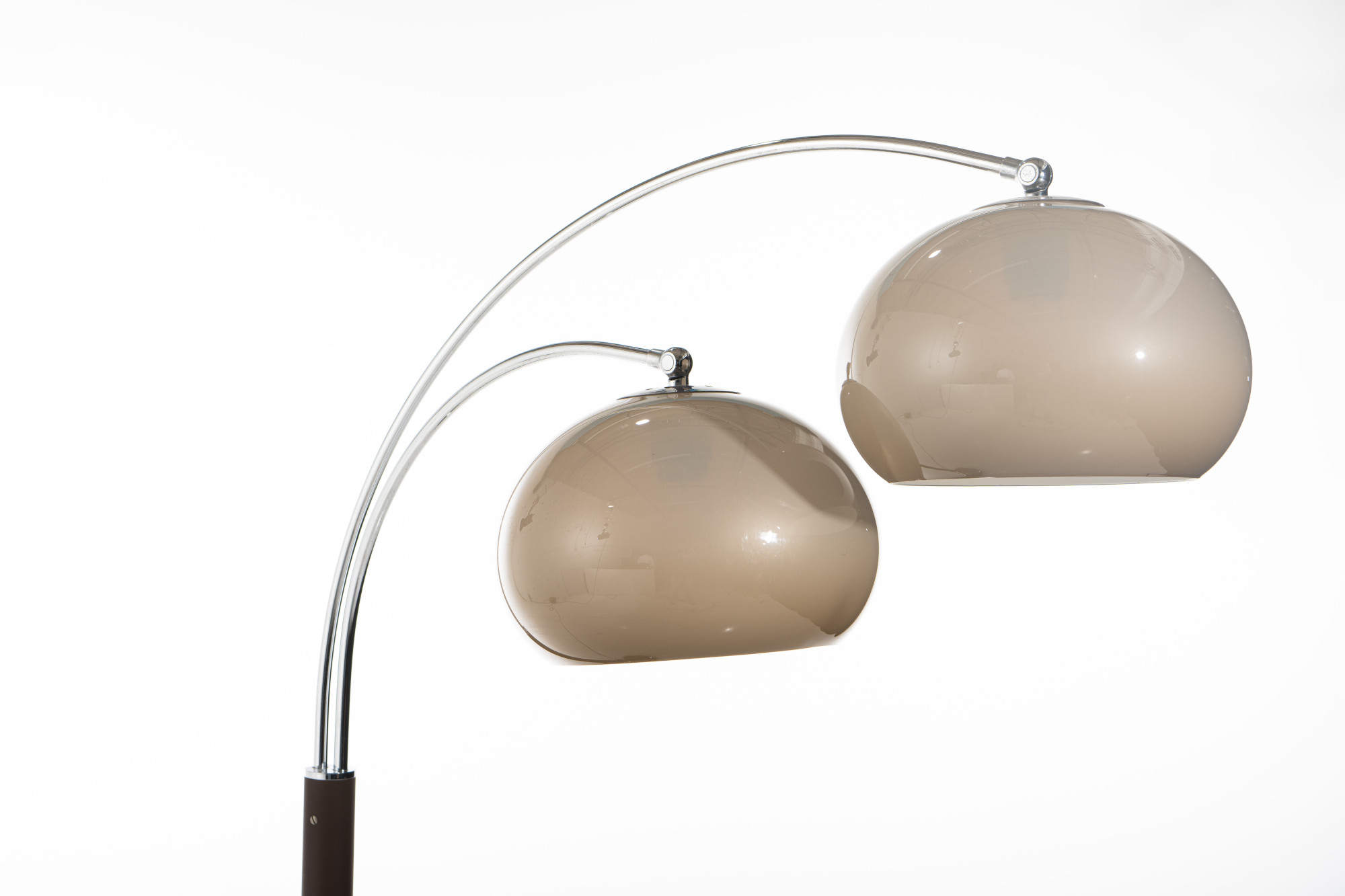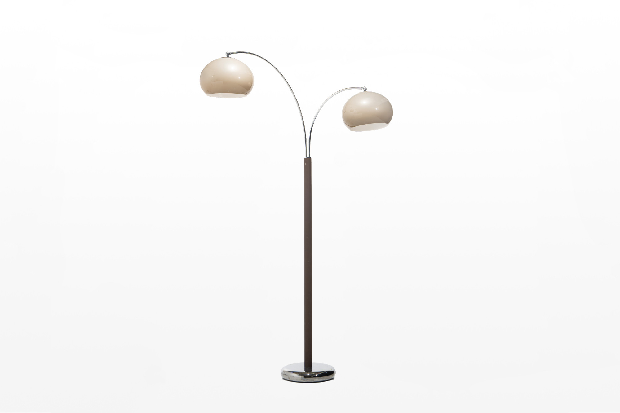 Iconic double arc floor lamp with two mushroom acrylic shades in beige color by Dijktra Lampen, The Netherlands. The base and the arches are in chrome and a part of the lamp is brown metal. The arches are flexible and can also be placed in opposite directions.