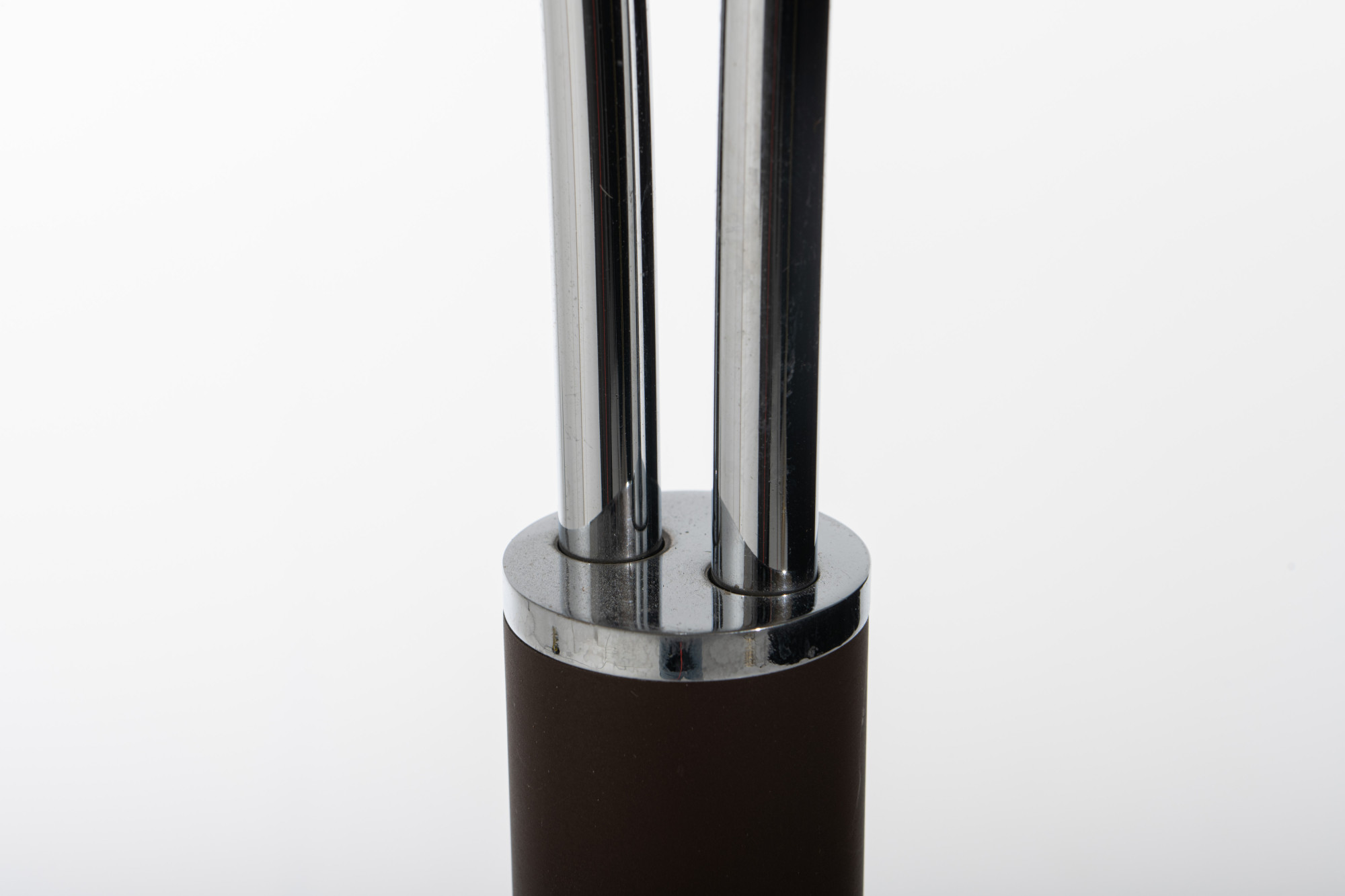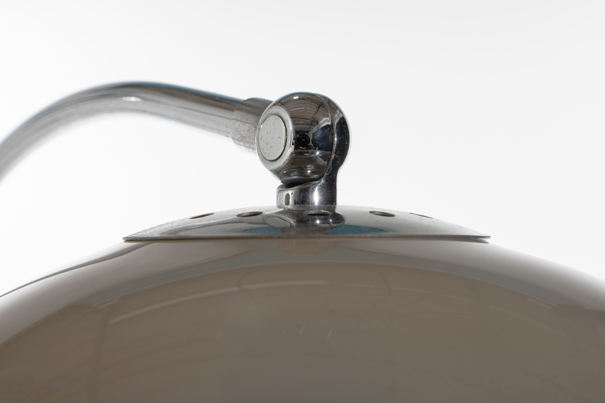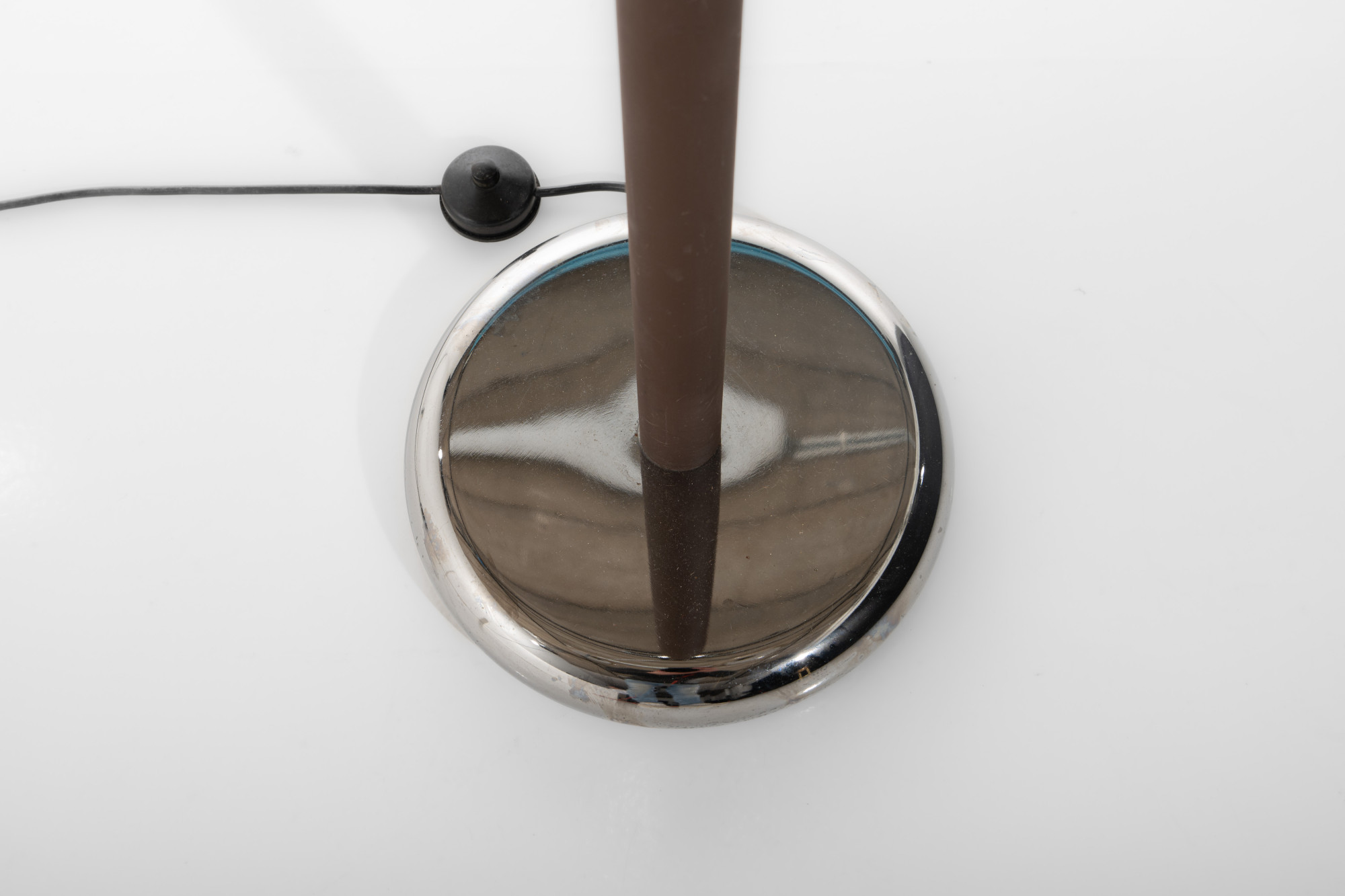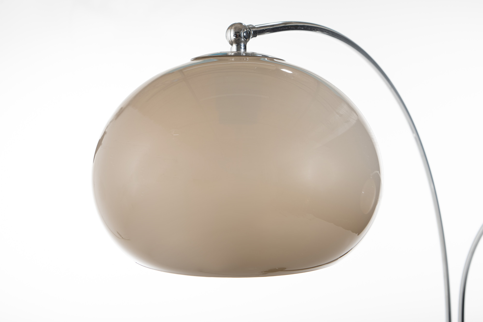 Iconic double arc floor lamp with two mushroom acrylic shades in beige color by Dijktra Lampen, The Netherlands. The base and the arches are in chrome and a part of the lamp is brown metal. The arches are flexible and can also be placed in opposite directions.