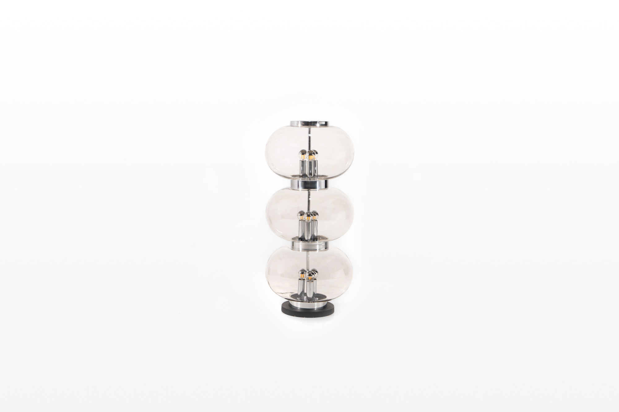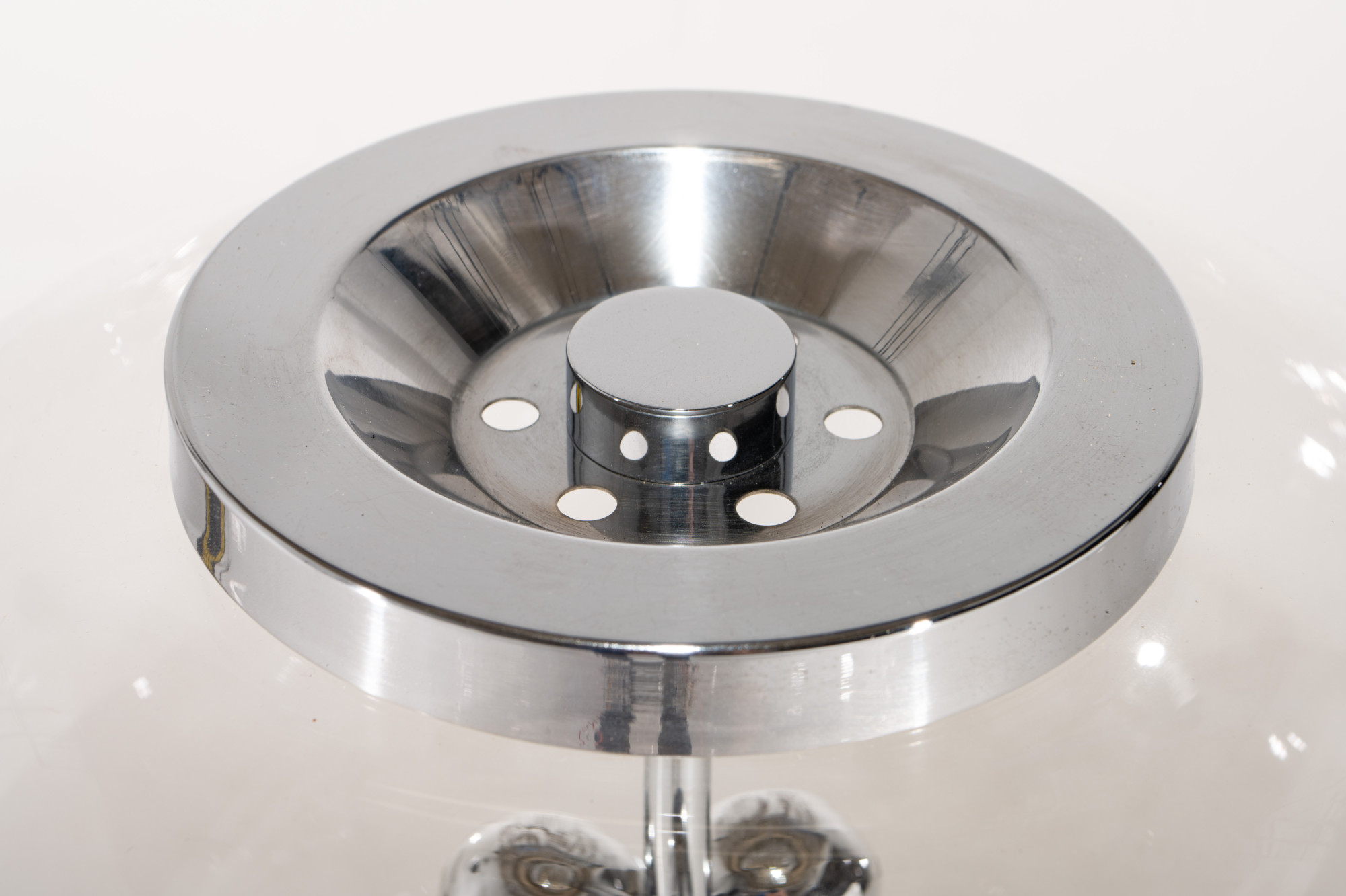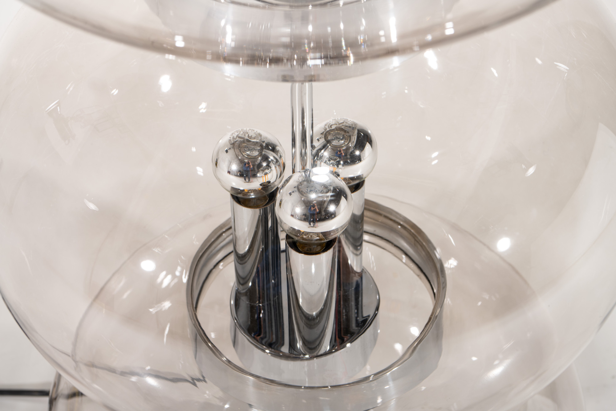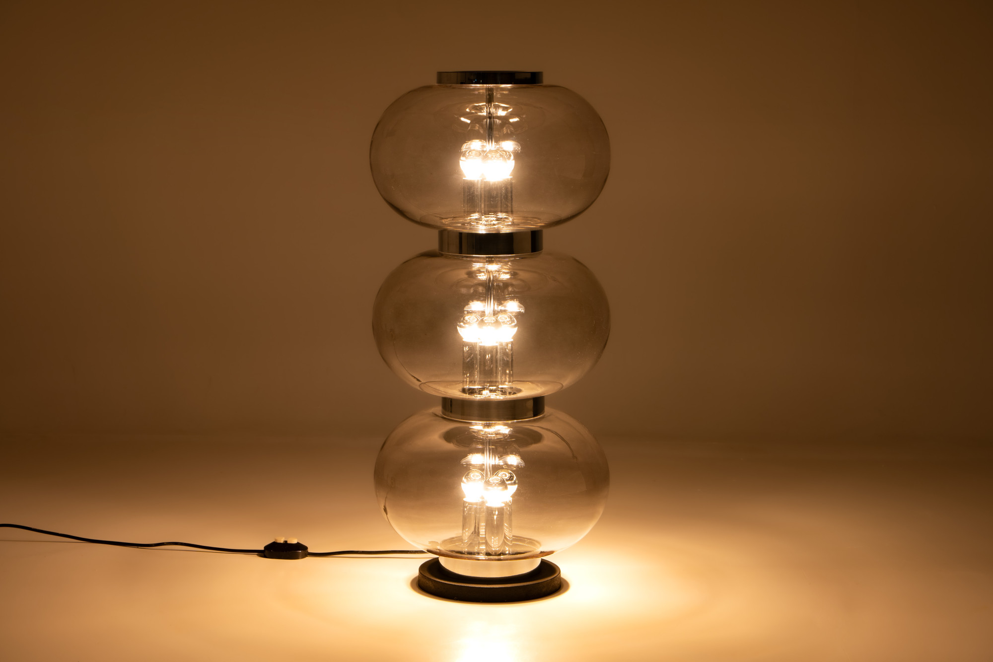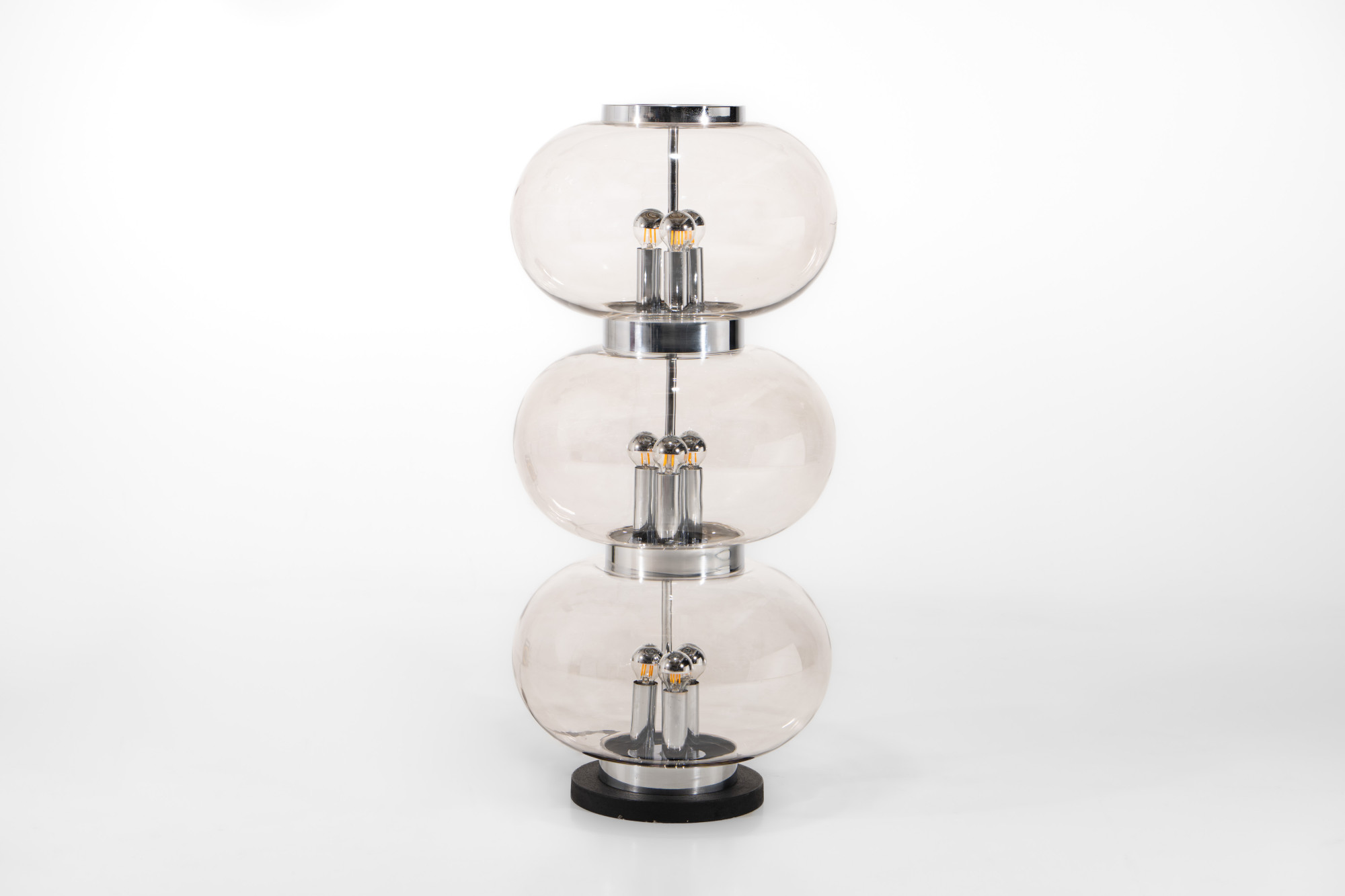 This vintage floor lamp is a true statement piece for any interior. It features three chrome rings and three smoked glass globes, with a total of nine light points. The lamp is in great condition.