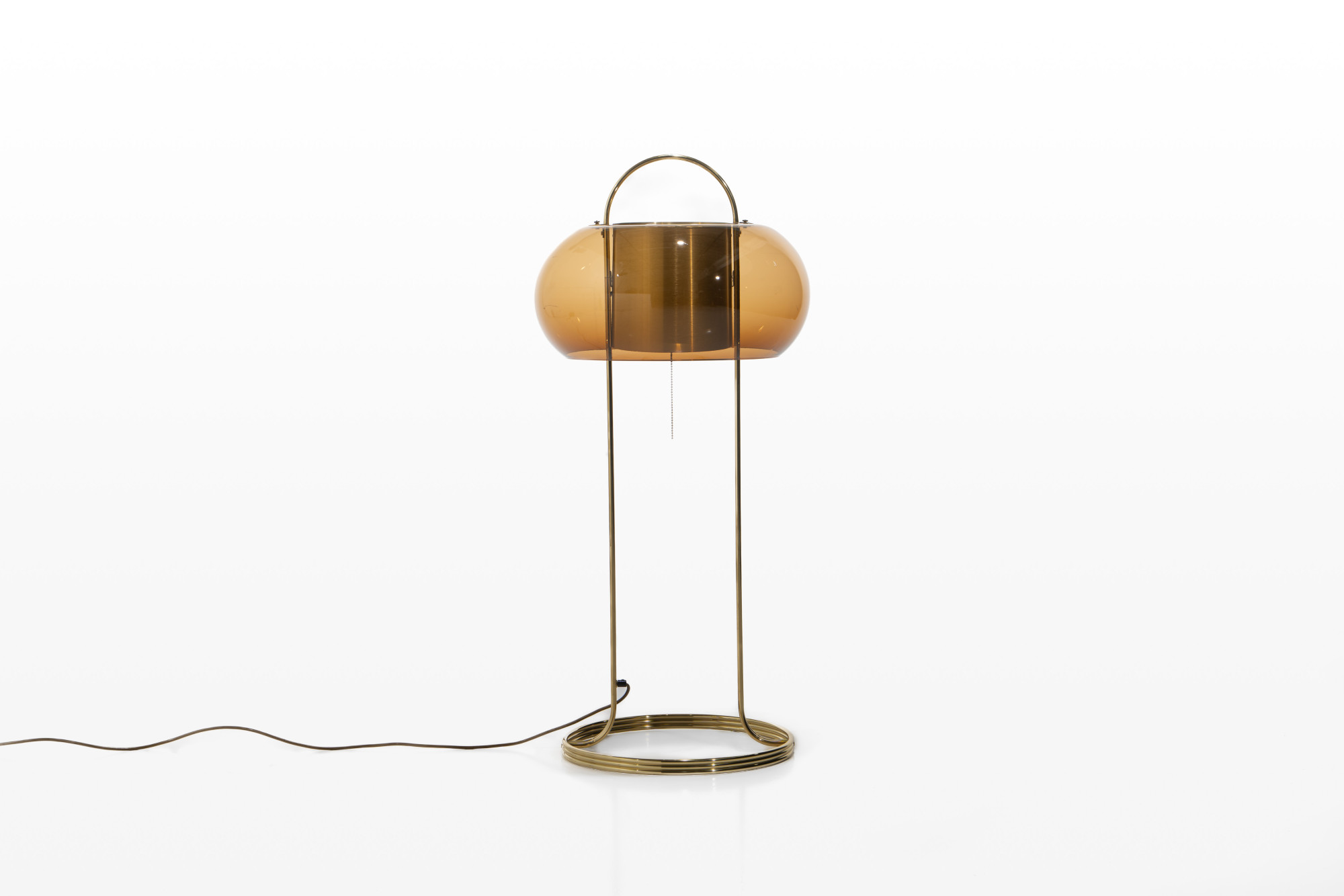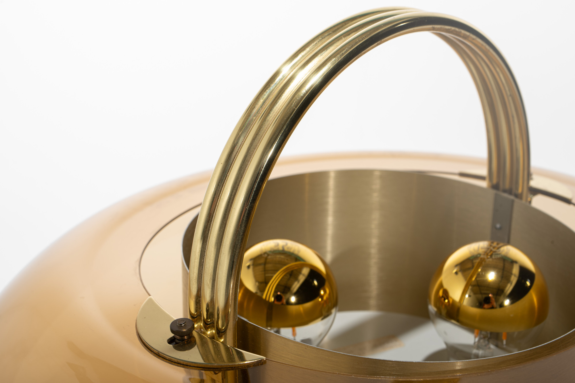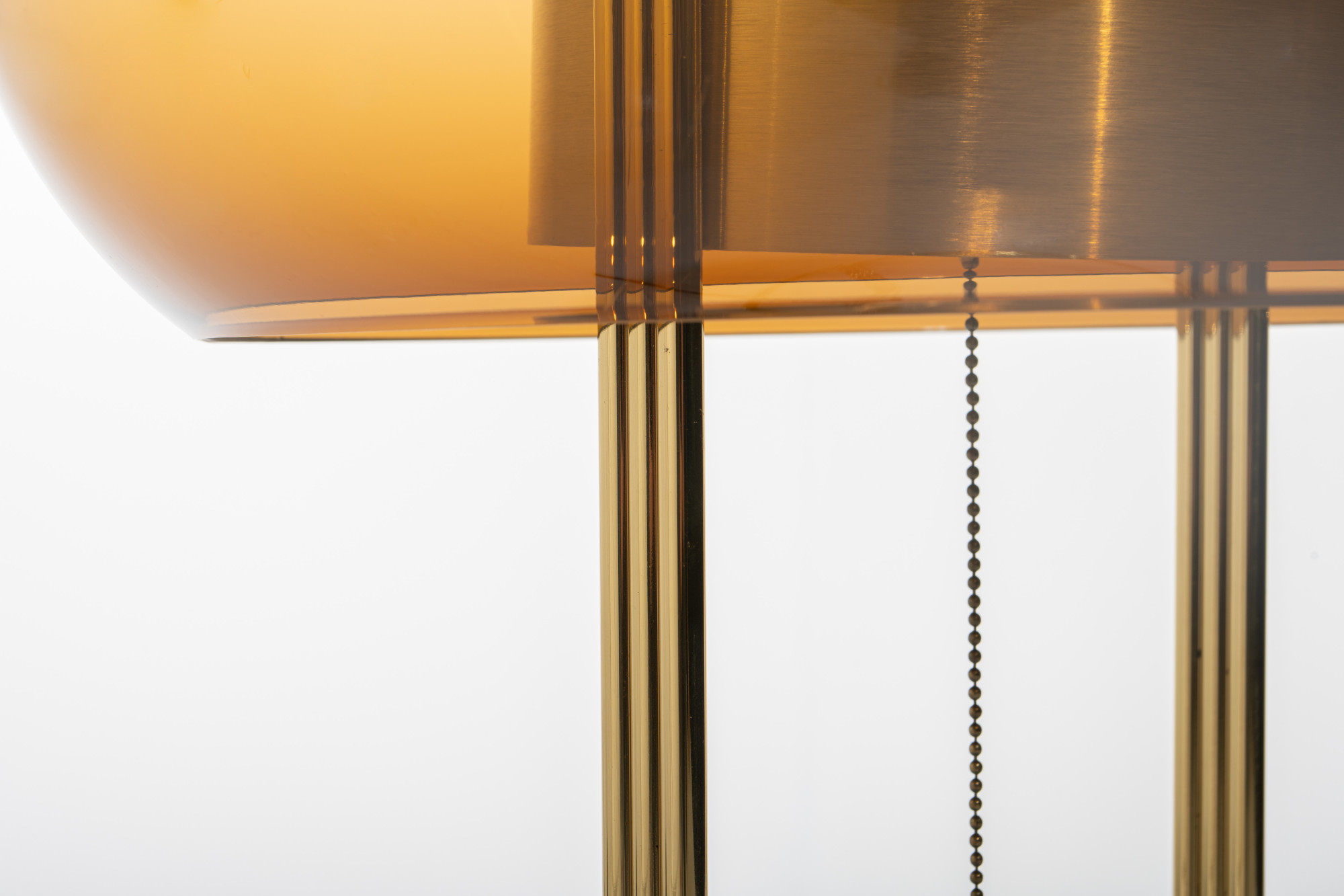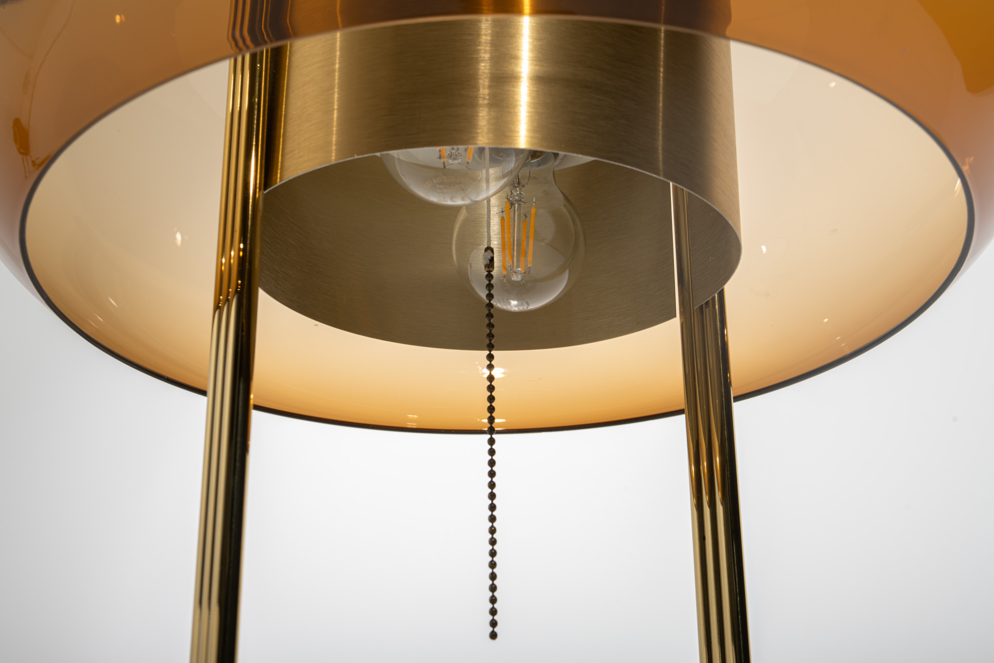 A vintage floor lamp made of gold-colored metal and brass, finished with a large dome of smoked acrylic. The lamp has four lights, two at the bottom and two at the top, which can be controlled independently or together by pulling the chain. The lamps at the top are new gold-colored LED mirror lamps, at the bottom are regular LED lamps.