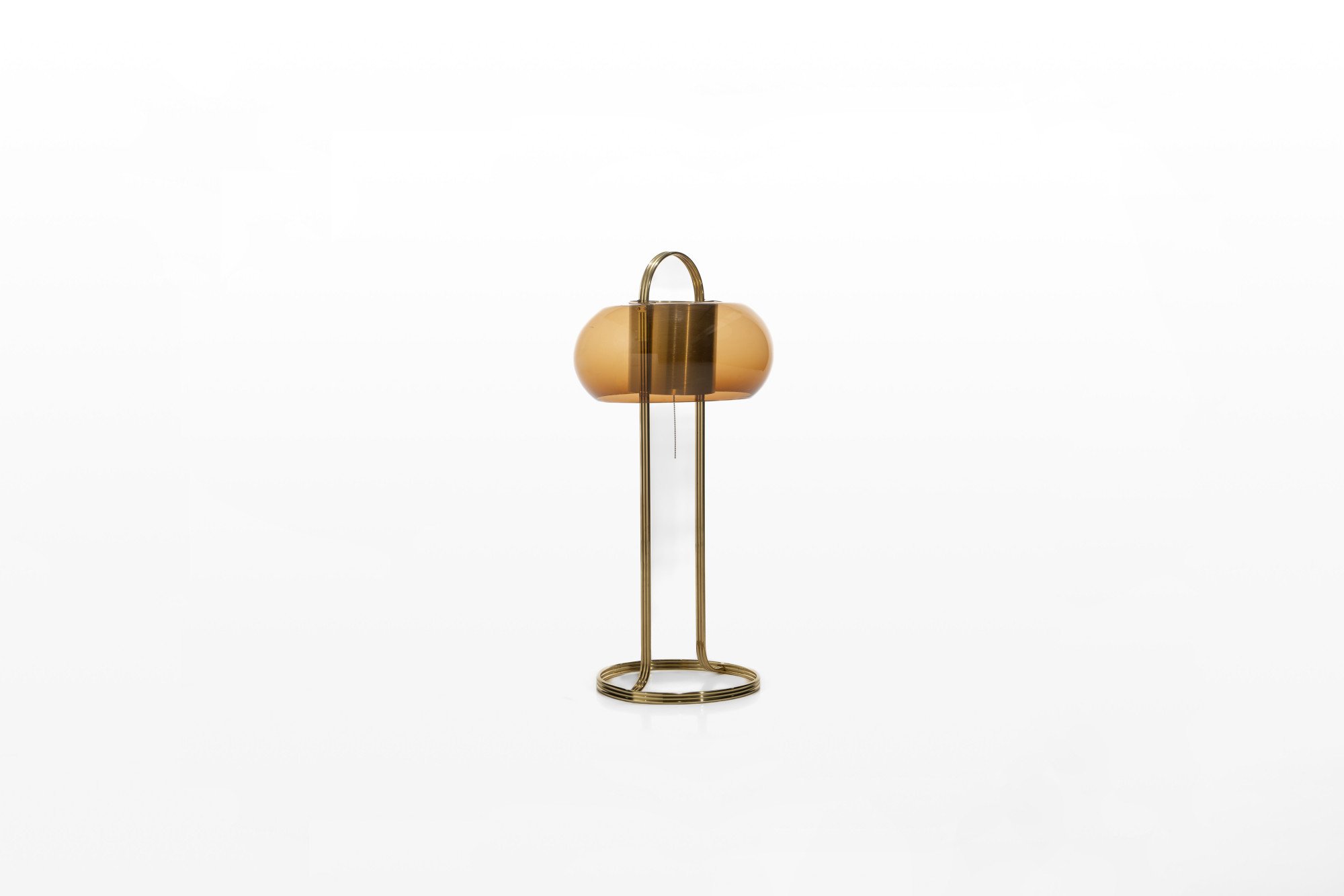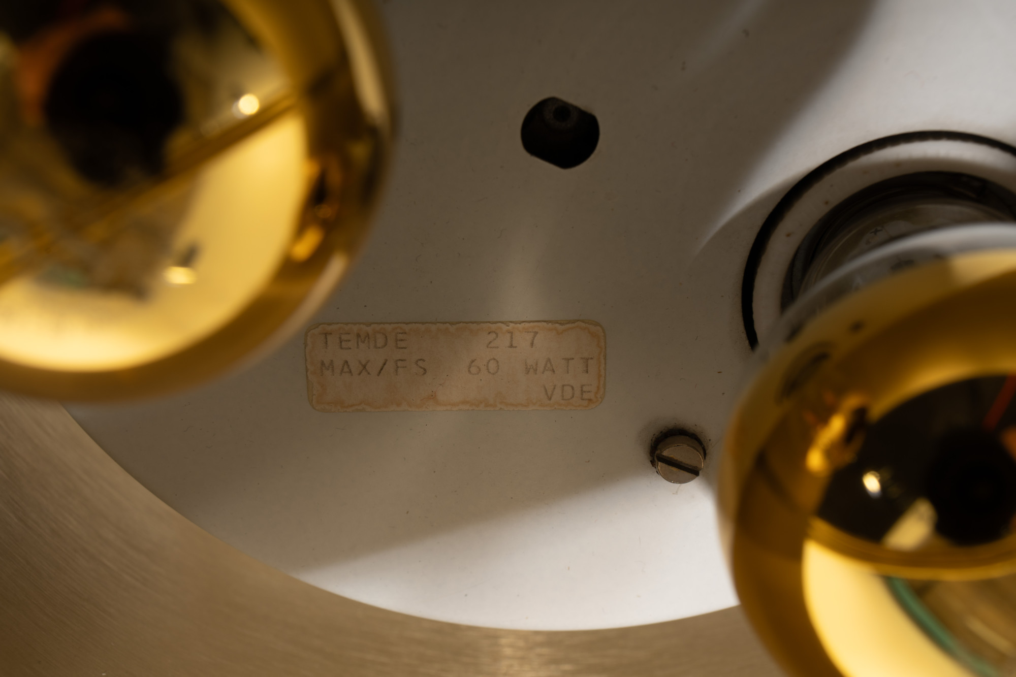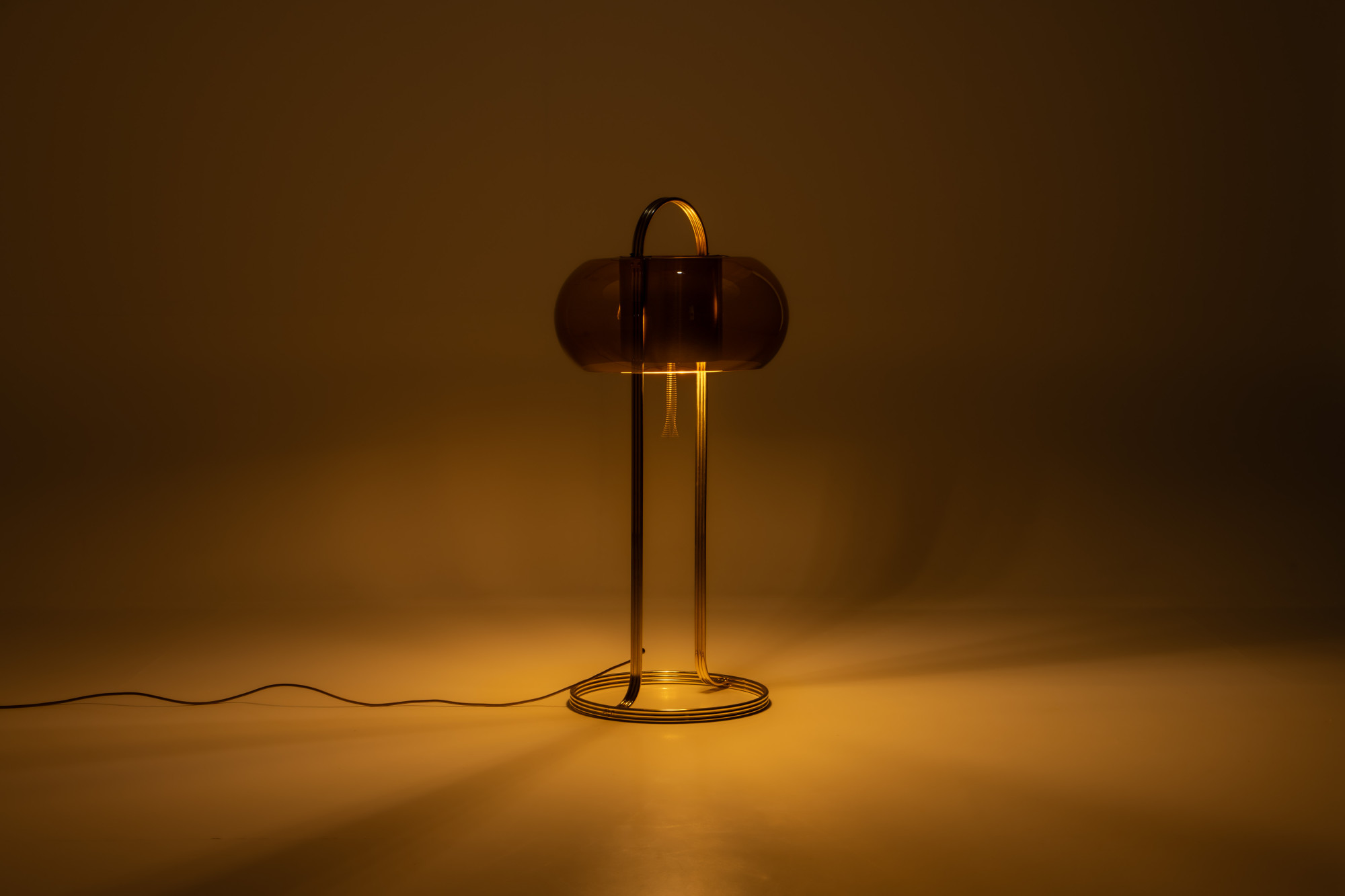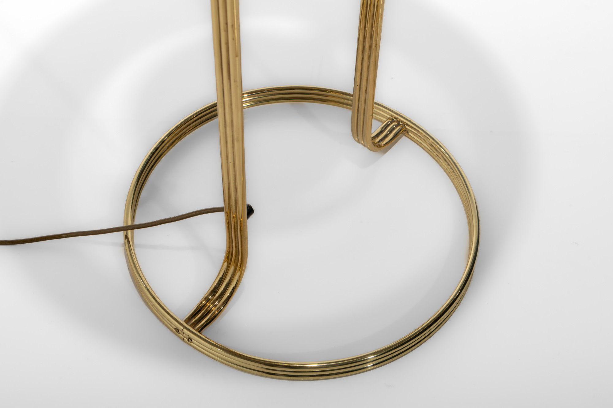 A vintage floor lamp made of gold-colored metal and brass, finished with a large dome of smoked acrylic. The lamp has four lights, two at the bottom and two at the top, which can be controlled independently or together by pulling the chain. The lamps at the top are new gold-colored LED mirror lamps, at the bottom are regular LED lamps.