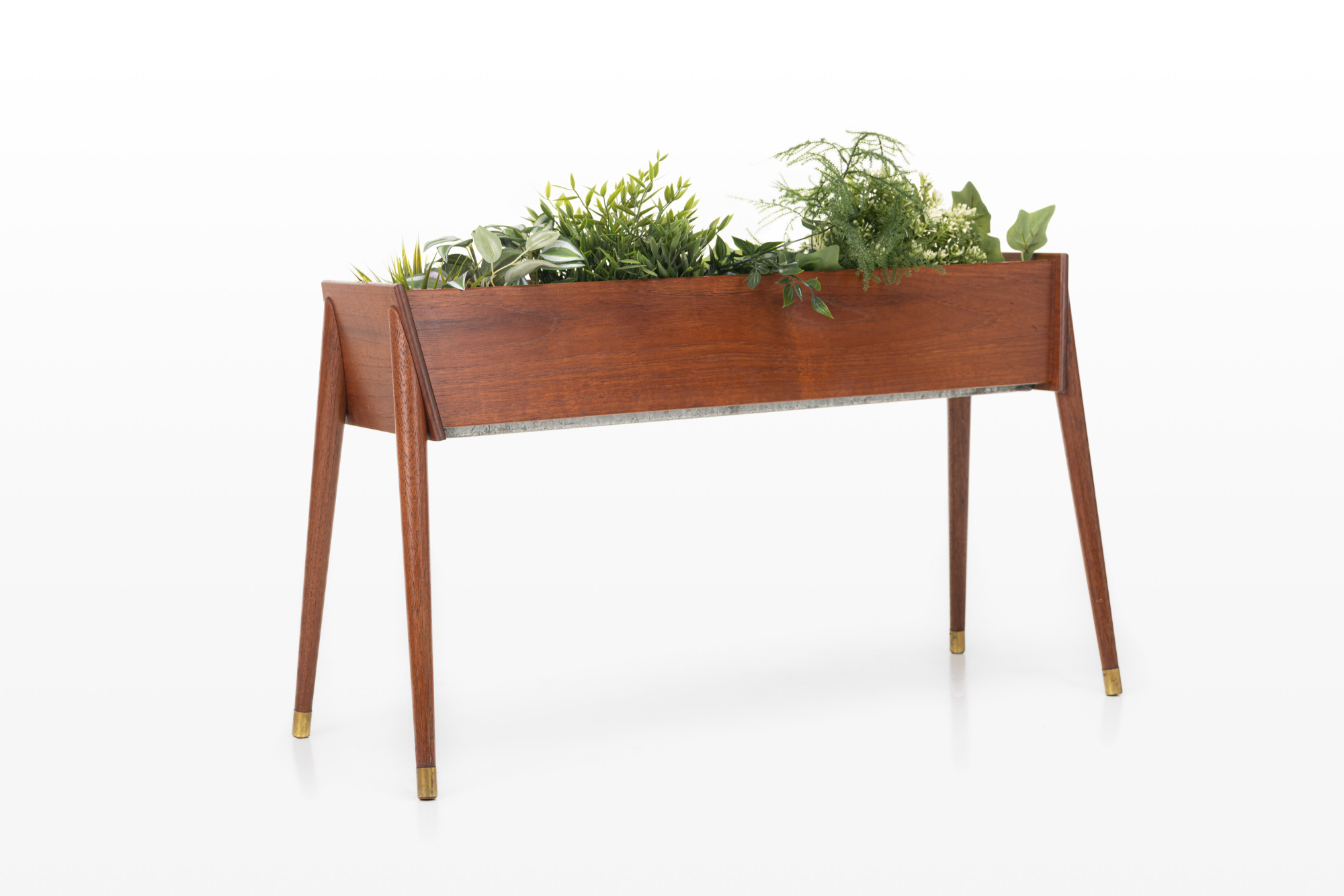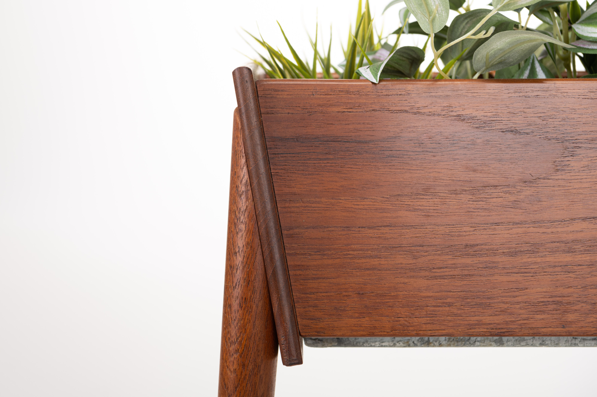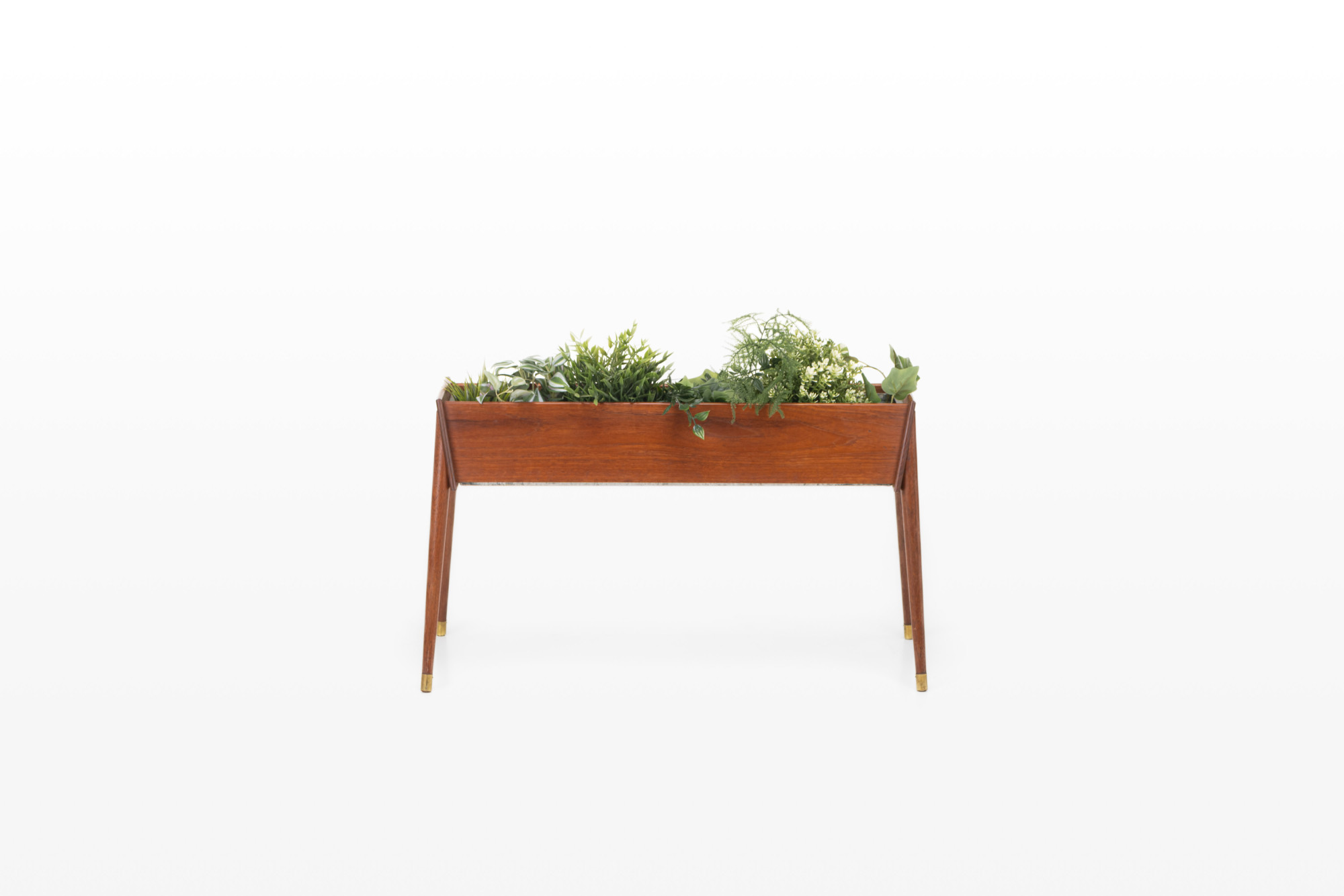 This planter is made of teak and has a nice brass detail on the legs. The plant bench is in zinc. It is still in very good condition.