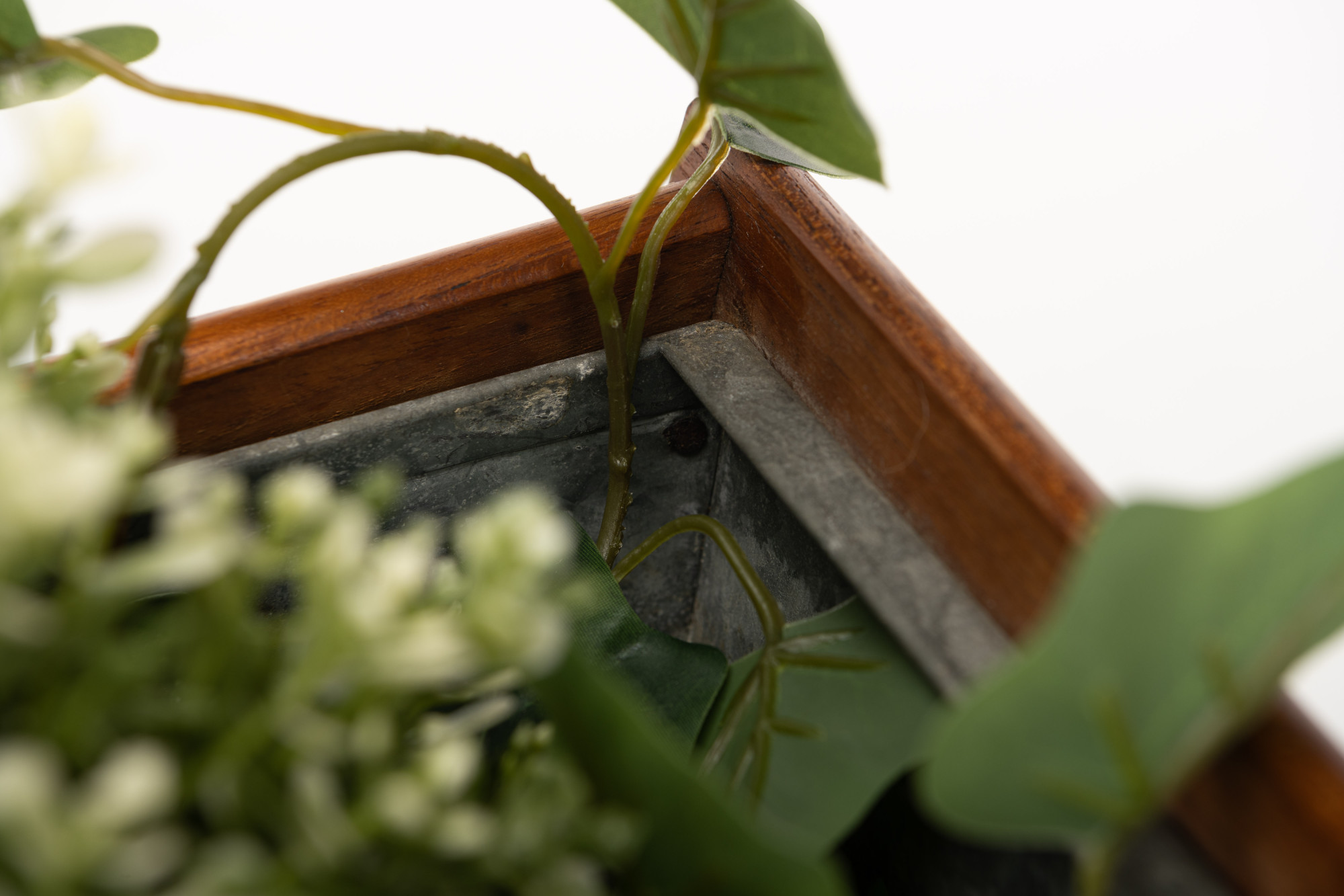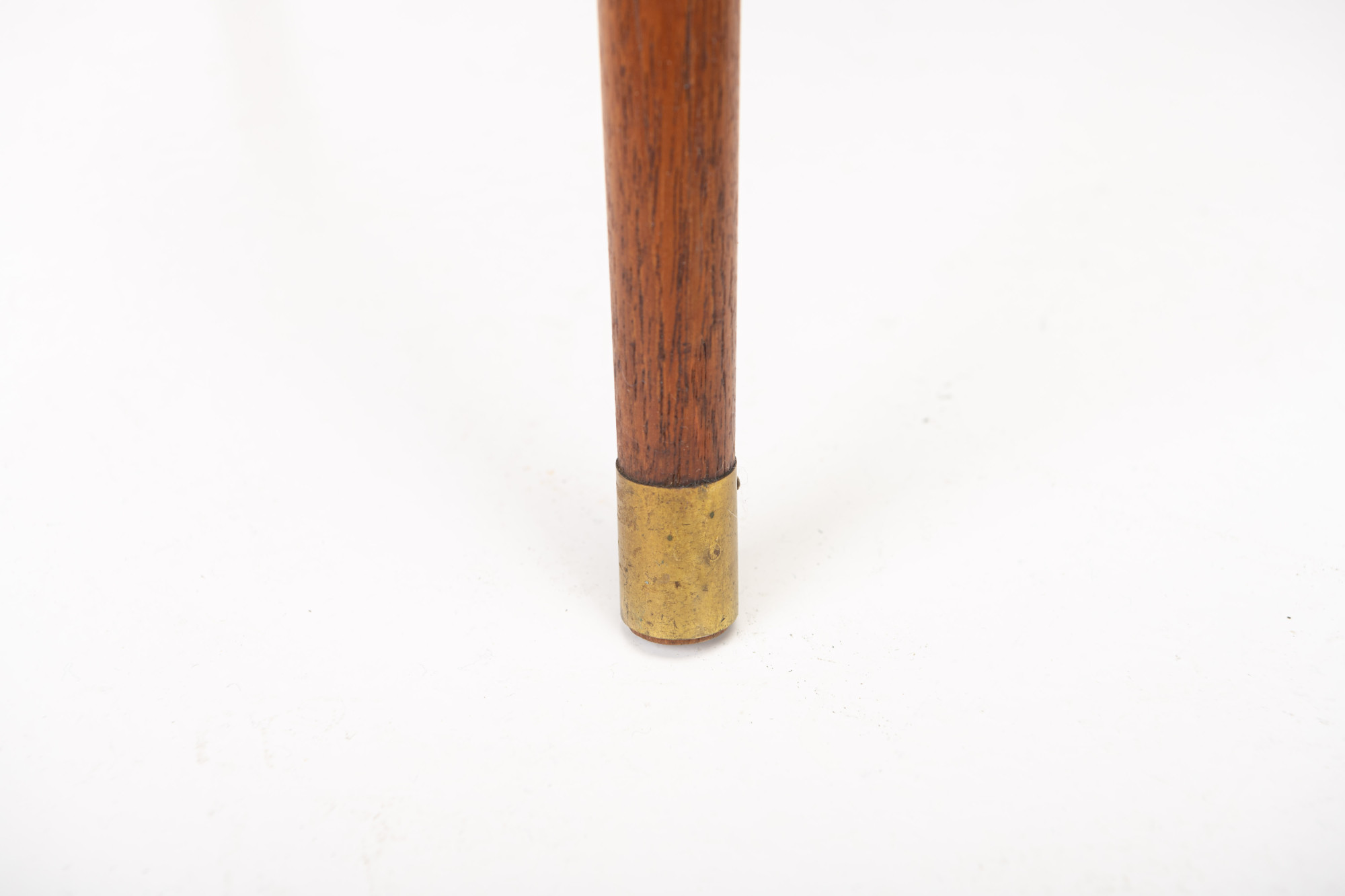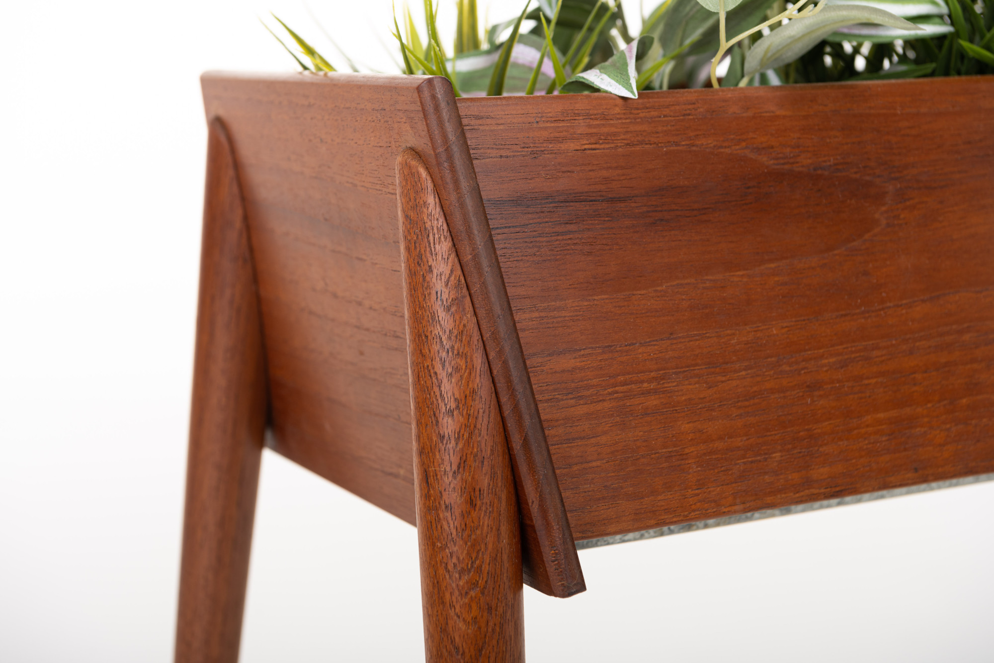 This planter is made of teak and has a nice brass detail on the legs. The plant bench is in zinc. It is still in very good condition.