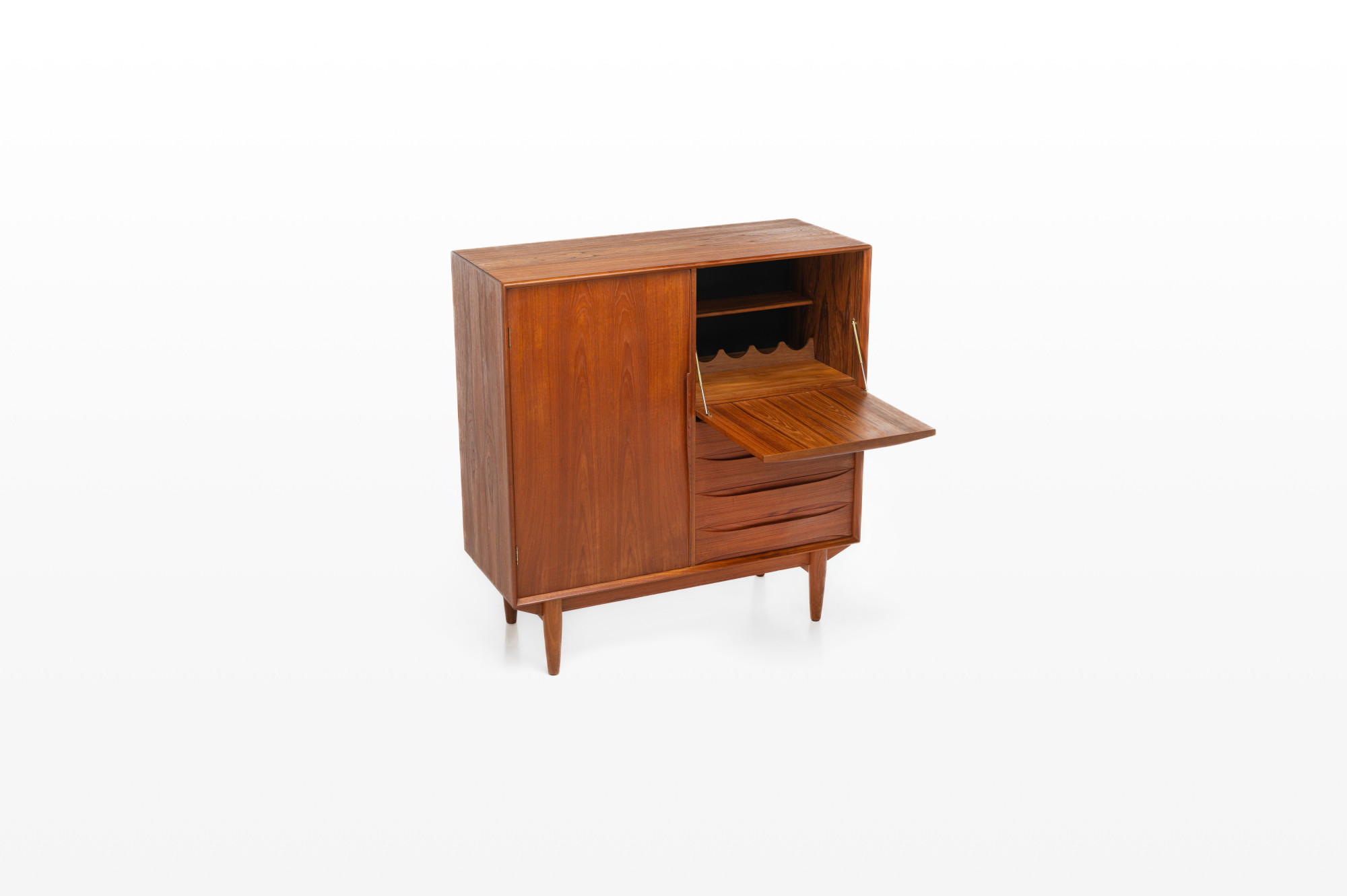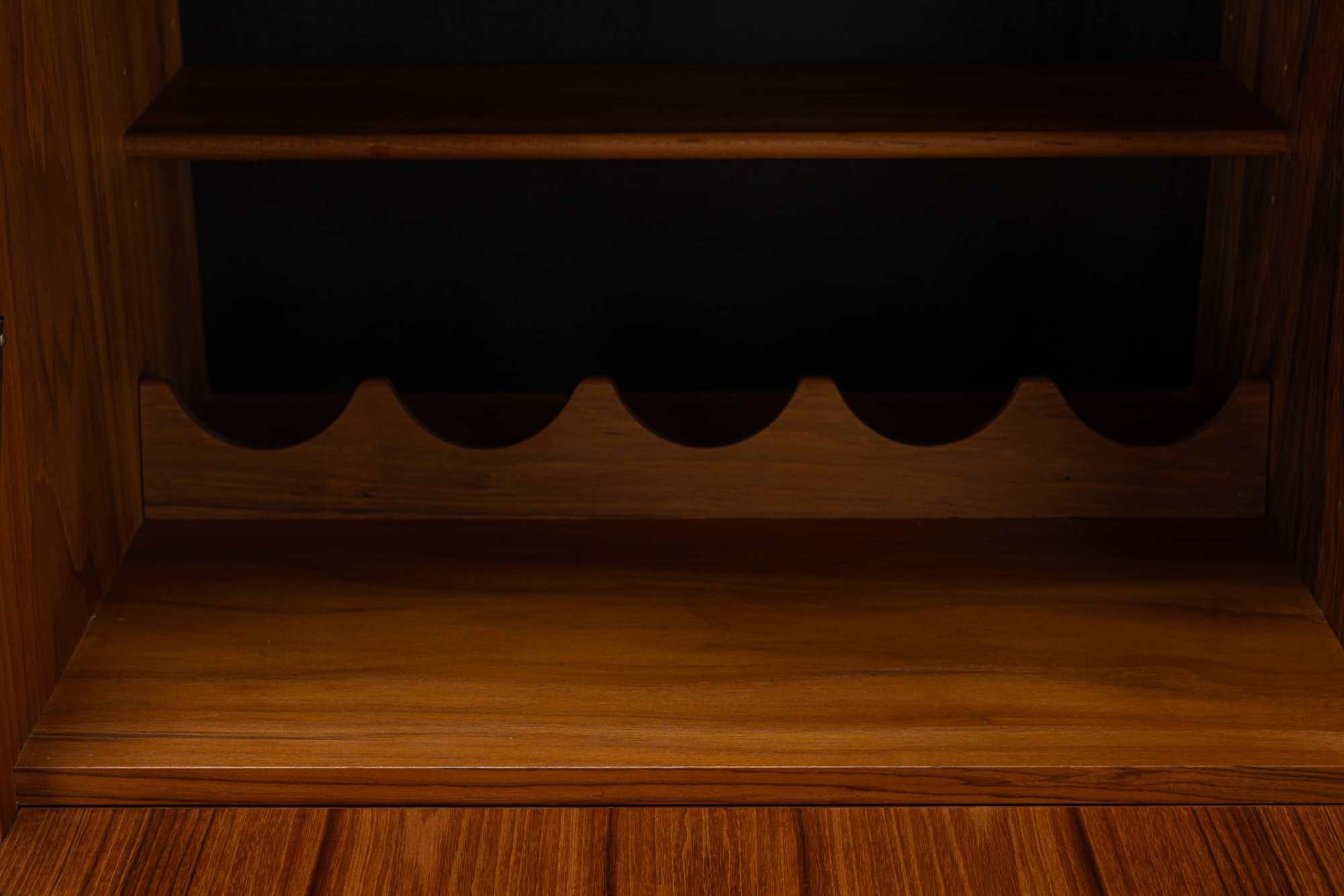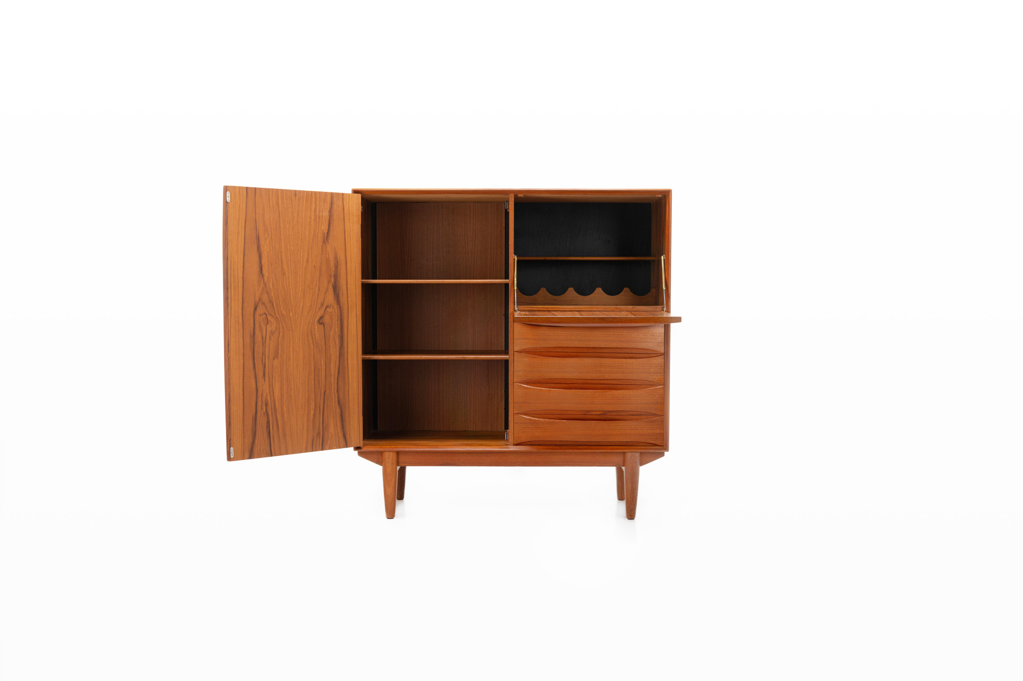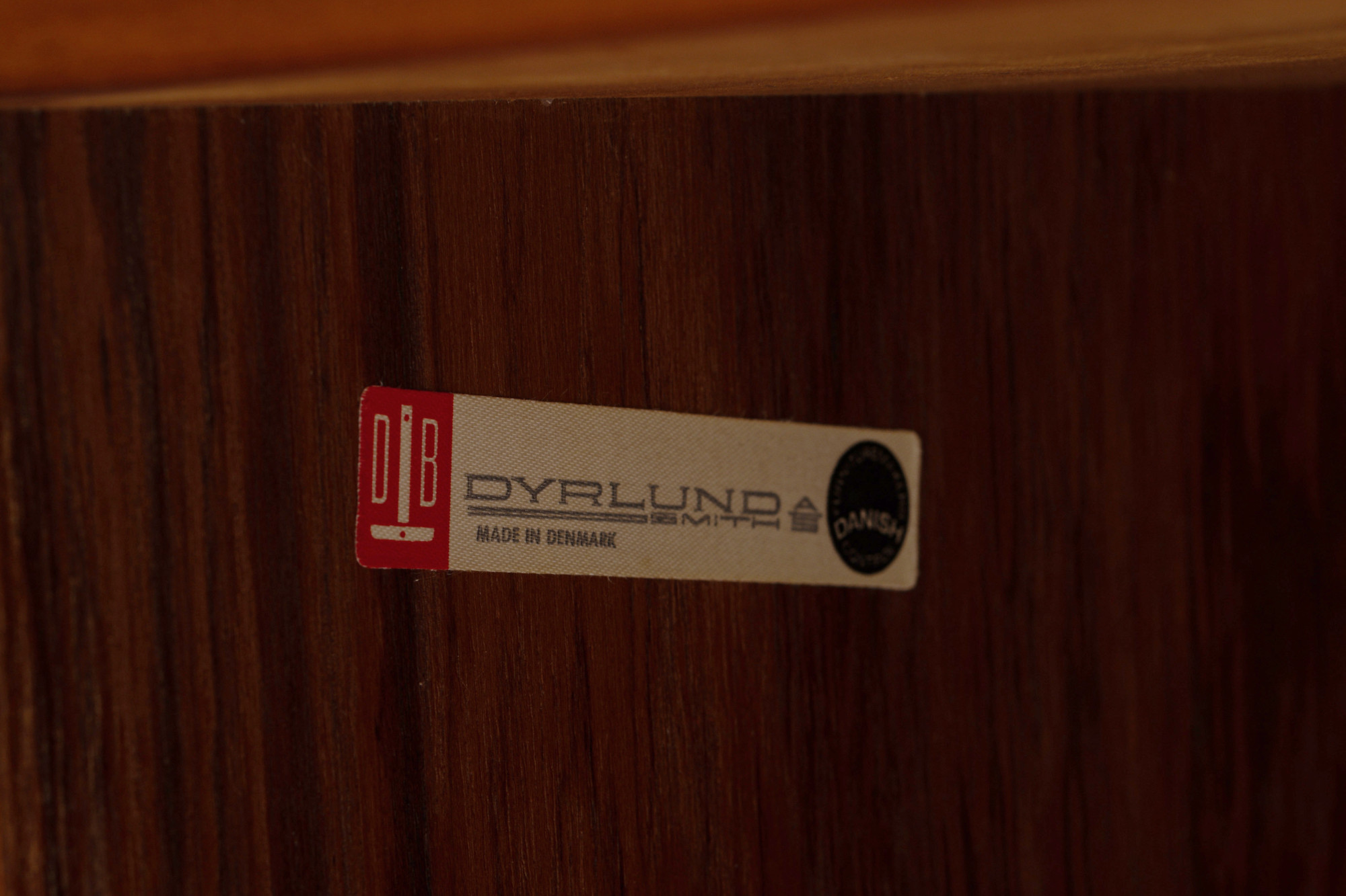 Lovely teak bar cabinet from Dyrlund in Denmark. This vintage piece is of excellent quality and is in great condition. It features four drawers, a designated bar area, and a lot of storage space. The original manufacturer's sticker is still attached.