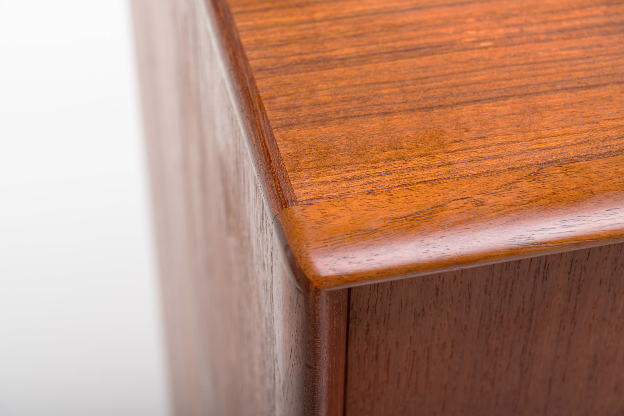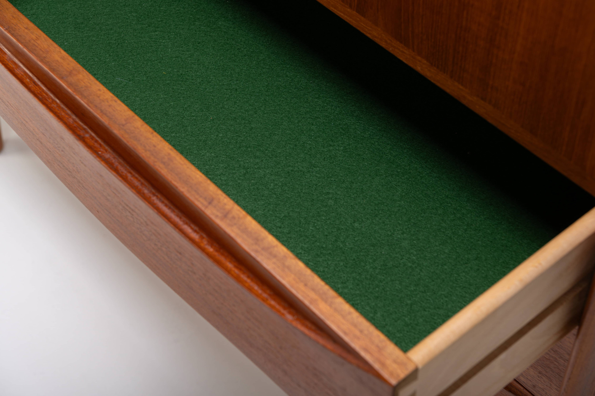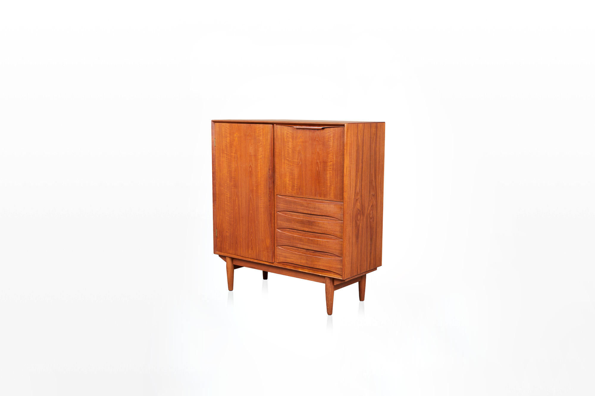 Lovely teak bar cabinet from Dyrlund in Denmark. This vintage piece is of excellent quality and is in great condition. It features four drawers, a designated bar area, and a lot of storage space. The original manufacturer's sticker is still attached.