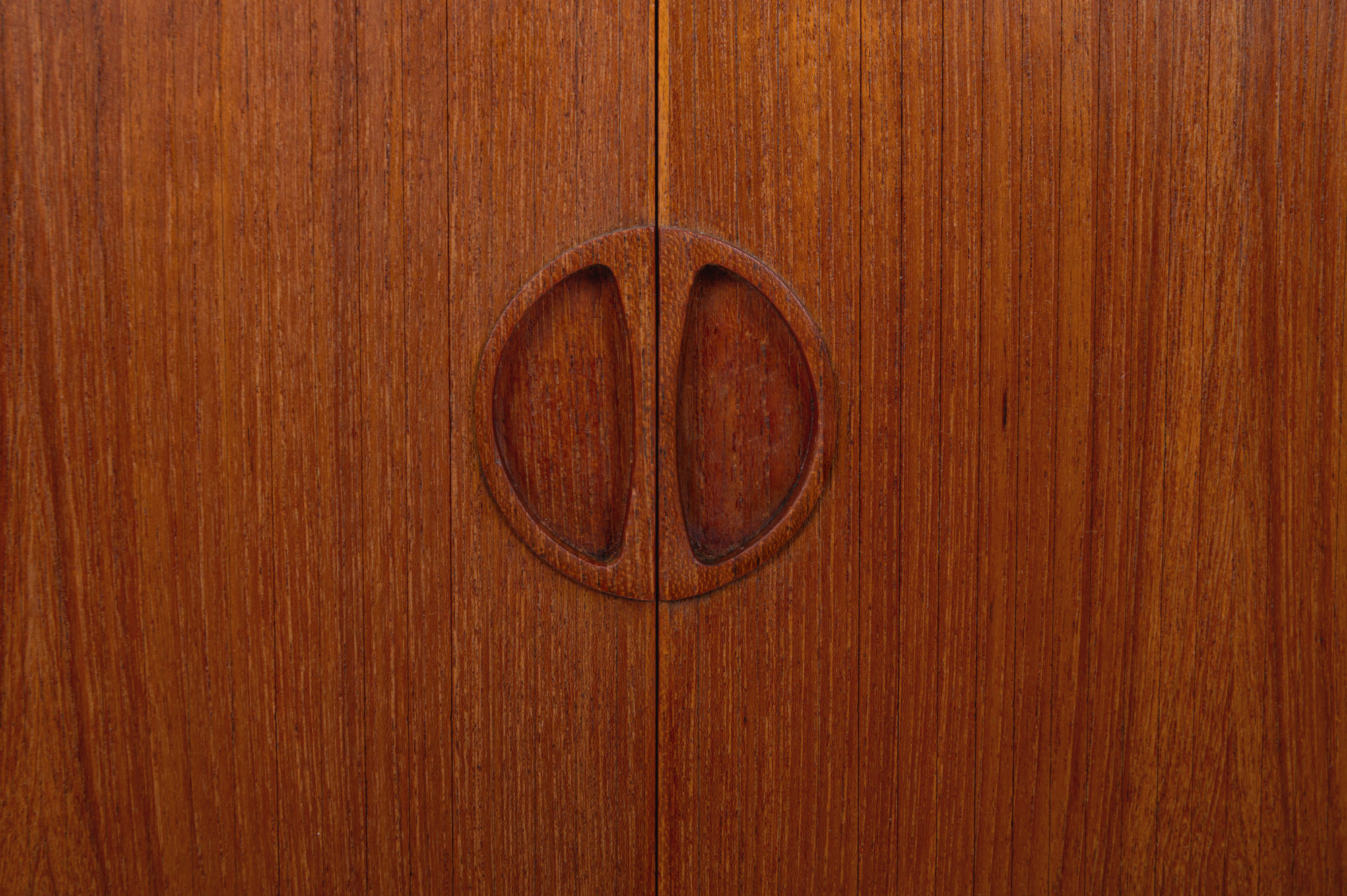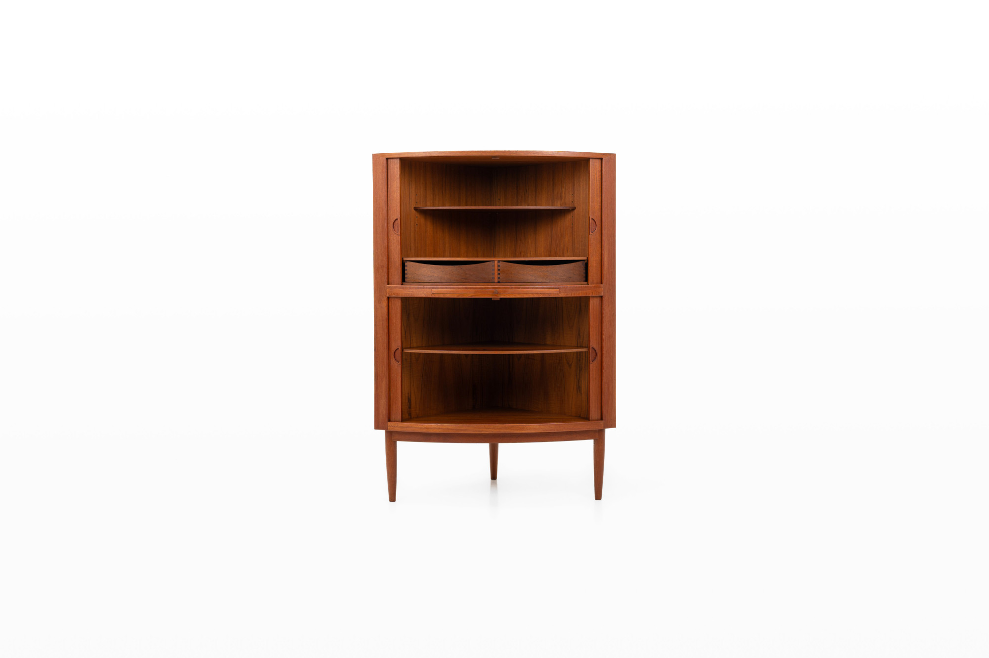 Danish vintage corner cabinet with a bar area. The cabinet was designed by Johannes Andersen and produced in Denmark in the 1960s. It features a pull-out shelf for serving drinks, tambour doors at the top and bottom. On the inside, there are two drawers and two shelves.