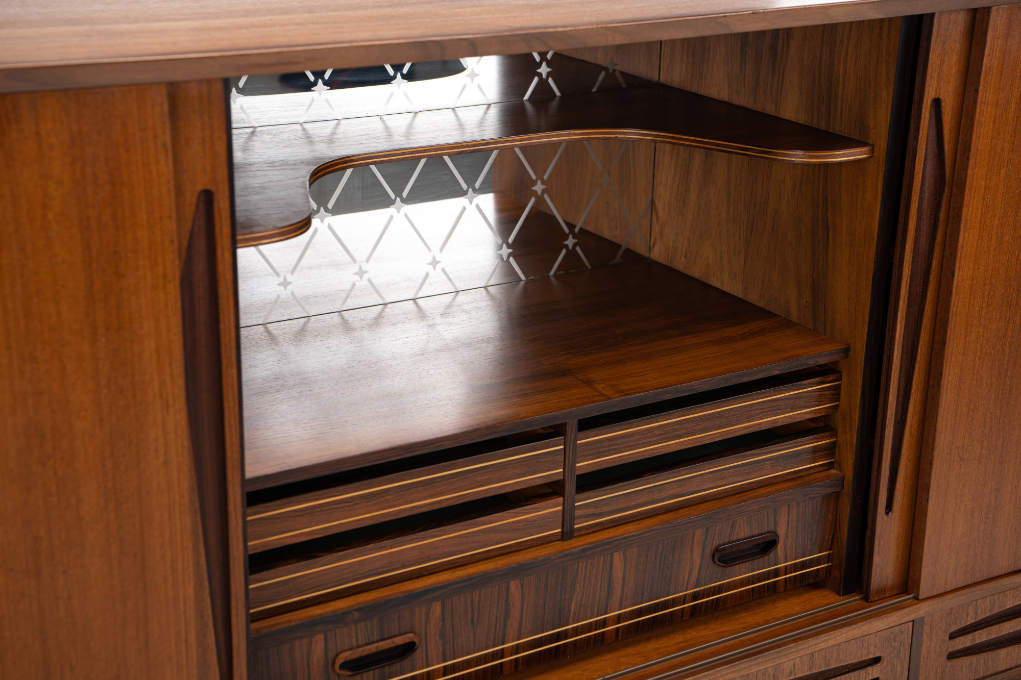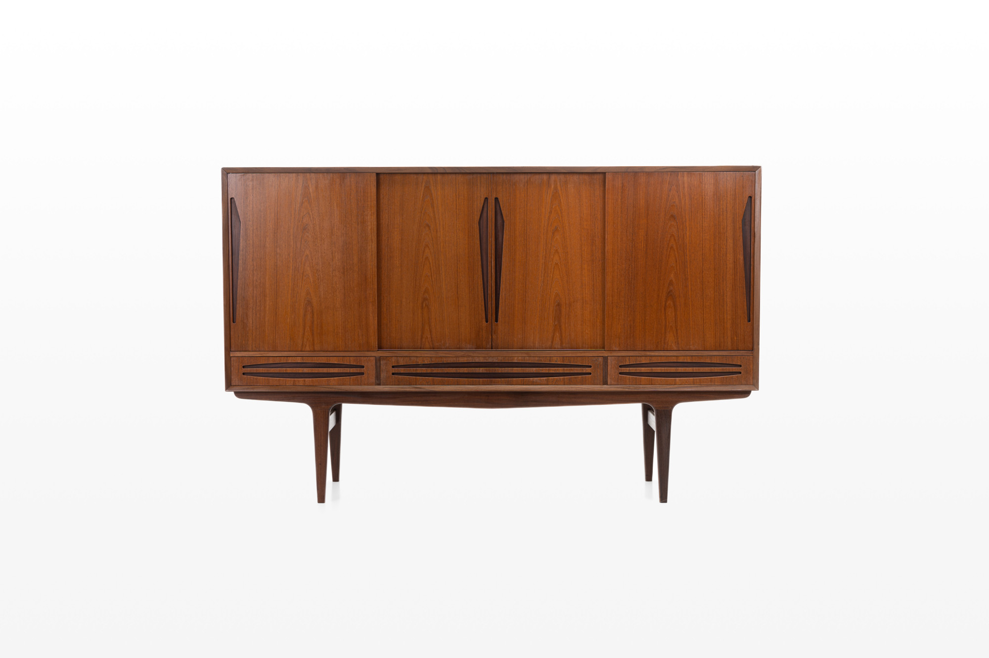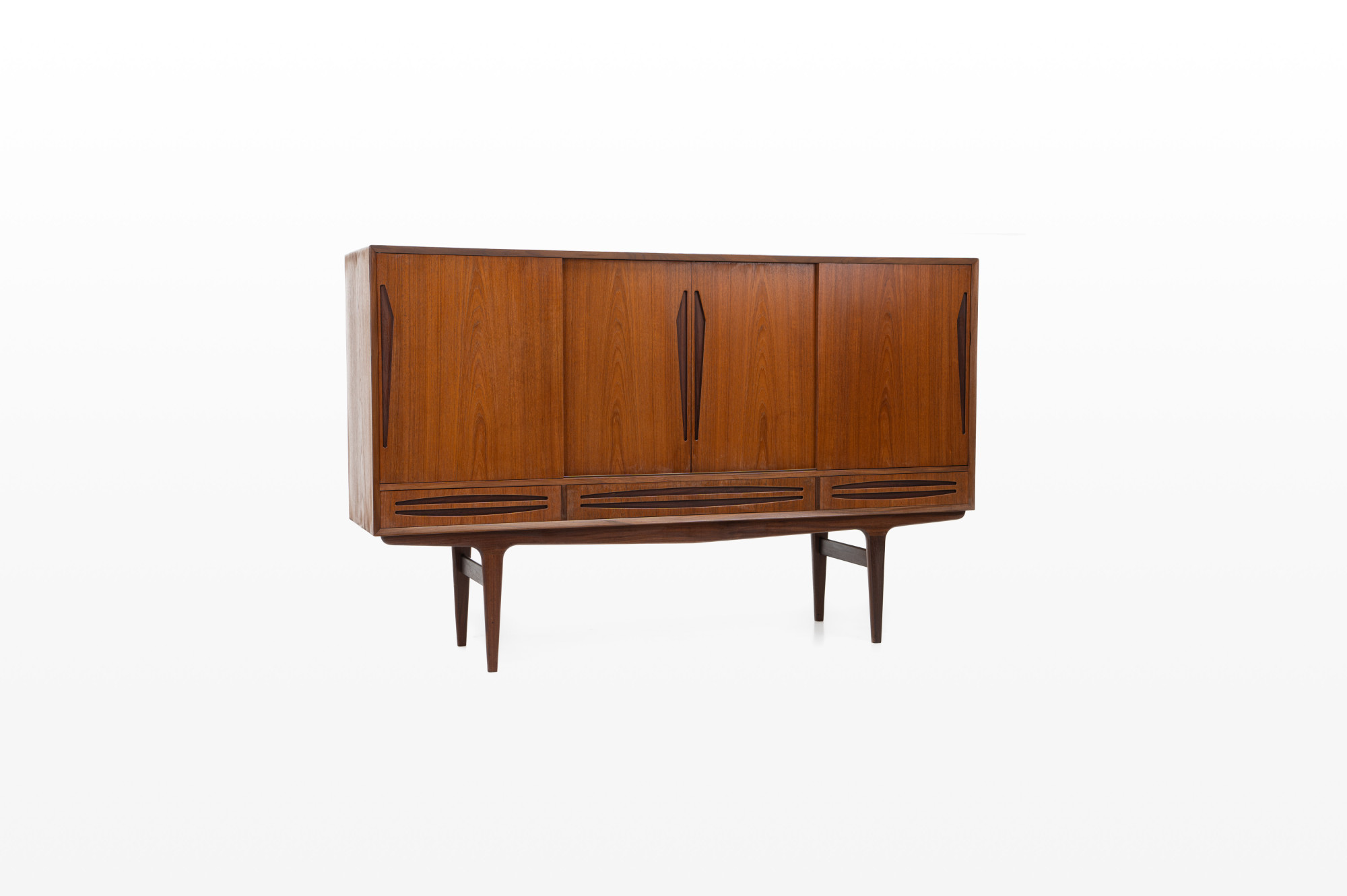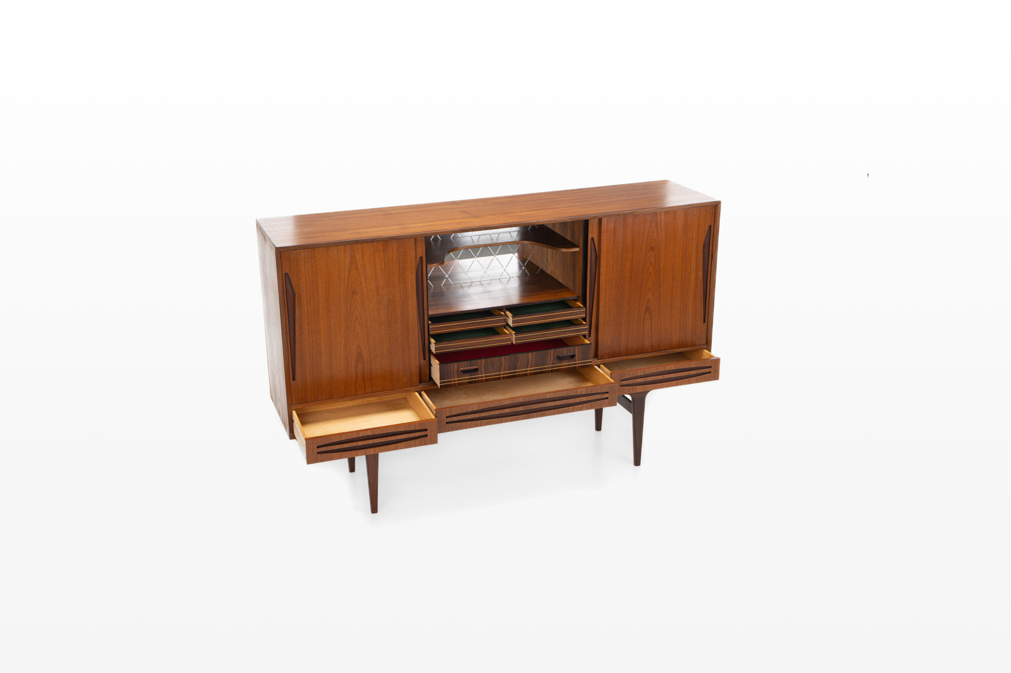 Danish vintage sideboard in teak and rosewood. This sideboard is in very good condition and has lots of storage space. There are four sliding doors, 3 drawers and a bar area.