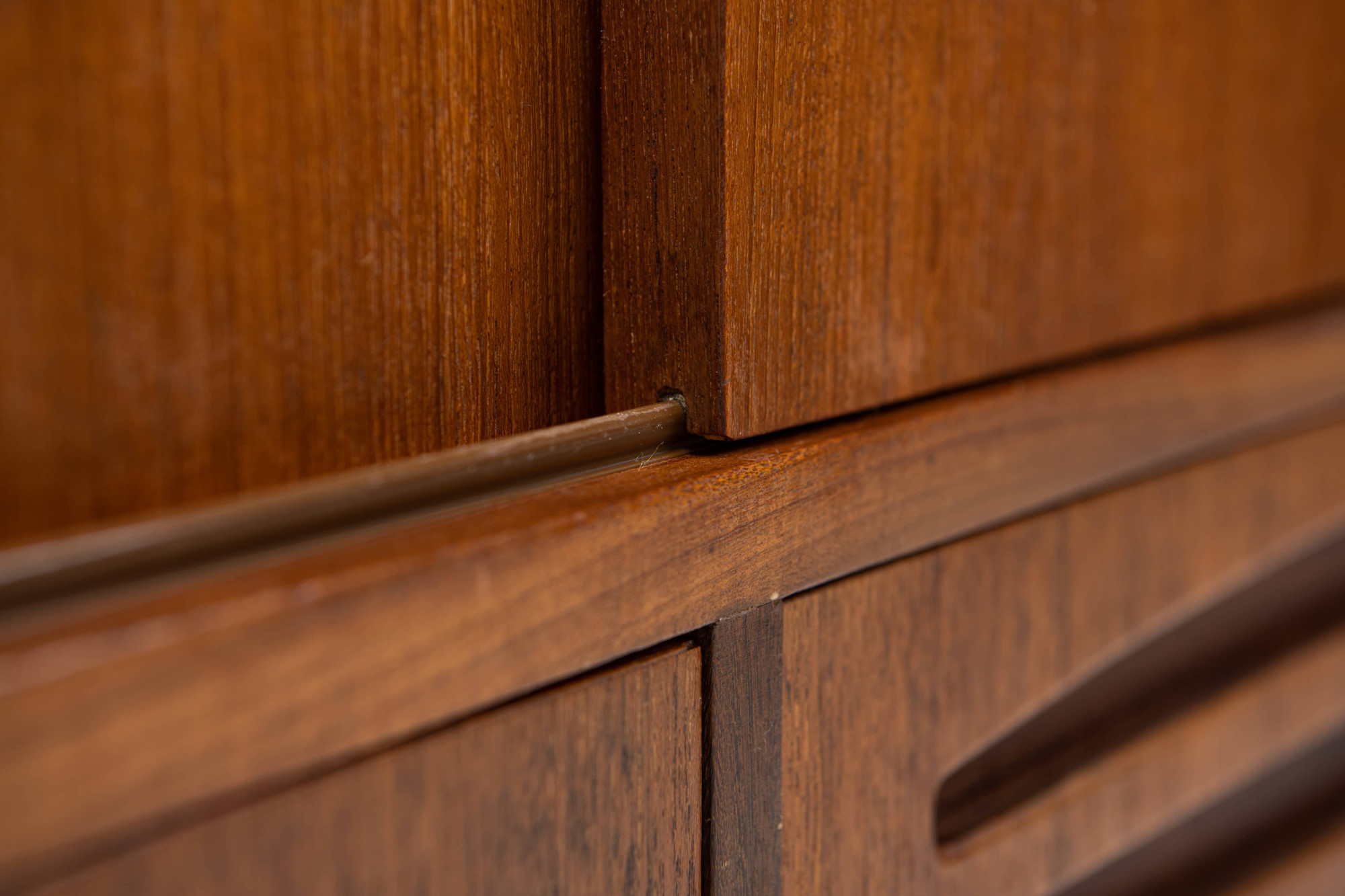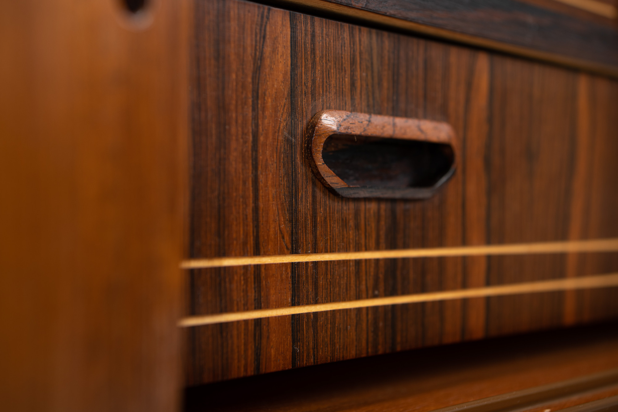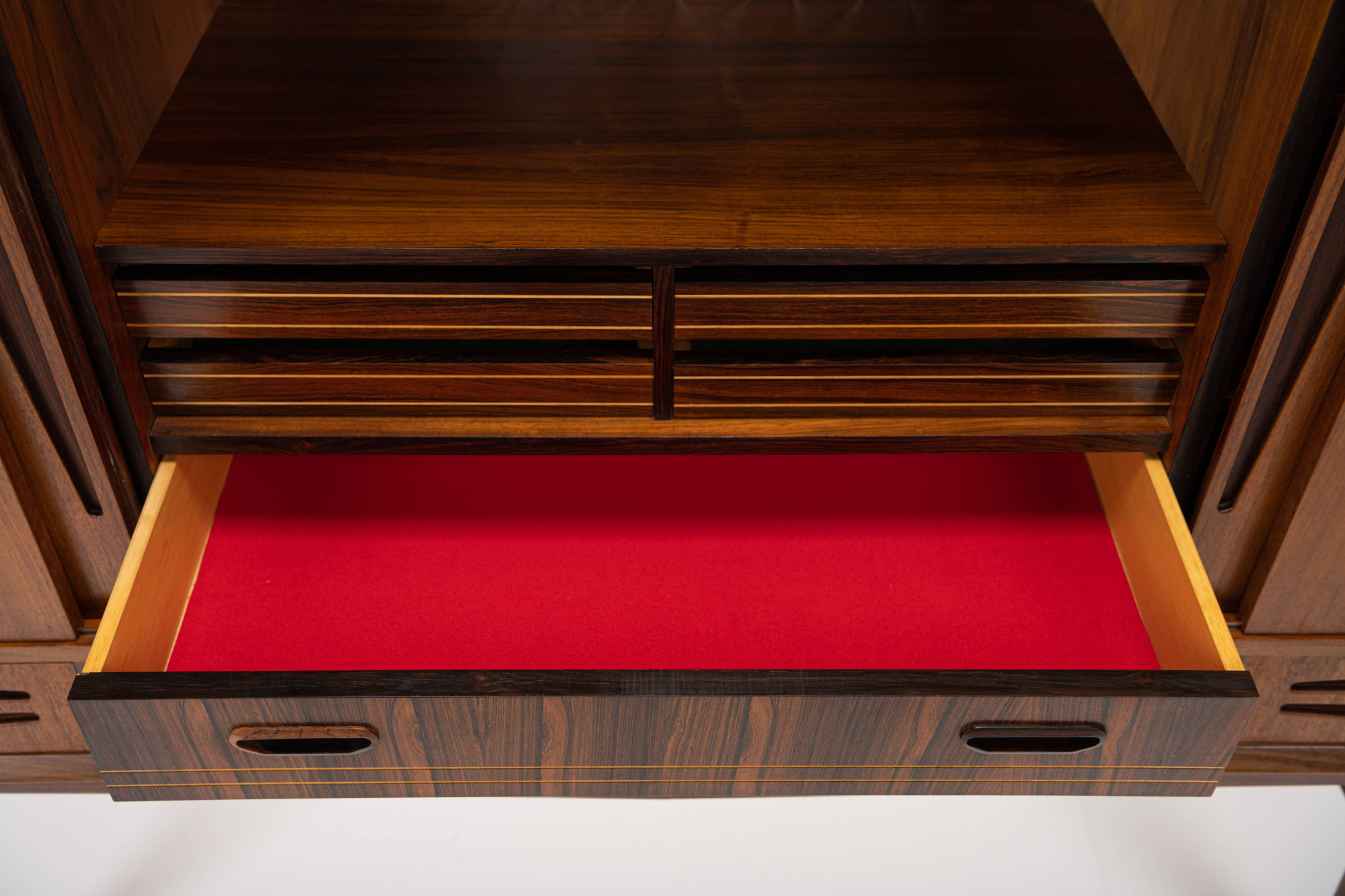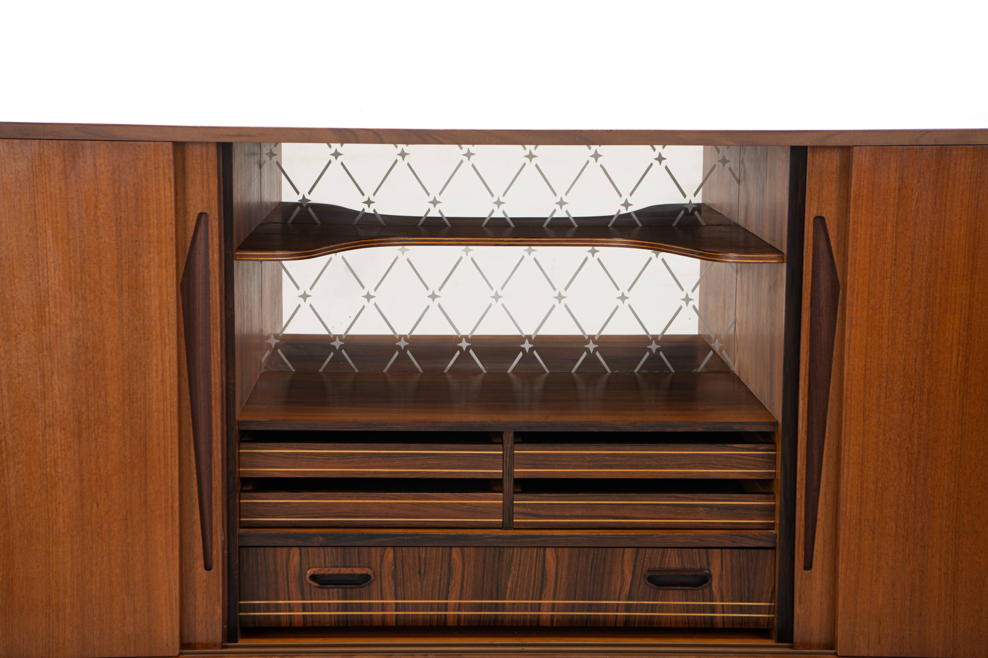 Danish vintage sideboard in teak and rosewood. This sideboard is in very good condition and has lots of storage space. There are four sliding doors, 3 drawers and a bar area.