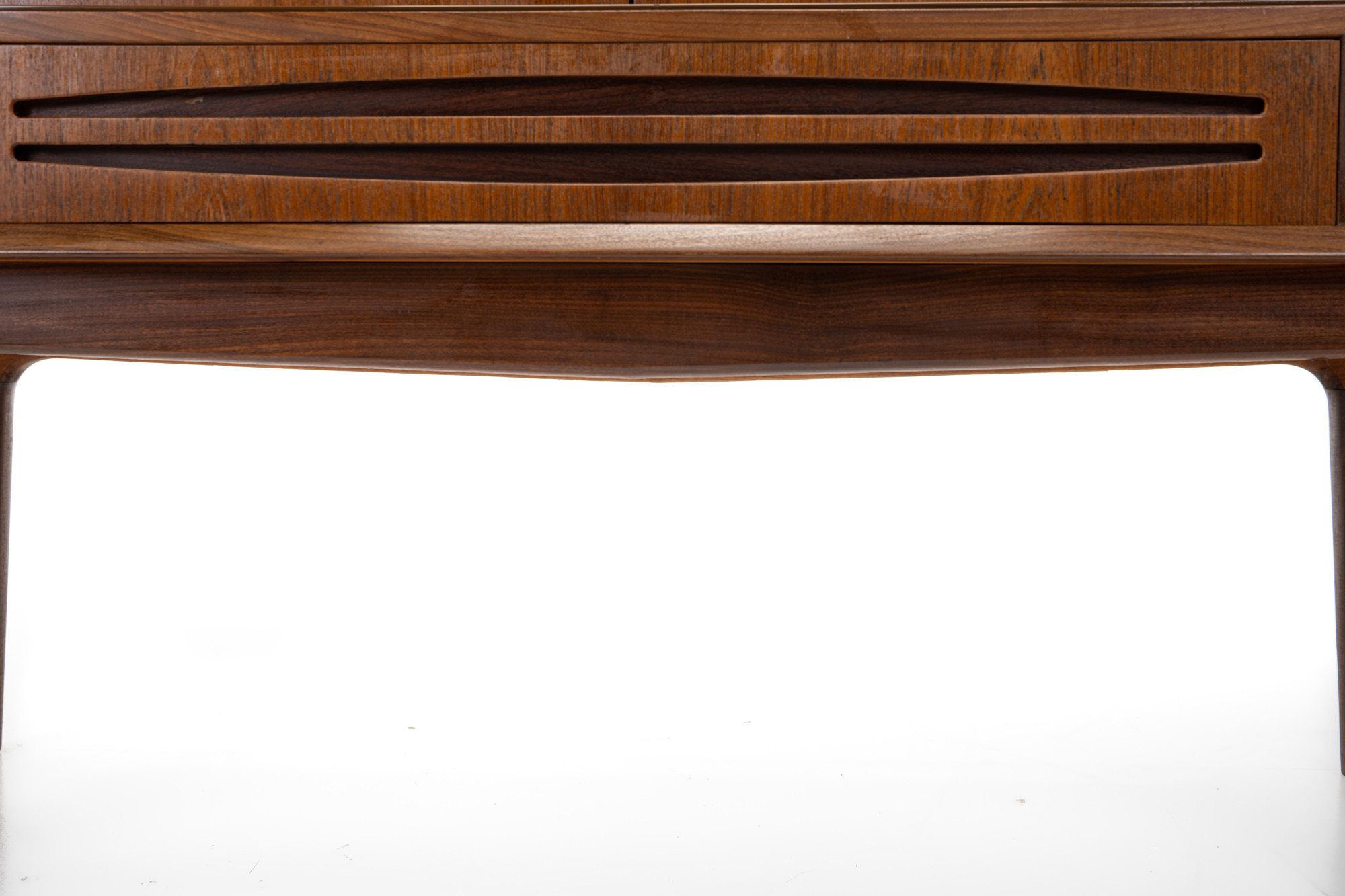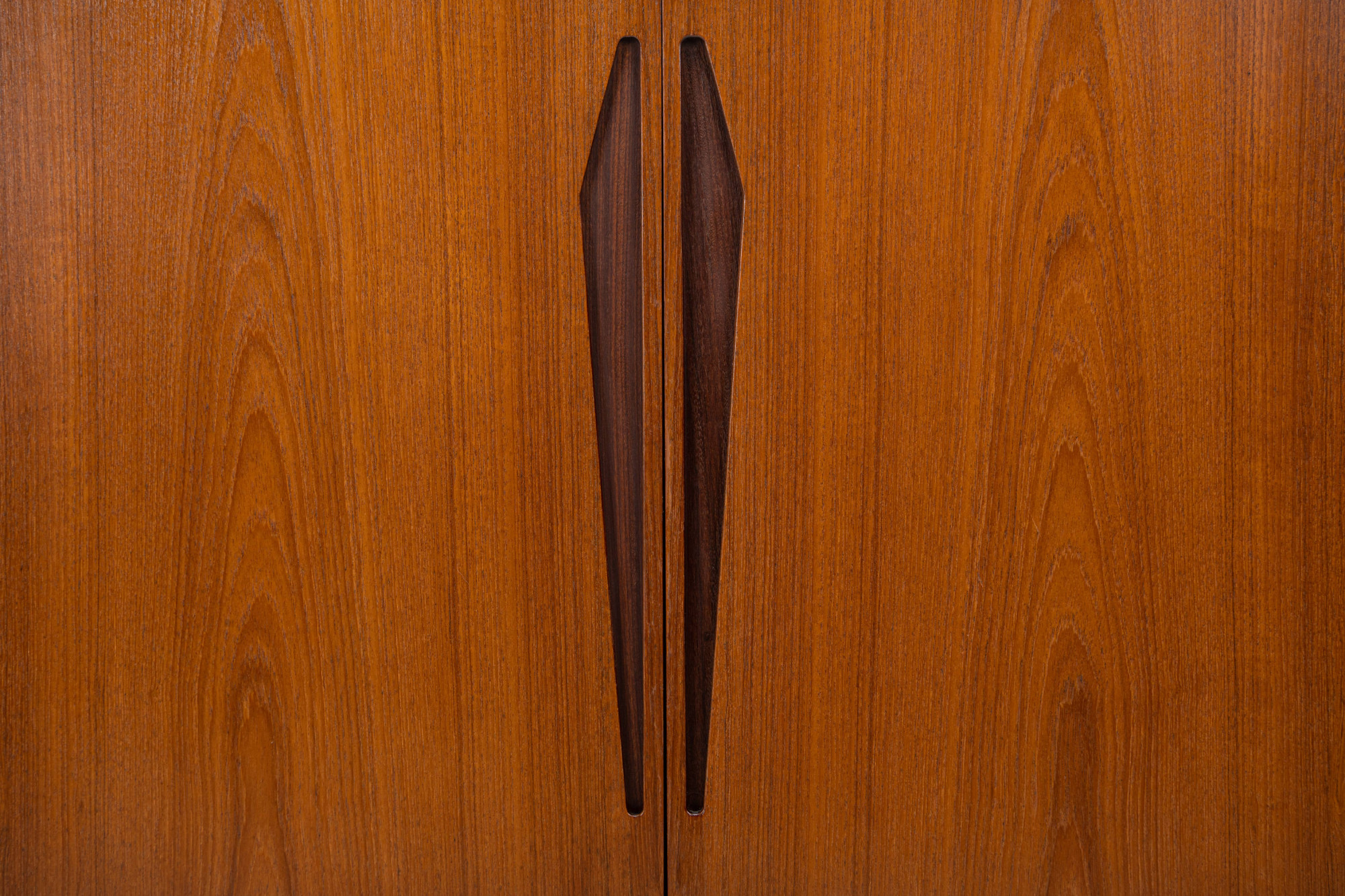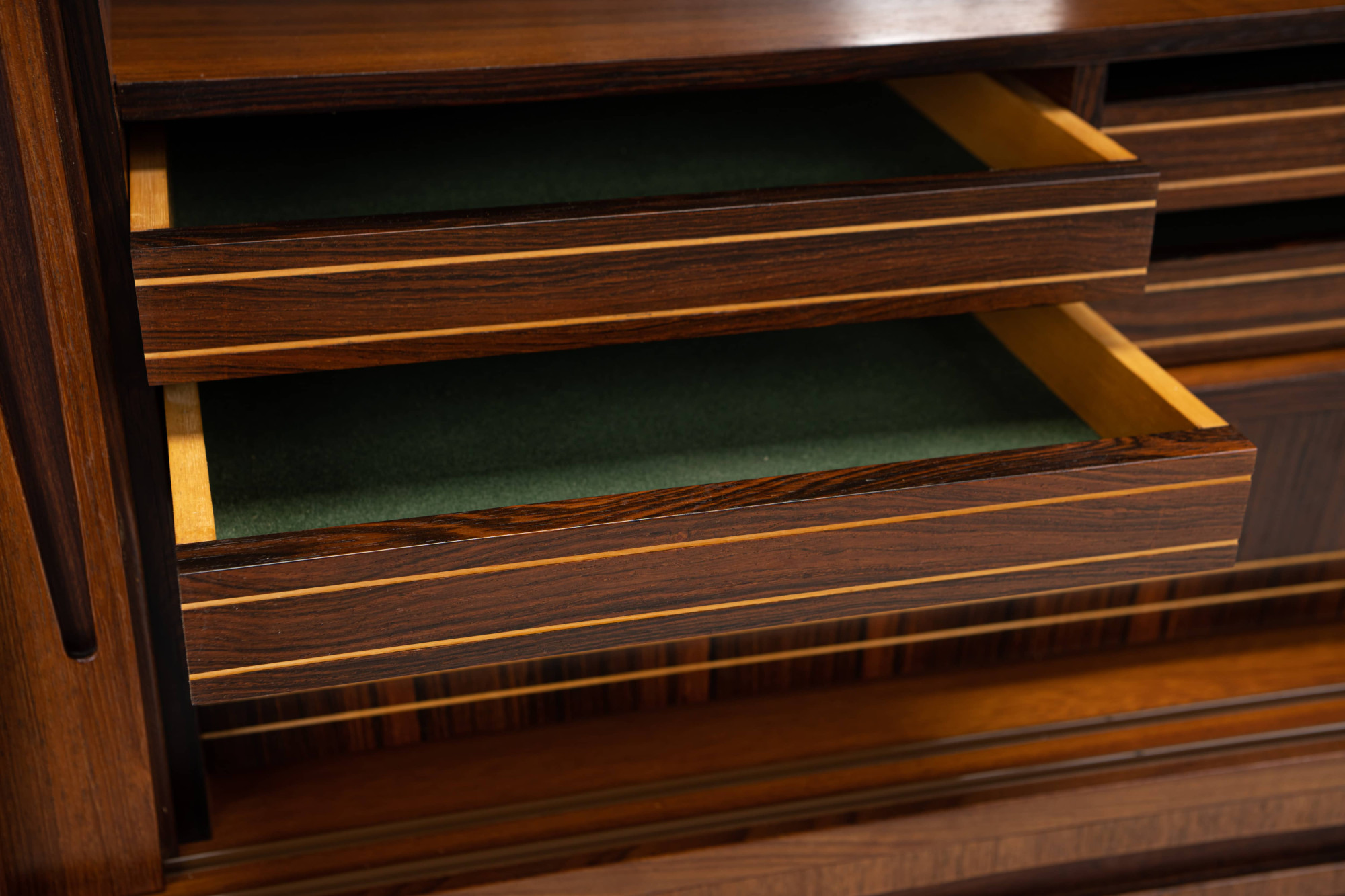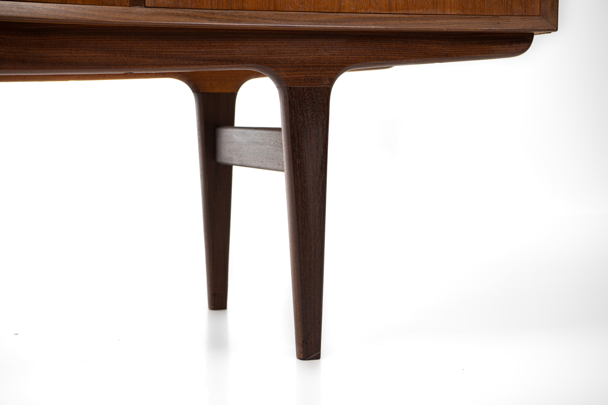 Danish vintage sideboard in teak and rosewood. This sideboard is in very good condition and has lots of storage space. There are four sliding doors, 3 drawers and a bar area.
