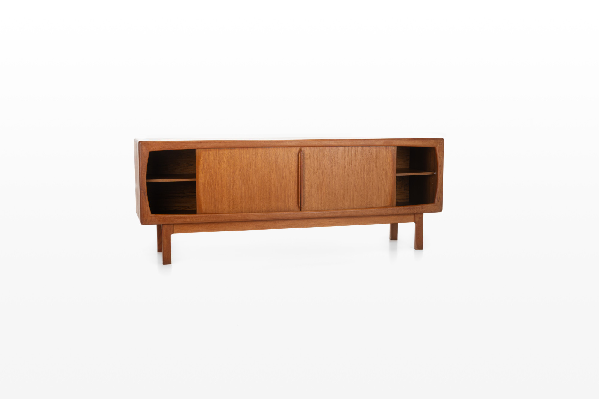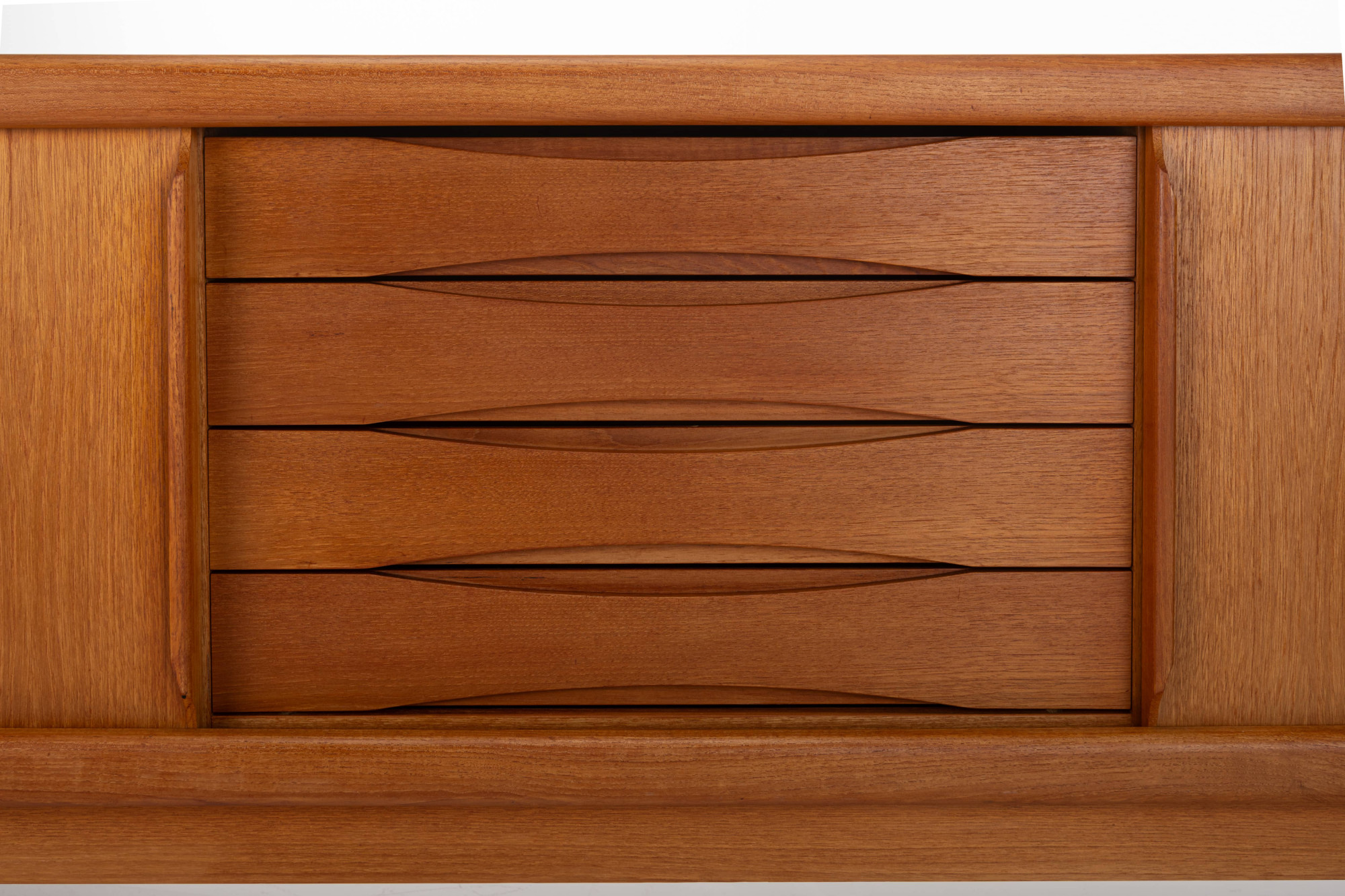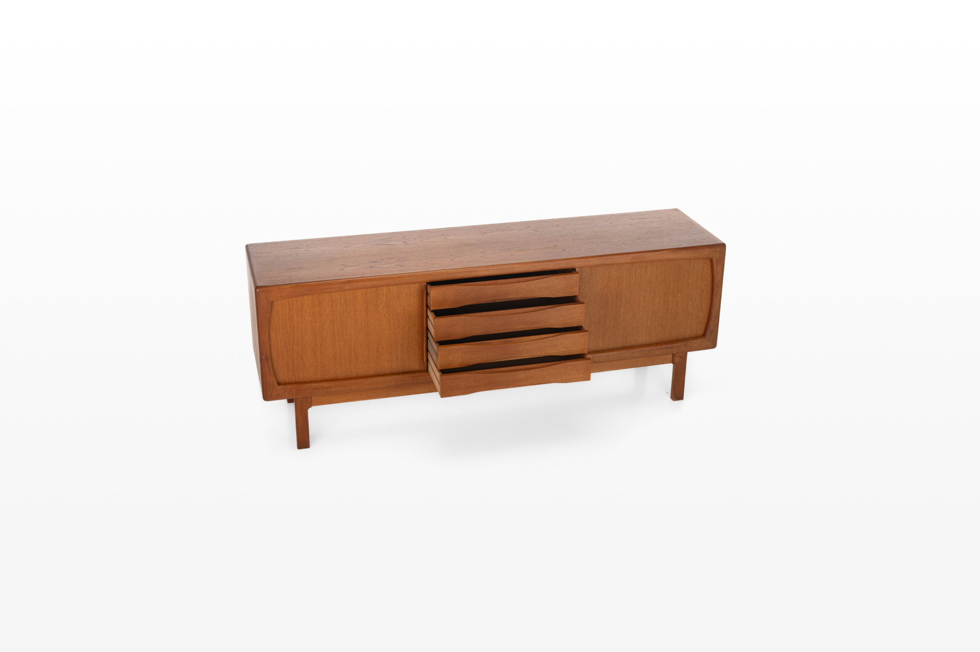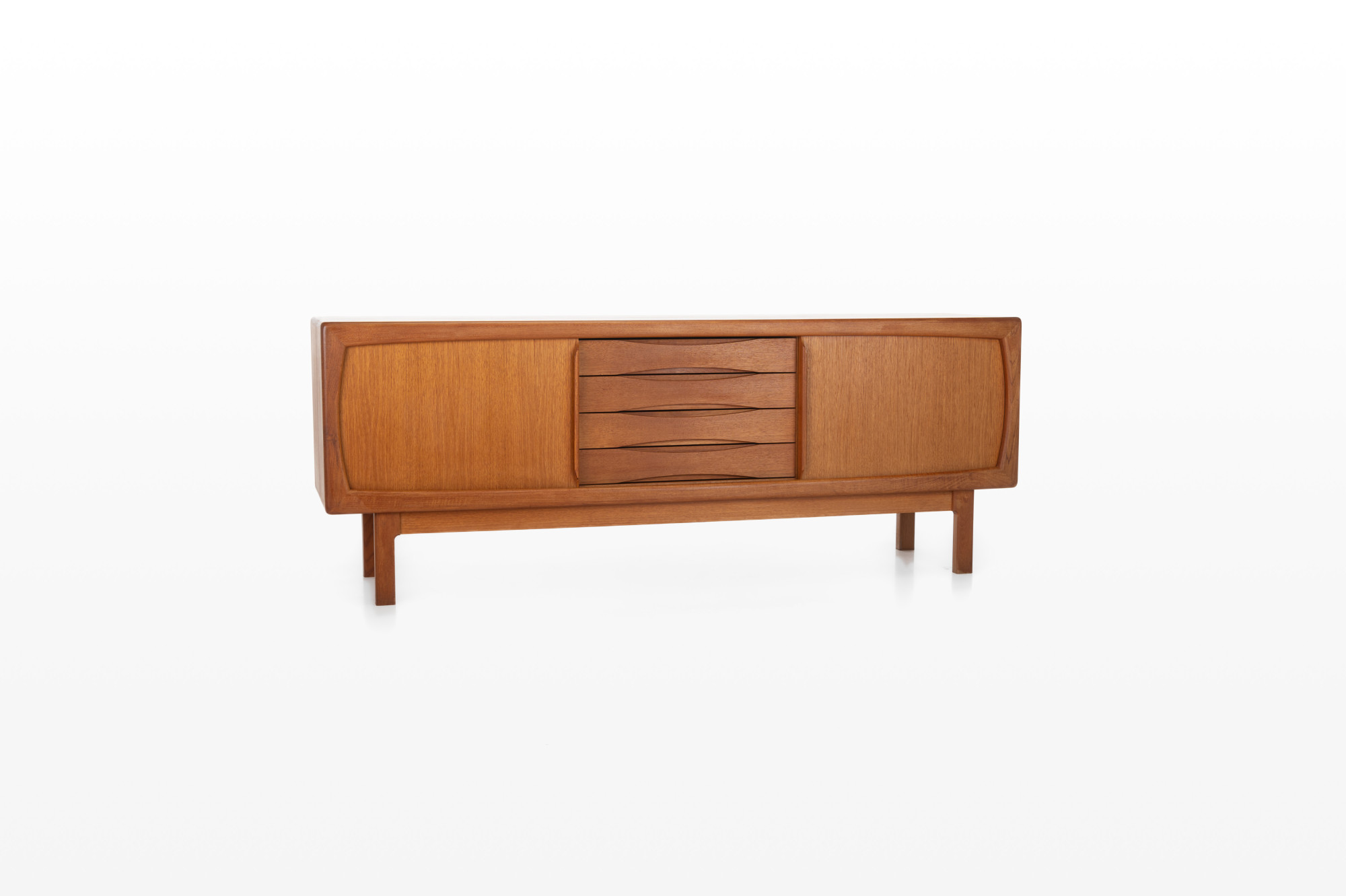 This Scandinavian vintage sideboard in teak is manufactured by Dyrlund in Denmark. It has two sliding doors, four drawers and remains in very good condition.