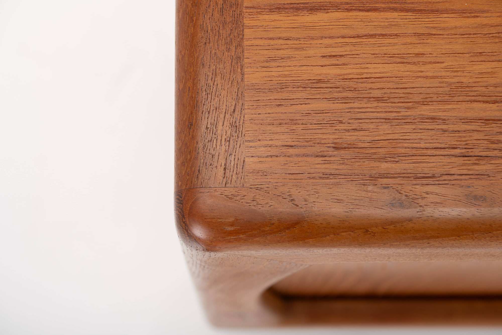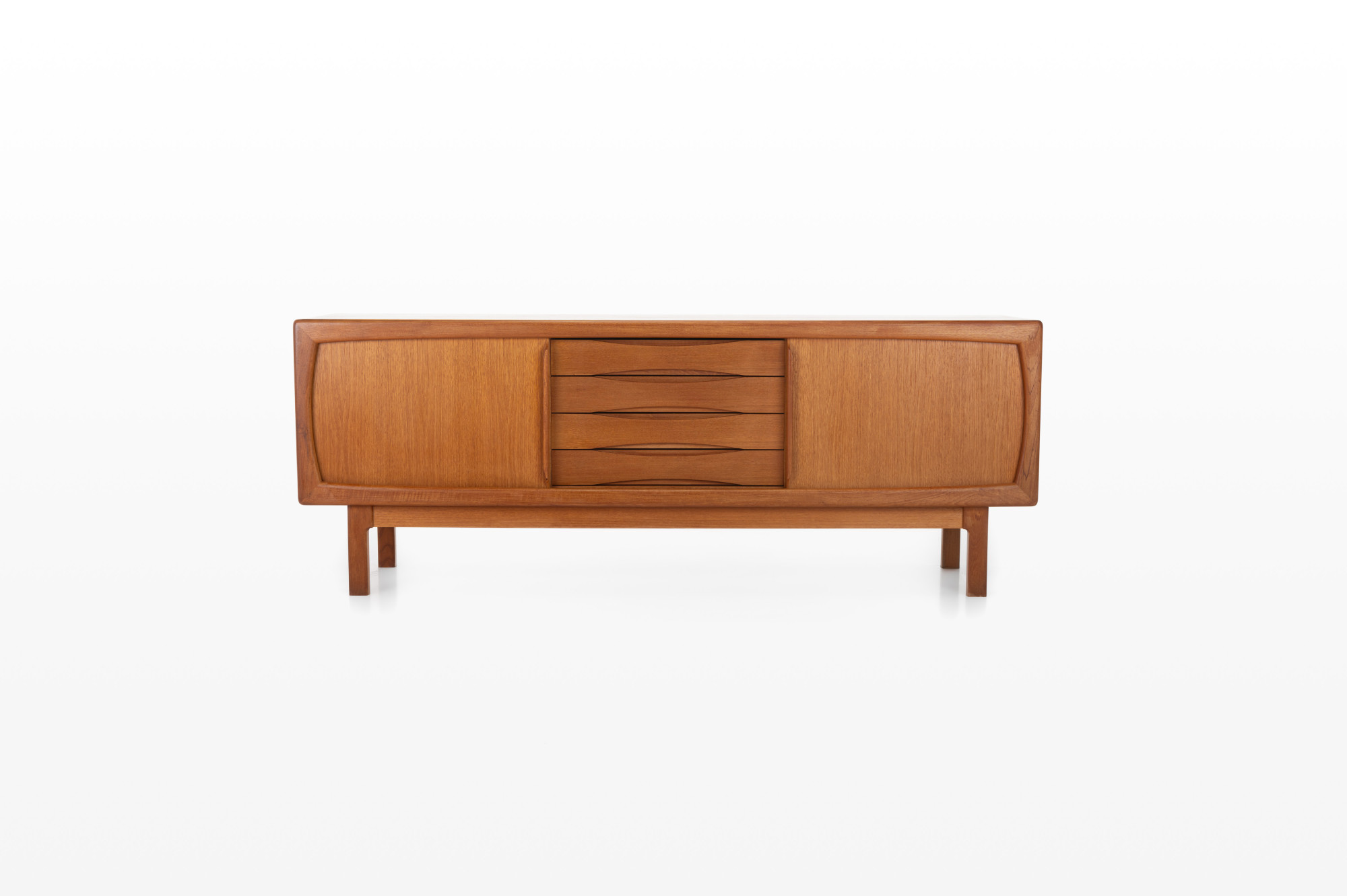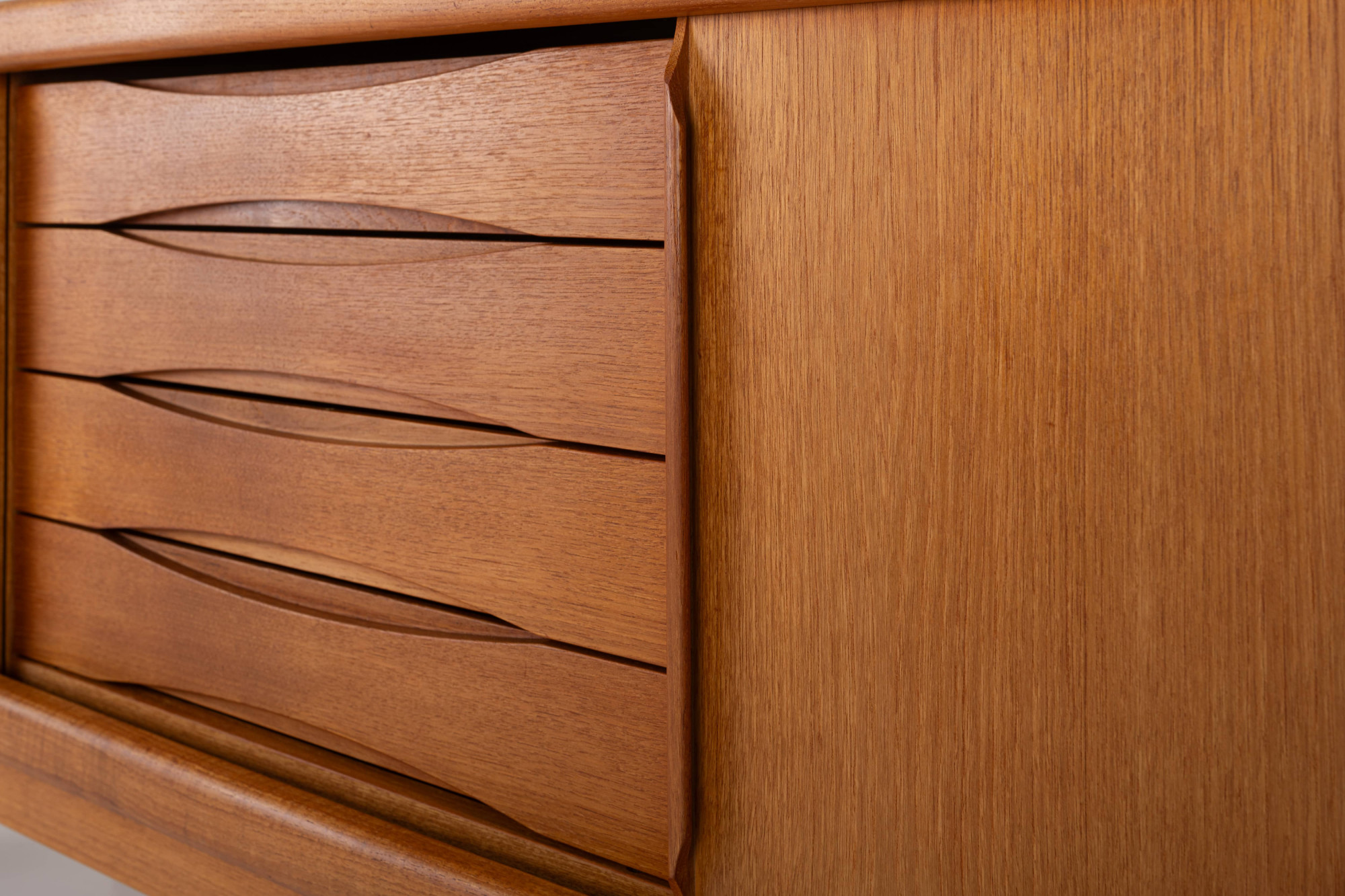 This Scandinavian vintage sideboard in teak is manufactured by Dyrlund in Denmark. It has two sliding doors, four drawers and remains in very good condition.