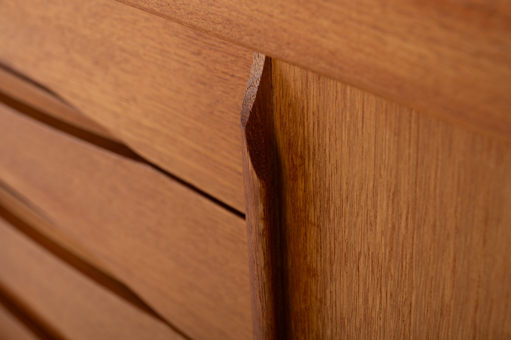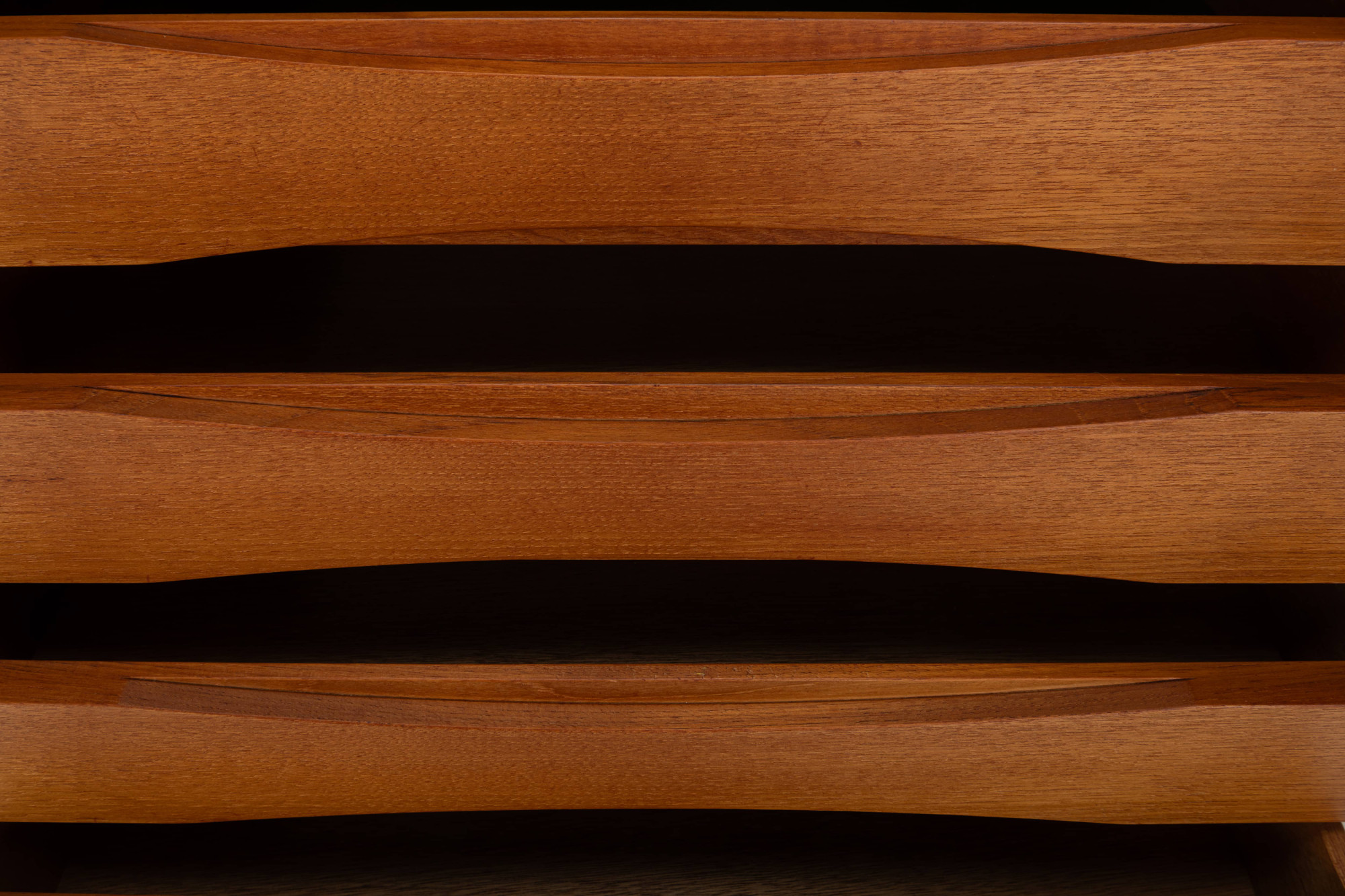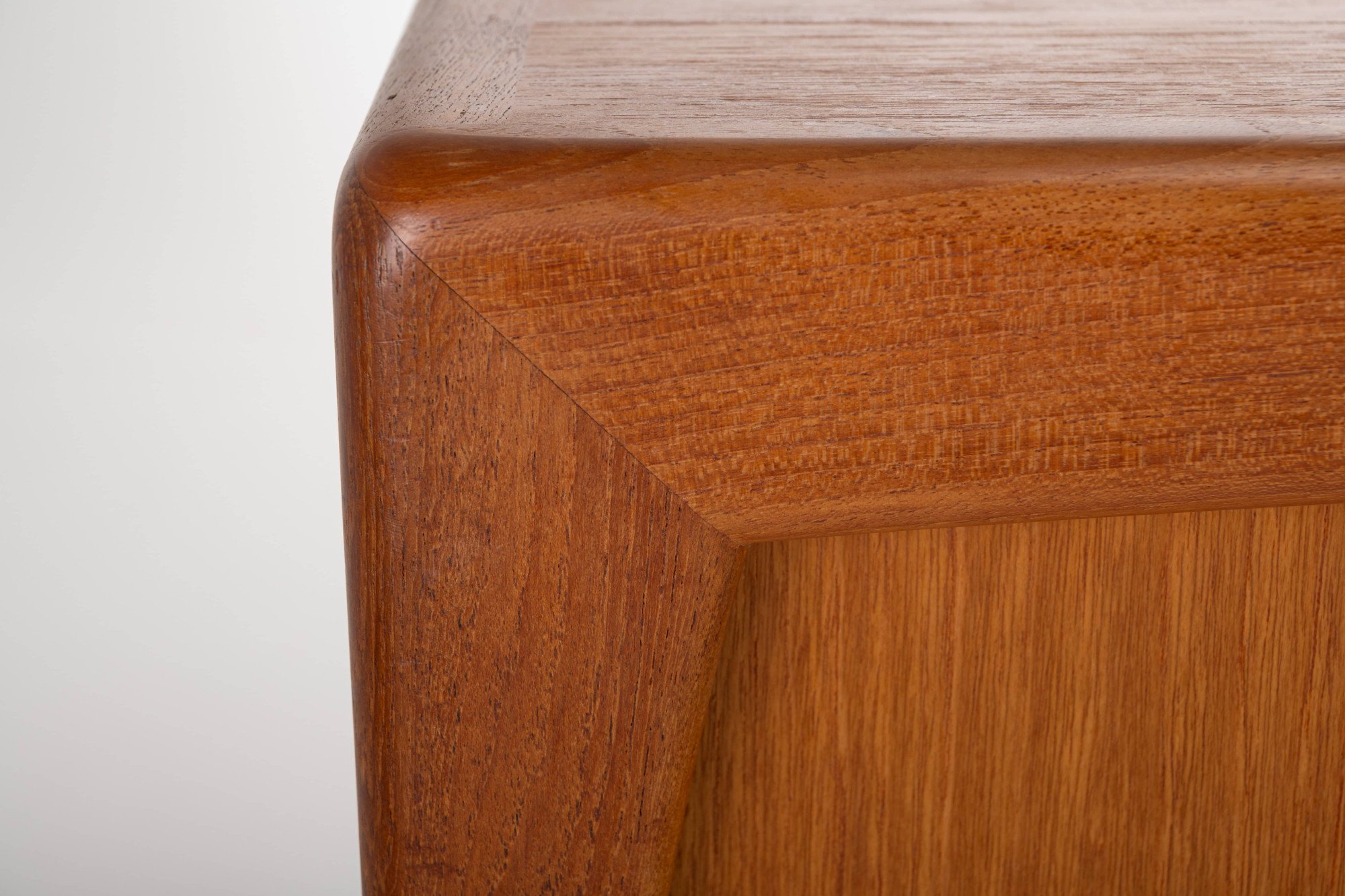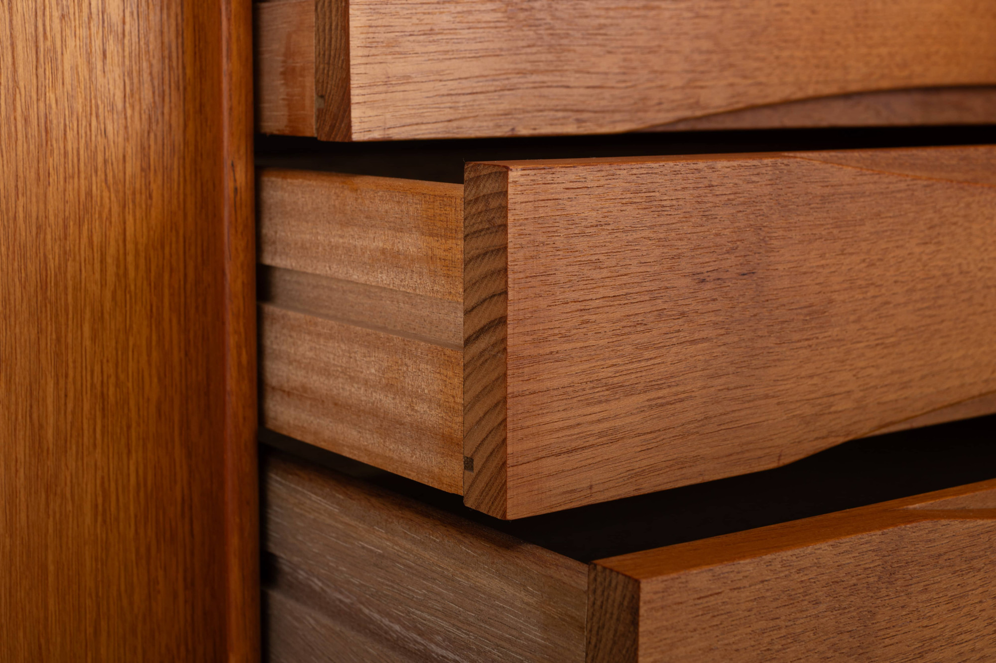 This Scandinavian vintage sideboard in teak is manufactured by Dyrlund in Denmark. It has two sliding doors, four drawers and remains in very good condition.
