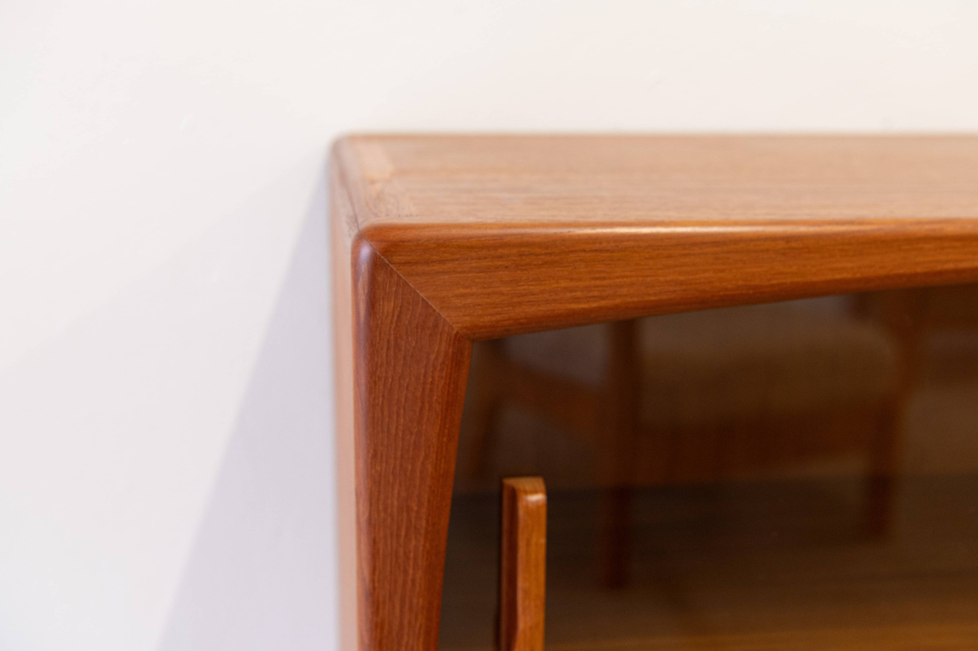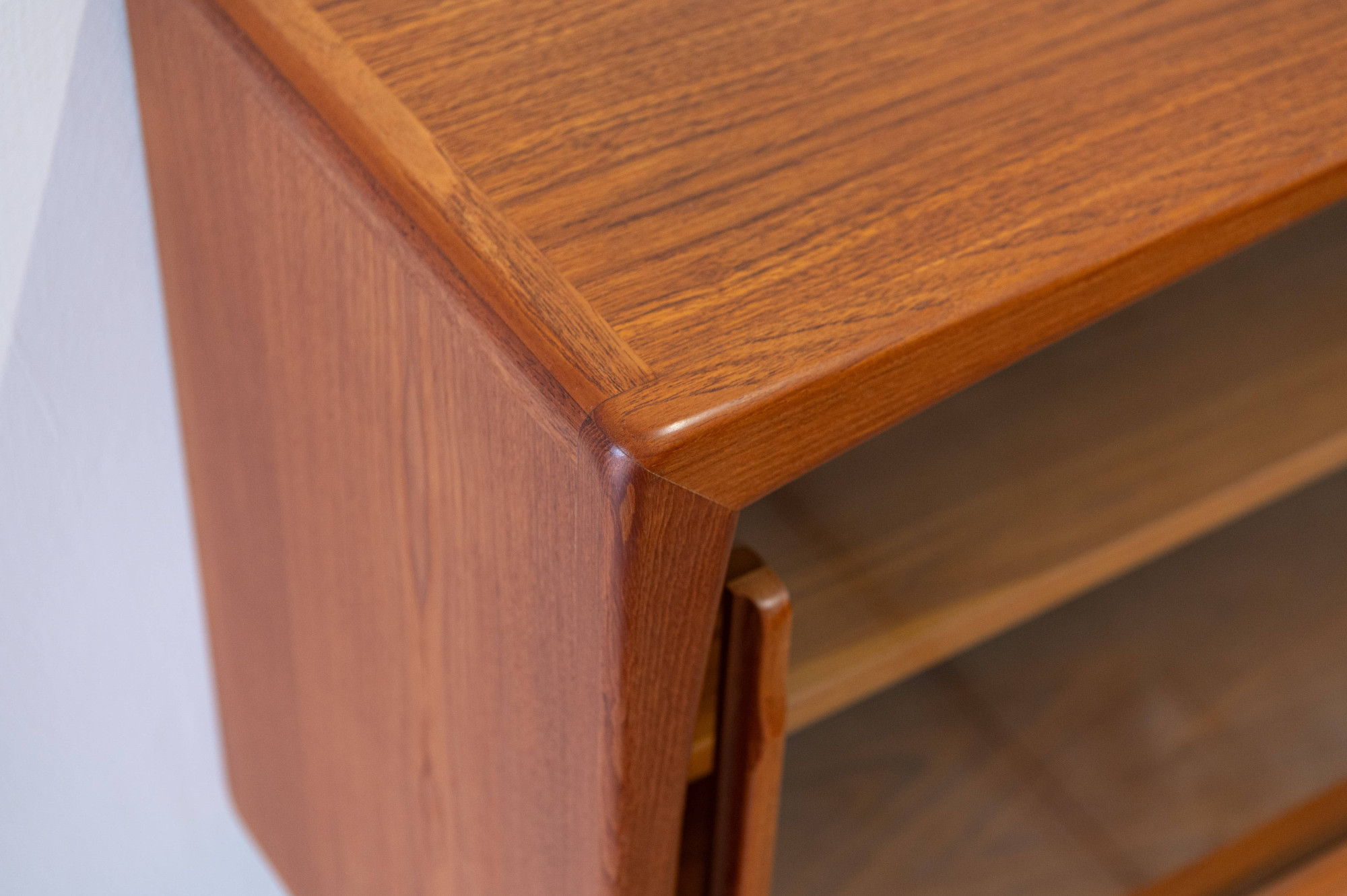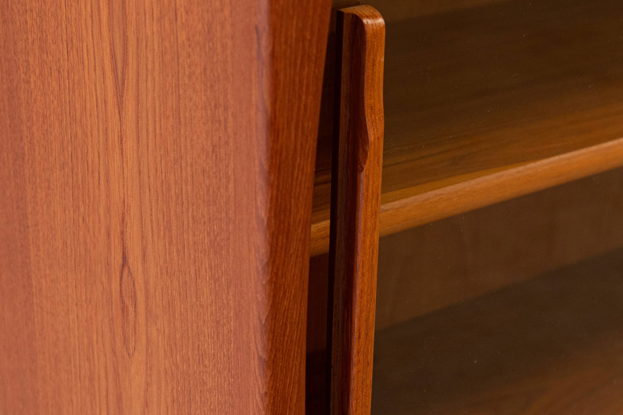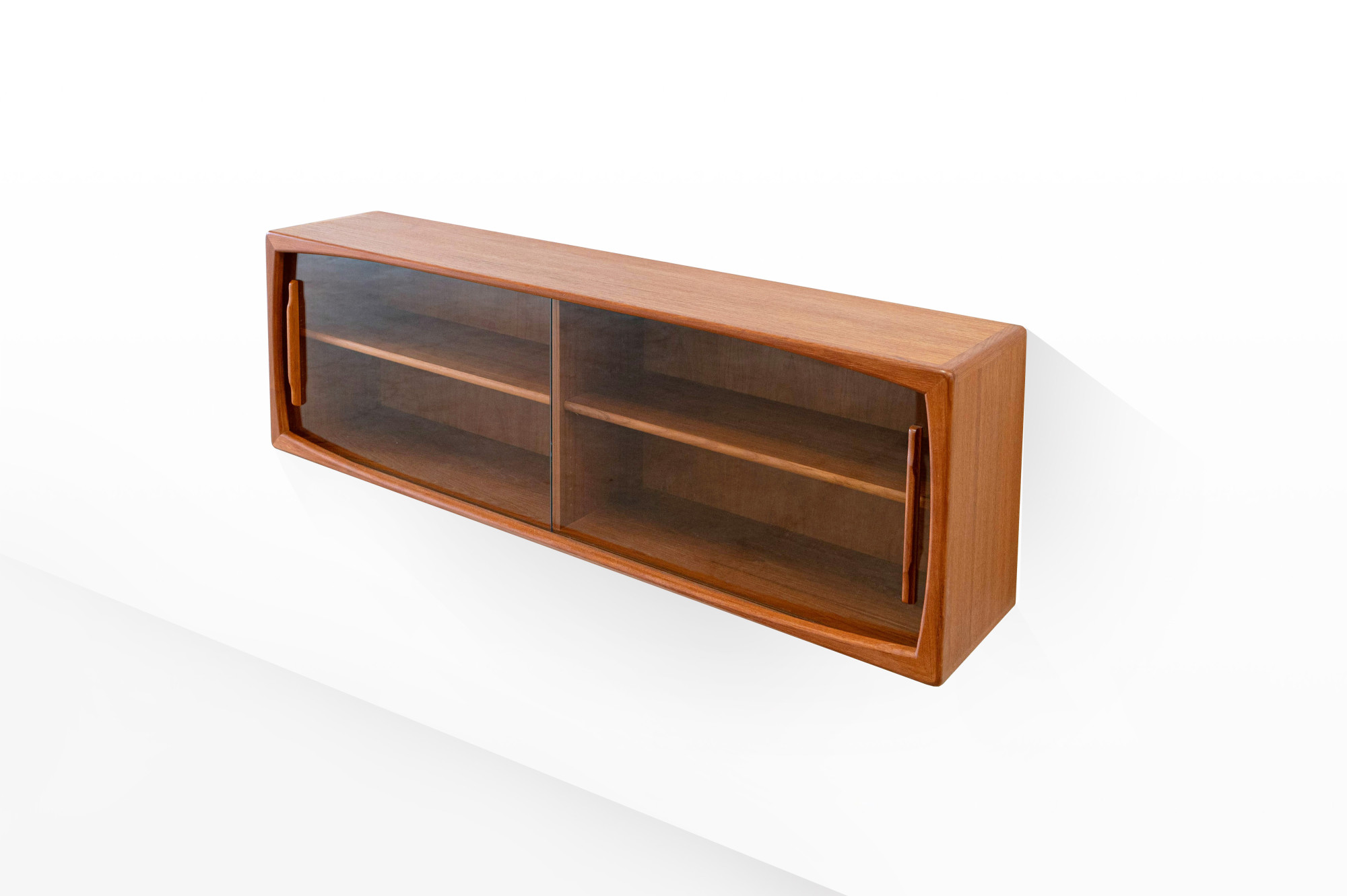 Floating display cabinet in teak. This sideboard has two glass doors with teak handles. The cabinet is easy to install on the wall and is in very good condition.