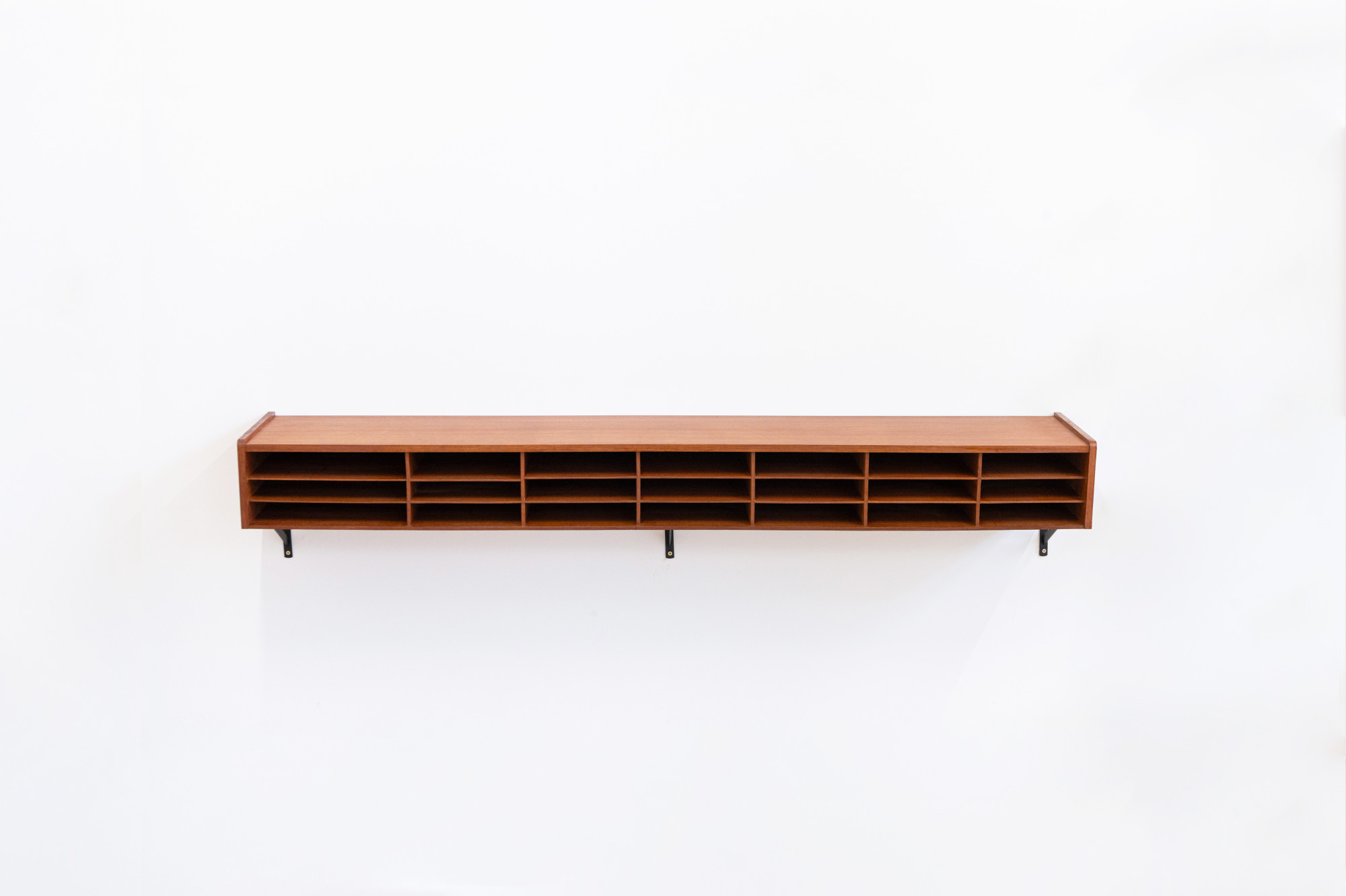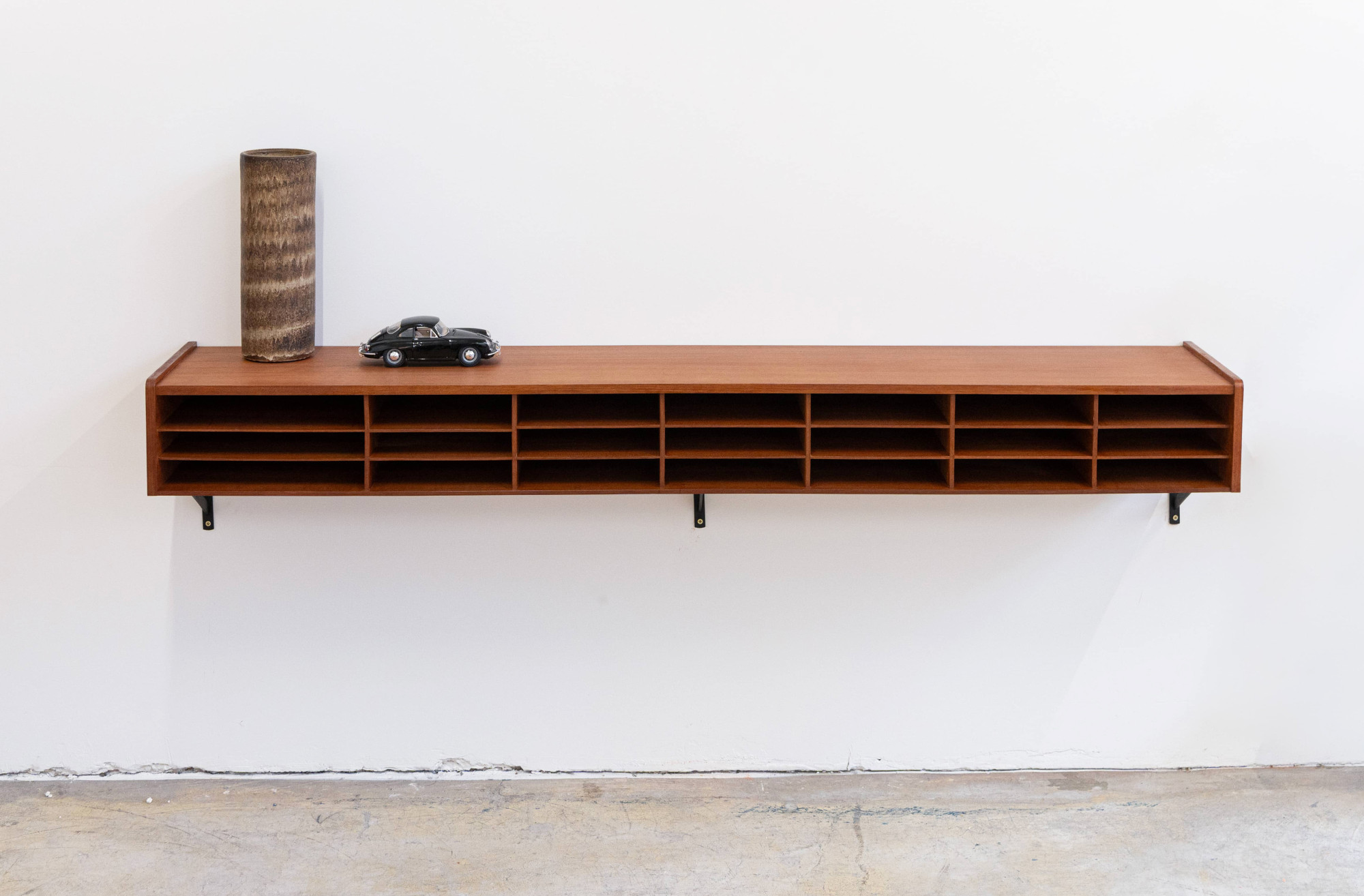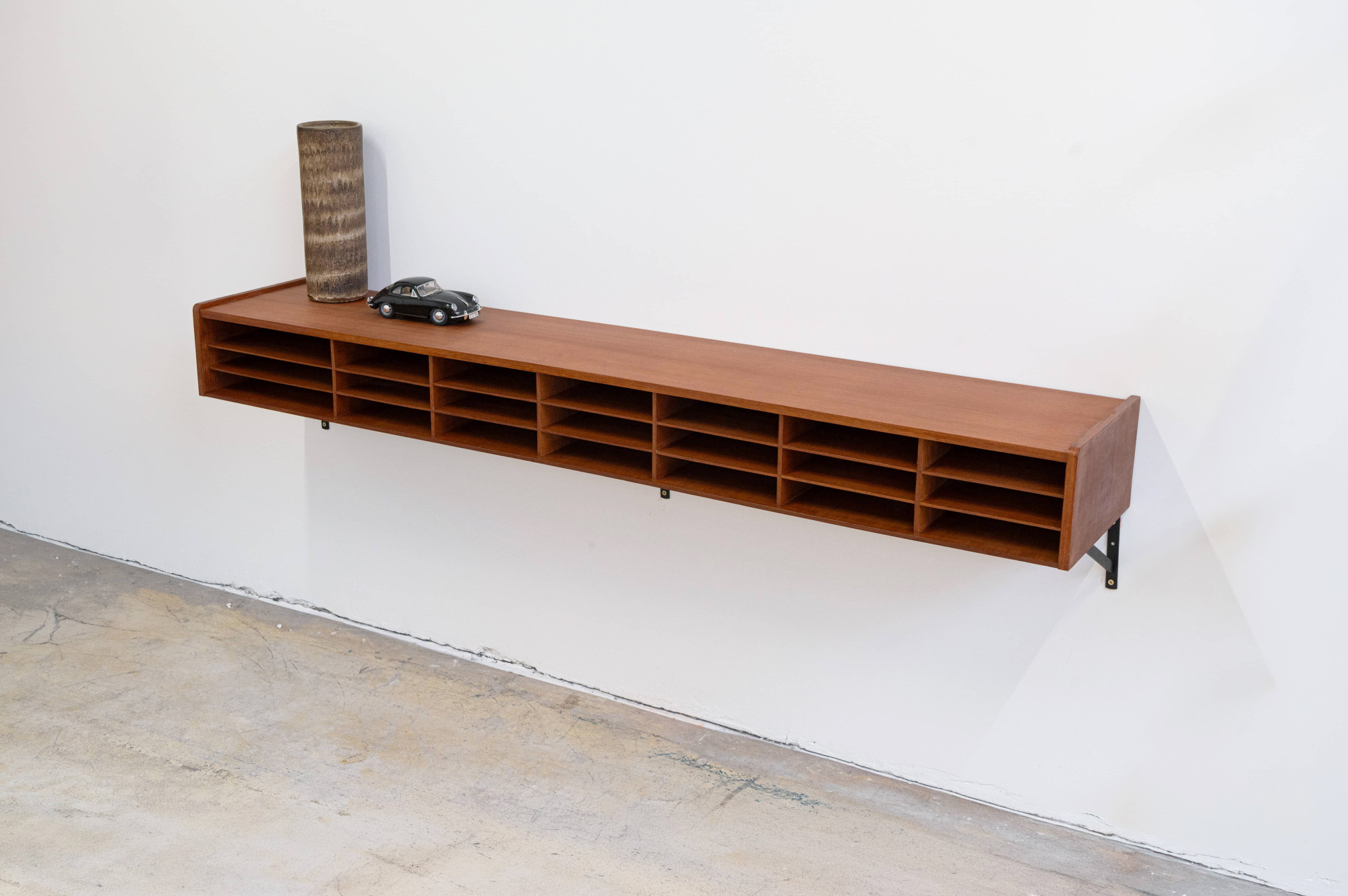 This floating teak sideboard features 21 compartments. The sideboard can be easily mounted to the wall.