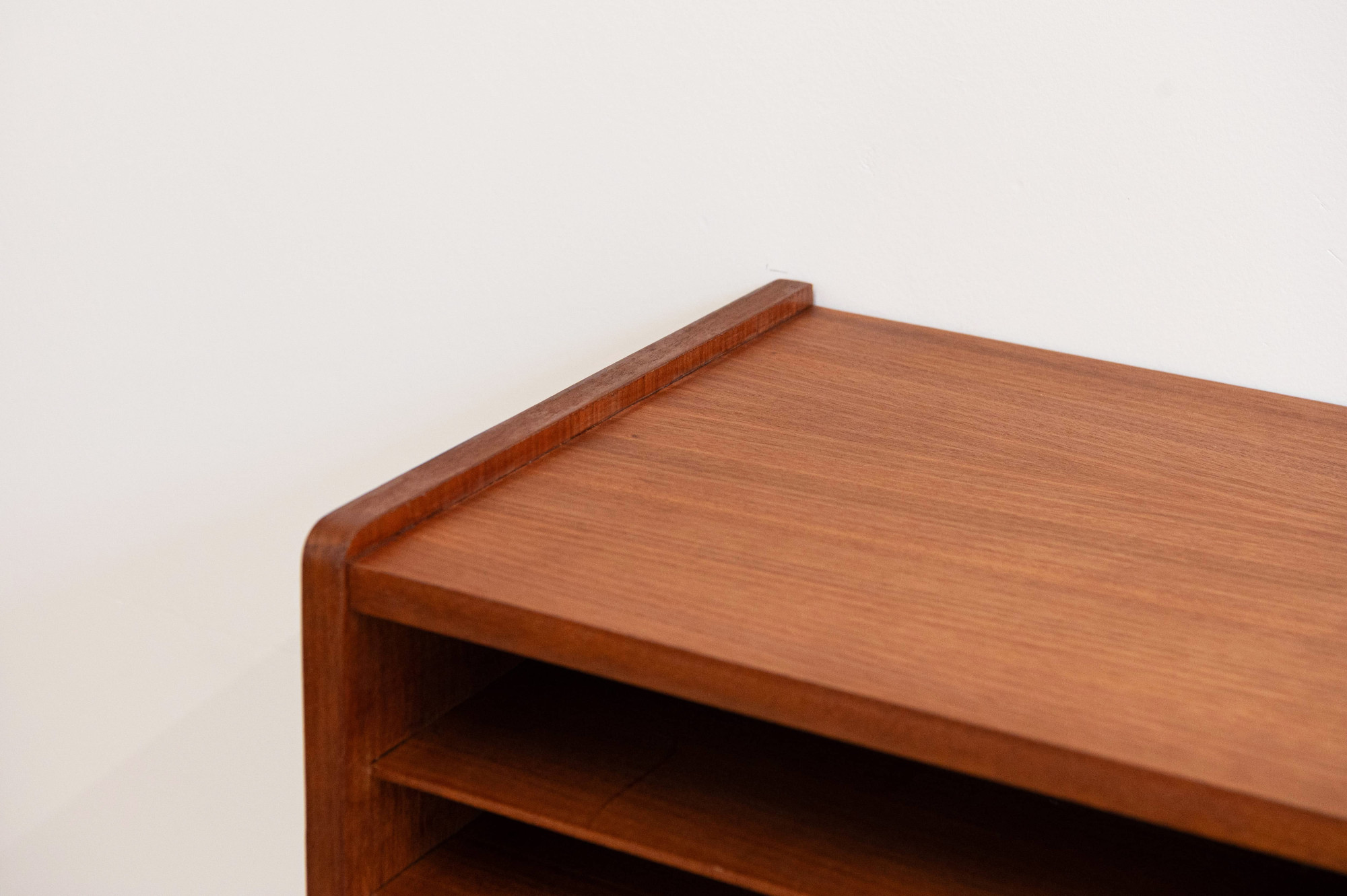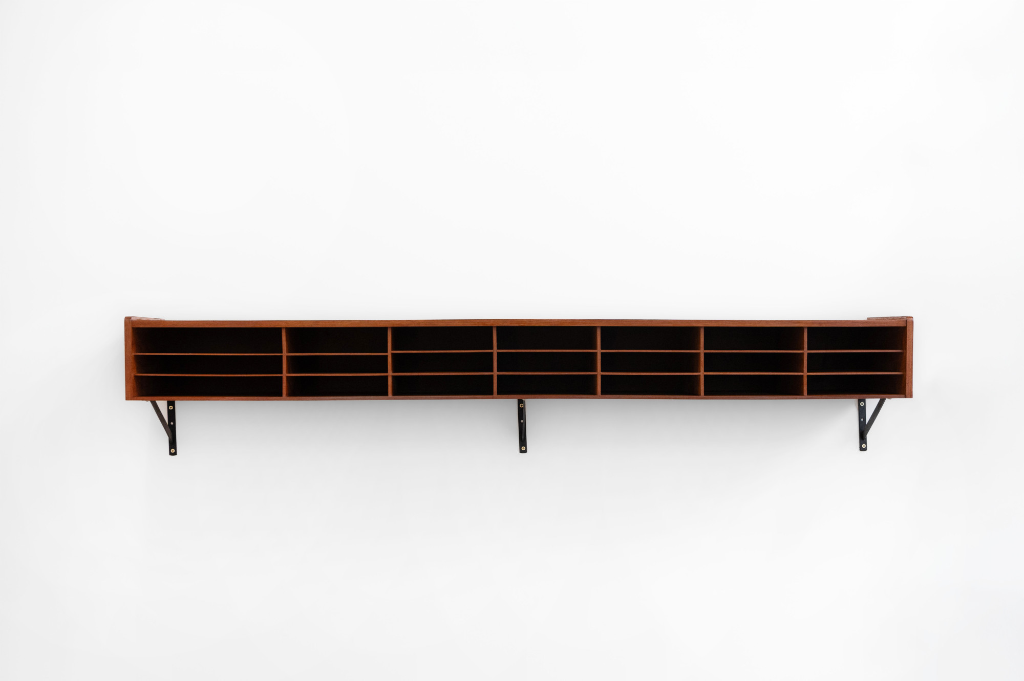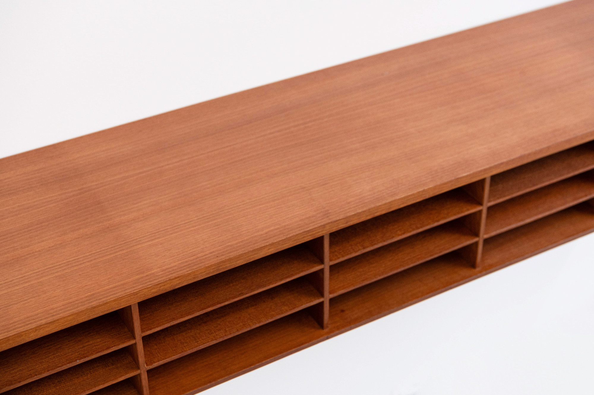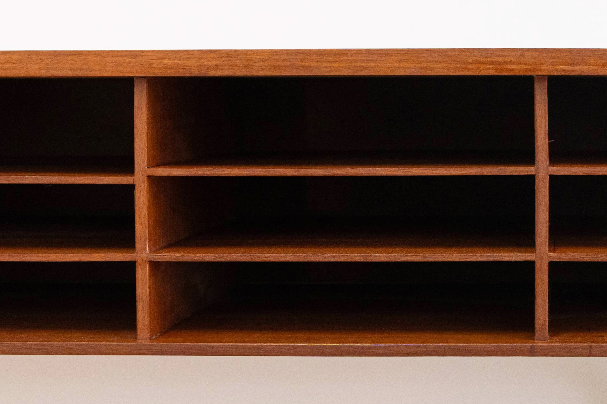 This floating teak sideboard features 21 compartments. The sideboard can be easily mounted to the wall.