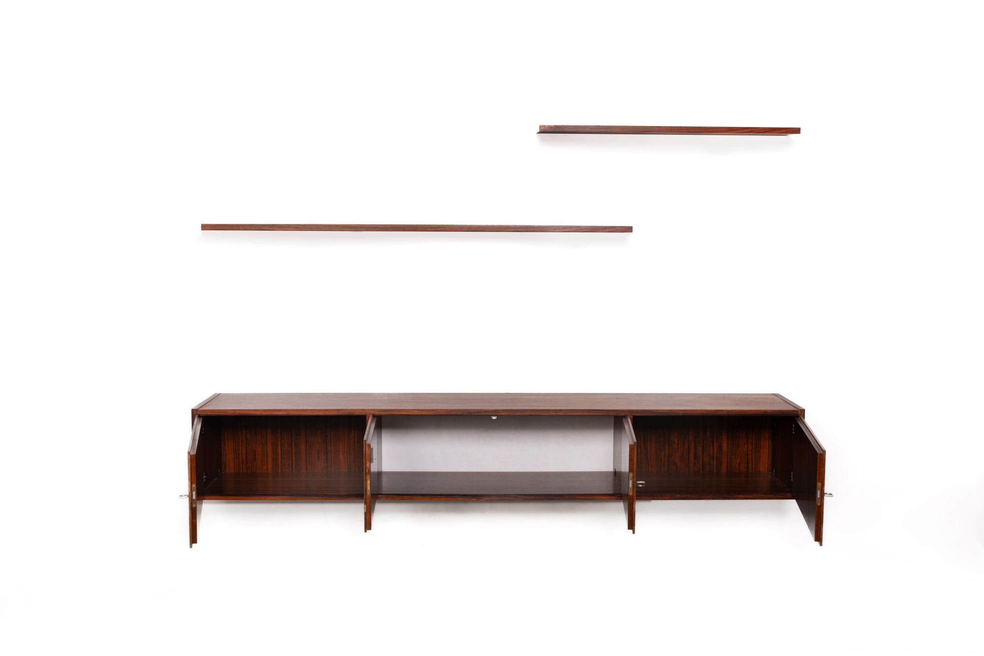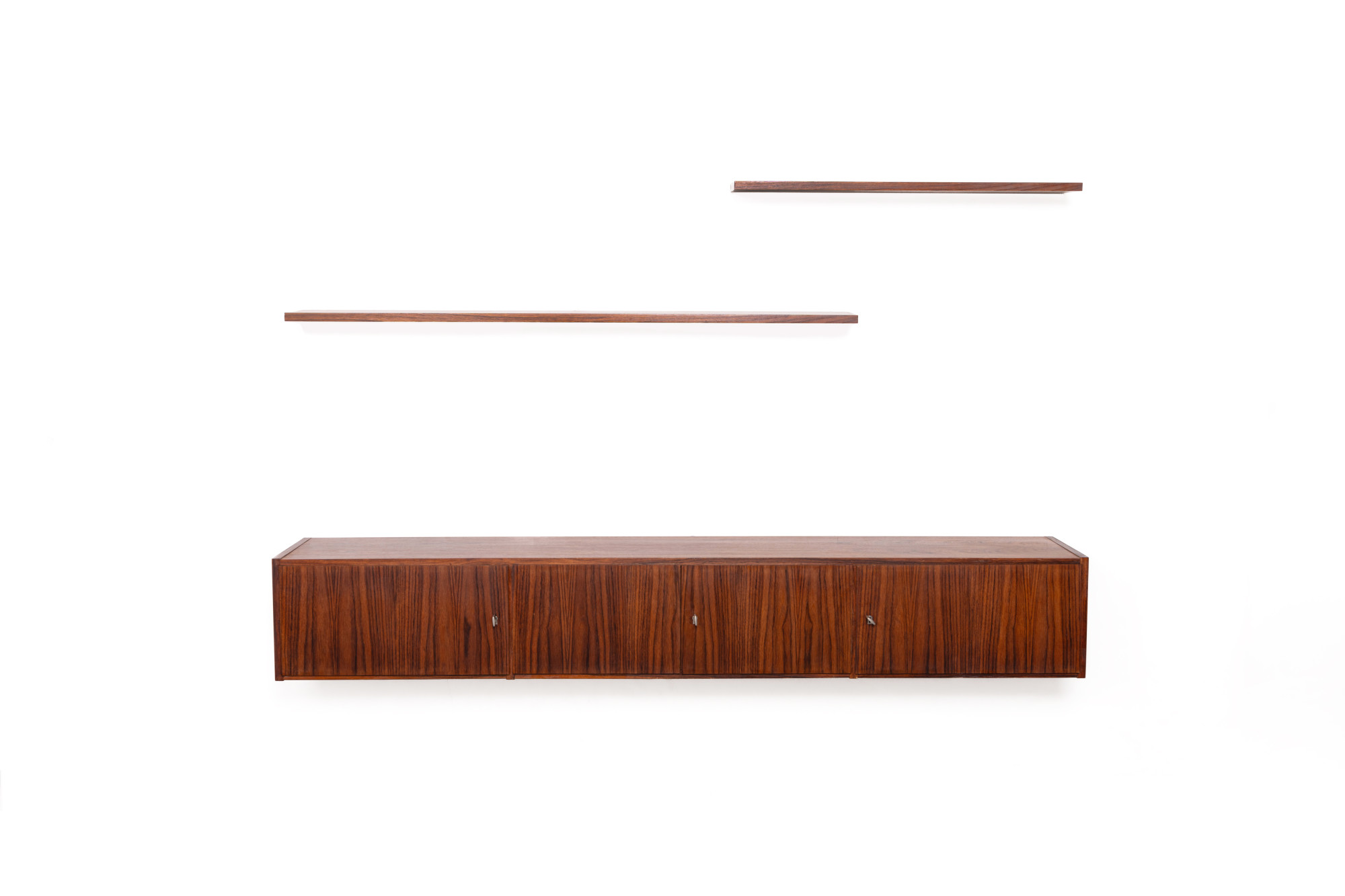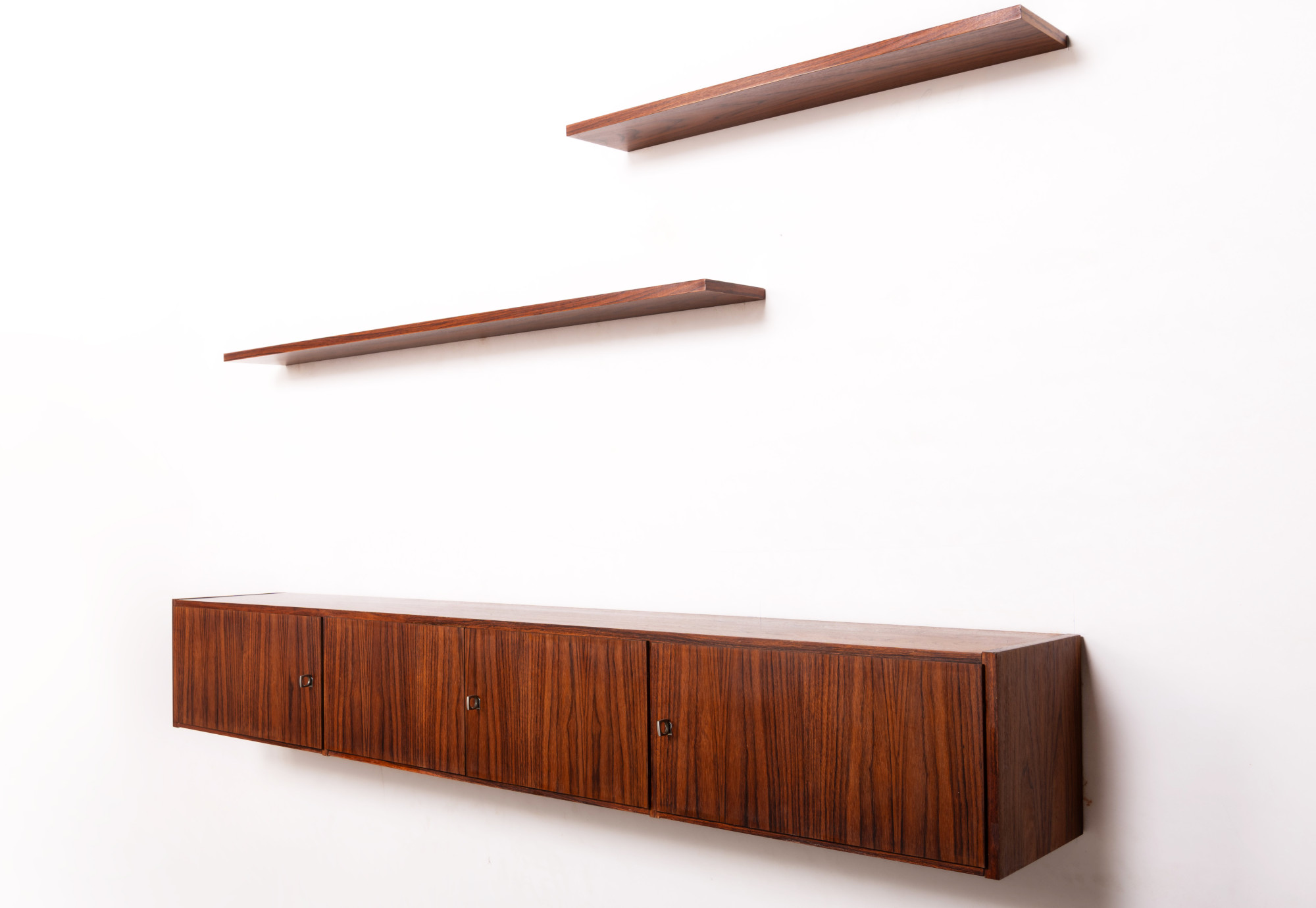 Vintage floating sideboard in rosewood. This minimalist sideboard has four doors and is easy to mount on the wall. The two rosewood planks are included in the price.